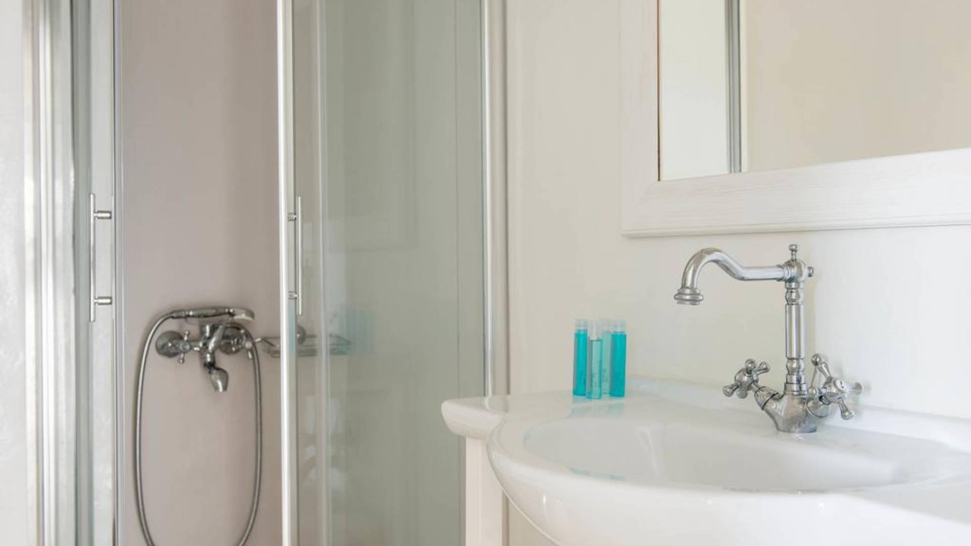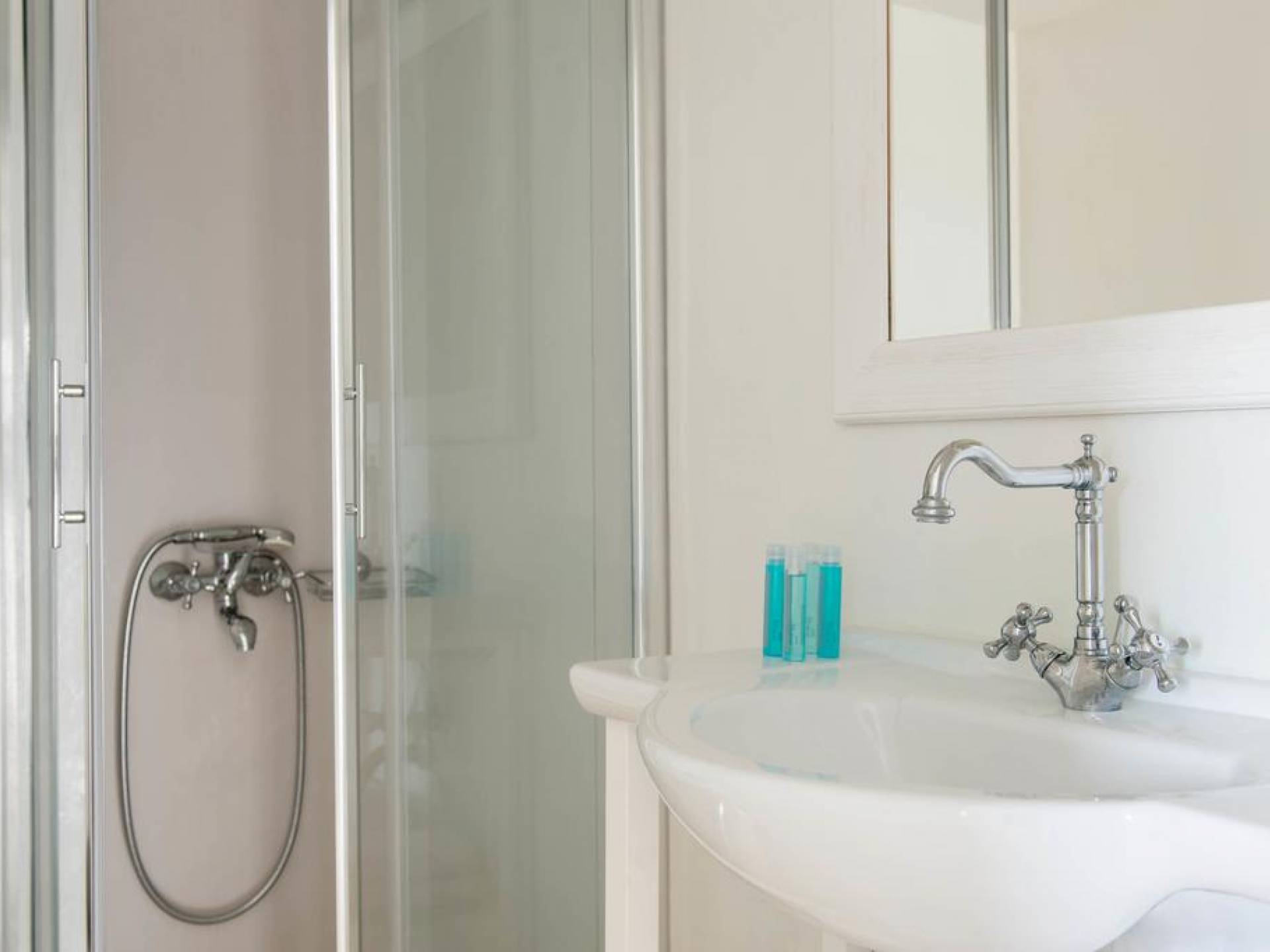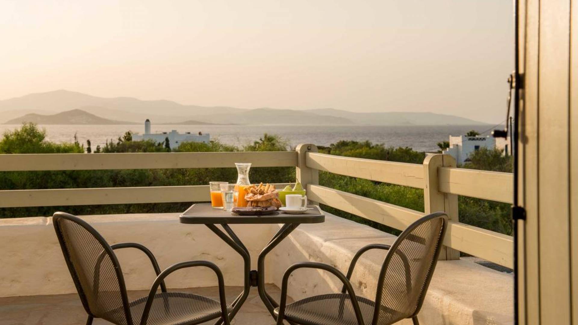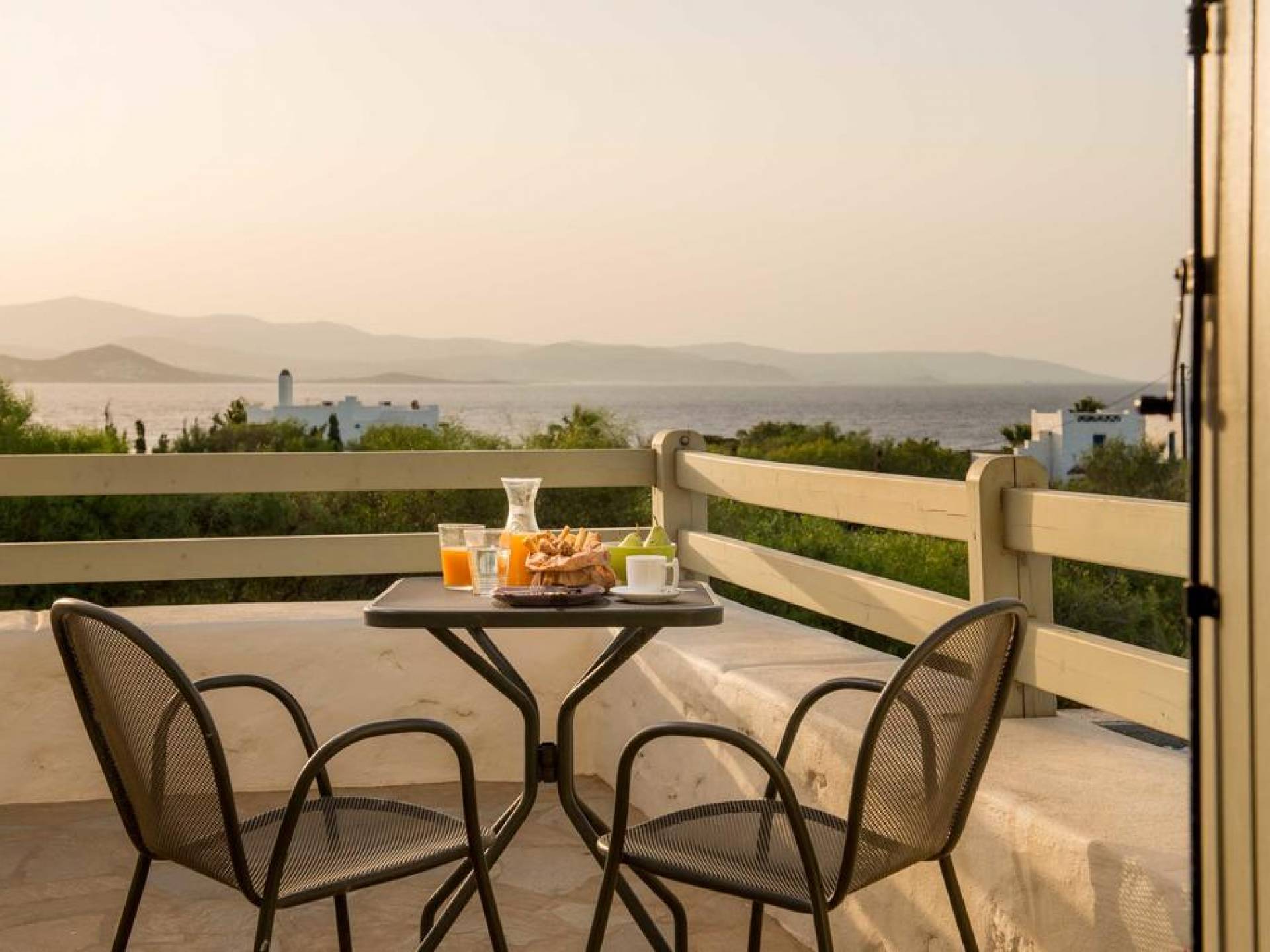 El gran dormitorio principal en el segundo piso tiene una cama tamaño king de silicona, un baño en suite de mármol blanco local completamente equipado y acceso a una terraza totalmente privada. La terraza pavimentada principal es el espacio de retiro especial de su familia, su hogar lejos del hogar en la isla de Paros. Todos los alquileres incluyen un sistema central de aire acondicionado y ventiladores.