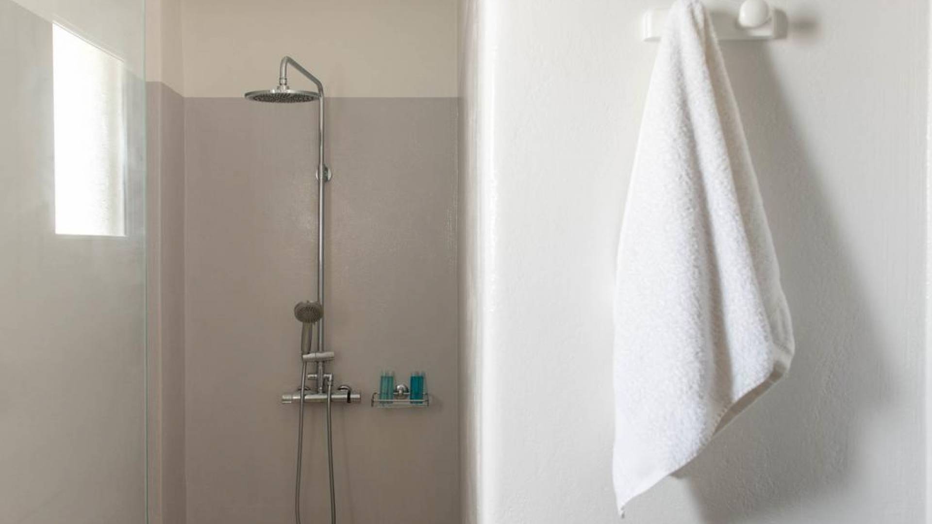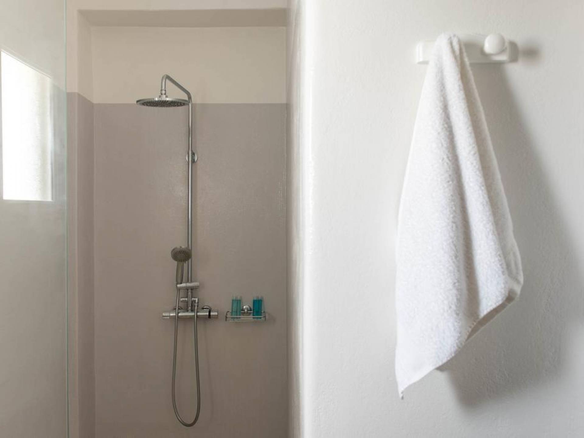 La espectacular Villa Dúplex Stagones de 81 metros cuadrados con vistas de 180 grados al mar. El particular consiste en un dormitorio principal totalmente separado en el segundo piso con una cama king-size de silicona y acceso a la terraza. En la misma planta, hay un cuarto de baño en suite de mármol blanco local con cabina de ducha y muebles de depósito blancos. El piso principal tiene otro dormitorio espacioso con dos camas tamaño queen.