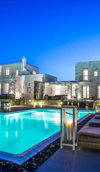 Luxury & Deluxe Aelia Villas Paros son 2 villas de lujo con 8 dormitorios y una piscina privada. Luxury & Deluxe Aelia Villas son parte de un grupo de cuatro villas privadas de alquiler, ubicadas en el lado este de Paros, a pocos minutos a pie de la hermosa playa de arena de Golden Beach. Construido sobre un terreno de 11.500 metros cuadrados, el complejo de 4 edificios rodea tres grandes piscinas. Diseñadas y construidas siguiendo la arquitectura de las Cícladas, las villas se mezclan armónicamente con el entorno natural.