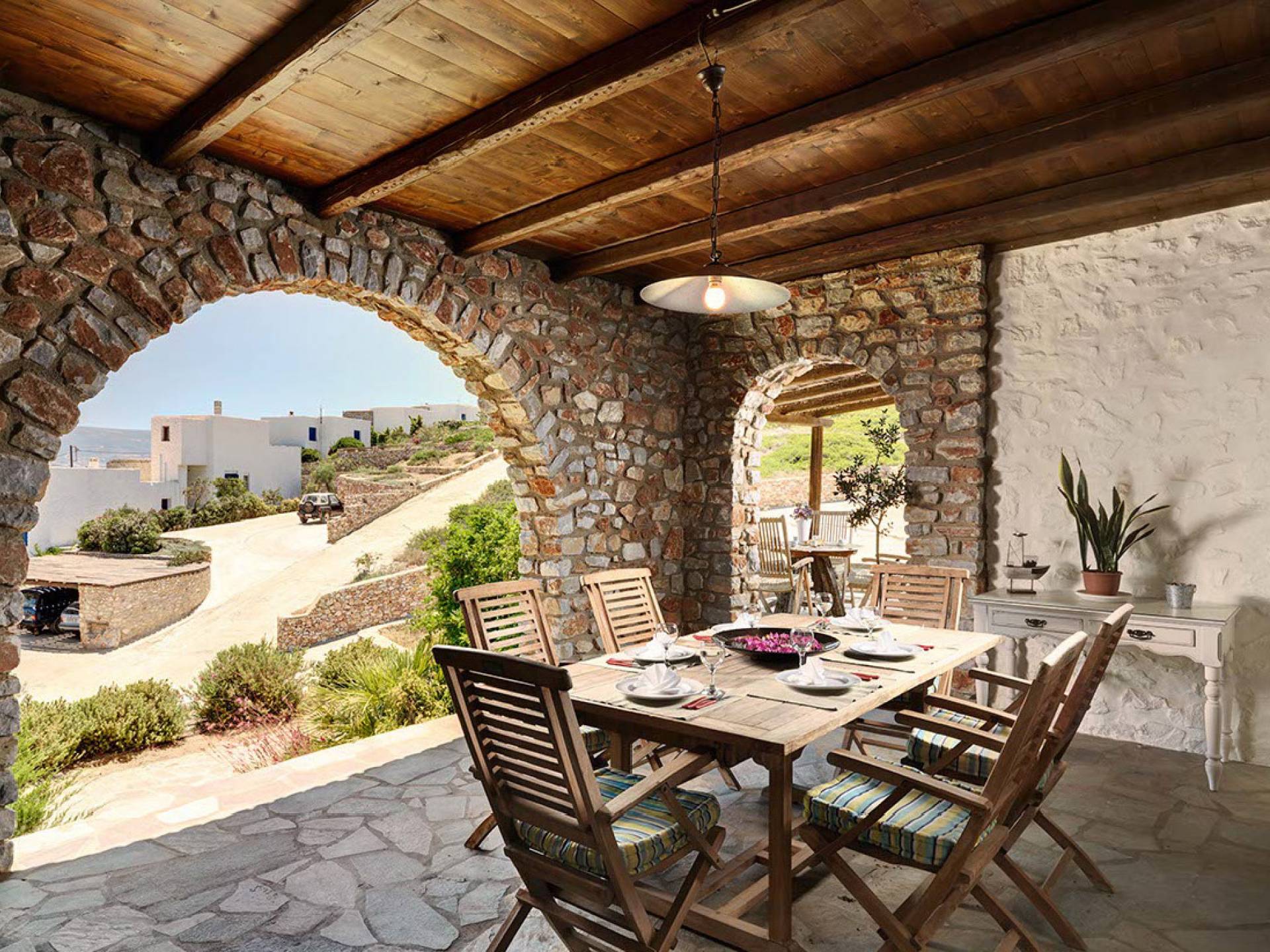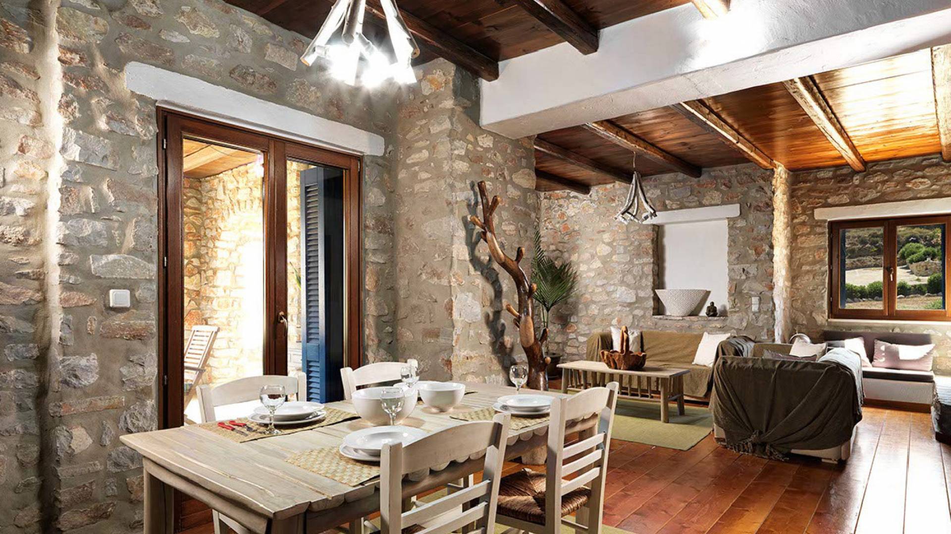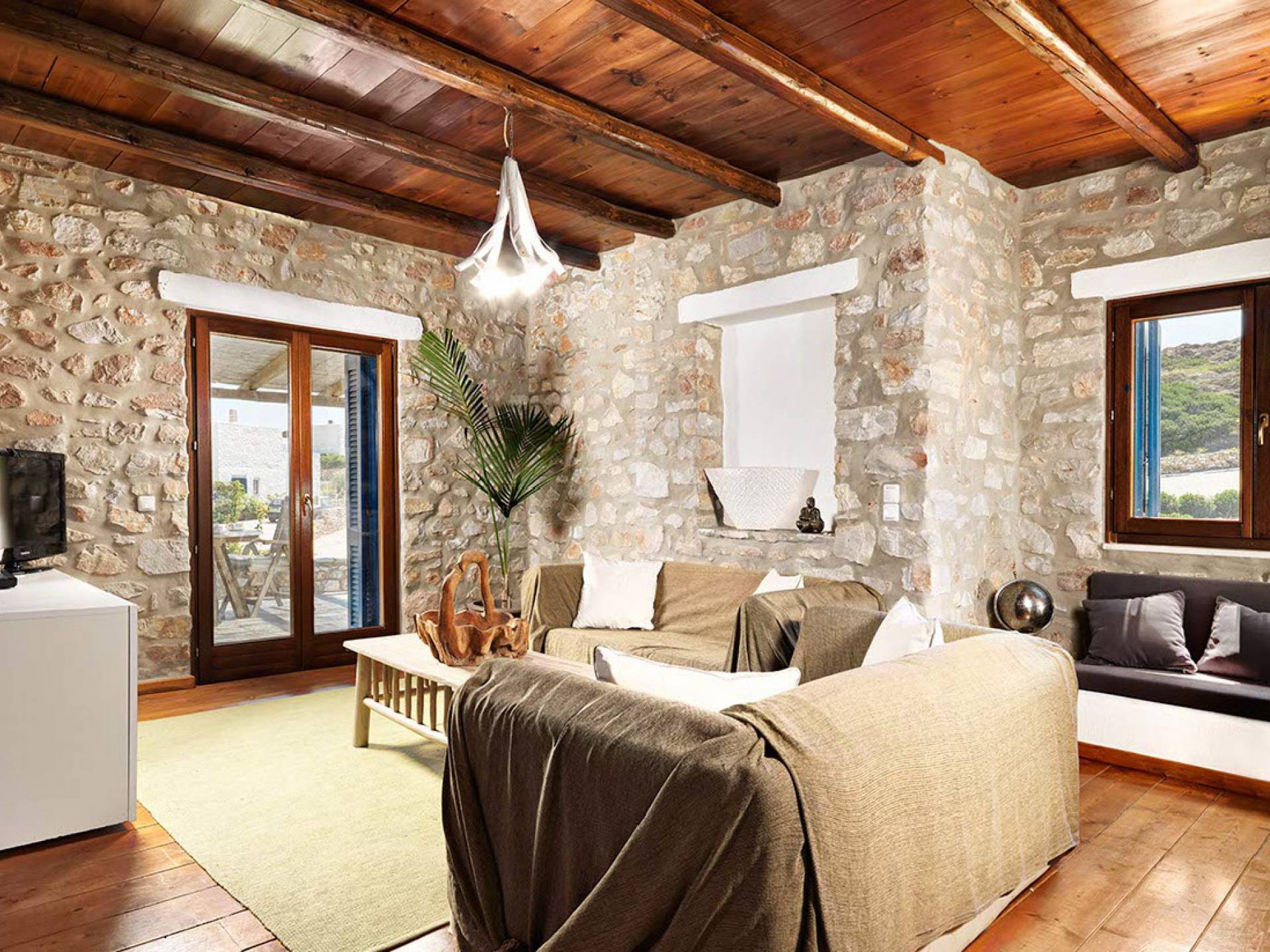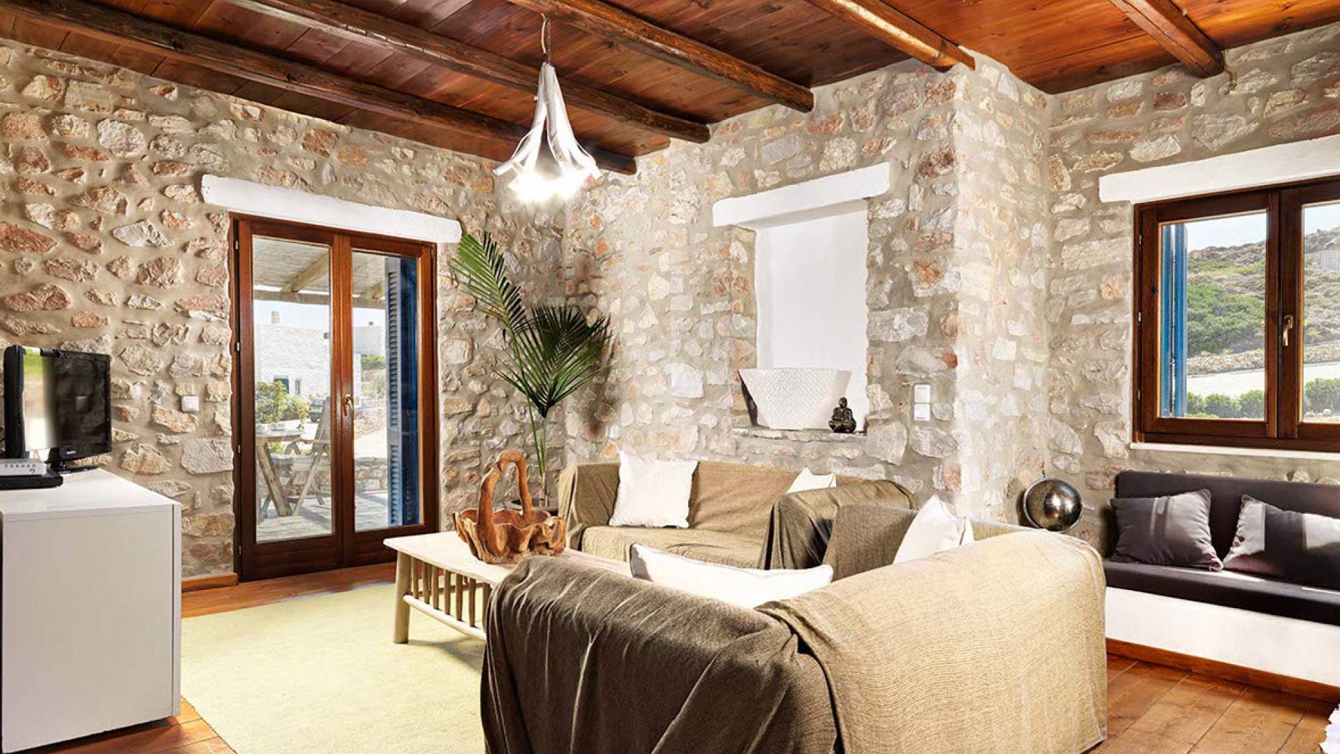 La piedra y la madera están muy presentes tanto en el interior como en el exterior de la villa. Los cálidos tonos de los paneles de madera se combinan a la perfección con las paredes de piedra toscamente tallada, mientras que la deslumbrante luz del sol y la espléndida atmósfera propician el pleno disfrute del salvaje paisaje de las Cícladas.