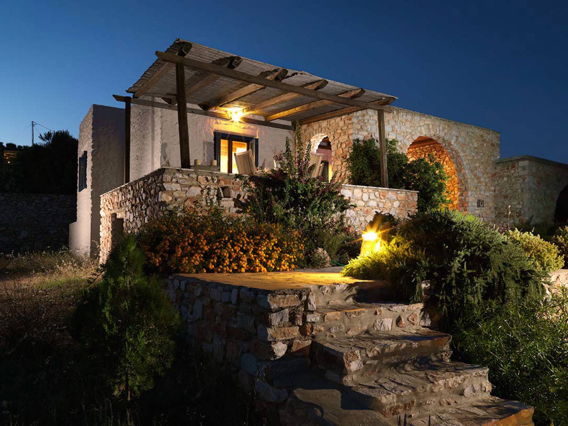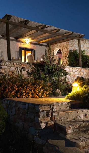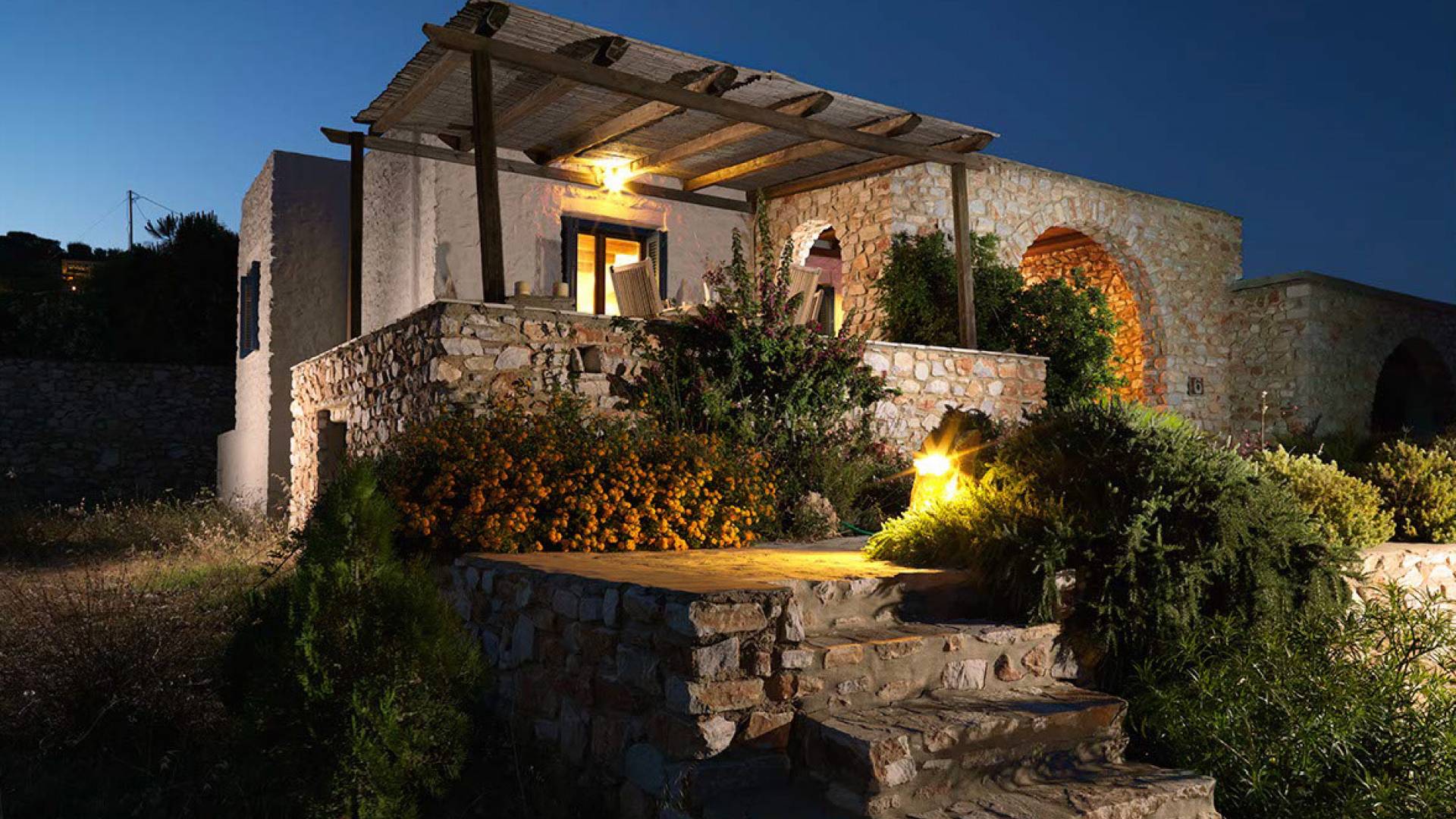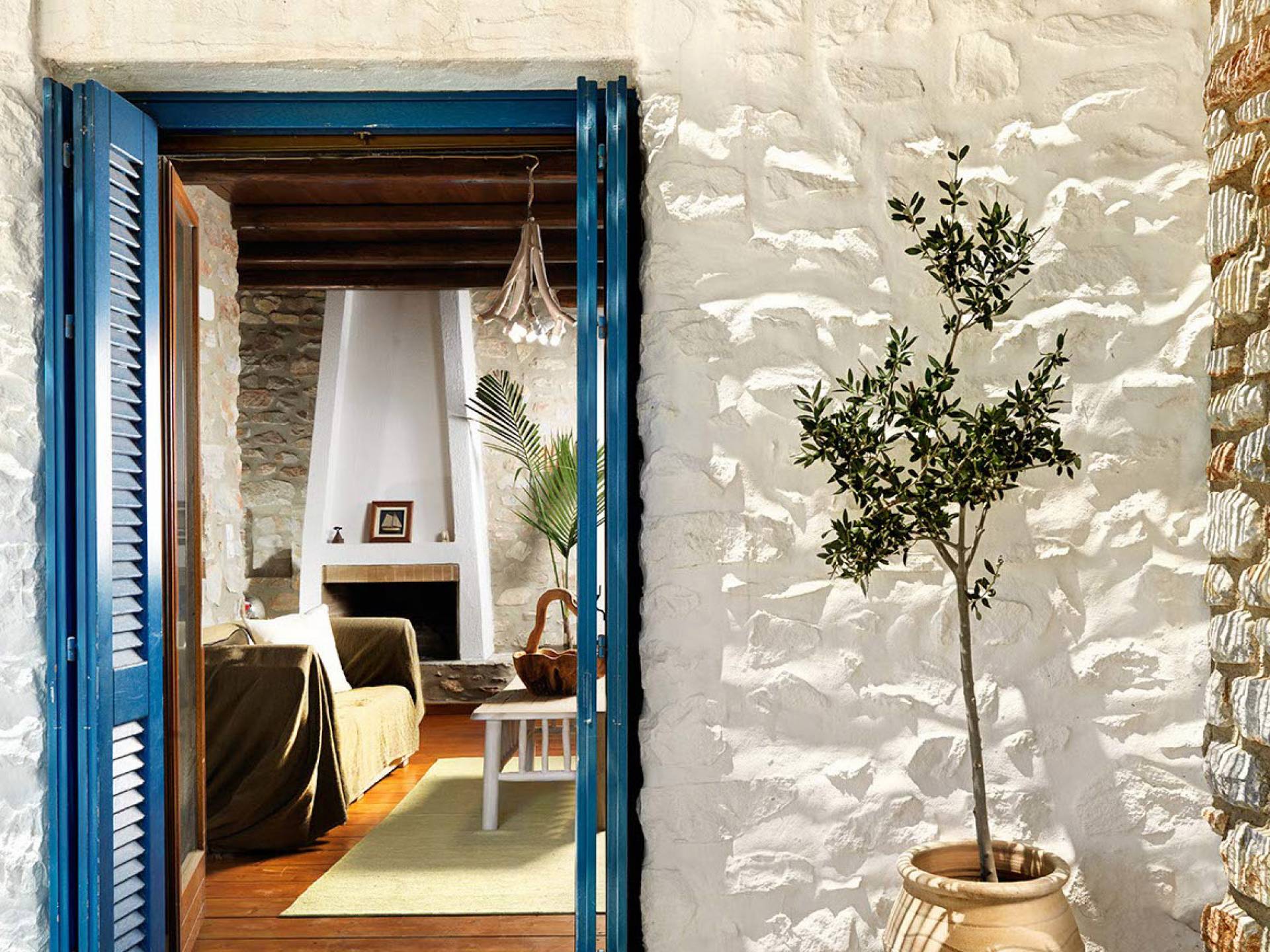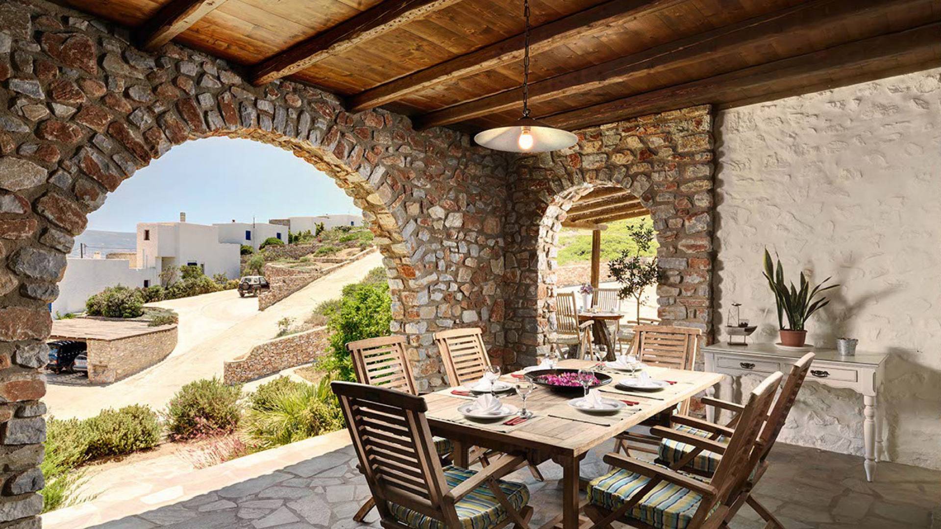 La piedra y la madera están muy presentes tanto en el interior como en el exterior de la villa. Los cálidos tonos de los paneles de madera se combinan a la perfección con las paredes de piedra toscamente tallada, mientras que la deslumbrante luz del sol y la espléndida atmósfera propician el pleno disfrute del salvaje paisaje de las Cícladas.