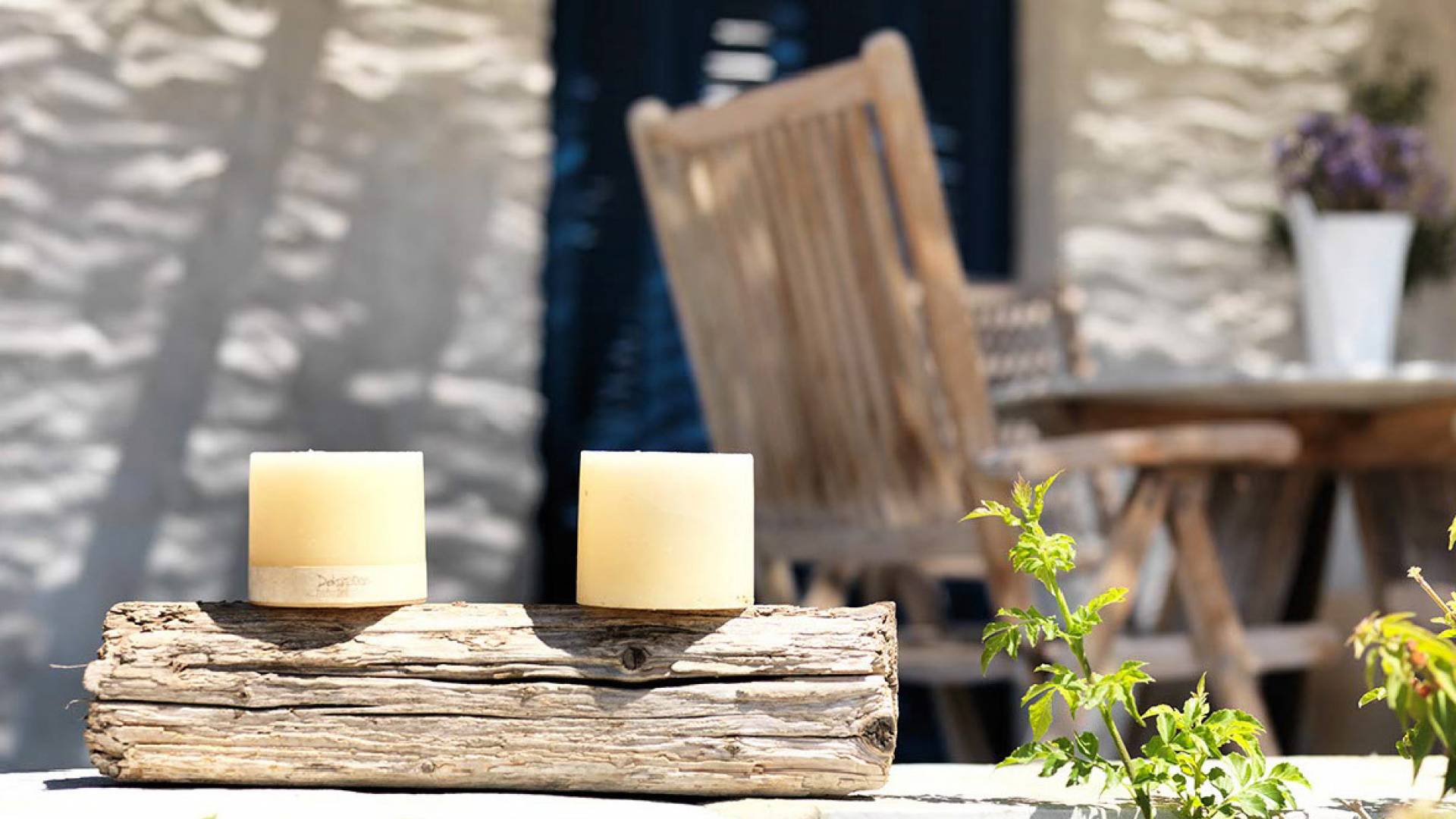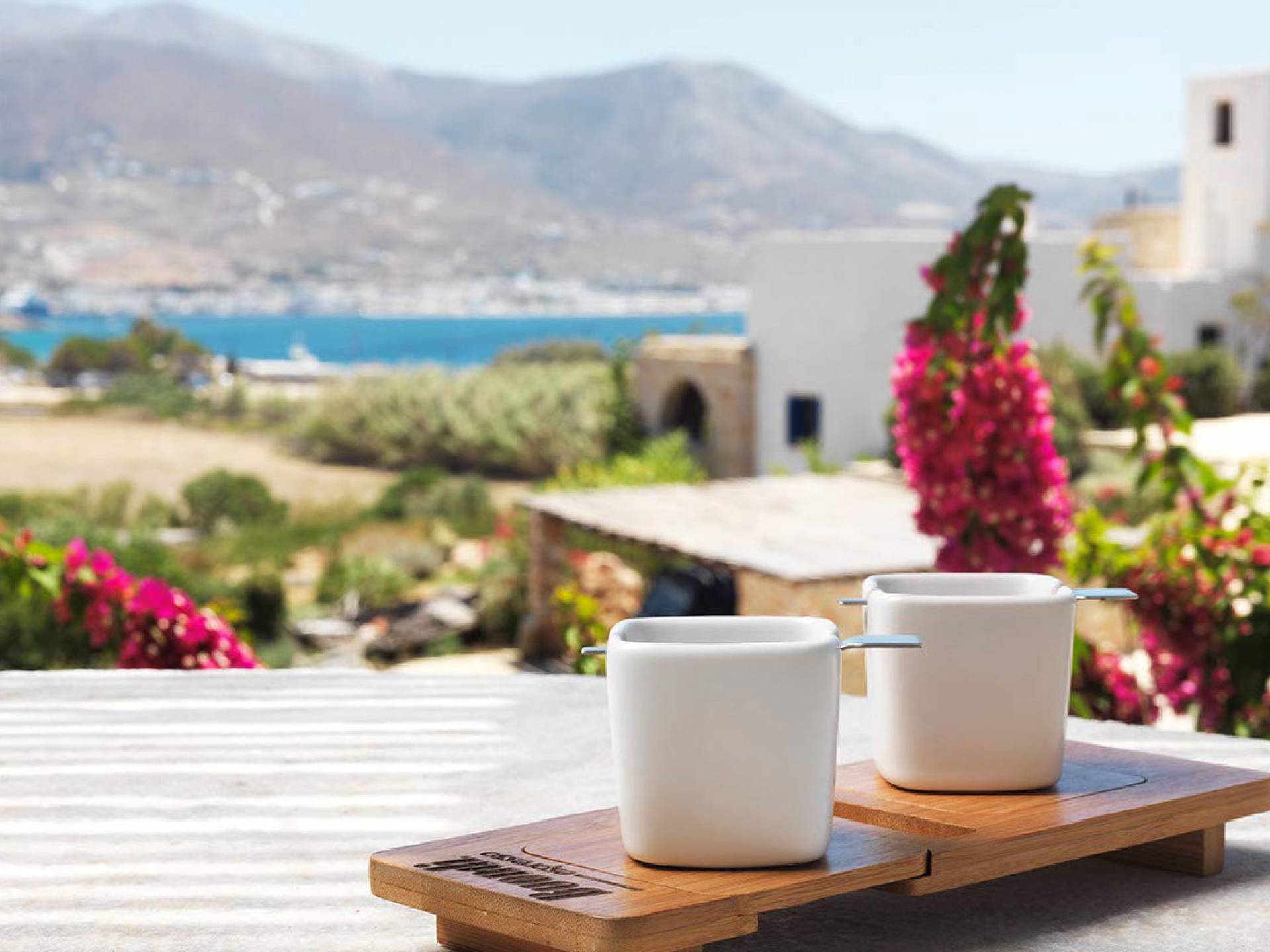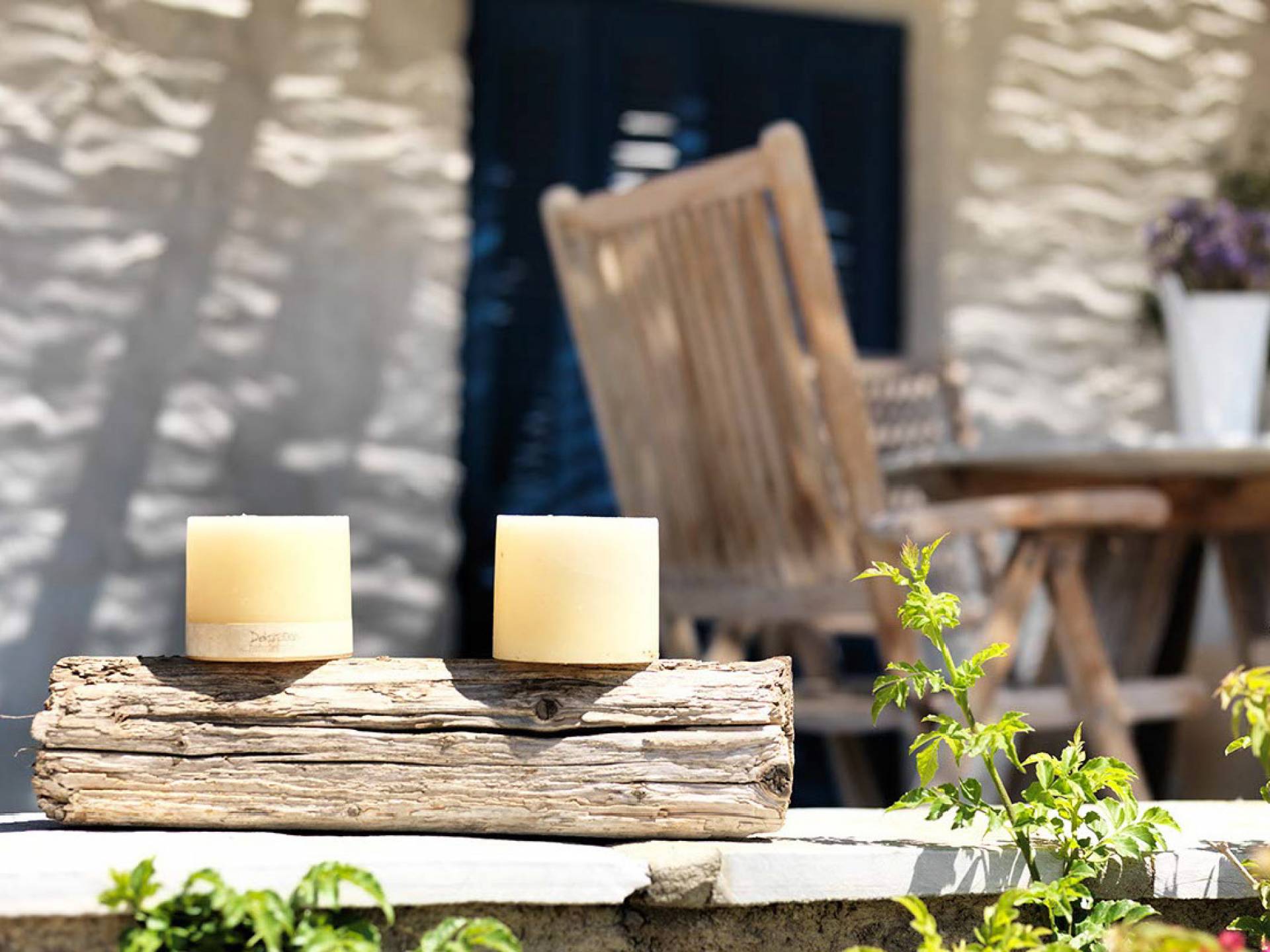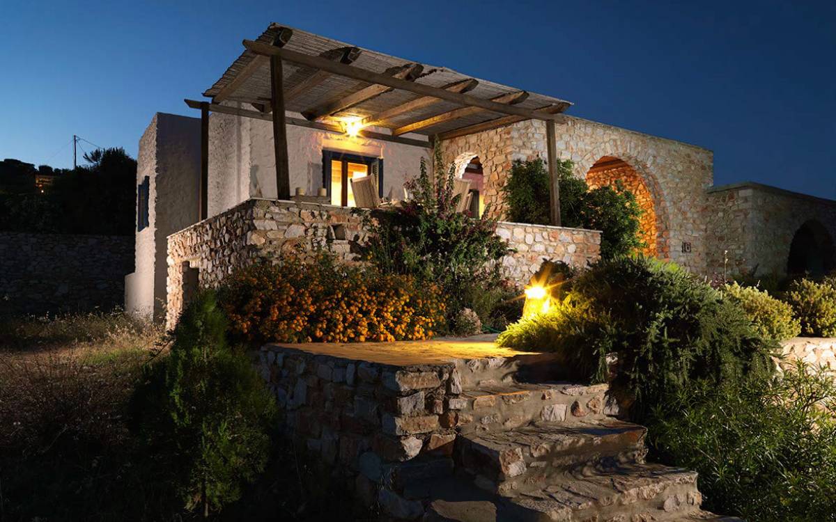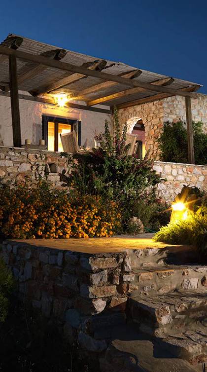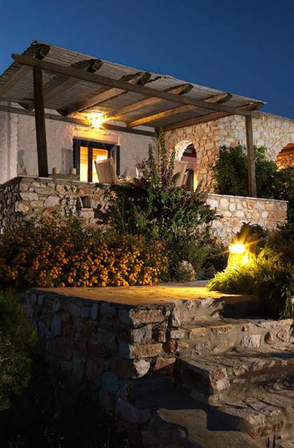 La piedra y la madera están muy presentes tanto en el interior como en el exterior de la villa. Los cálidos tonos de los paneles de madera se combinan a la perfección con las paredes de piedra toscamente tallada, mientras que la deslumbrante luz del sol y la espléndida atmósfera propician el pleno disfrute del salvaje paisaje de las Cícladas.