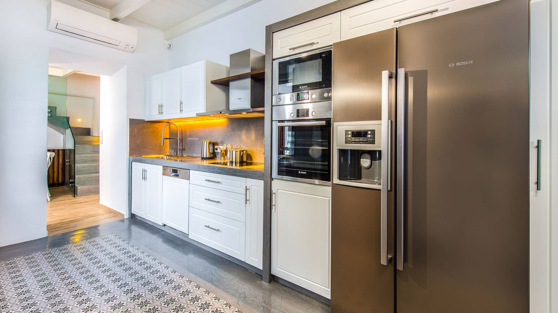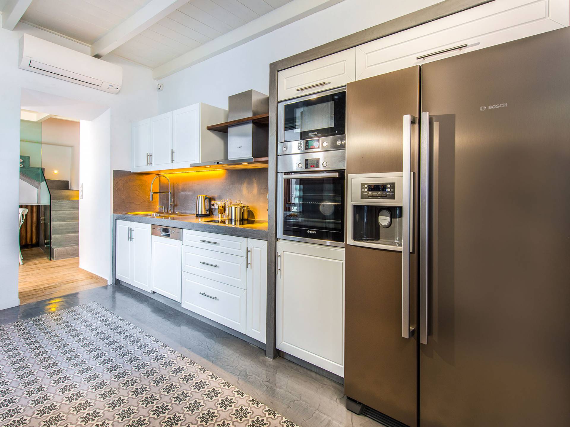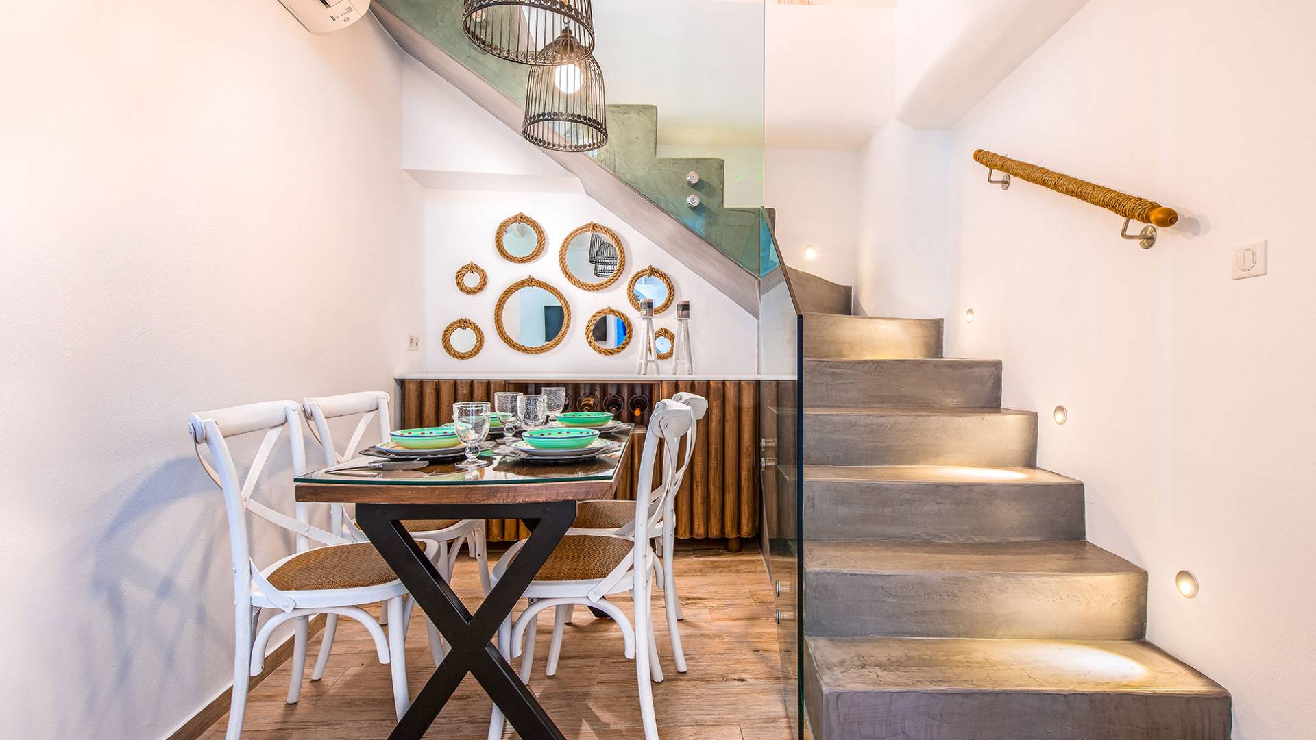 En la planta baja, hay un dormitorio con una lujosa cama doble tamaño king. El dormitorio tiene su propio baño privado, con cabina de ducha exenta, equipada con ducha de hidromasaje con cromoterapia, y está provista de amenities, albornoces, toallas y secador de pelo, así como toallas que los huéspedes pueden llevarse a la habitación. playa. También hay una sala de estar con cómodos sofás cama que se pueden convertir fácilmente en camas y acomodar a dos personas más, con persianas eléctricas con control remoto para mayor privacidad. También hay una cocina grande, moderna y totalmente equipada y un comedor donde los huéspedes pueden disfrutar de sus comidas. Una hermosa escalera te lleva desde esta habitación al primer piso.