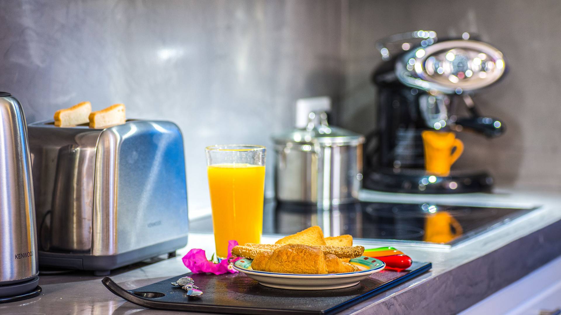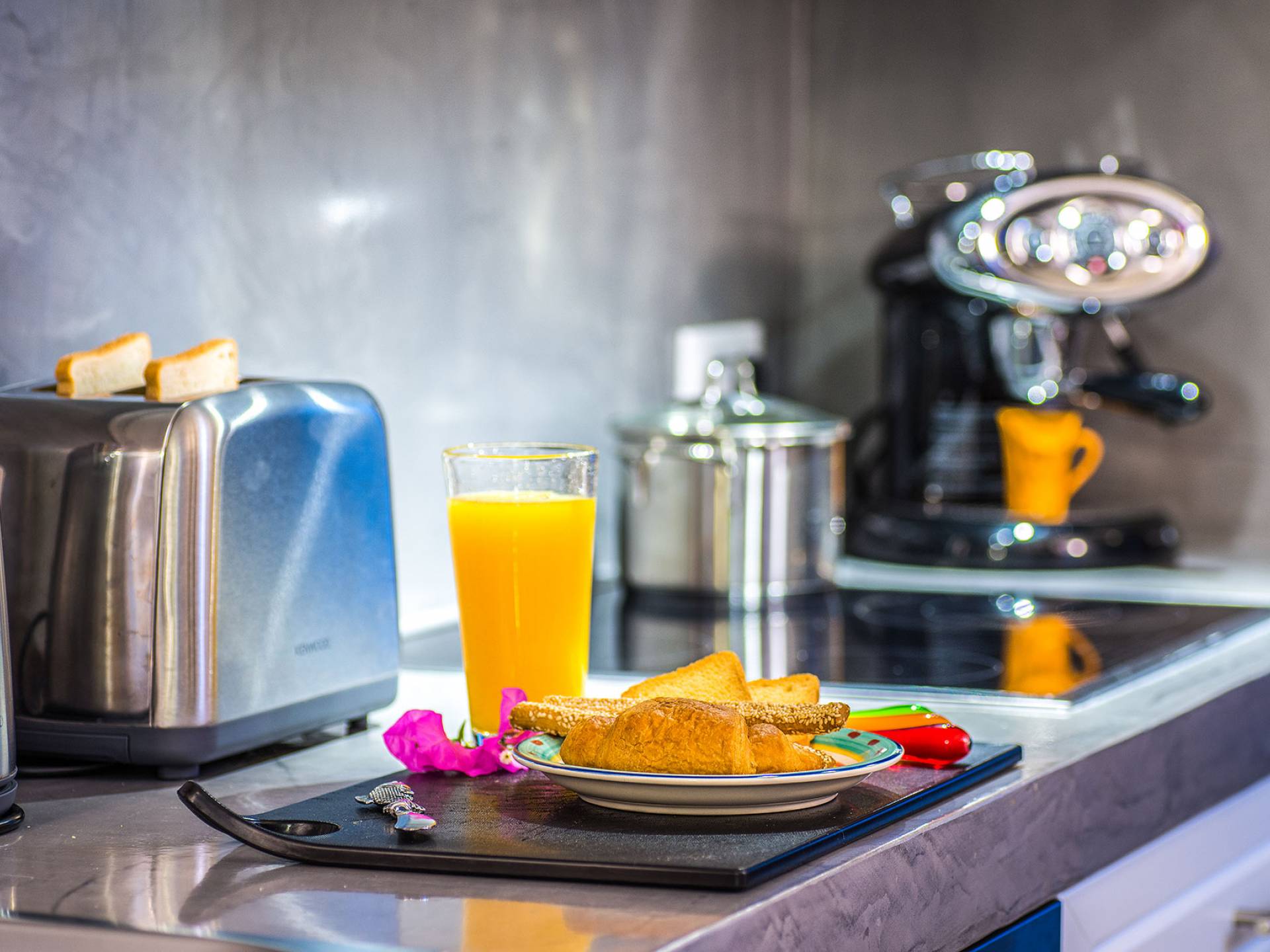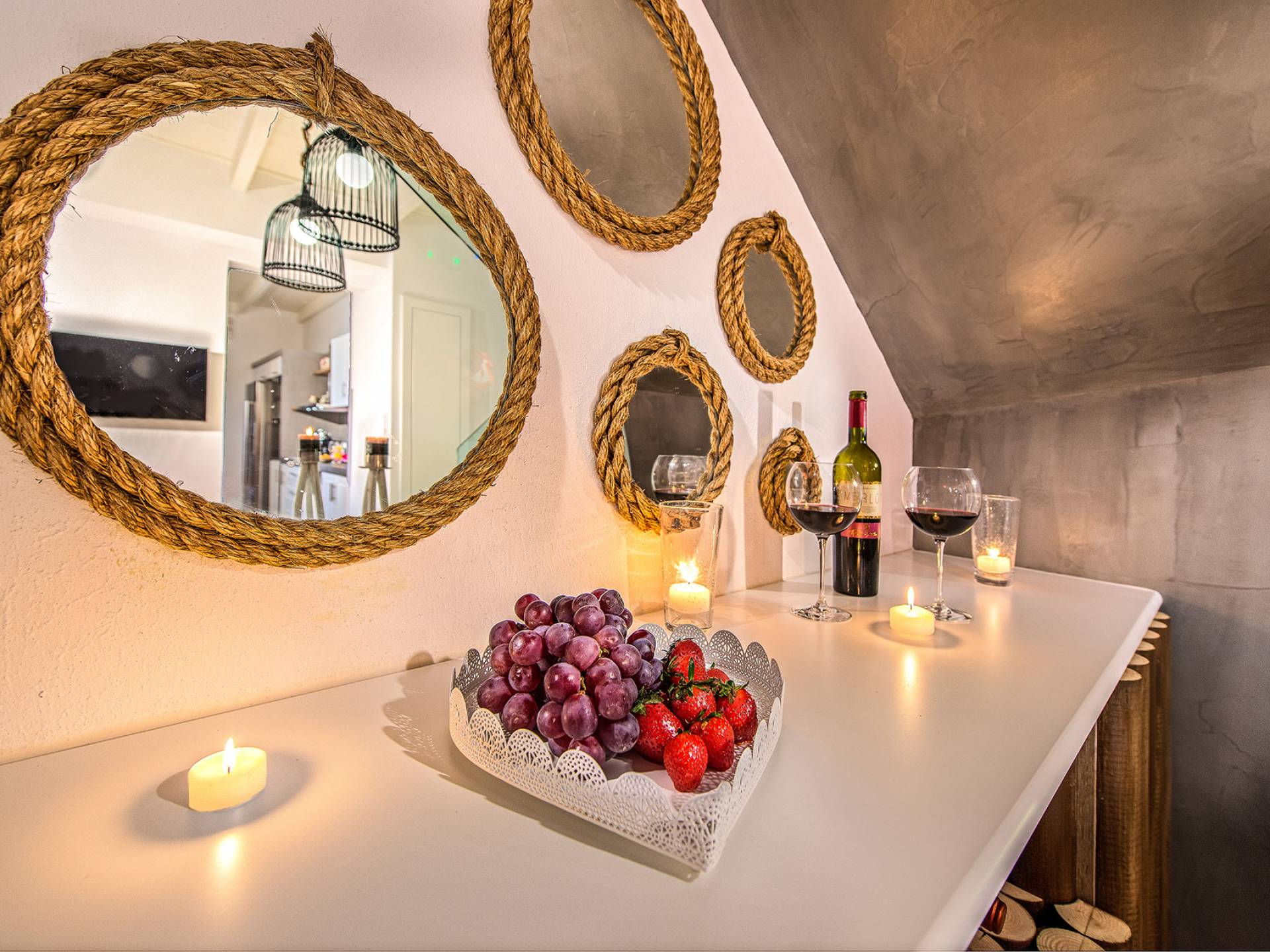 En la planta baja, hay un dormitorio con una lujosa cama doble tamaño king. El dormitorio tiene su propio baño privado, con cabina de ducha exenta, equipada con ducha de hidromasaje con cromoterapia, y está provista de amenities, albornoces, toallas y secador de pelo, así como toallas que los huéspedes pueden llevarse a la habitación. playa. También hay una sala de estar con cómodos sofás cama que se pueden convertir fácilmente en camas y acomodar a dos personas más, con persianas eléctricas con control remoto para mayor privacidad. También hay una cocina grande, moderna y totalmente equipada y un comedor donde los huéspedes pueden disfrutar de sus comidas. Una hermosa escalera te lleva desde esta habitación al primer piso.