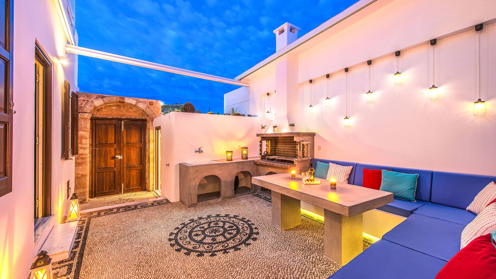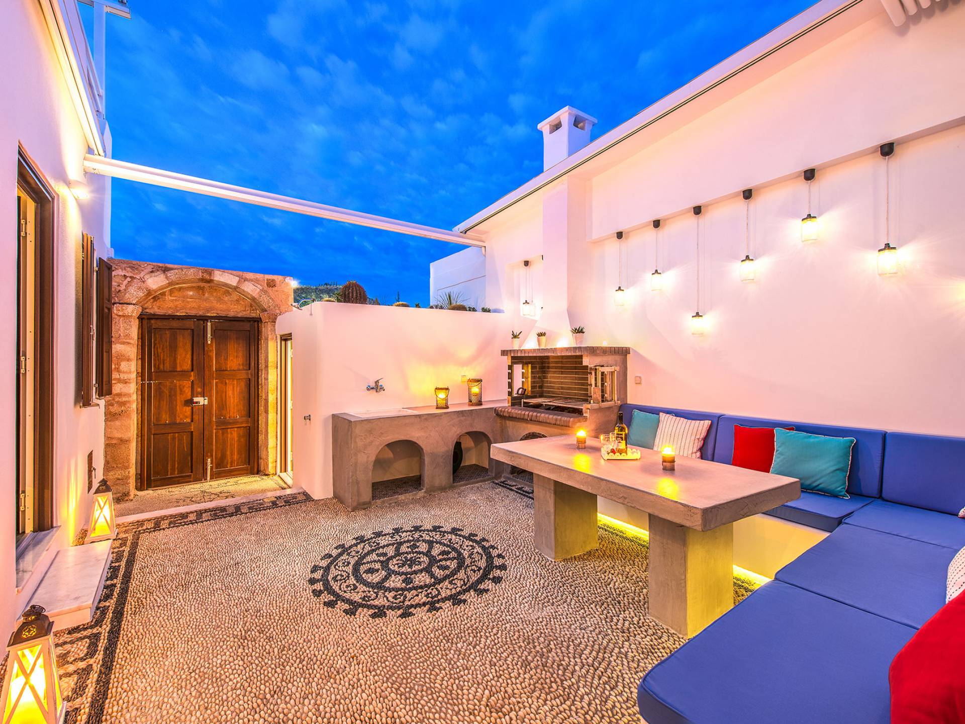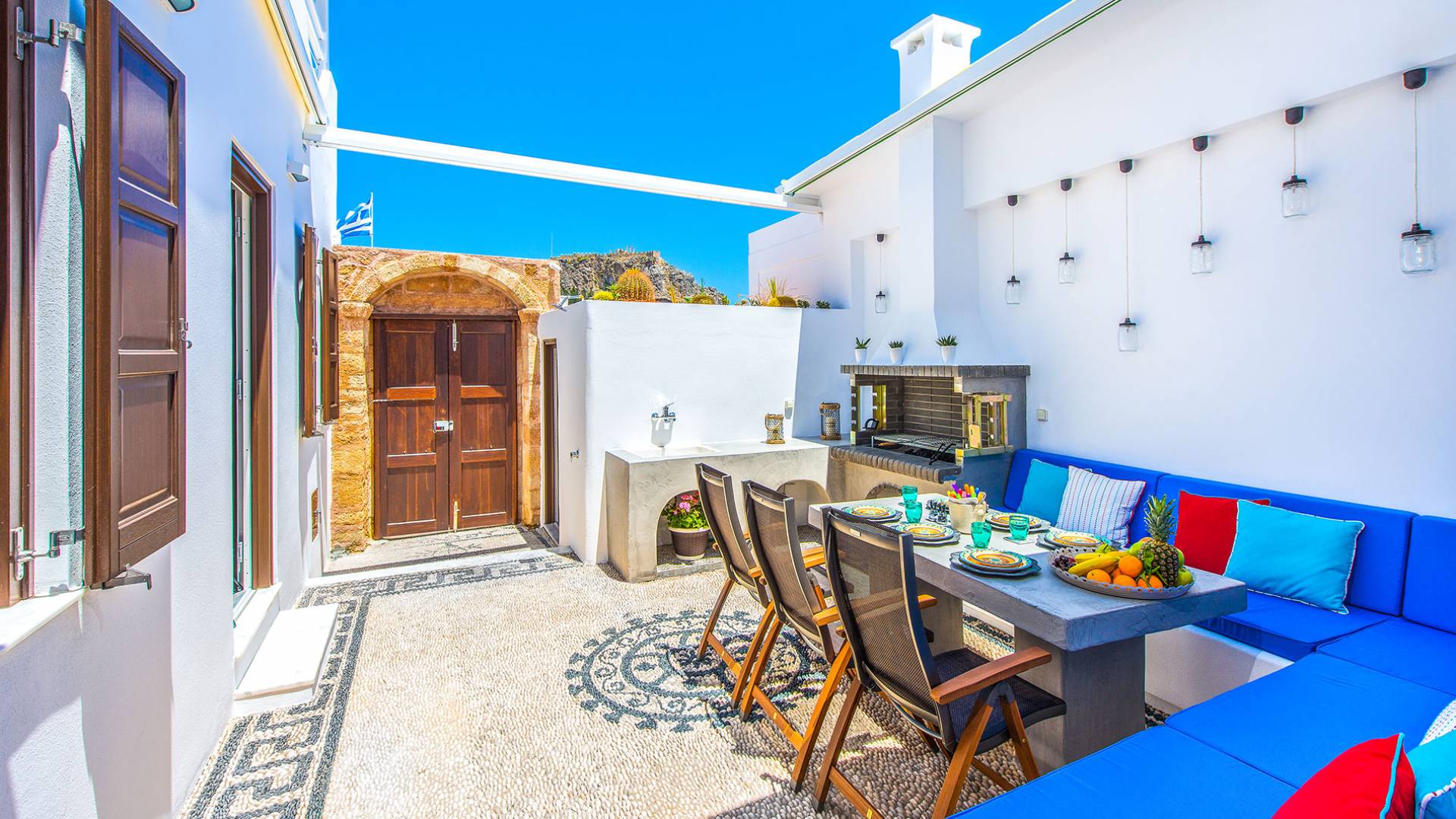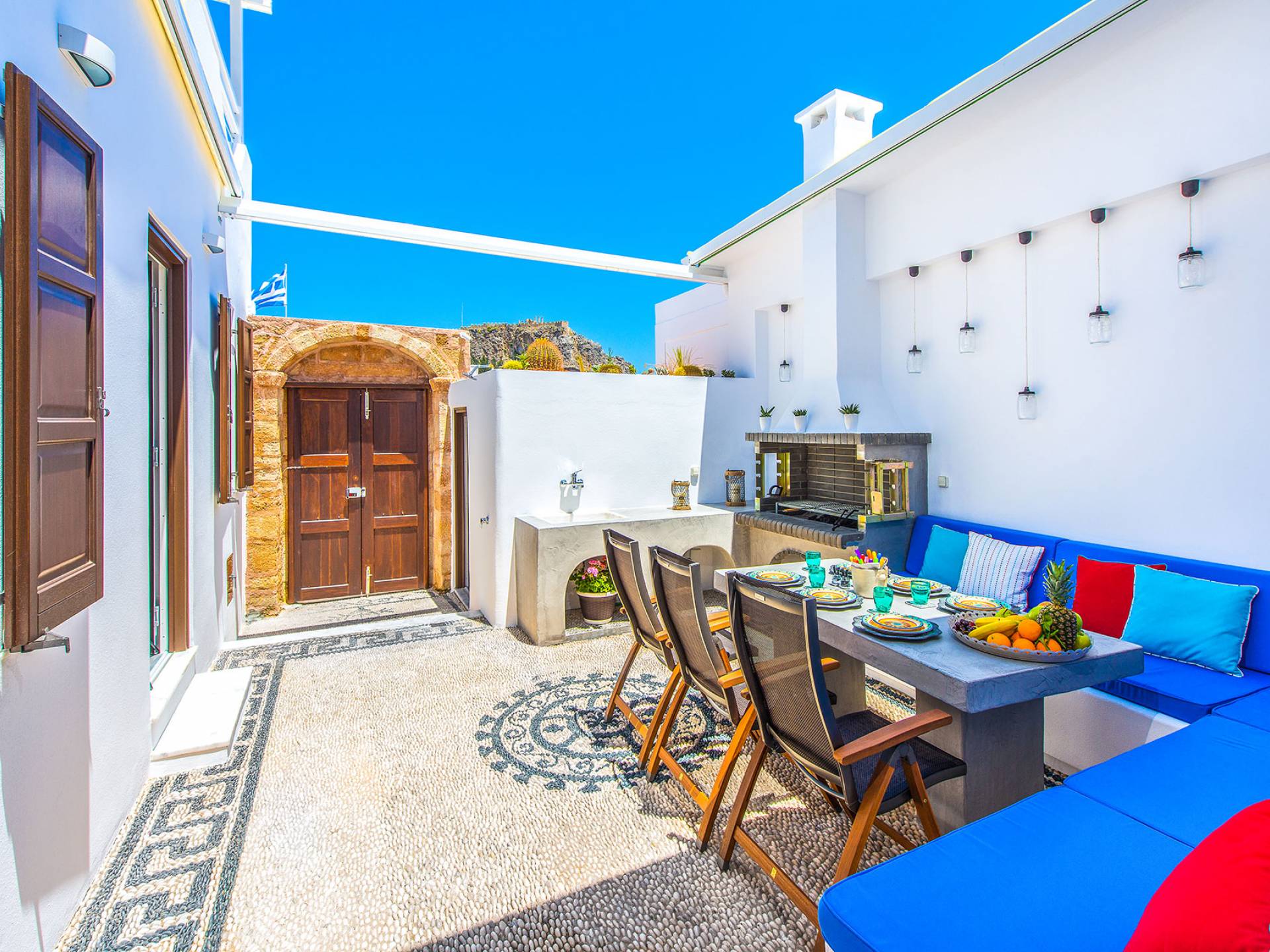 Pasando por la puerta principal de madera, los huéspedes ingresan a la villa y se enfrentan a un patio privado de guijarros hecho de la manera tradicional única que los Lindians solían decorar sus pisos. En el patio, hay una hermosa sala de estar construida en piedra y una barbacoa de piedra, con un toldo eléctrico con control remoto que se puede deslizar para crear sombra. También hay un WC separado en el patio y una ducha exterior para usar después de que los huéspedes hayan estado en la playa.