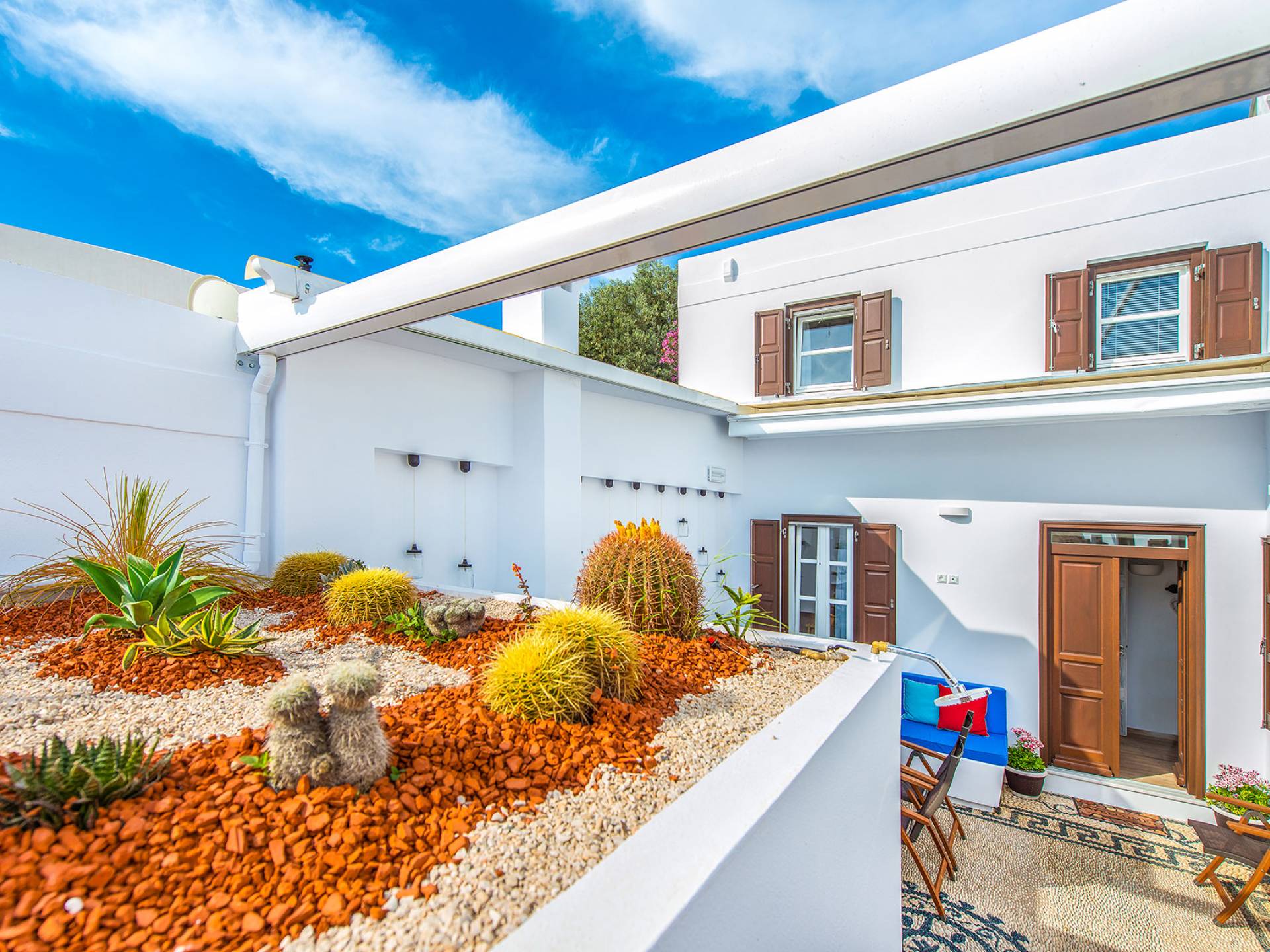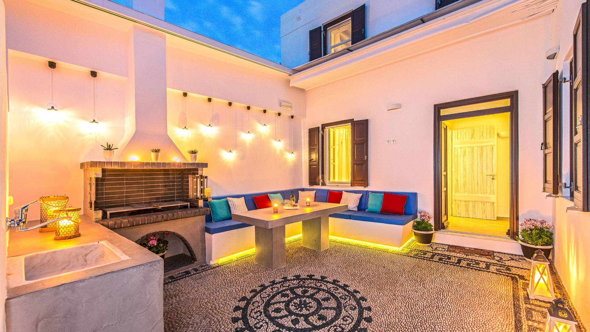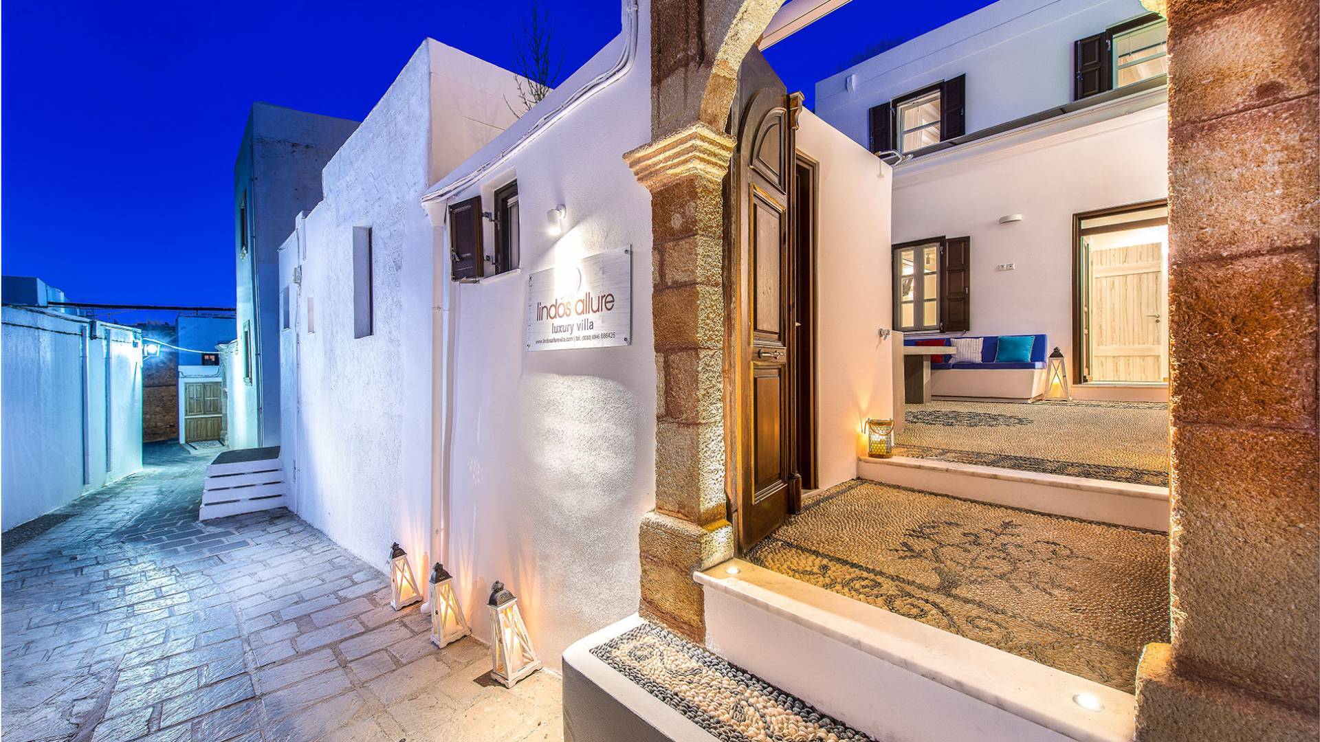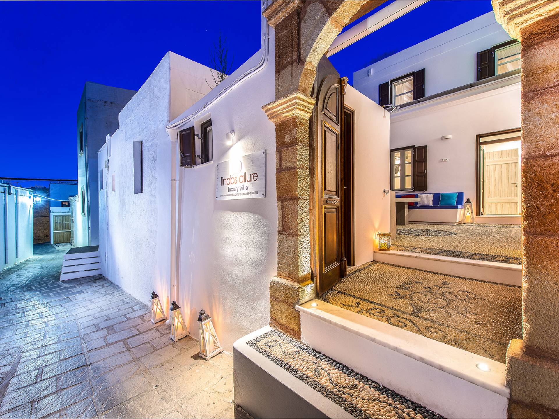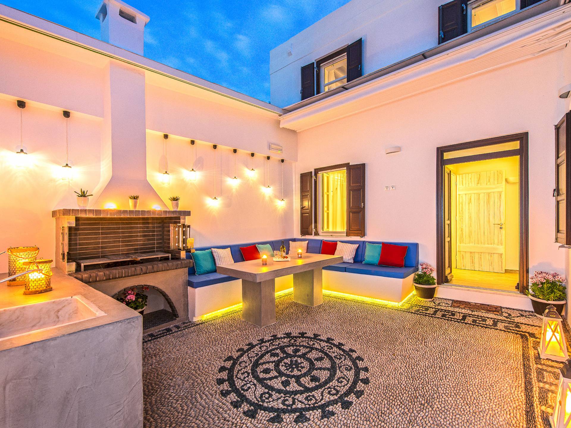 Pasando por la puerta principal de madera, los huéspedes ingresan a la villa y se enfrentan a un patio privado de guijarros hecho de la manera tradicional única que los Lindians solían decorar sus pisos. En el patio, hay una hermosa sala de estar construida en piedra y una barbacoa de piedra, con un toldo eléctrico con control remoto que se puede deslizar para crear sombra. También hay un WC separado en el patio y una ducha exterior para usar después de que los huéspedes hayan estado en la playa.