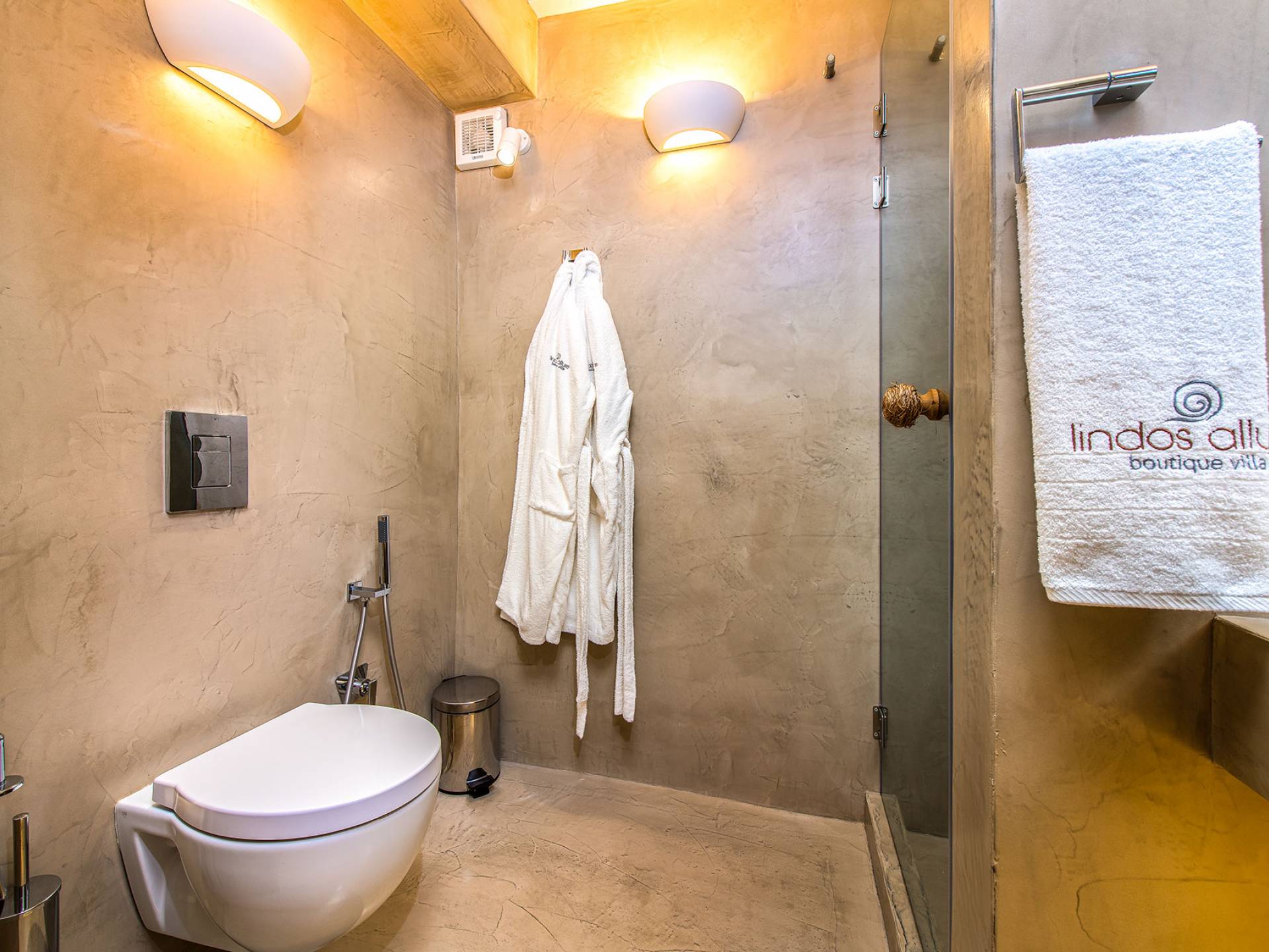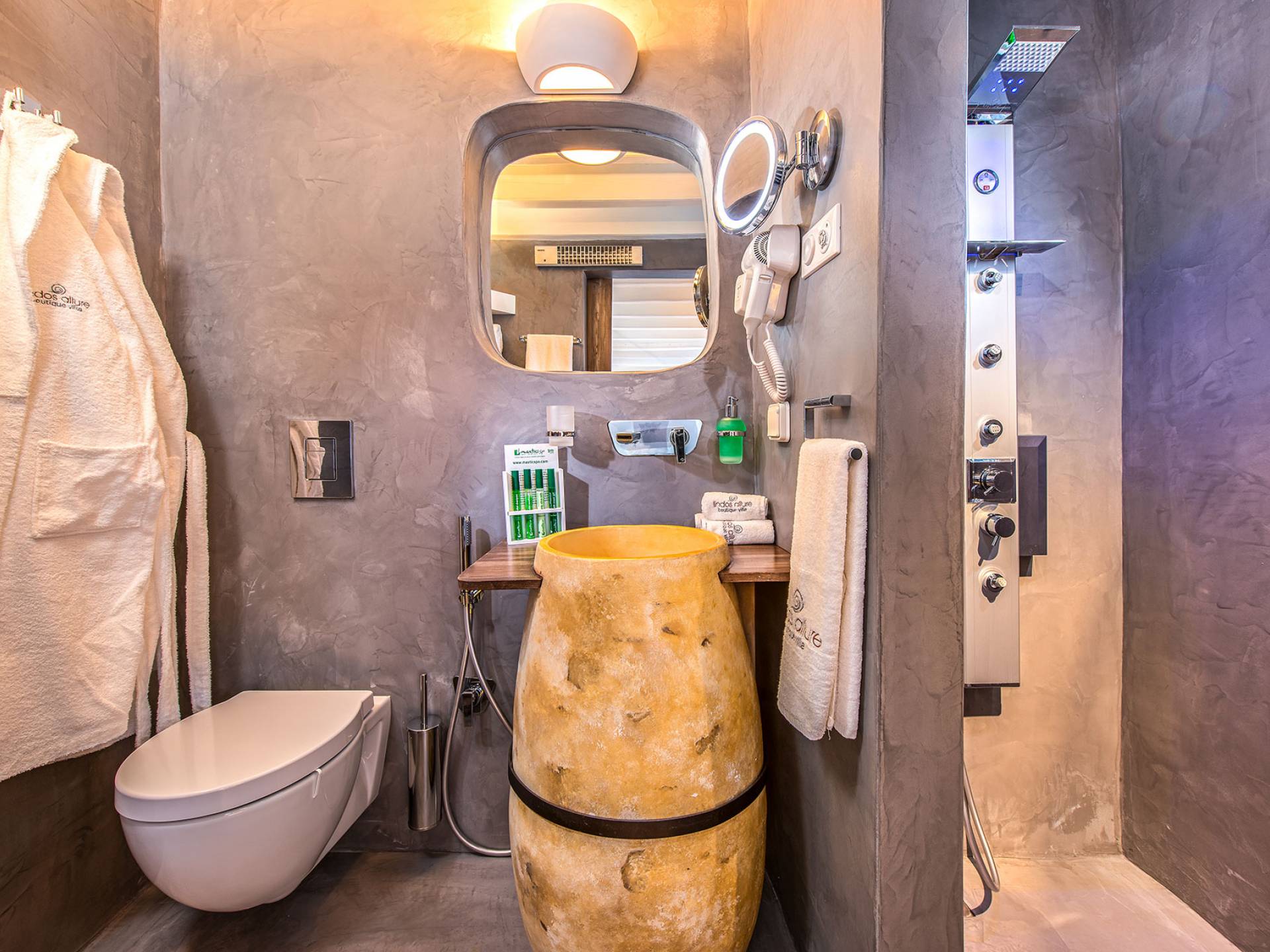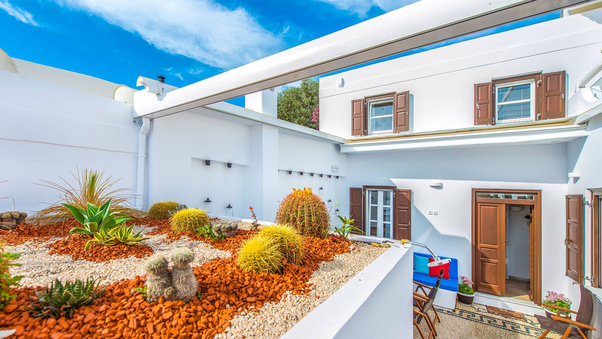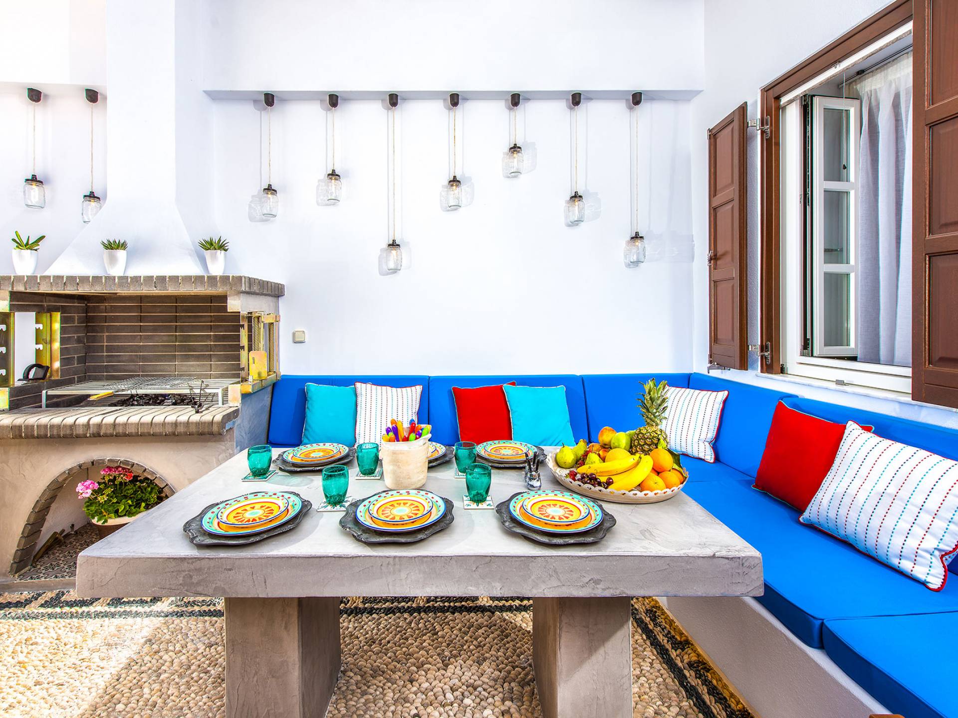 Pasando por la puerta principal de madera, los huéspedes ingresan a la villa y se enfrentan a un patio privado de guijarros hecho de la manera tradicional única que los Lindians solían decorar sus pisos. En el patio, hay una hermosa sala de estar construida en piedra y una barbacoa de piedra, con un toldo eléctrico con control remoto que se puede deslizar para crear sombra. También hay un WC separado en el patio y una ducha exterior para usar después de que los huéspedes hayan estado en la playa.