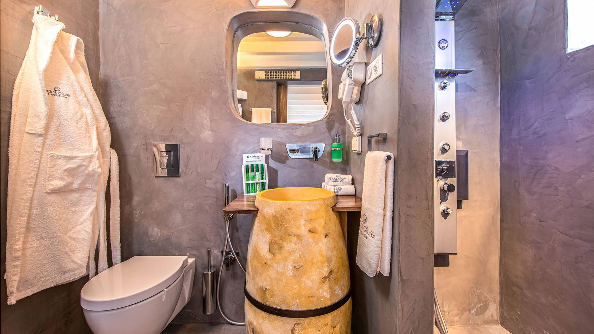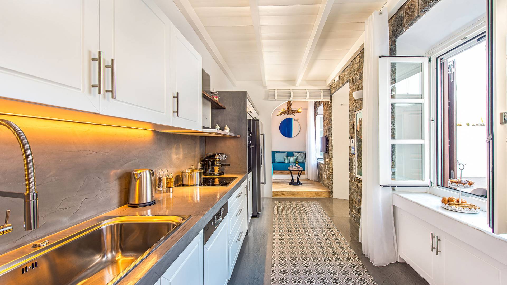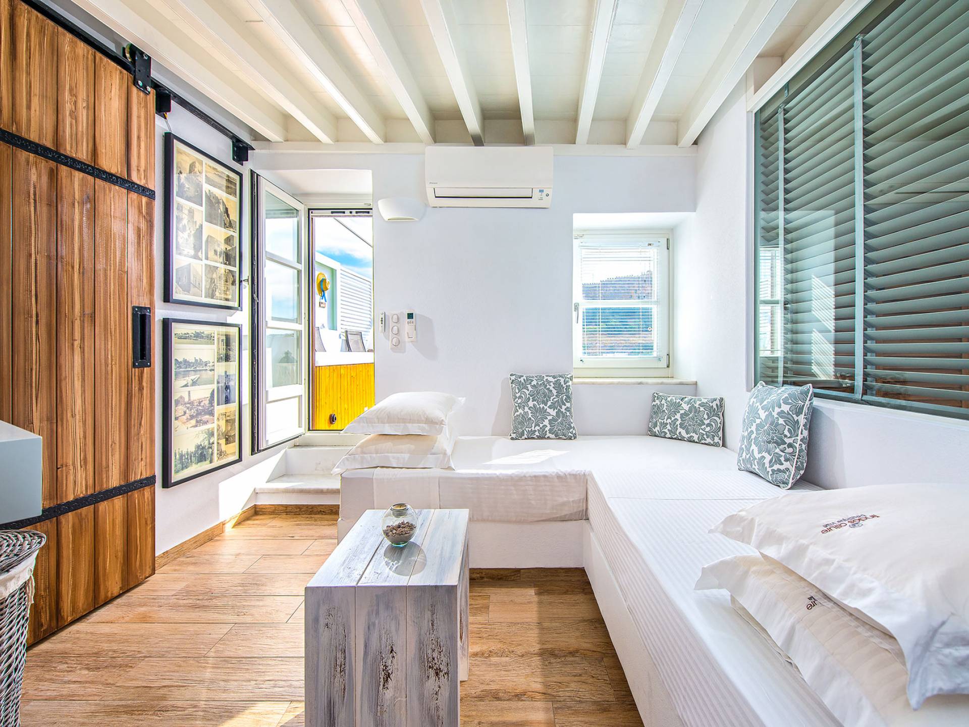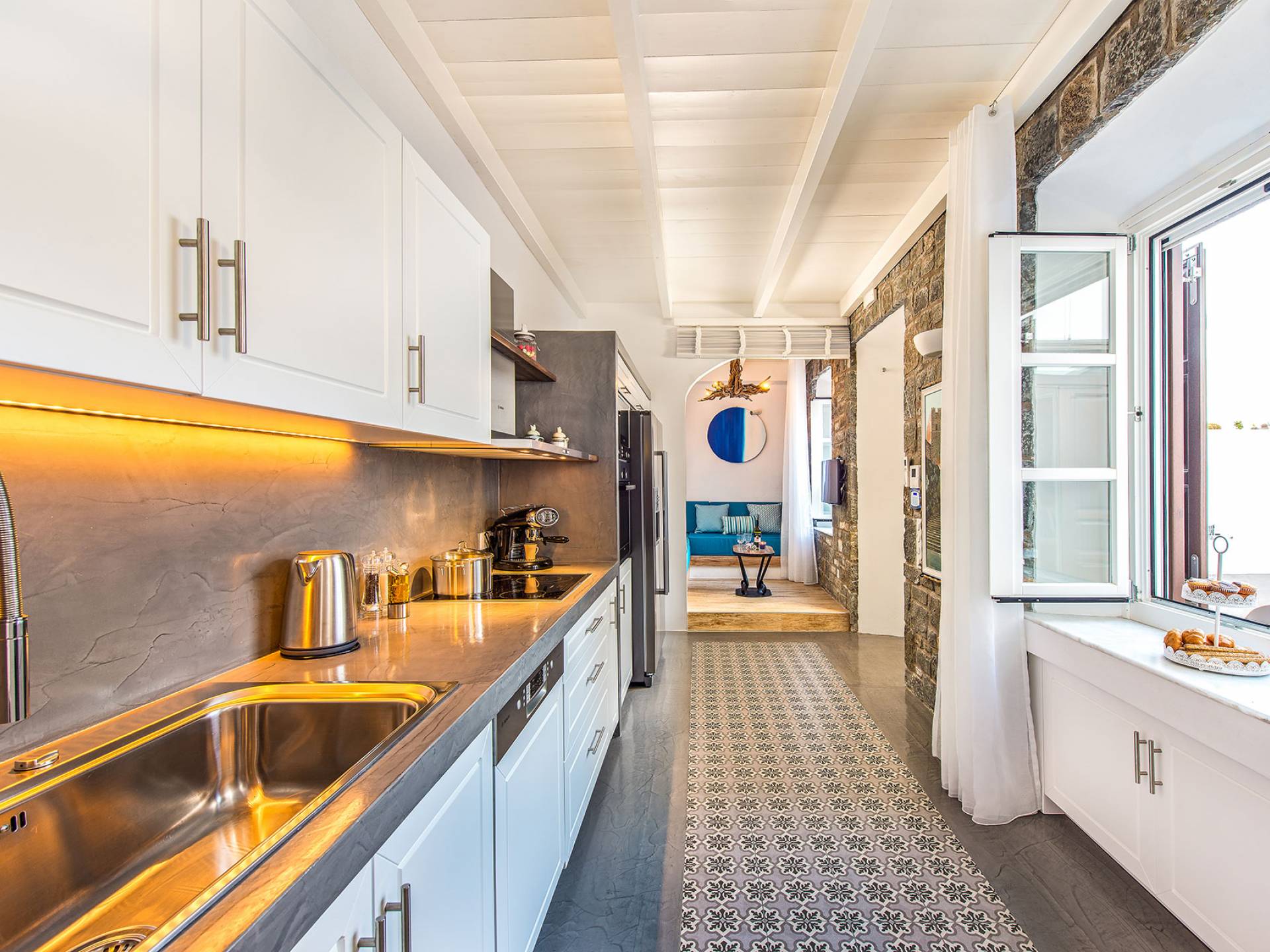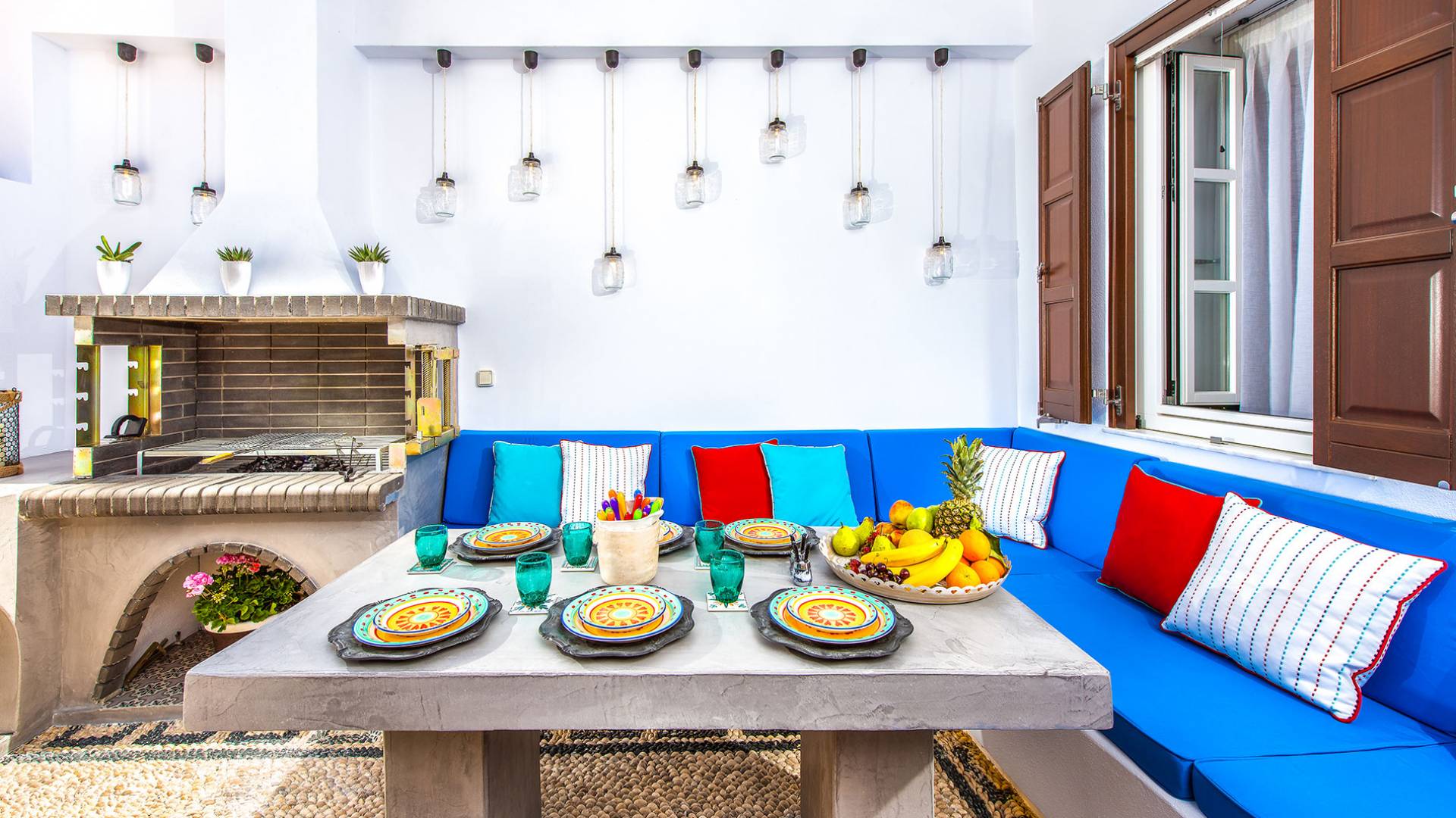 Pasando por la puerta principal de madera, los huéspedes ingresan a la villa y se enfrentan a un patio privado de guijarros hecho de la manera tradicional única que los Lindians solían decorar sus pisos. En el patio, hay una hermosa sala de estar construida en piedra y una barbacoa de piedra, con un toldo eléctrico con control remoto que se puede deslizar para crear sombra. También hay un WC separado en el patio y una ducha exterior para usar después de que los huéspedes hayan estado en la playa.