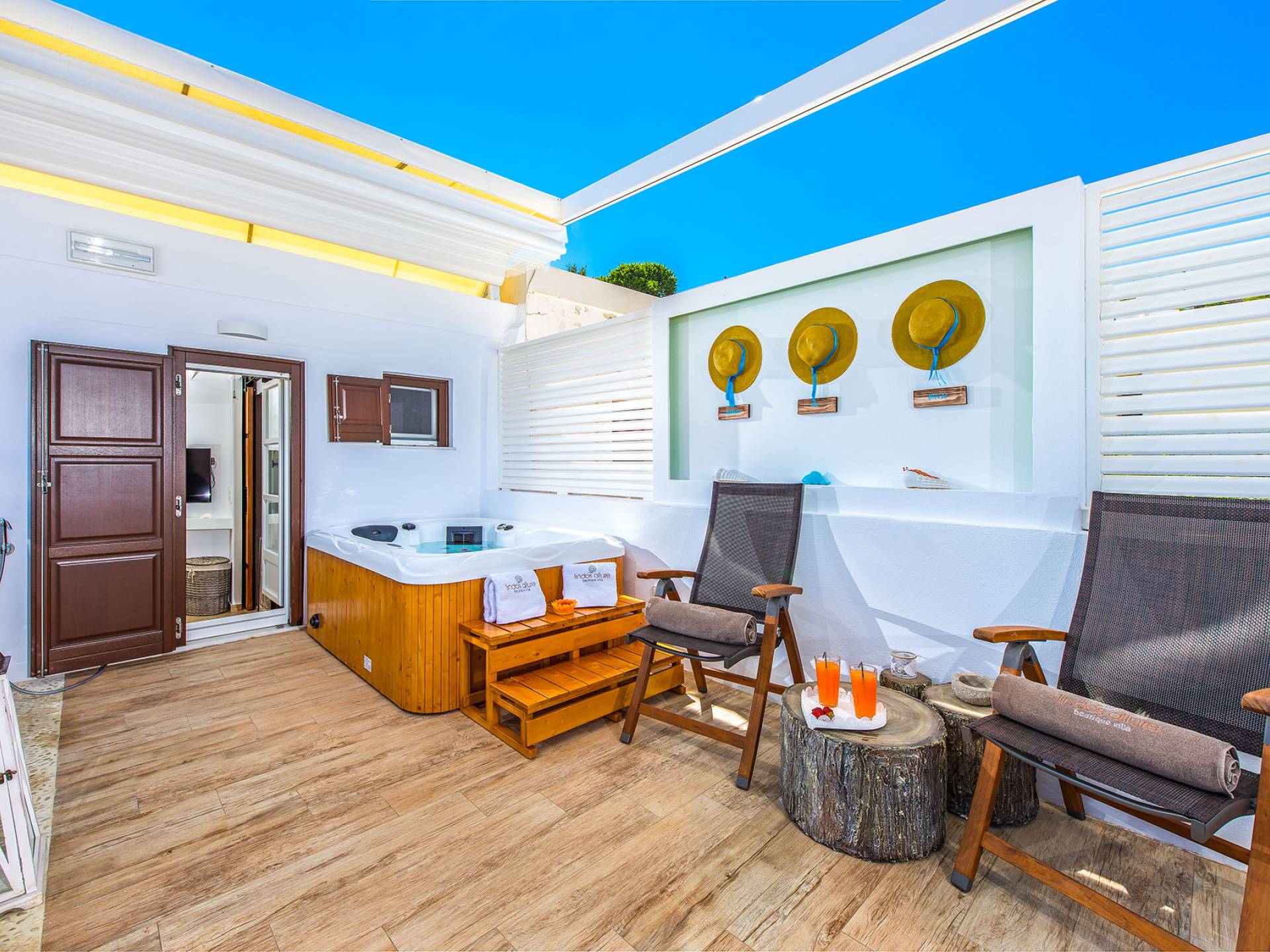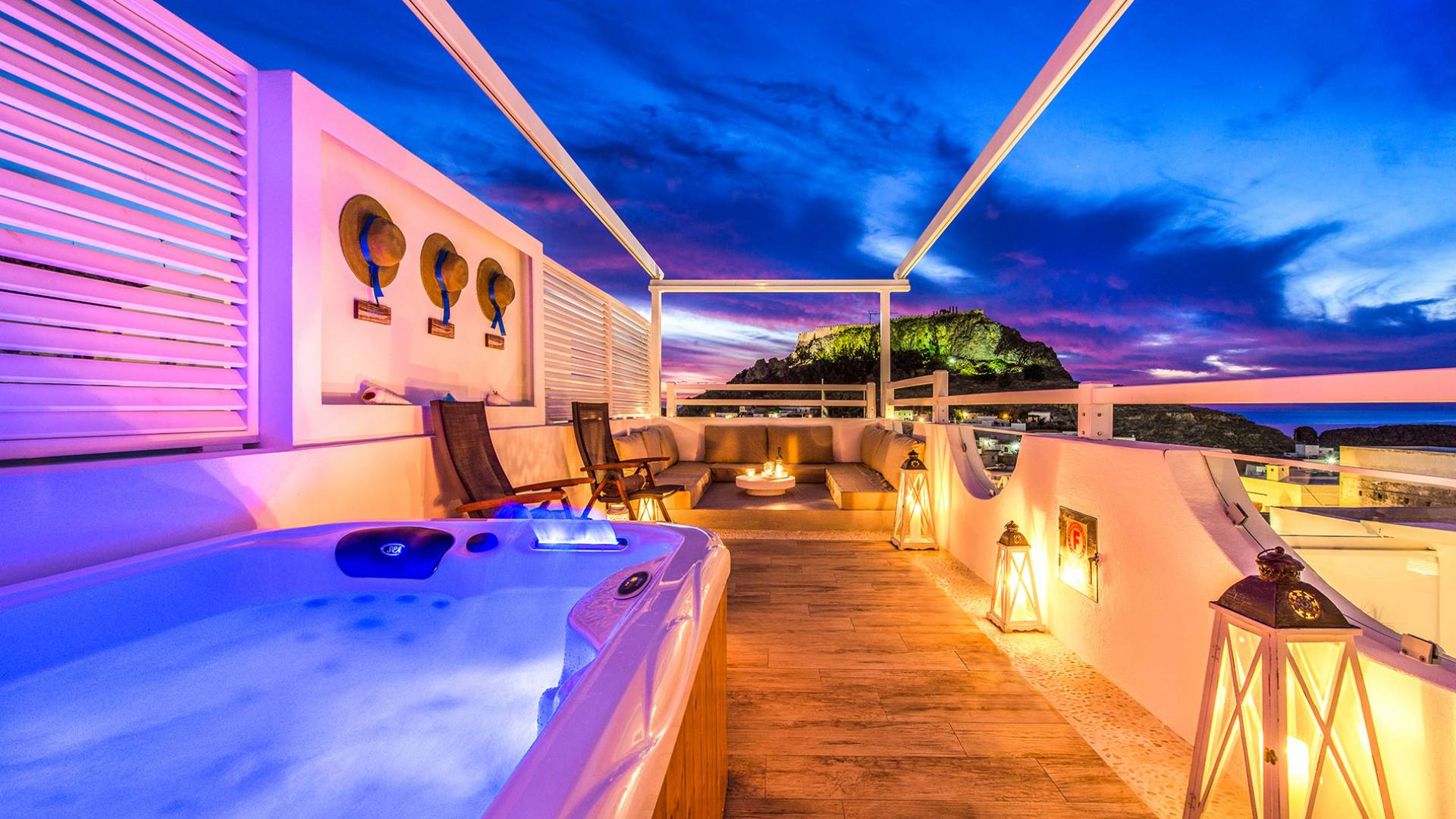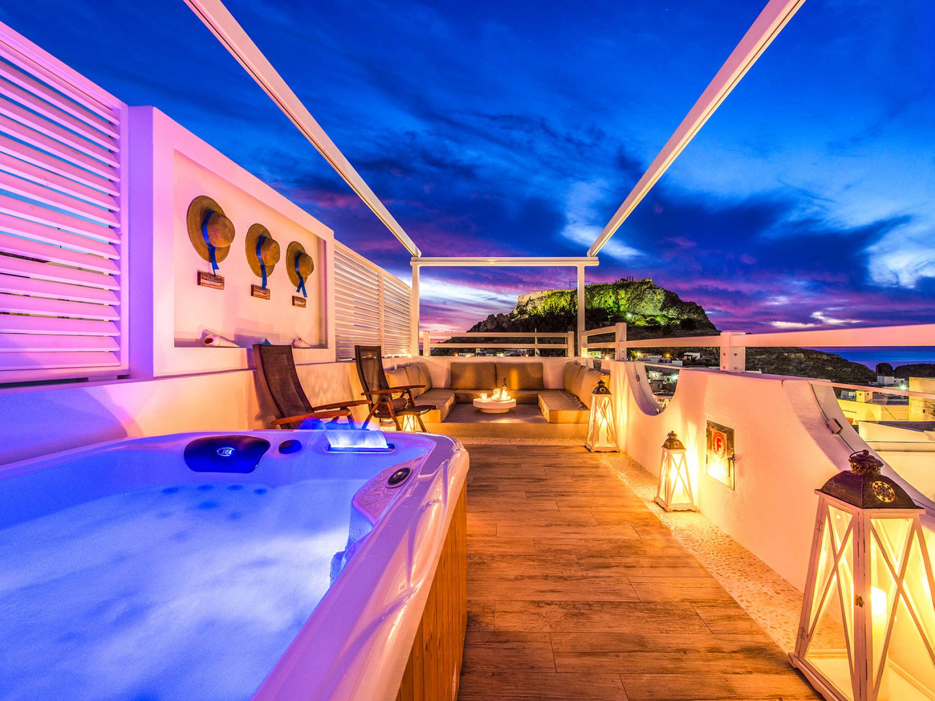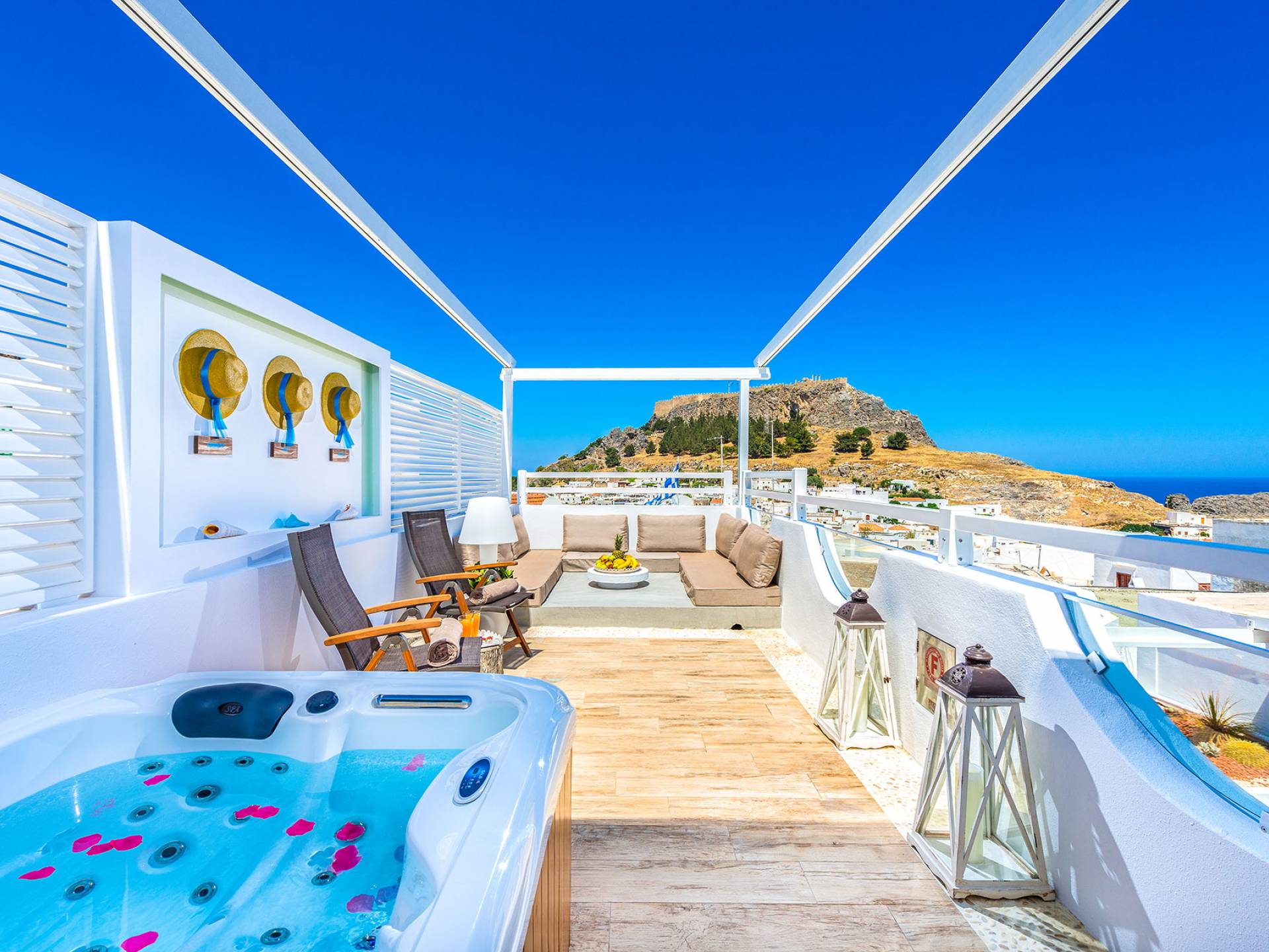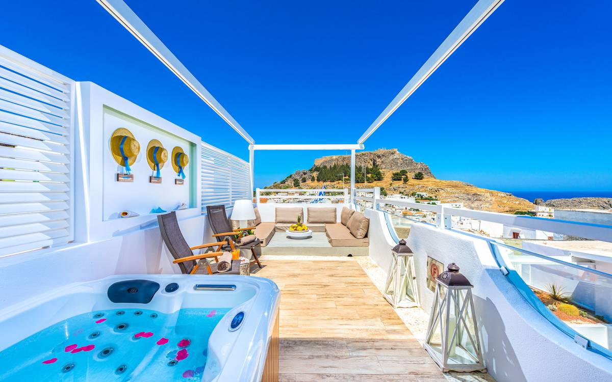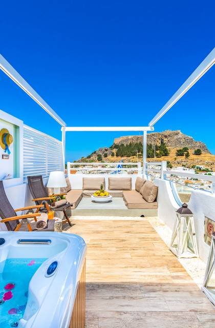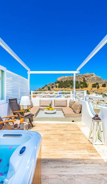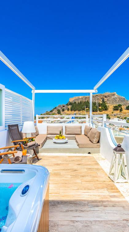 El jardín de la azotea tiene una amplia sala de estar al aire libre construida en piedra, un jacuzzi al aire libre y un área para tomar el sol con lujosas y cómodas tumbonas. Si nuestros huéspedes prefieren la sombra, aquí también se ha instalado un dosel eléctrico con control remoto. Durante su estancia en Lindos, los huéspedes pueden relajarse y disfrutar de las impresionantes vistas de la Acrópolis y del mágico azul del mar Egeo.