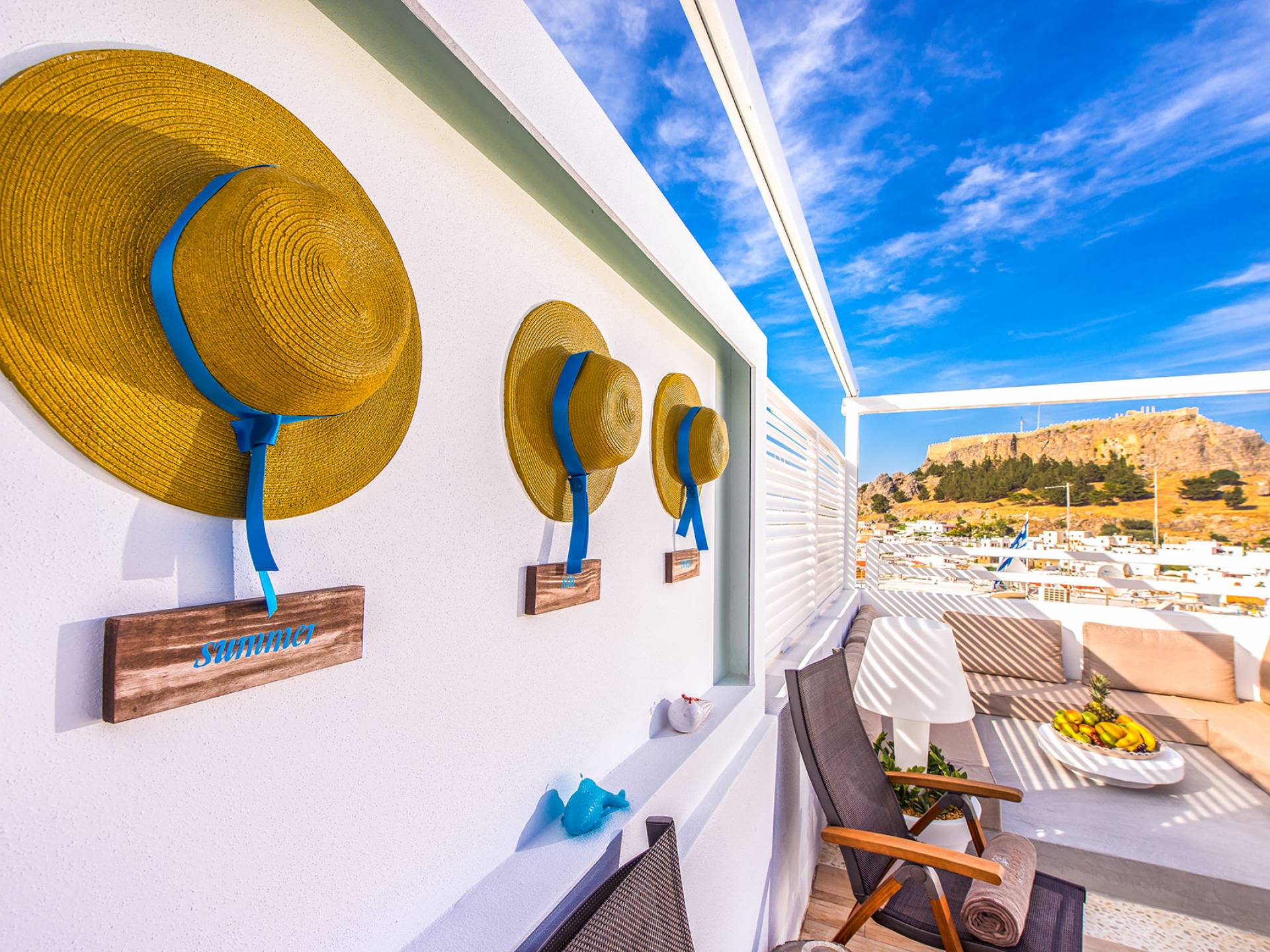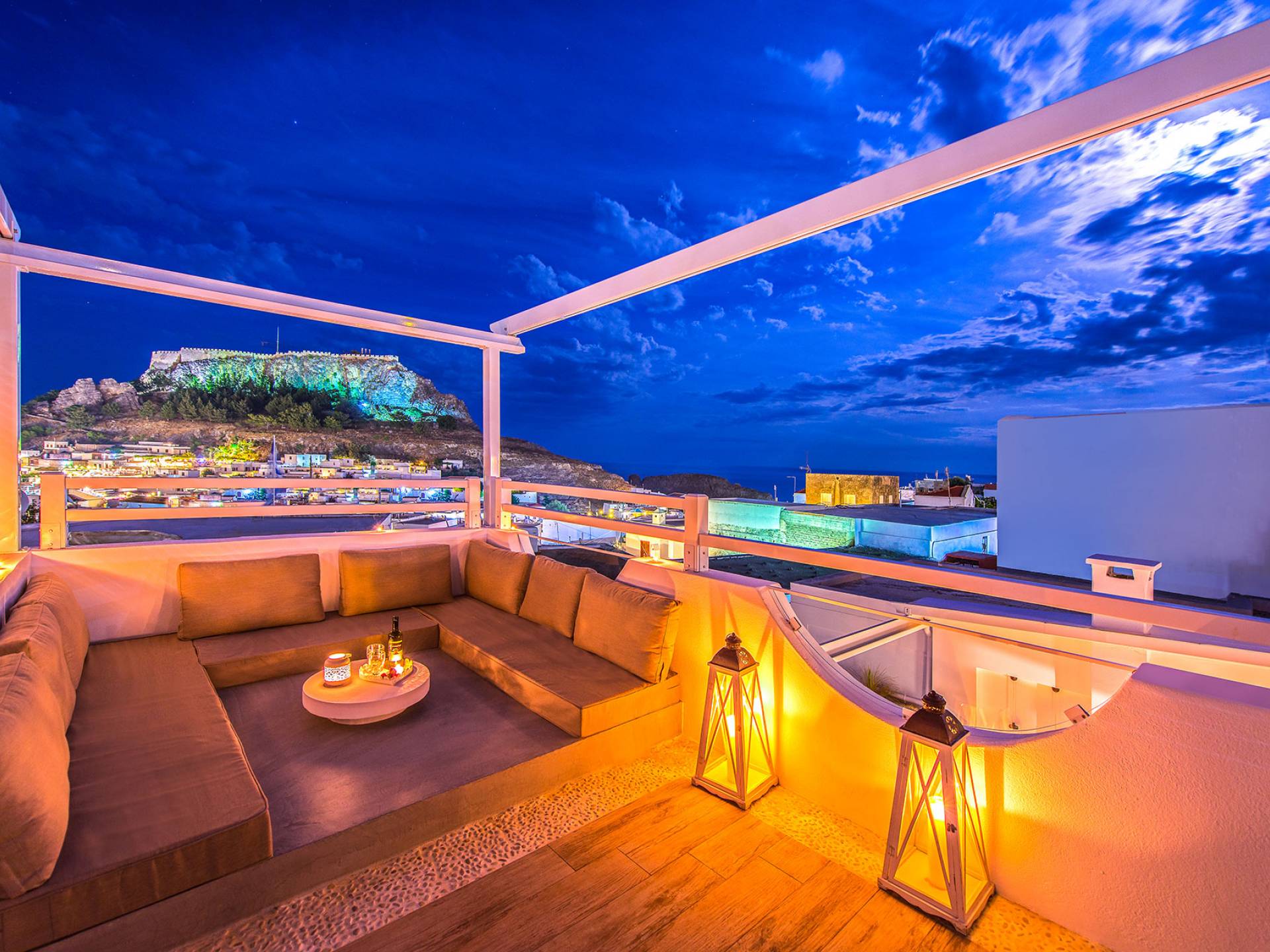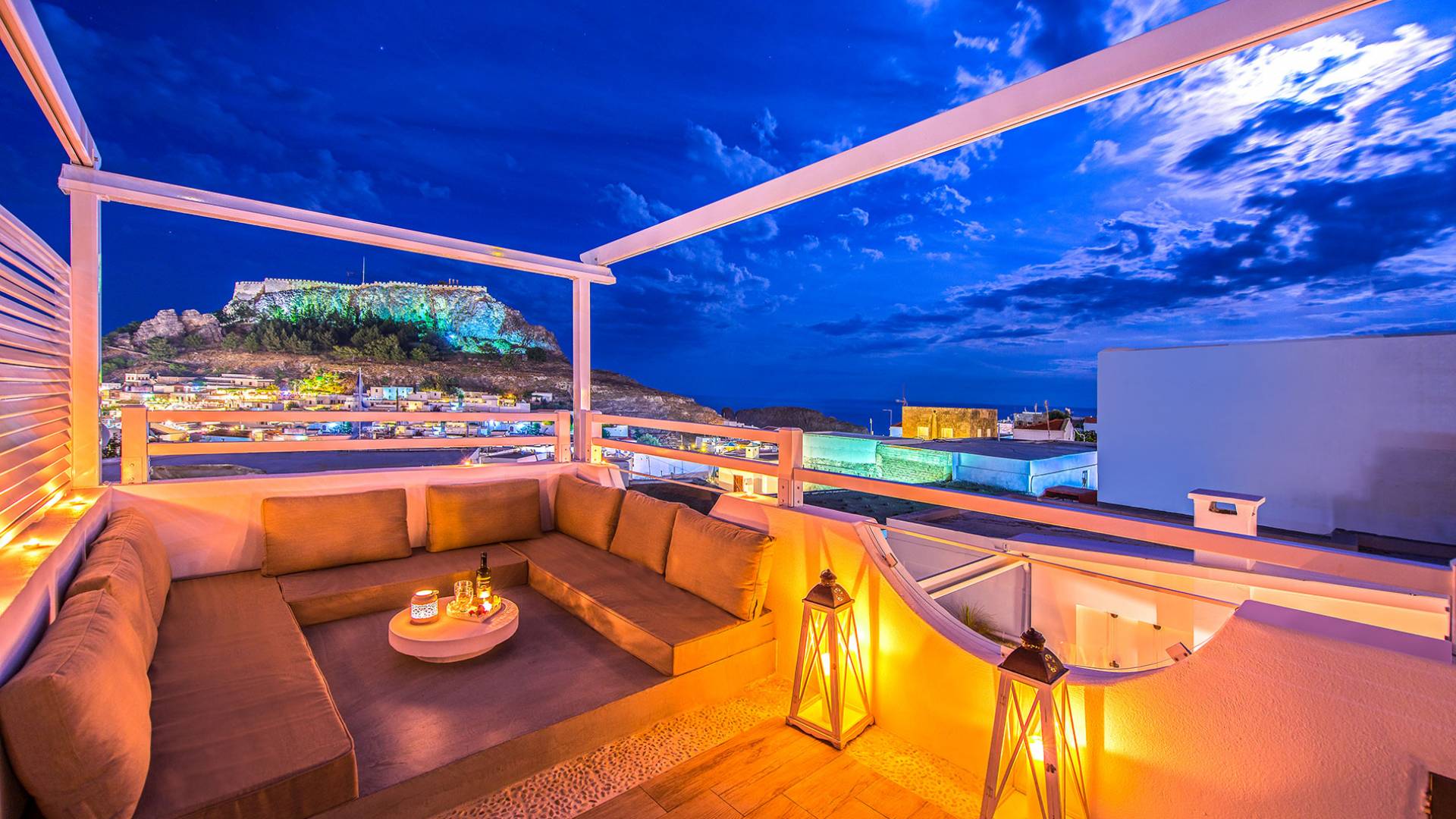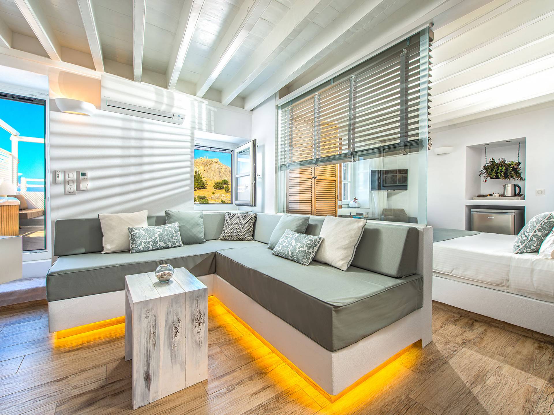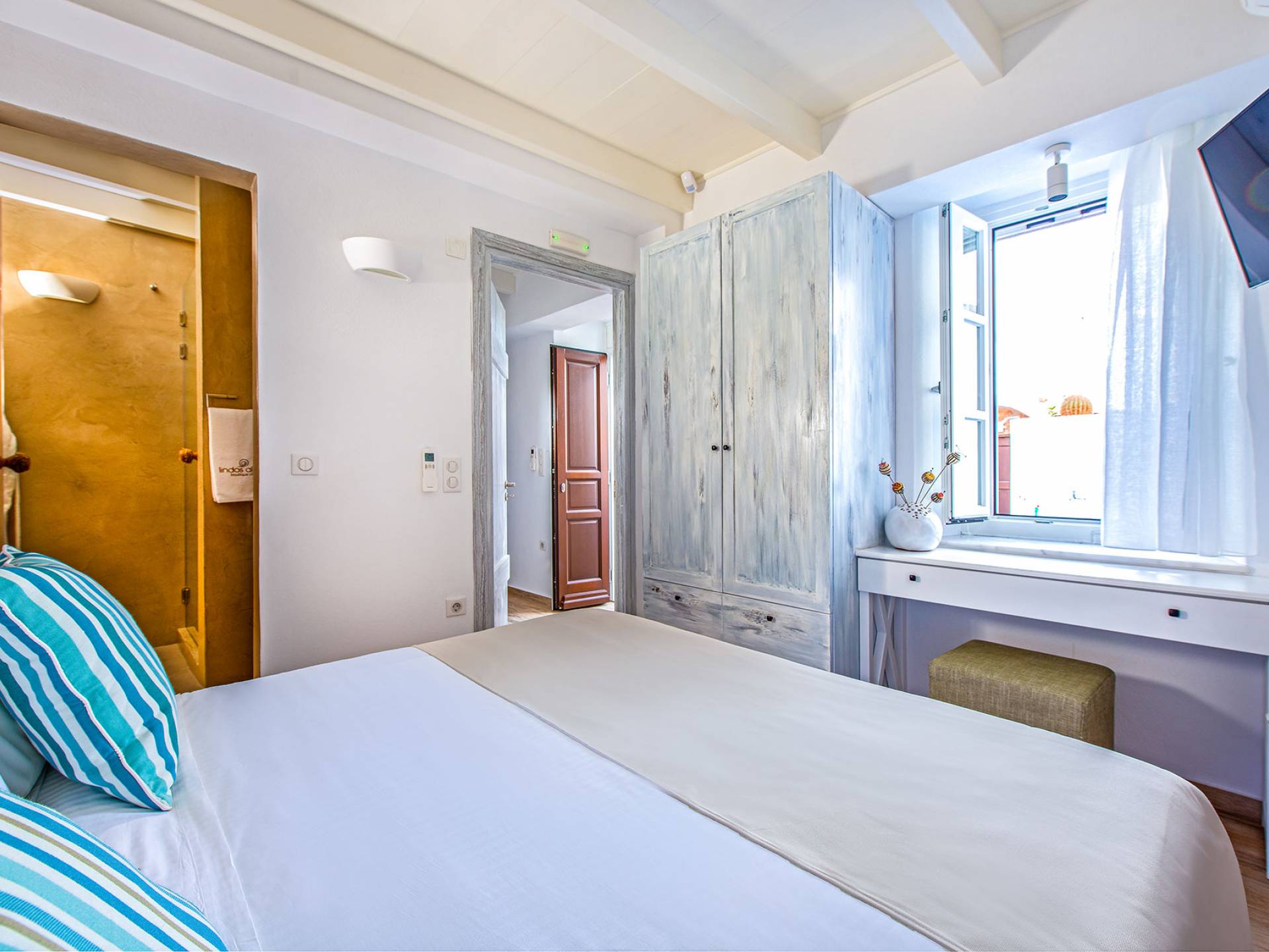 El jardín de la azotea tiene una amplia sala de estar al aire libre construida en piedra, un jacuzzi al aire libre y un área para tomar el sol con lujosas y cómodas tumbonas. Si nuestros huéspedes prefieren la sombra, aquí también se ha instalado un dosel eléctrico con control remoto. Durante su estancia en Lindos, los huéspedes pueden relajarse y disfrutar de las impresionantes vistas de la Acrópolis y del mágico azul del mar Egeo.