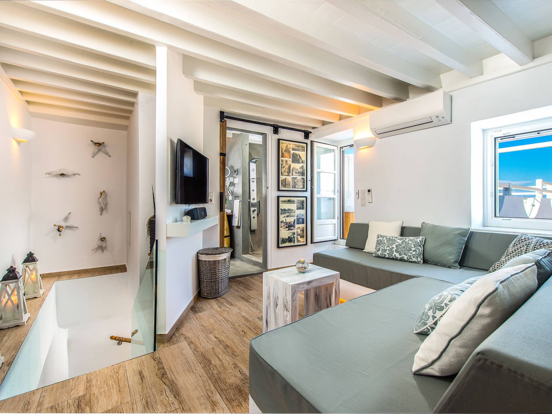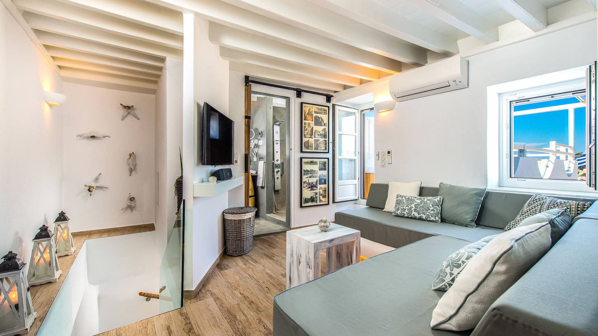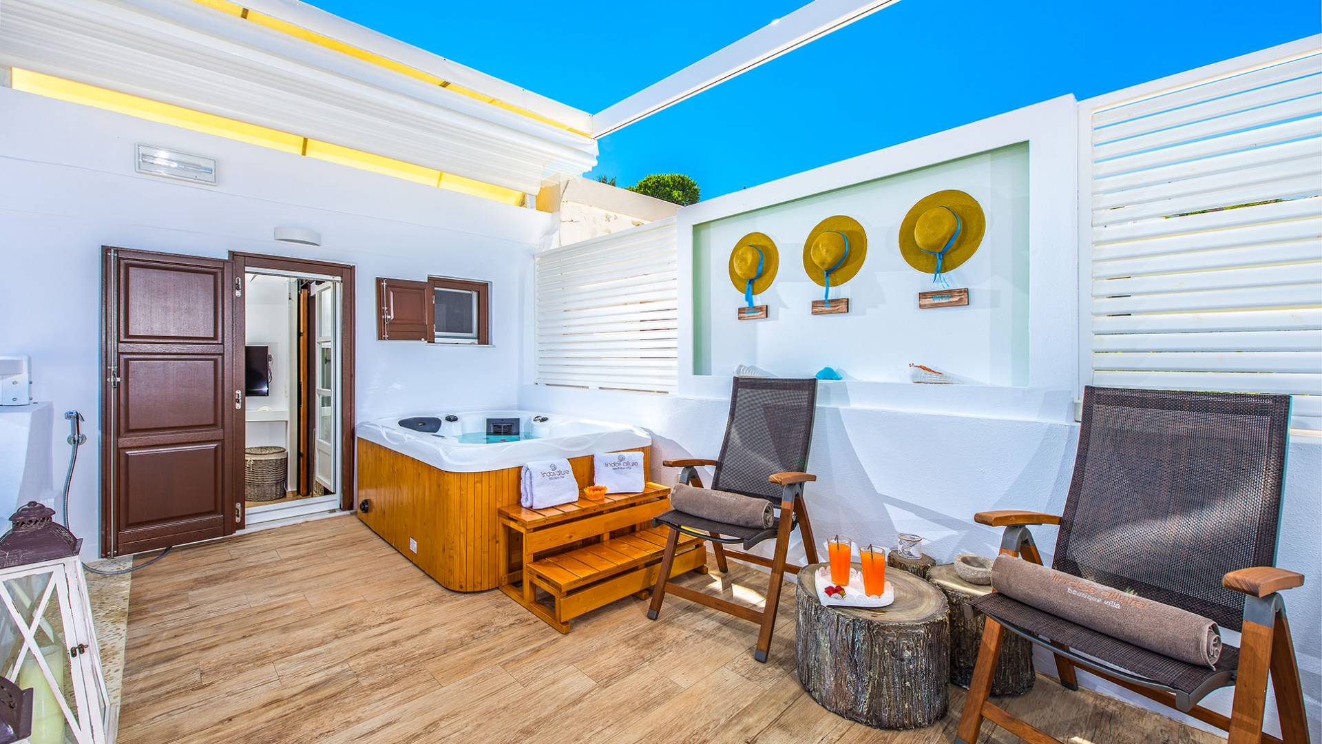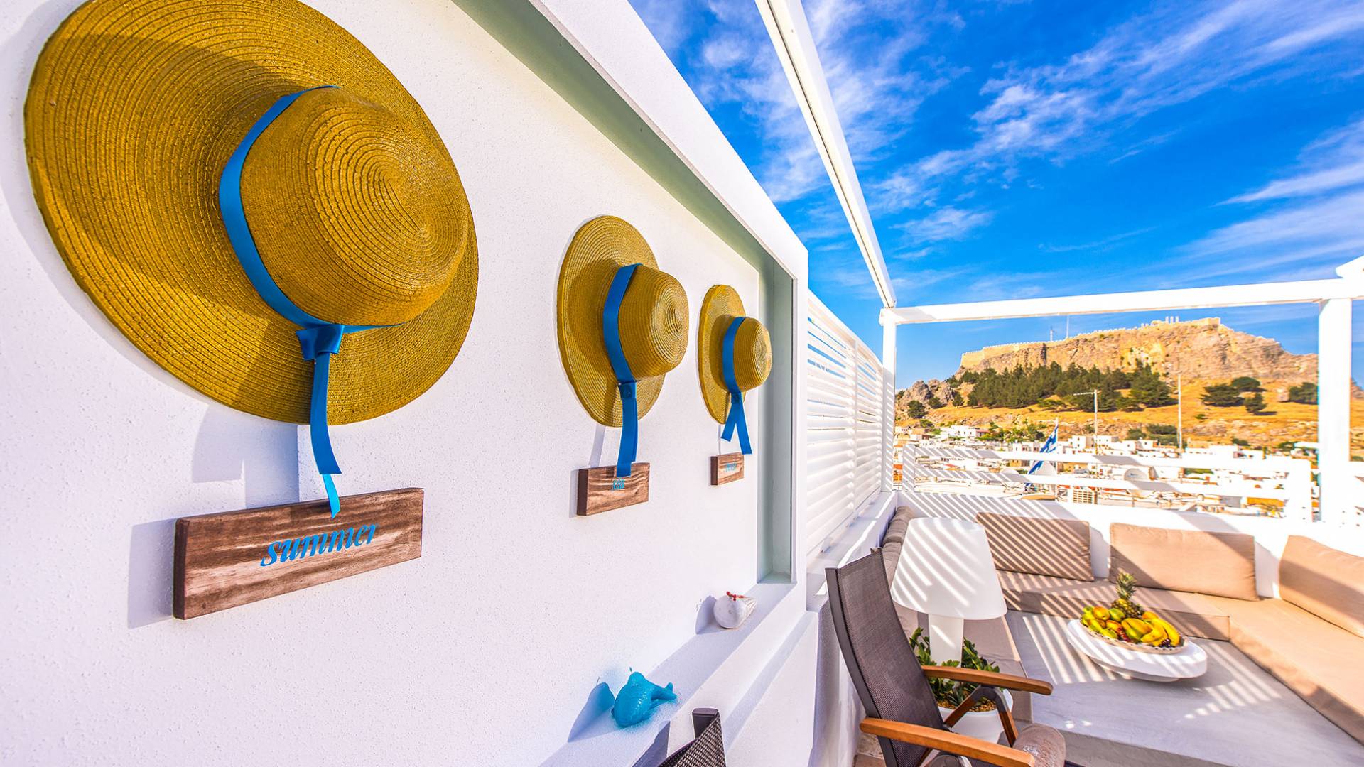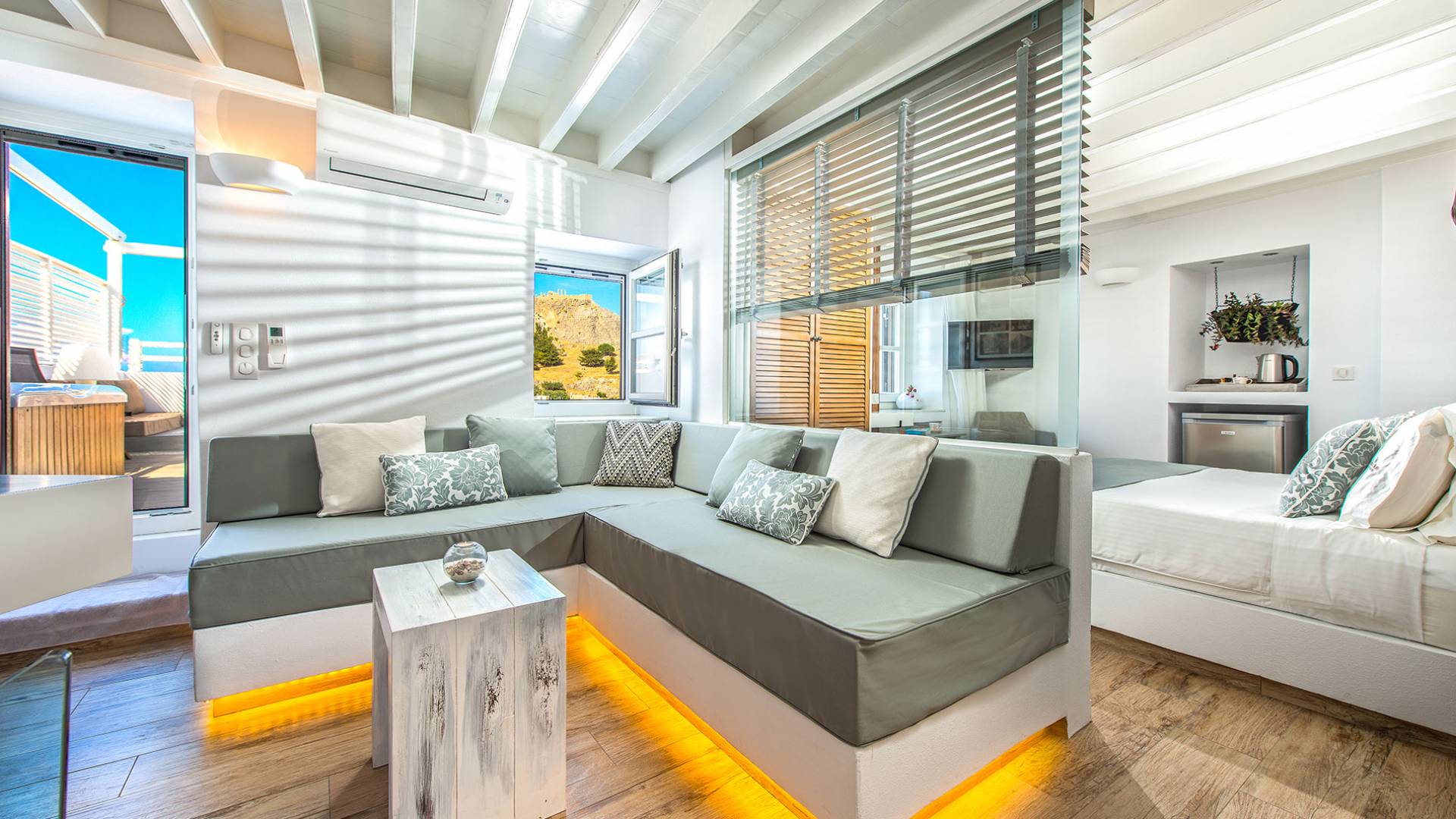 El jardín de la azotea tiene una amplia sala de estar al aire libre construida en piedra, un jacuzzi al aire libre y un área para tomar el sol con lujosas y cómodas tumbonas. Si nuestros huéspedes prefieren la sombra, aquí también se ha instalado un dosel eléctrico con control remoto. Durante su estancia en Lindos, los huéspedes pueden relajarse y disfrutar de las impresionantes vistas de la Acrópolis y del mágico azul del mar Egeo.
