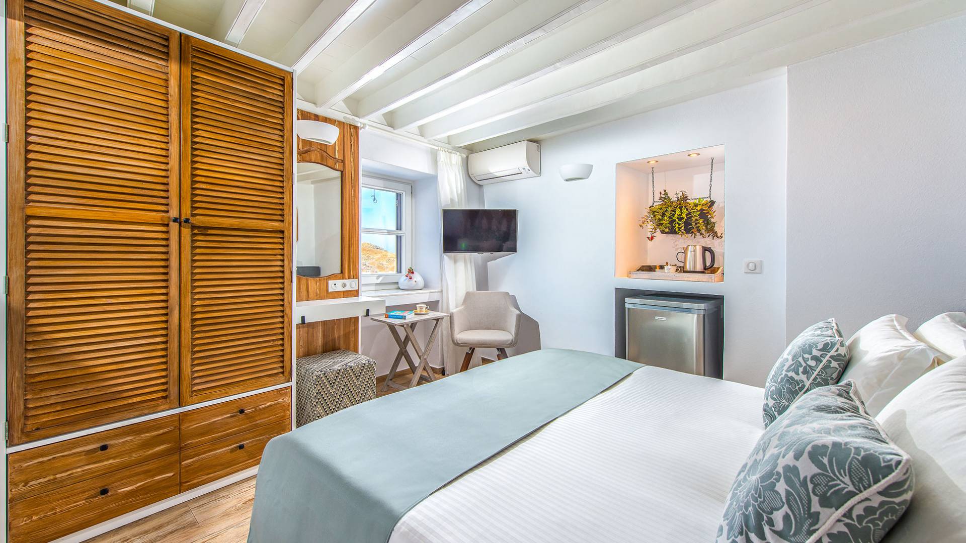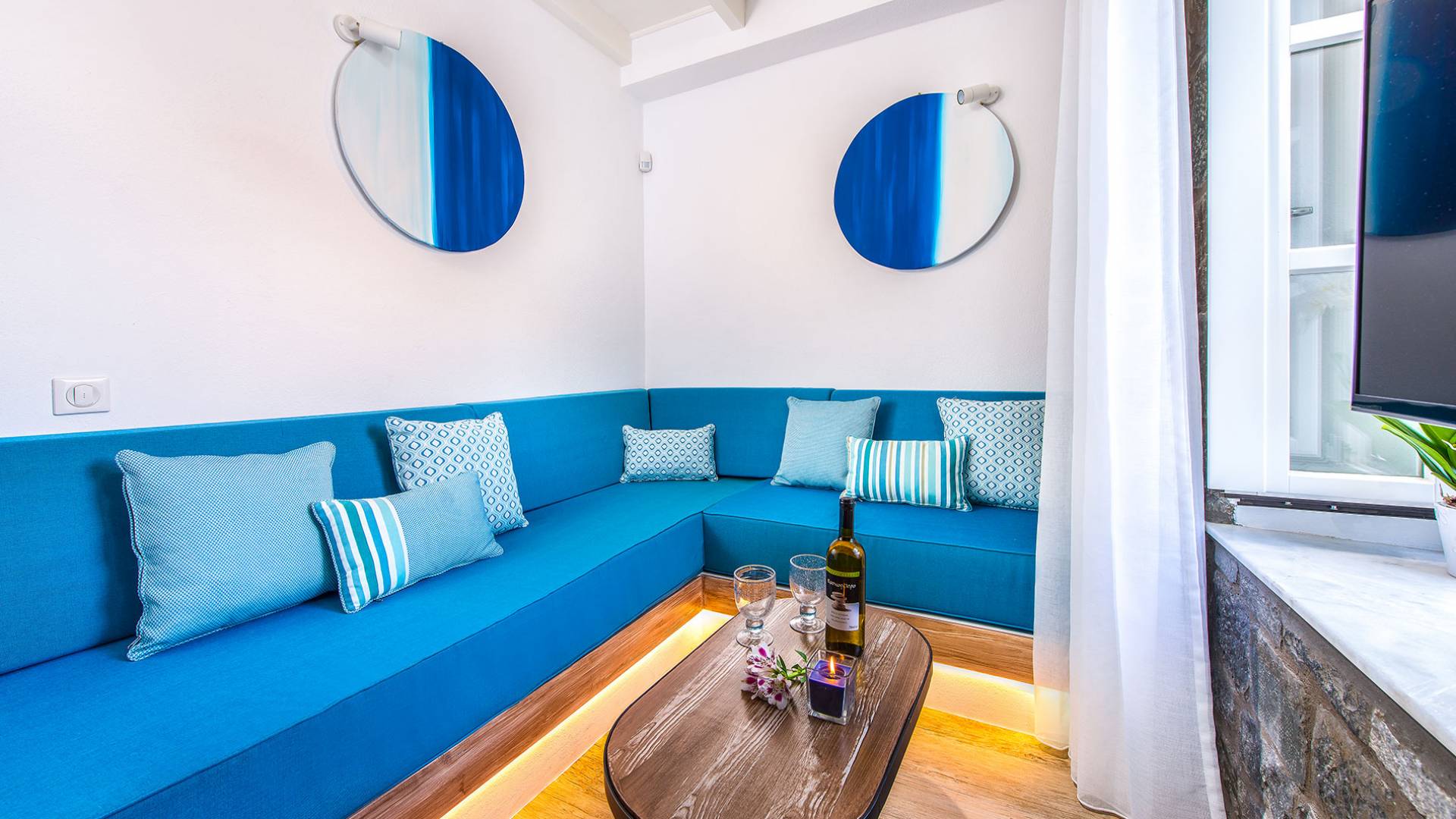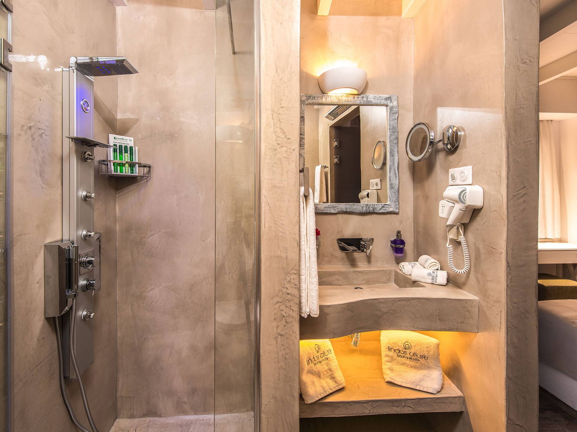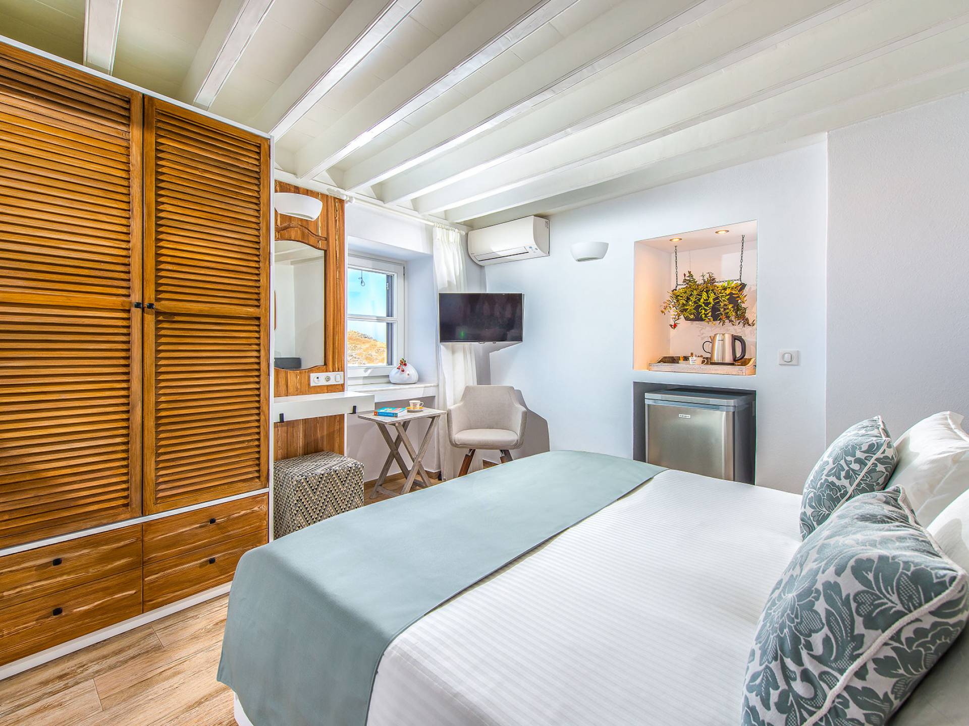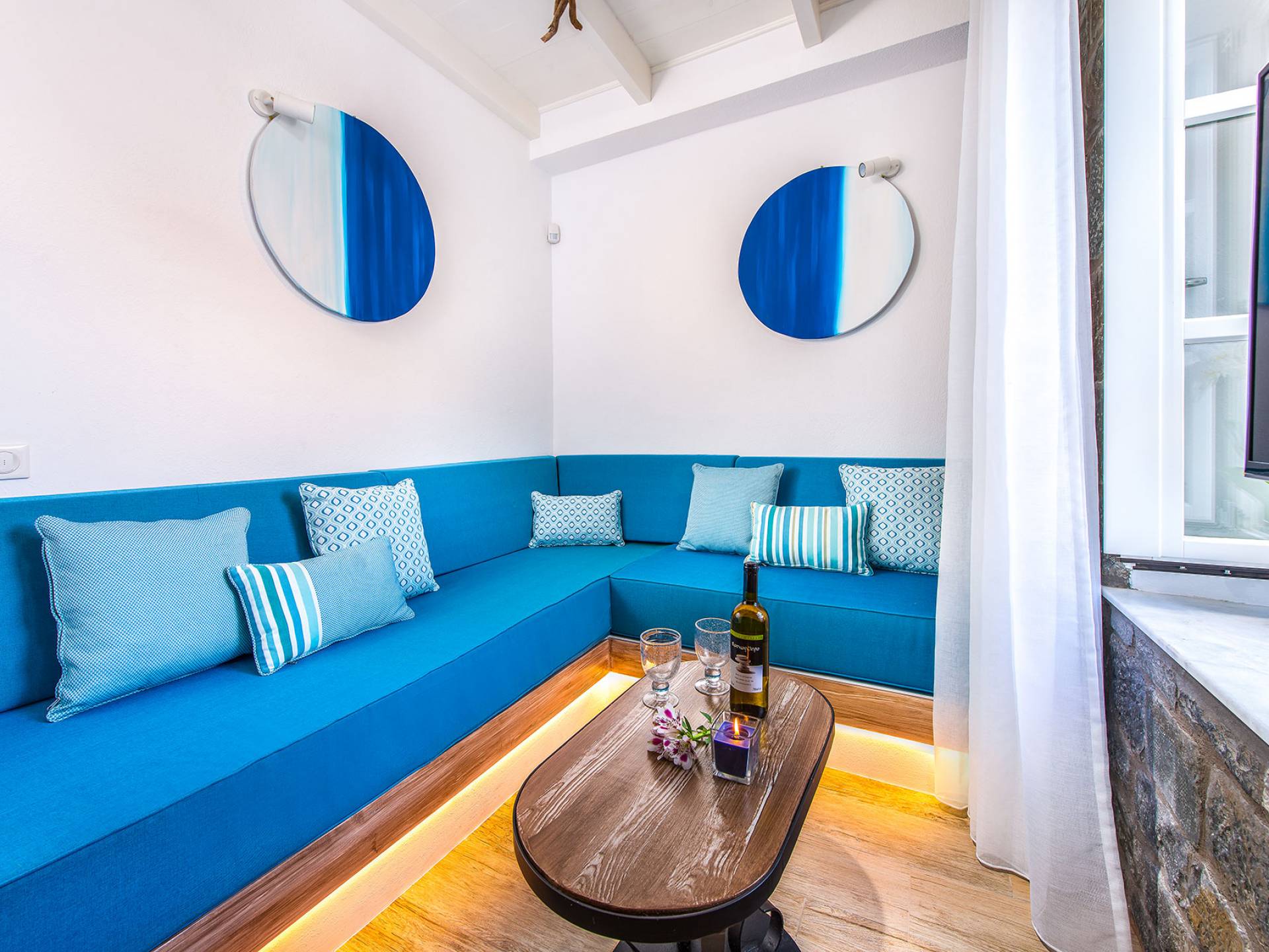 El jardín de la azotea tiene una amplia sala de estar al aire libre construida en piedra, un jacuzzi al aire libre y un área para tomar el sol con lujosas y cómodas tumbonas. Si nuestros huéspedes prefieren la sombra, aquí también se ha instalado un dosel eléctrico con control remoto. Durante su estancia en Lindos, los huéspedes pueden relajarse y disfrutar de las impresionantes vistas de la Acrópolis y del mágico azul del mar Egeo.
