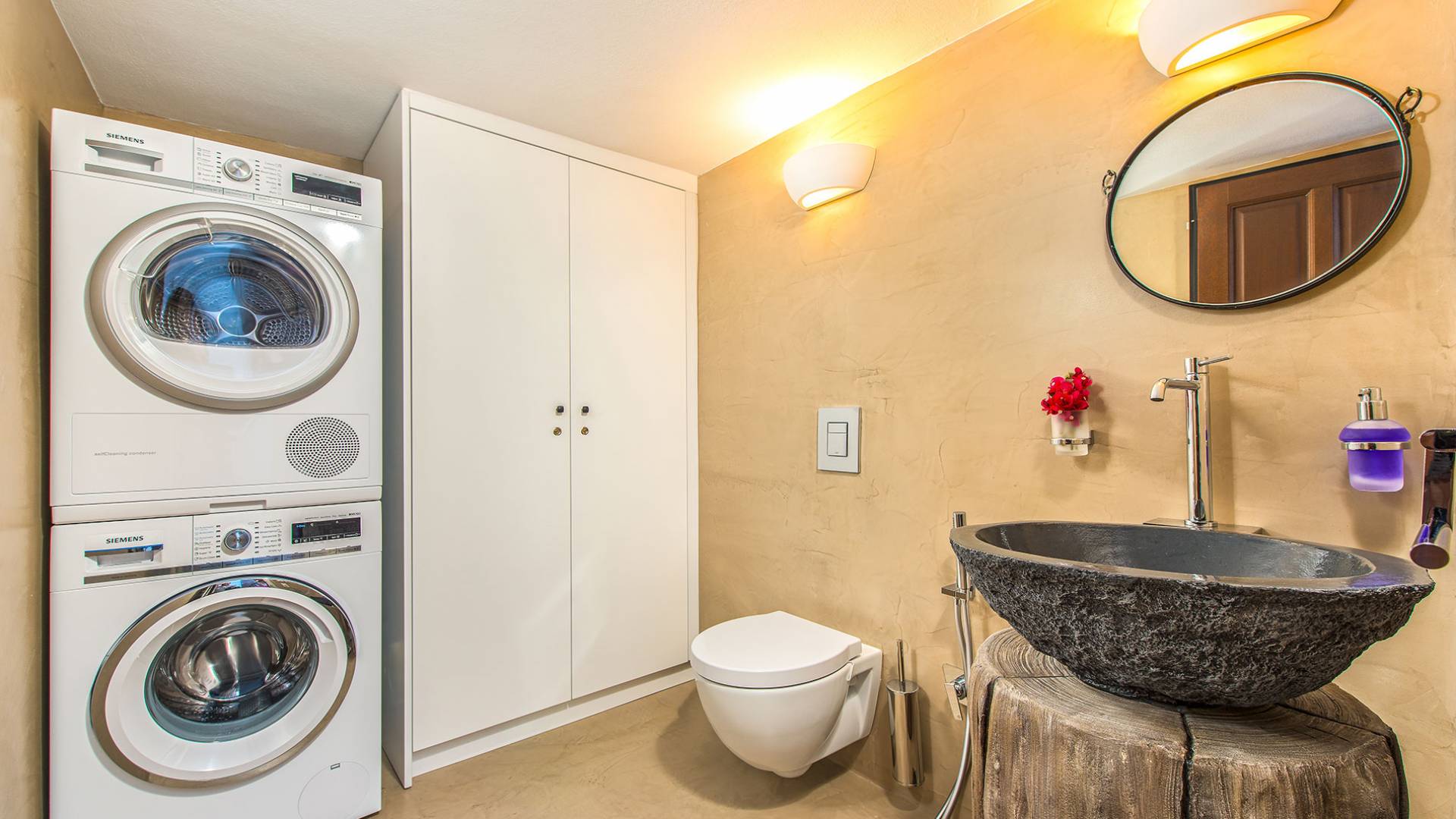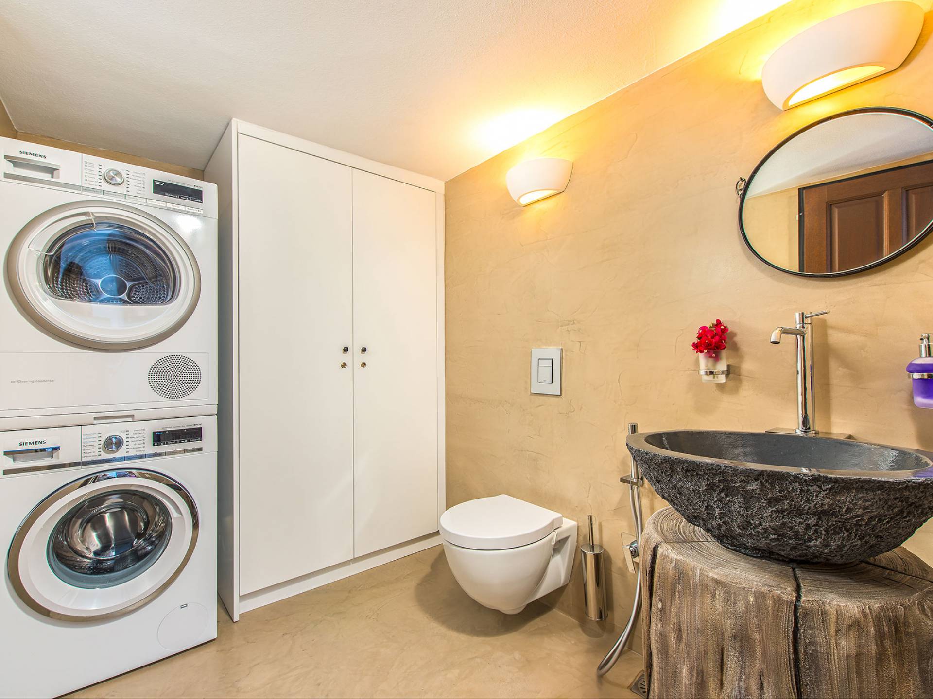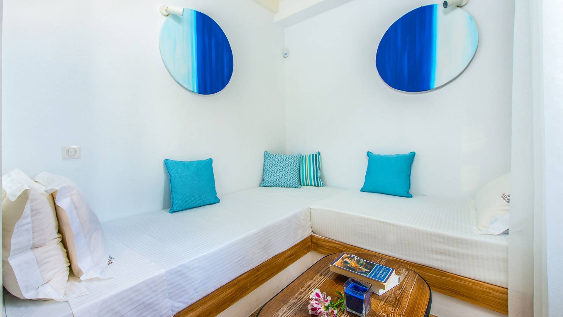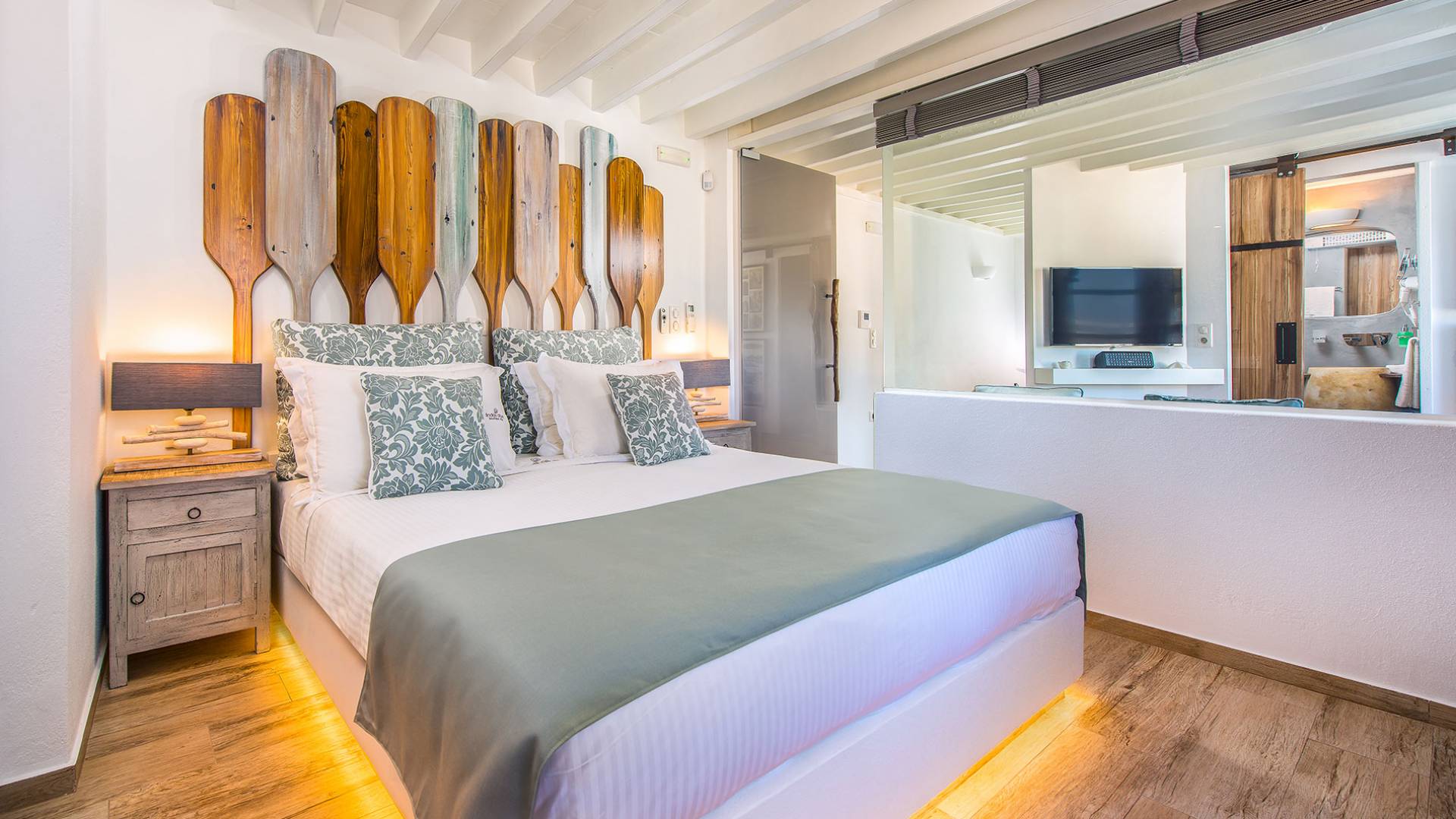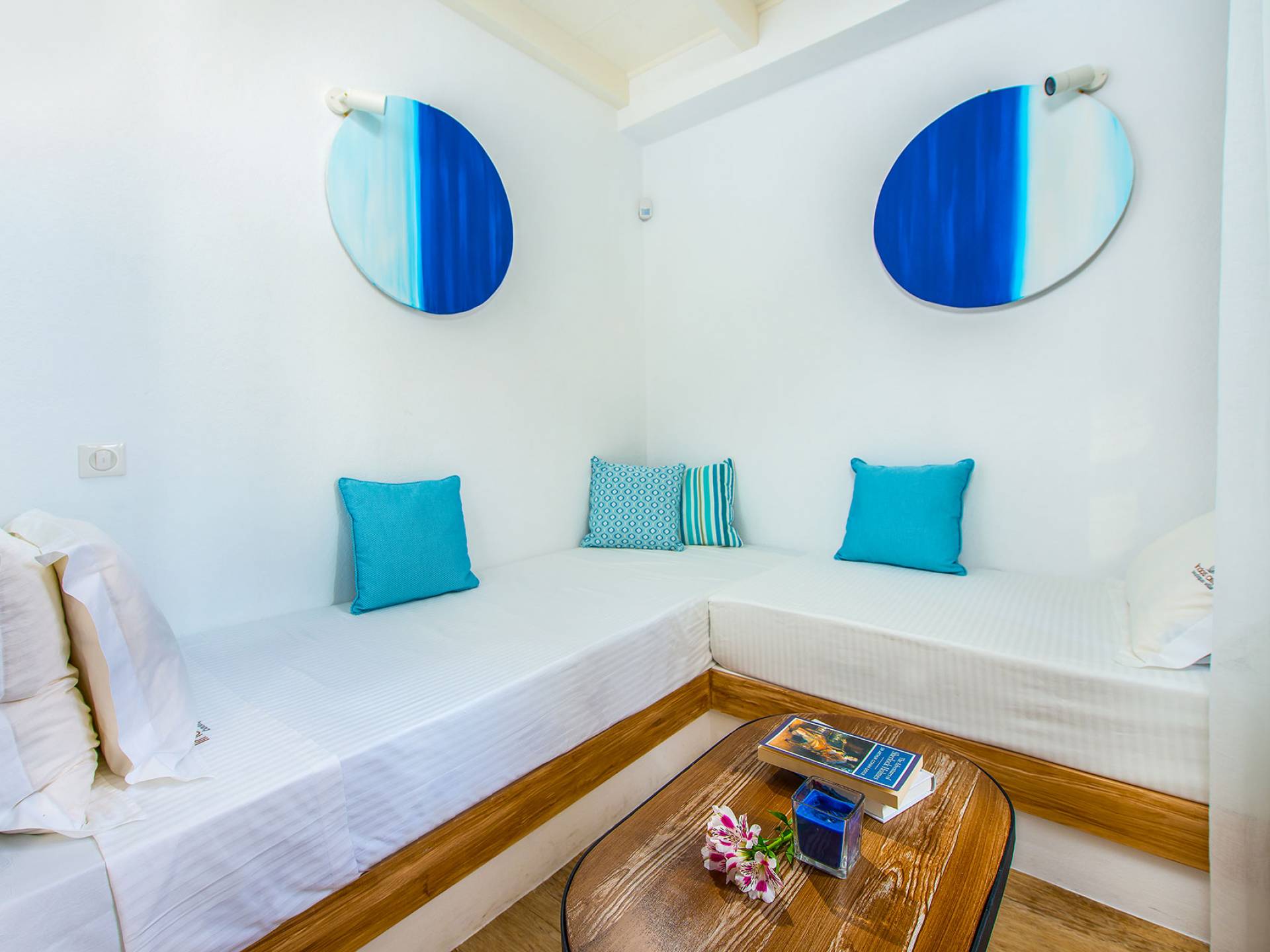 En el primer piso, hay una espaciosa suite que incluye un dormitorio, también con una lujosa cama doble tamaño king, una sala de estar y un baño. Al igual que el baño de la planta baja, este también cuenta con una cabina de ducha exenta equipada con ducha de hidromasaje con cromoterapia y está completamente equipada con amenities, albornoces, toallas y secador de pelo, así como toallas que los huéspedes pueden llevarse a la playa . Los cómodos sofás cama en la sala de estar pueden albergar a dos personas más, y la habitación doble se puede ocultar desde la sala de estar mediante una puerta de vidrio y persianas eléctricas con control remoto para mayor privacidad. El dormitorio tiene su propio balcón privado, pero lo que realmente captura los corazones de los huéspedes es el magnífico jardín en la azotea.