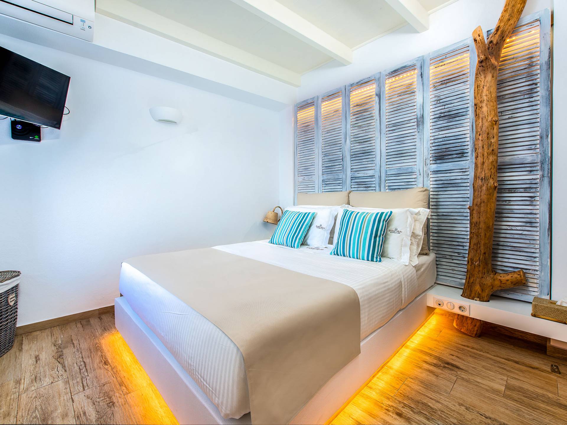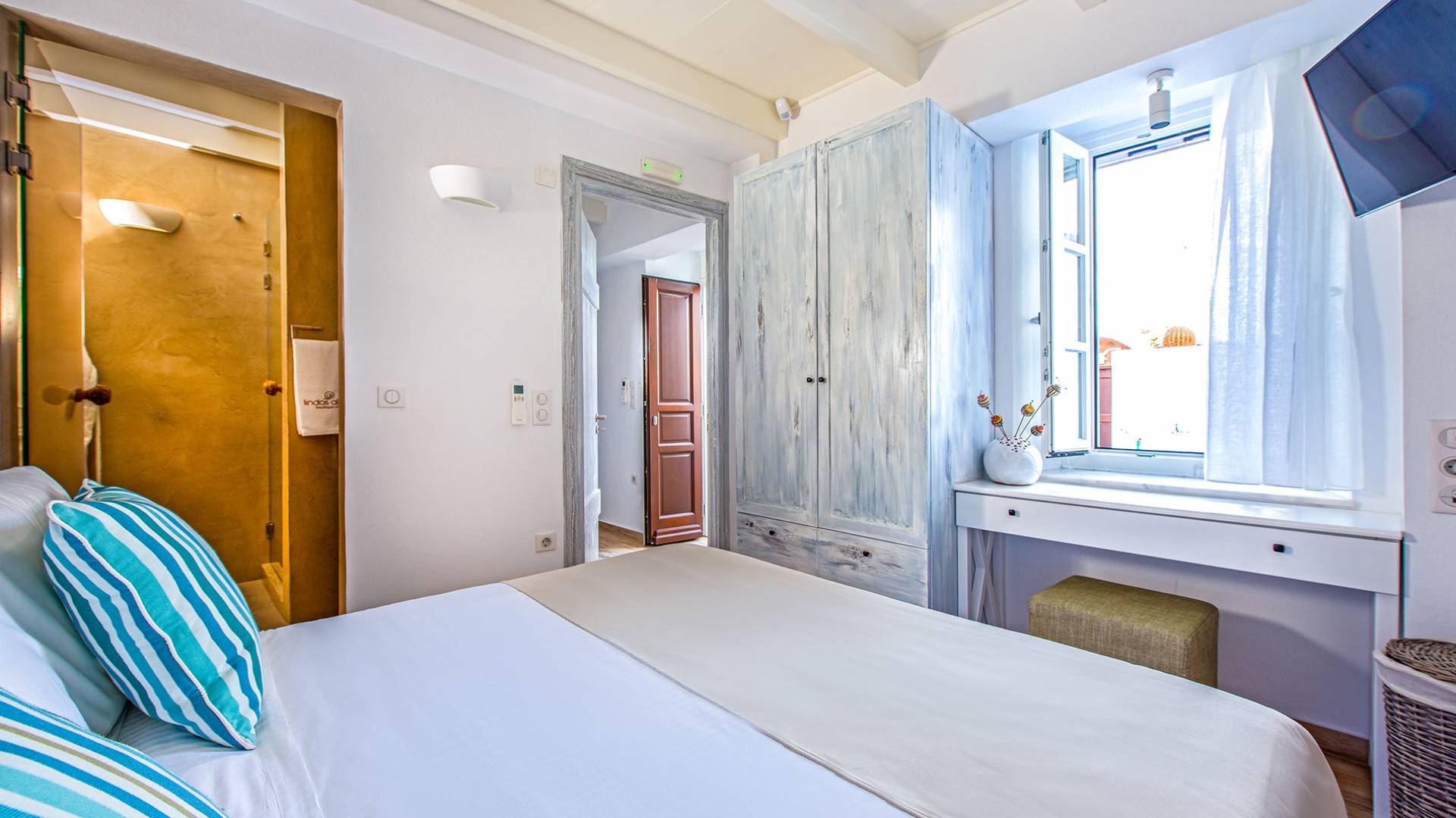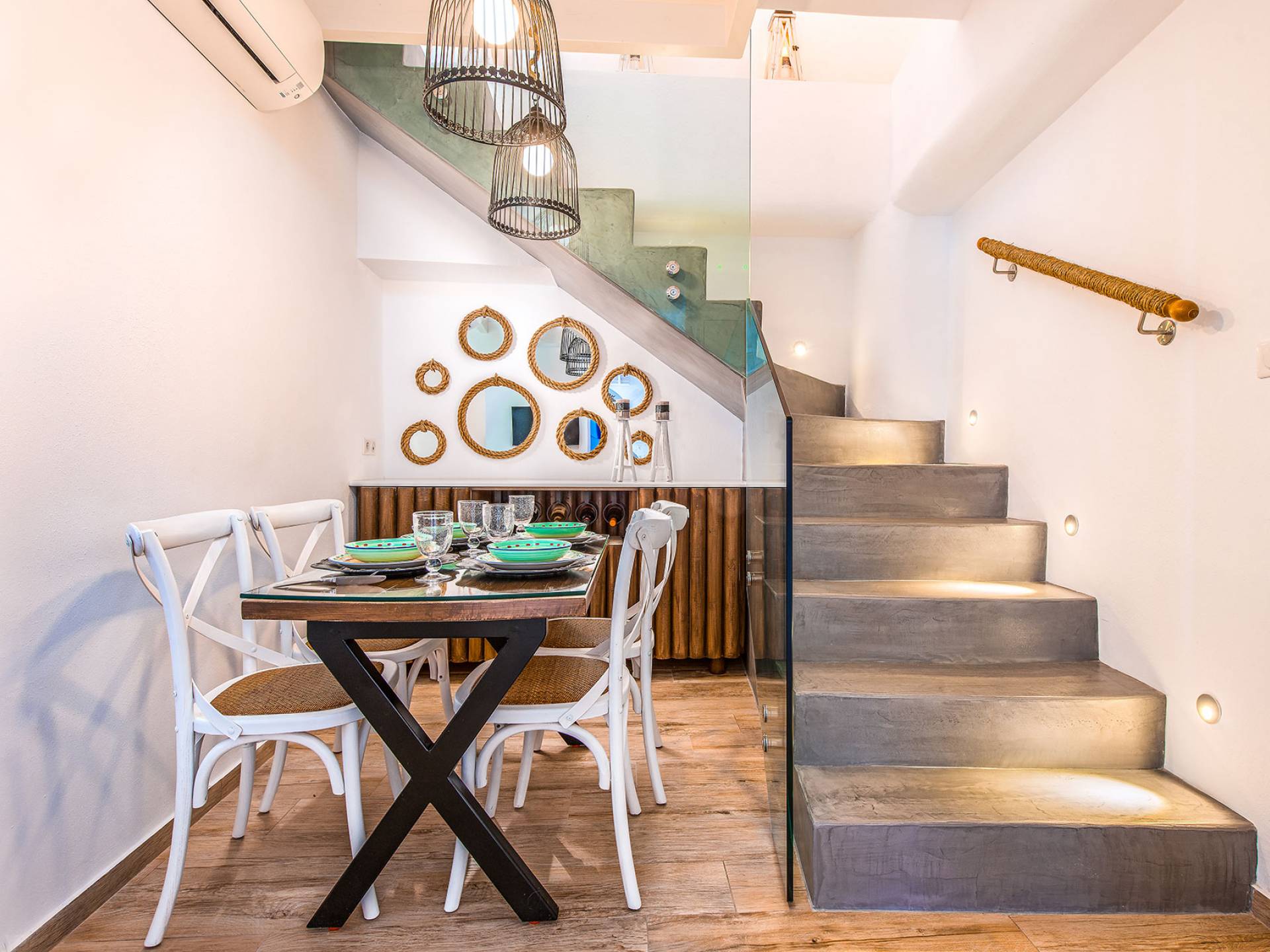 Lindos Allure Villa Rhodes es una villa familiar de dos plantas con una superficie de 170 m2, con capacidad para ocho personas. Esta casa en Lindos fue construida según la arquitectura tradicional del asentamiento y ha sido recientemente restaurada, renovada y reformada. Todos sus elementos arquitectónicos tradicionales únicos se han mantenido y resaltado, pero también se han combinado con los de diseño minimalista y contemporáneo. Este “matrimonio” de elementos decorativos antiguos y nuevos ofrece una atmósfera increíble. Los colores y texturas del entorno natural de Lindos se han utilizado para decorar la villa y hacer que parezca parte de su entorno. Todos los techos de la villa han sido elaborados en madera al estilo local. Todas las puertas, los marcos de las ventanas y las contraventanas también son de madera con el diseño tradicional, y todas las ventanas y la puerta que da al jardín de la azotea se han equipado con mosquiteras.