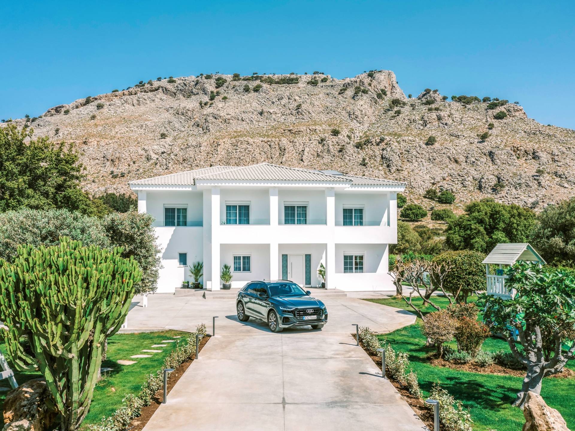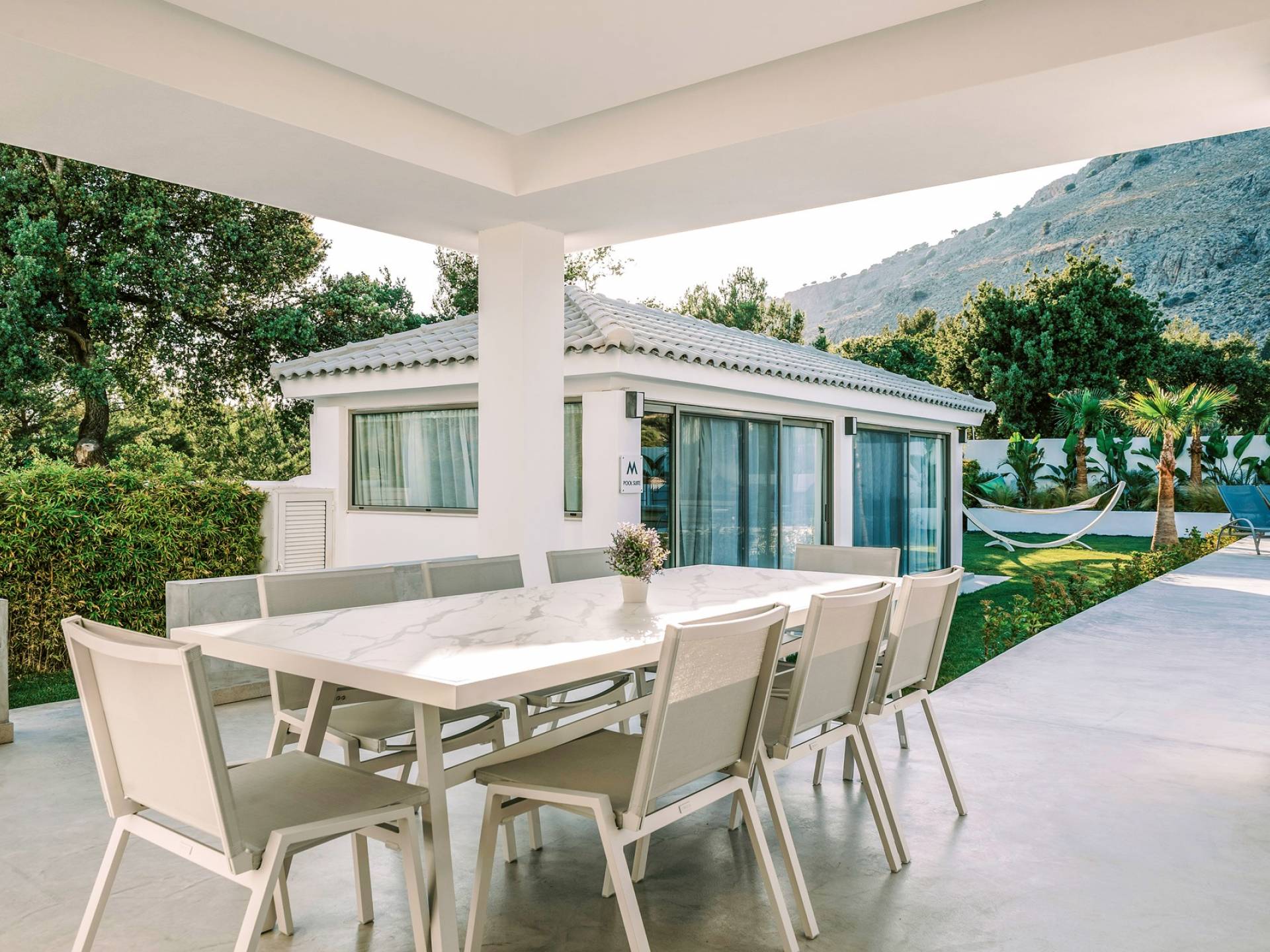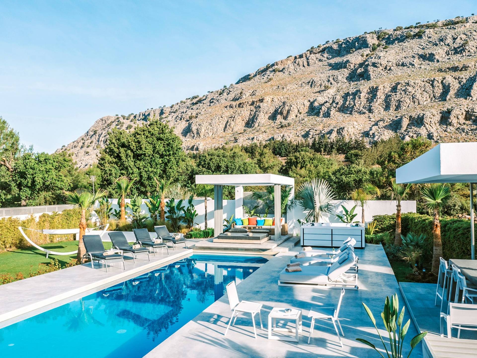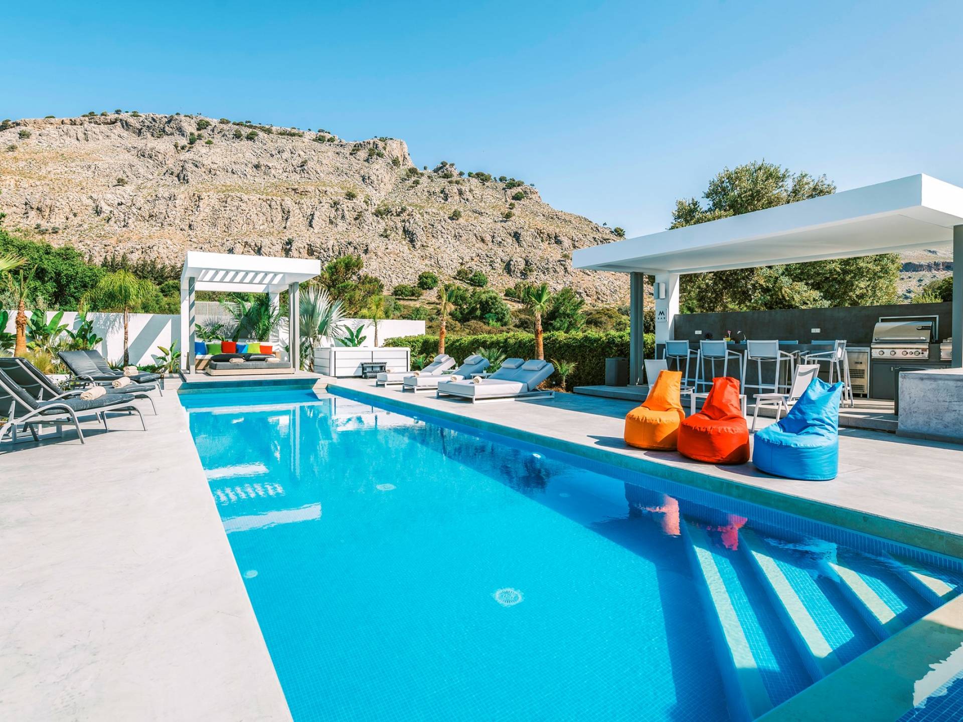 Cada habitación ofrece impresionantes vistas del paisaje tropical privado, así como del espectacular paisaje natural del área de Pefkos. La espaciosa villa (350 metros cuadrados) encapsula el espíritu del minimalismo sofisticado además de los elementos arquitectónicos tradicionales de Lindia y está llena de áreas de vida genuinas llenas de arte. Tanto las áreas interiores como las exteriores son irresistibles para todos los gustos.