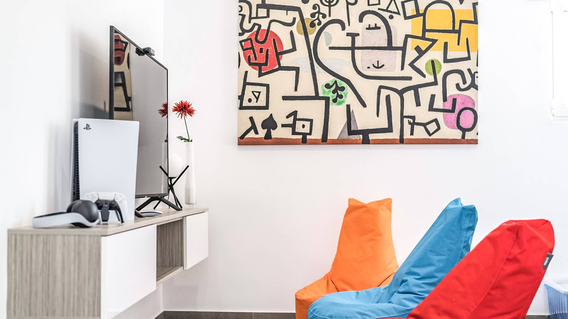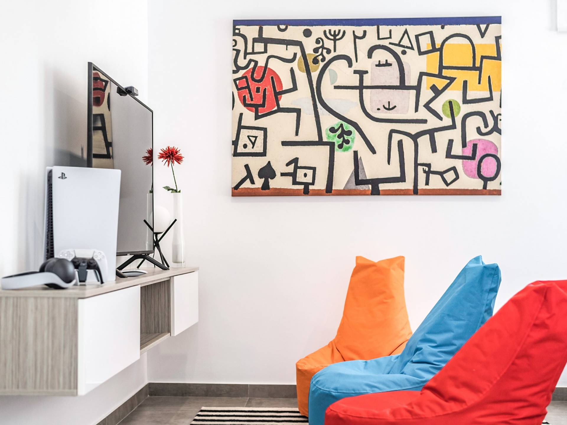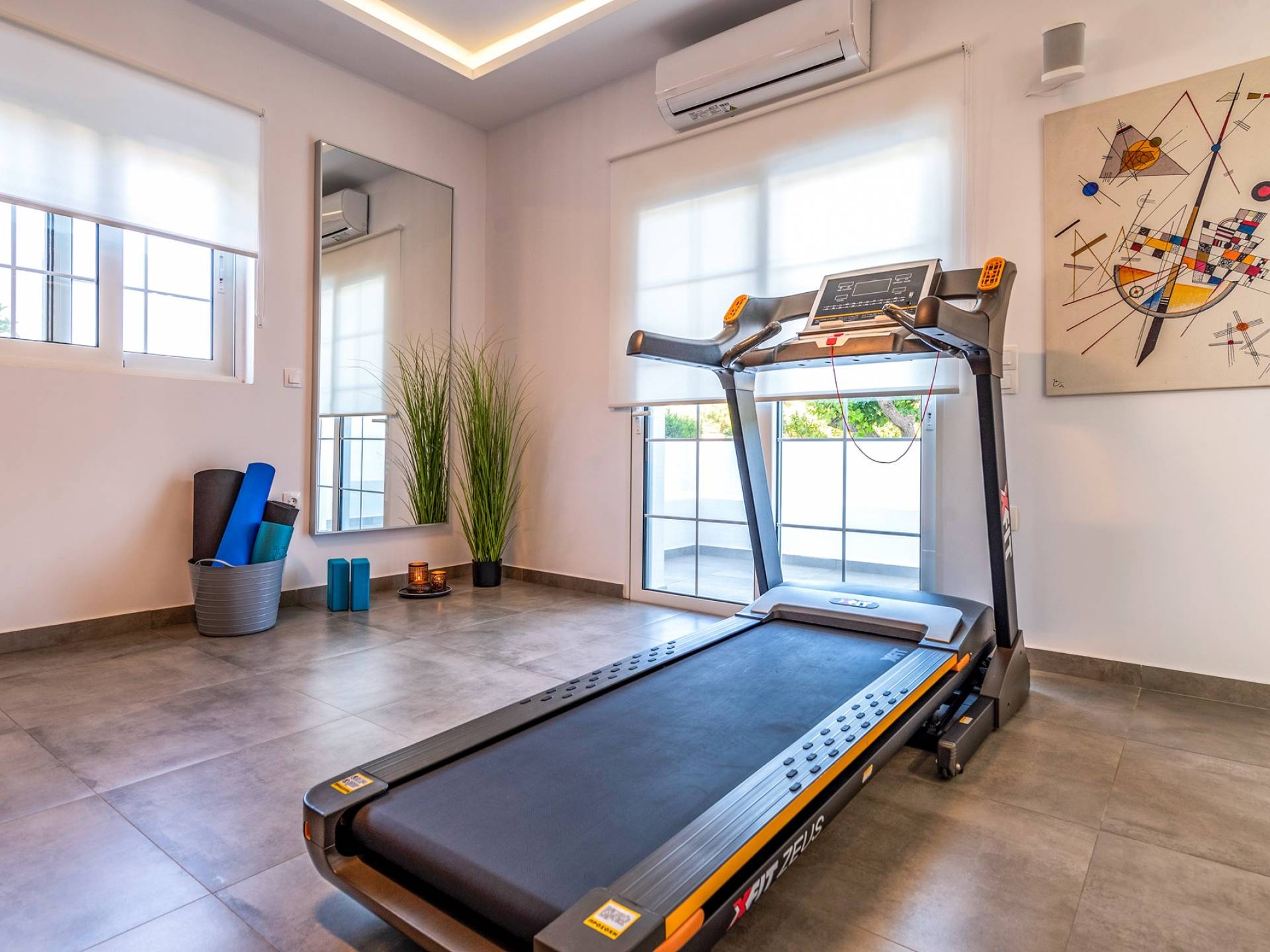 Un gimnasio con una cinta de correr eléctrica profesional (máquina para correr), colchoneta de yoga y pesas con mancuernas, y más accesorios de ejercicio, suficientes para mantenerse en forma durante sus vacaciones. Un espacio de trabajo con impresora y escritorio, para quienes quieran combinar vacaciones y trabajo a distancia. La sala de juegos lleva tus vacaciones al siguiente nivel. PlayStation 5 y muchos otros juegos están dedicados al placer y la relajación.