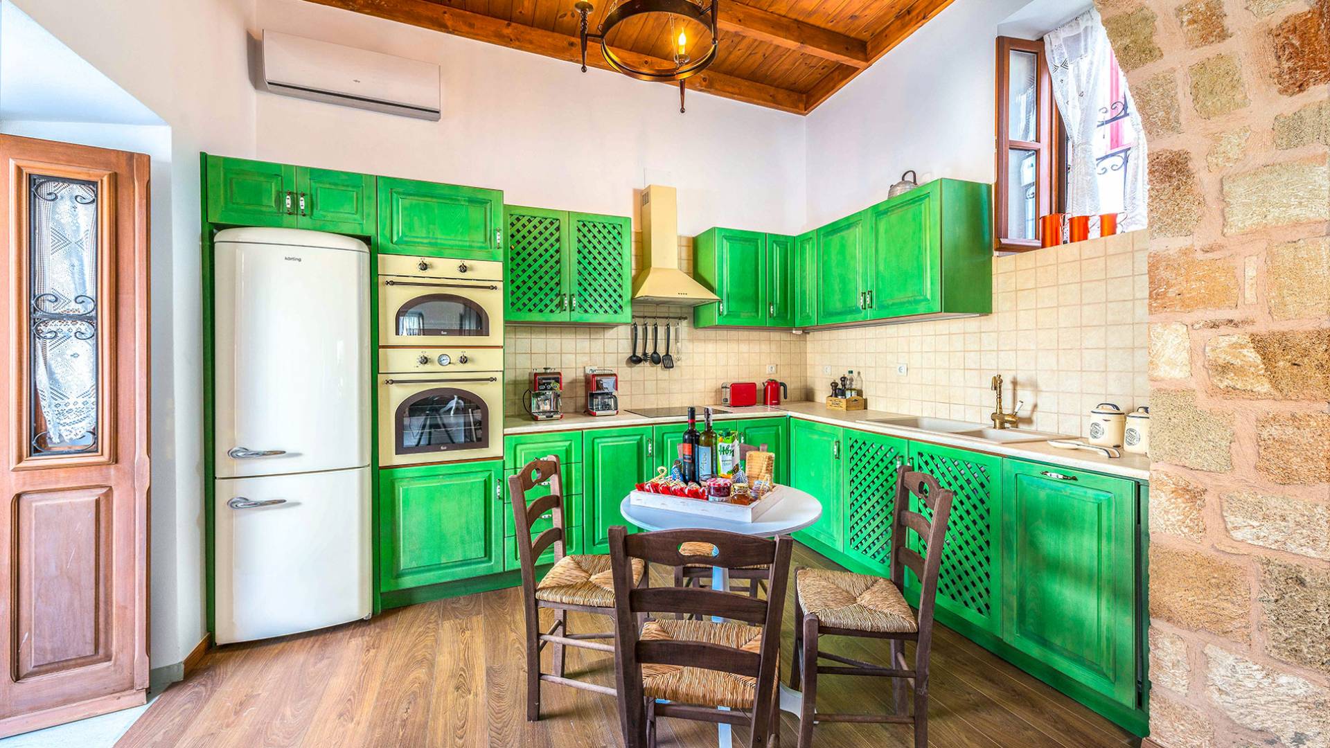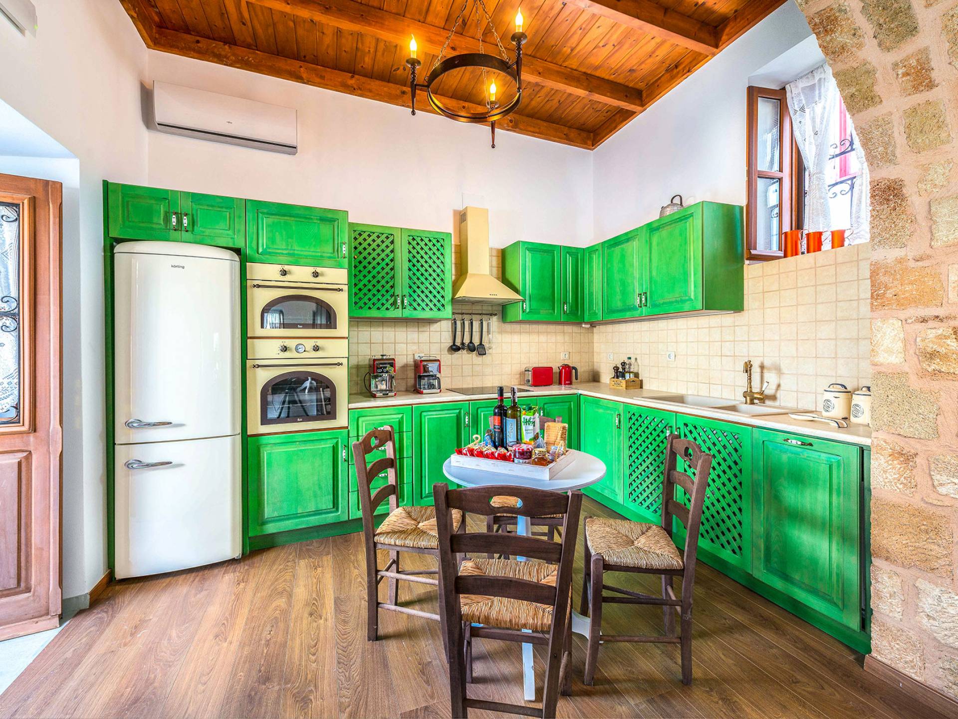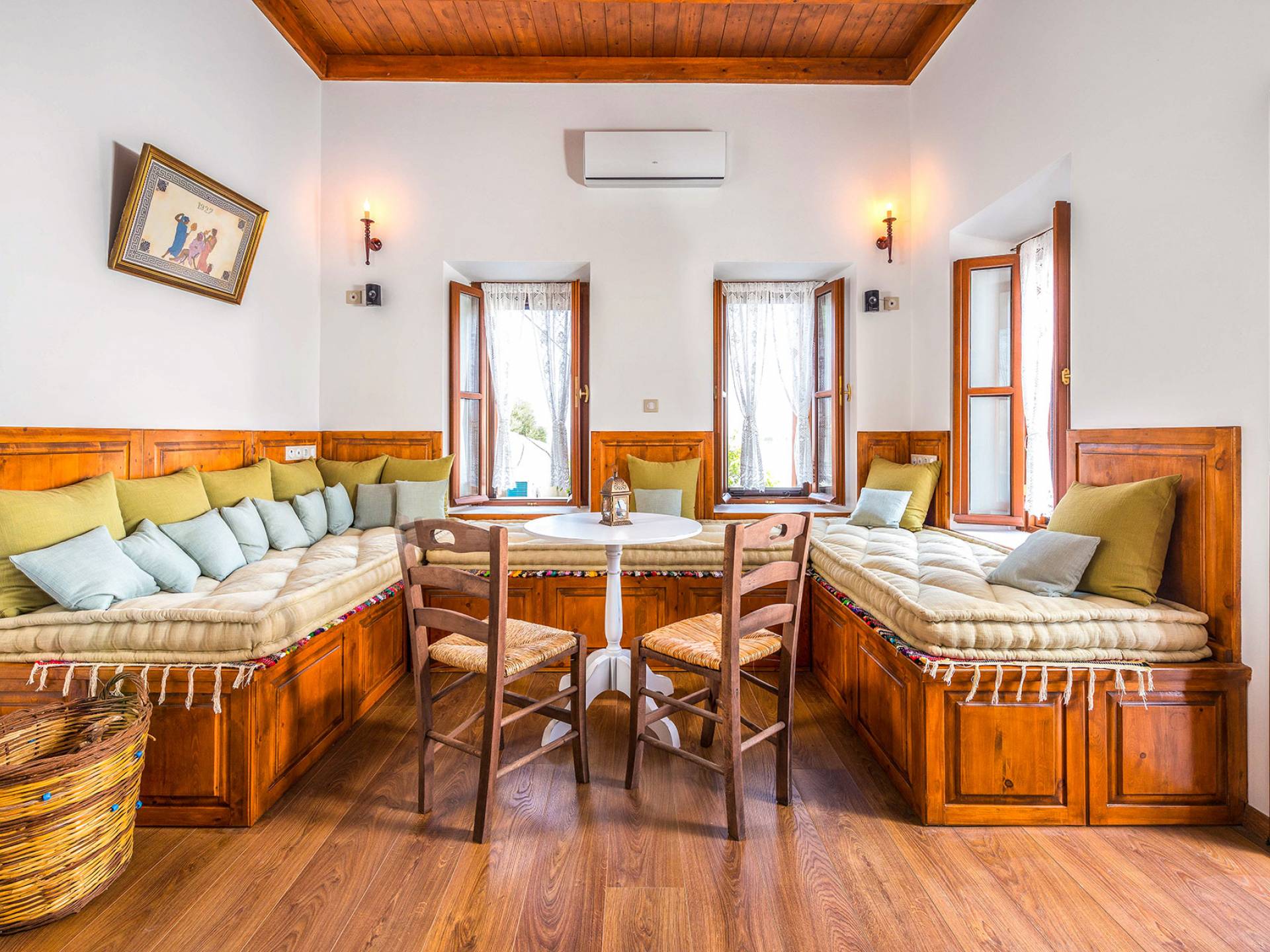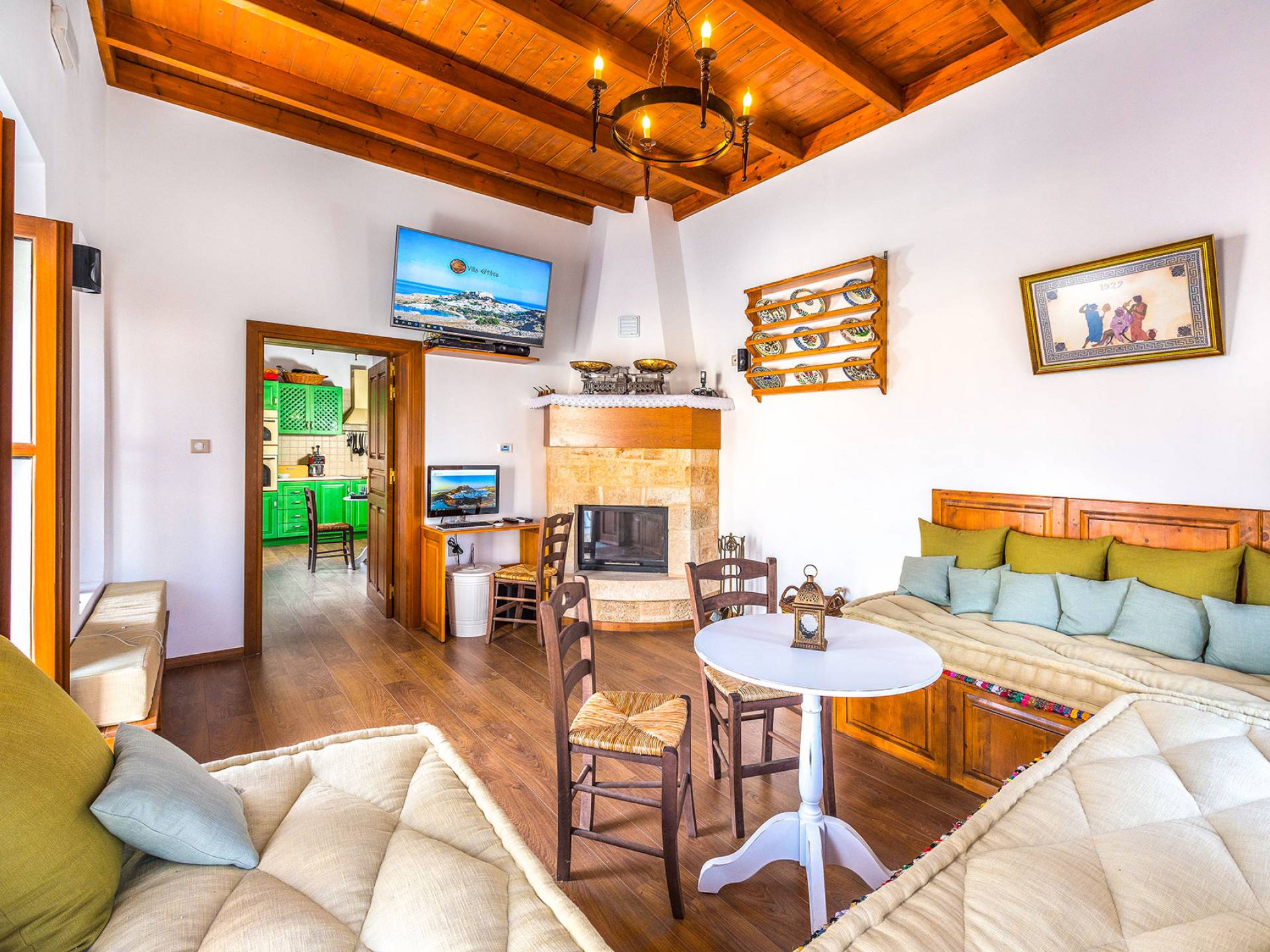 La cocina está totalmente equipada. Equipamiento, aire acondicionado, frigorífico, horno, microondas, cuatro placas vitrocerámicas electrónicas, campana extractora, lavavajillas, cafetera espresso, cafetera de filtro, máquina frappé eléctrica, cafetera eléctrica, hervidor, tostador, exprimidor eléctrico, robot de cocina, set de fondue, vajilla , vasos y todos los utensilios de cocina. El salón cuenta con smart TV de 50 pulgadas, envolvente de home cinema (5.1), computadora, chimenea empotrada, aire acondicionado, sofá con mesa en banco estilo tradicional (colchones y almohadas COCO-MAT estilo tradicional), y balcón.