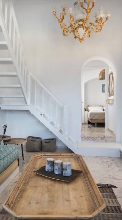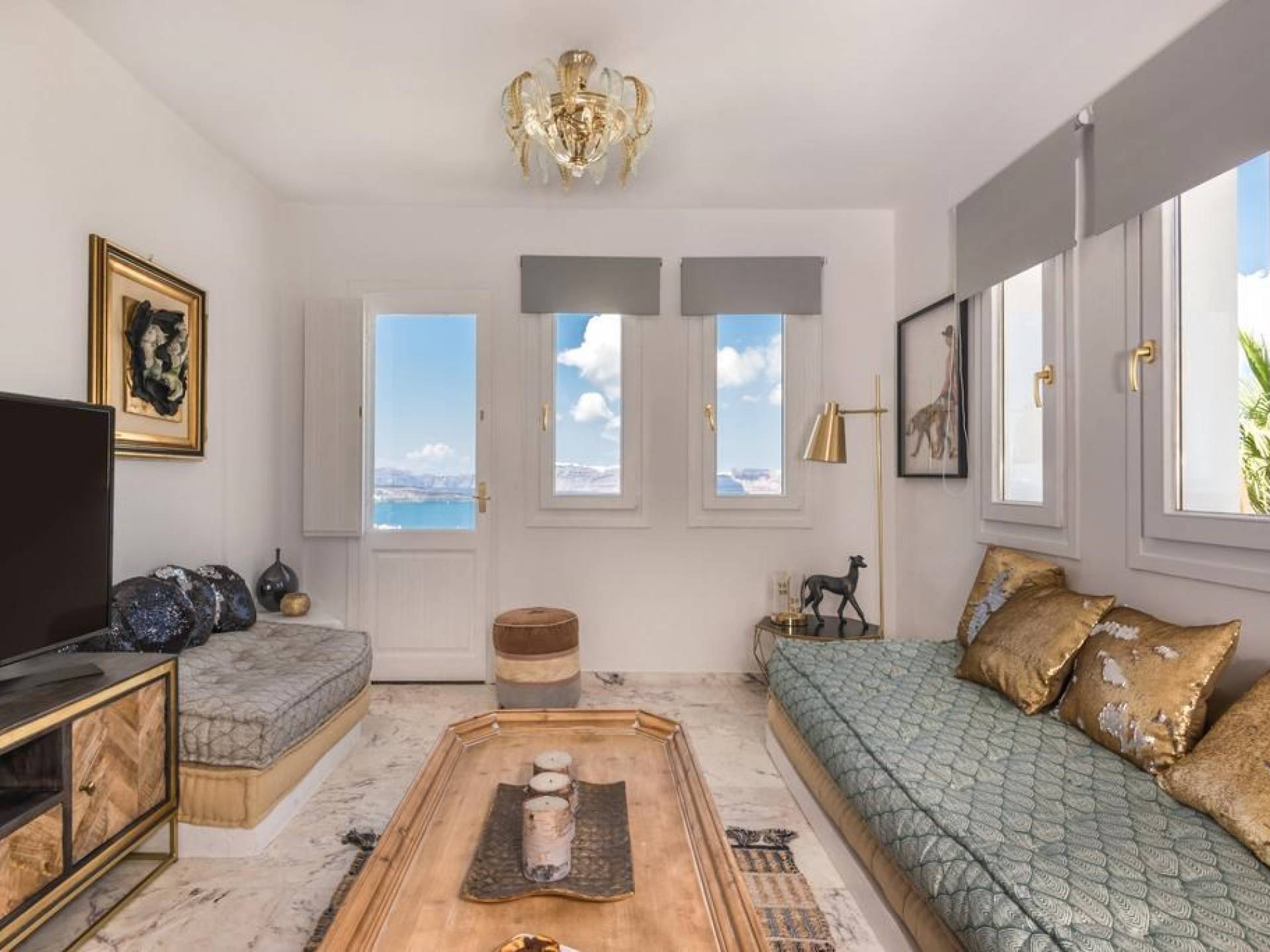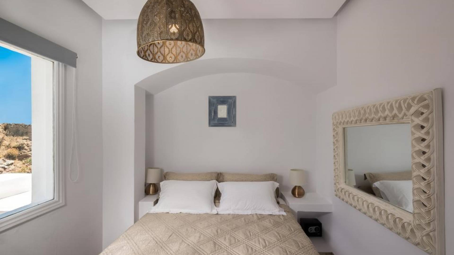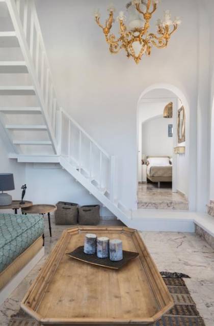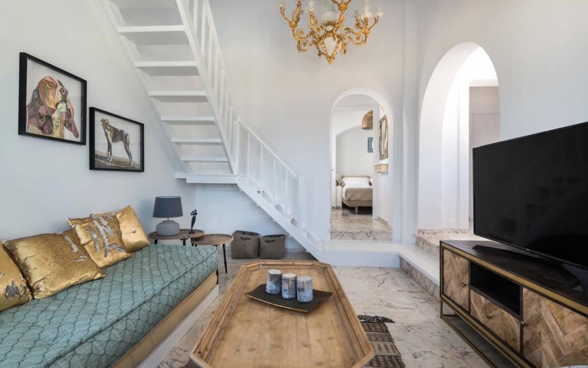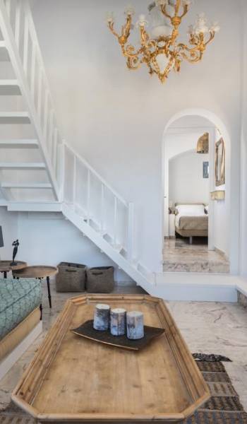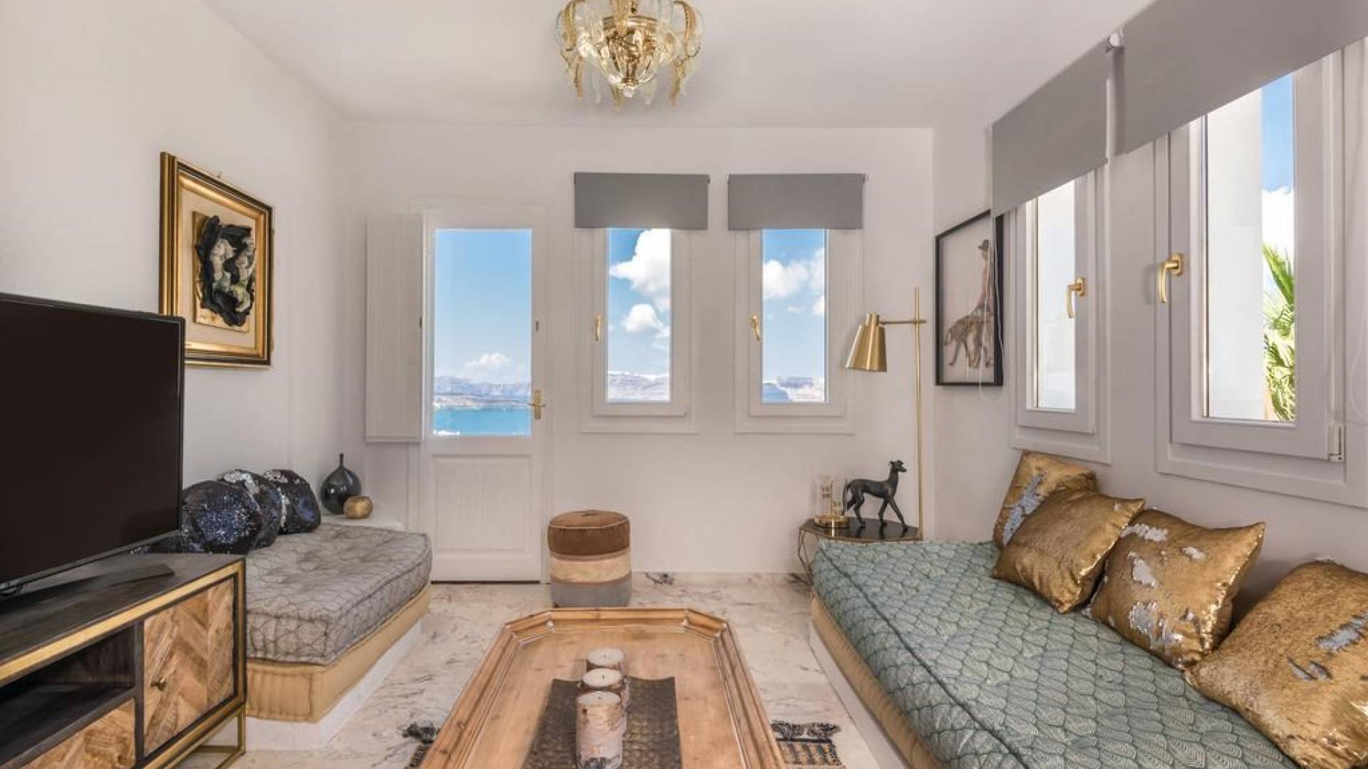 Gold Suite en Summer Lovers Villa Santorini es un alquiler de suite de lujo con 2 dormitorios y un jacuzzi al aire libre. El piso superior de Summer Lovers Villa se puede alquilar por separado, y es la propuesta de alojamiento perfecta para hasta dos parejas que buscan privacidad, romance y comodidad sofisticada en sus vacaciones en Santorini. Detalles de decoración dorados y una intrincada lámpara de araña en el punto culminante de esta suite, inspirada en las lujosas sensaciones de un atardecer de verano de Santorini.