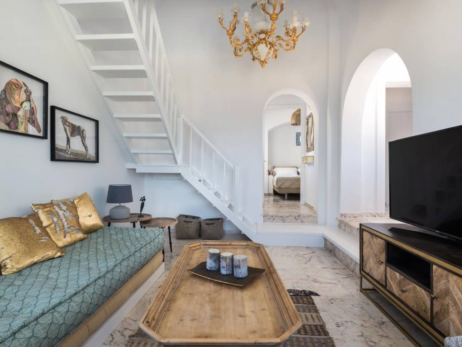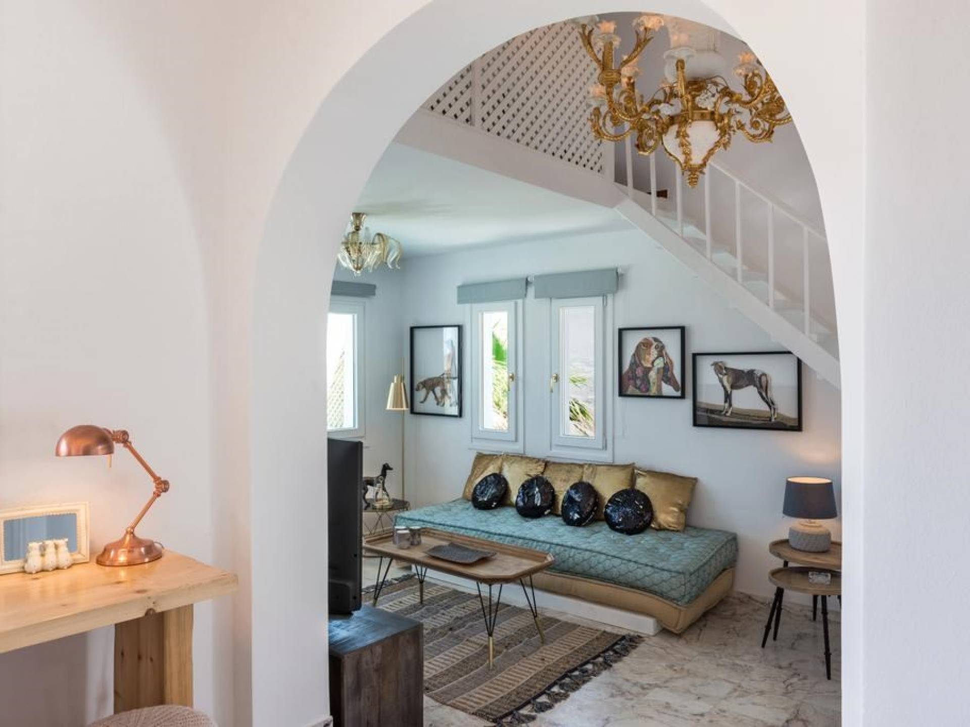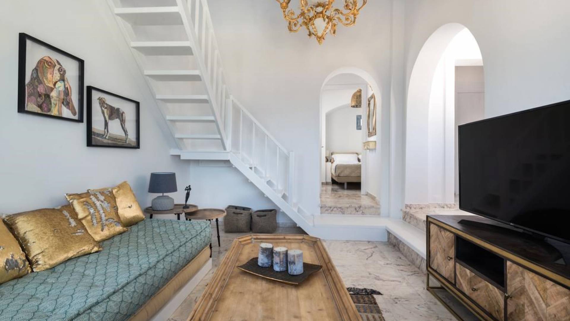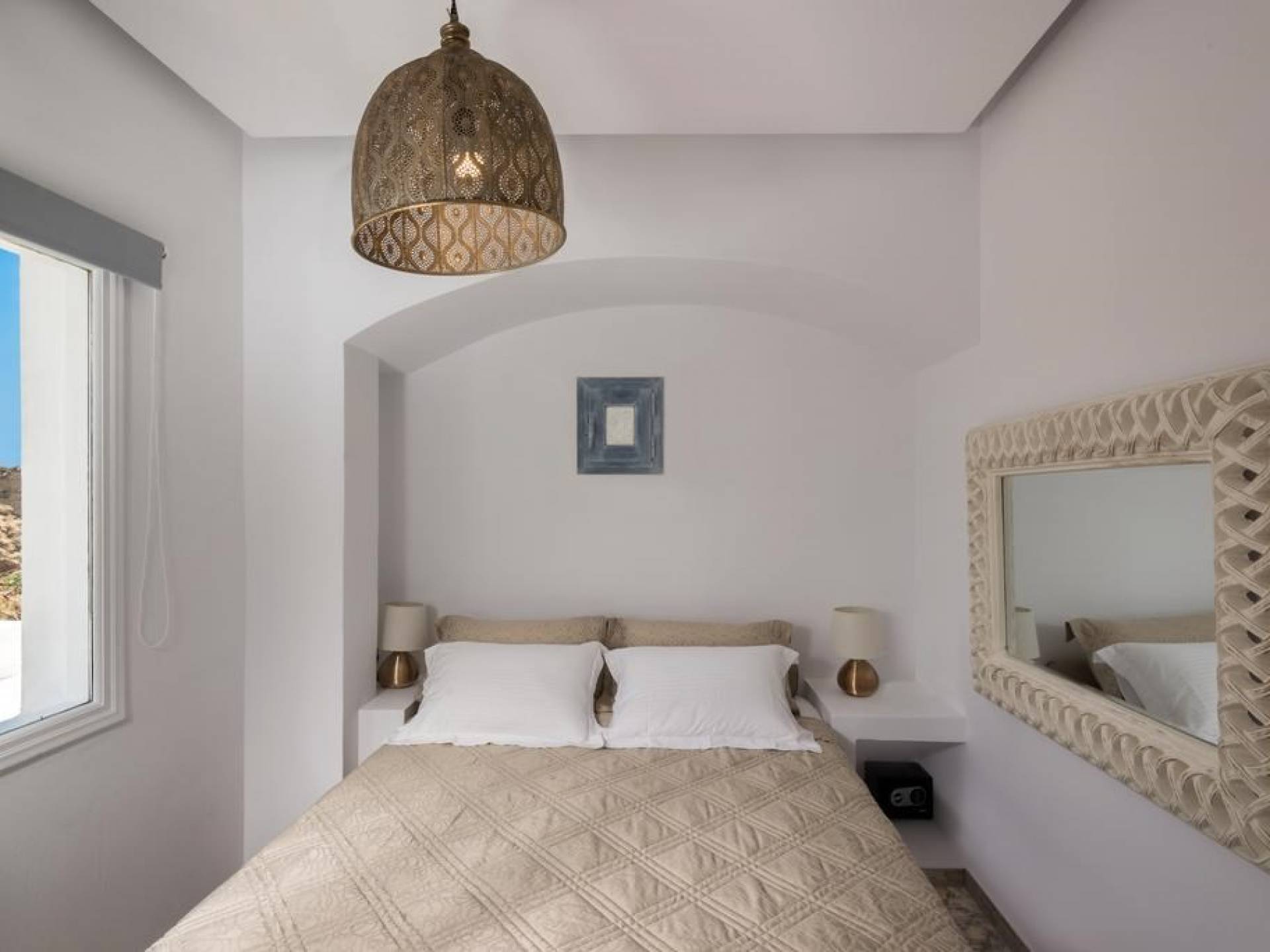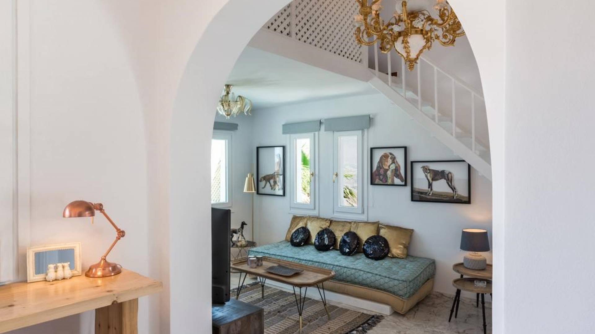 Gold Suite en Summer Lovers Villa Santorini es un alquiler de suite de lujo con 2 dormitorios y un jacuzzi al aire libre. El piso superior de Summer Lovers Villa se puede alquilar por separado, y es la propuesta de alojamiento perfecta para hasta dos parejas que buscan privacidad, romance y comodidad sofisticada en sus vacaciones en Santorini. Detalles de decoración dorados y una intrincada lámpara de araña en el punto culminante de esta suite, inspirada en las lujosas sensaciones de un atardecer de verano de Santorini.