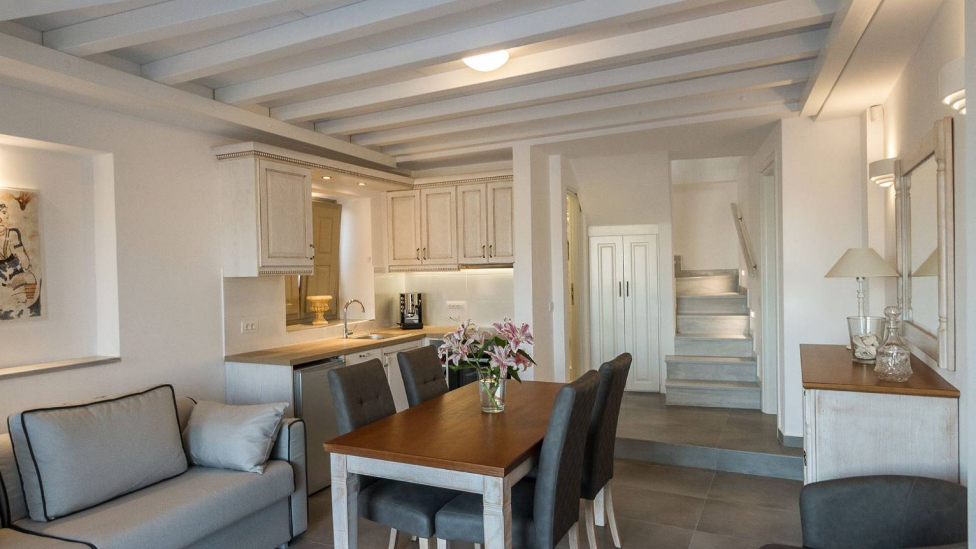La villa superior consta de dos dormitorios uno en el primer piso y otro más grande en el segundo piso, una gran sala de estar con un sofá que se convierte en 2 camas individuales, un comedor, una cocina totalmente equipada y un baño. Villa Superior también dispone de piscina privada con sombrillas, tumbonas, comedor con capacidad para alojar hasta dos parejas con sus hijos.