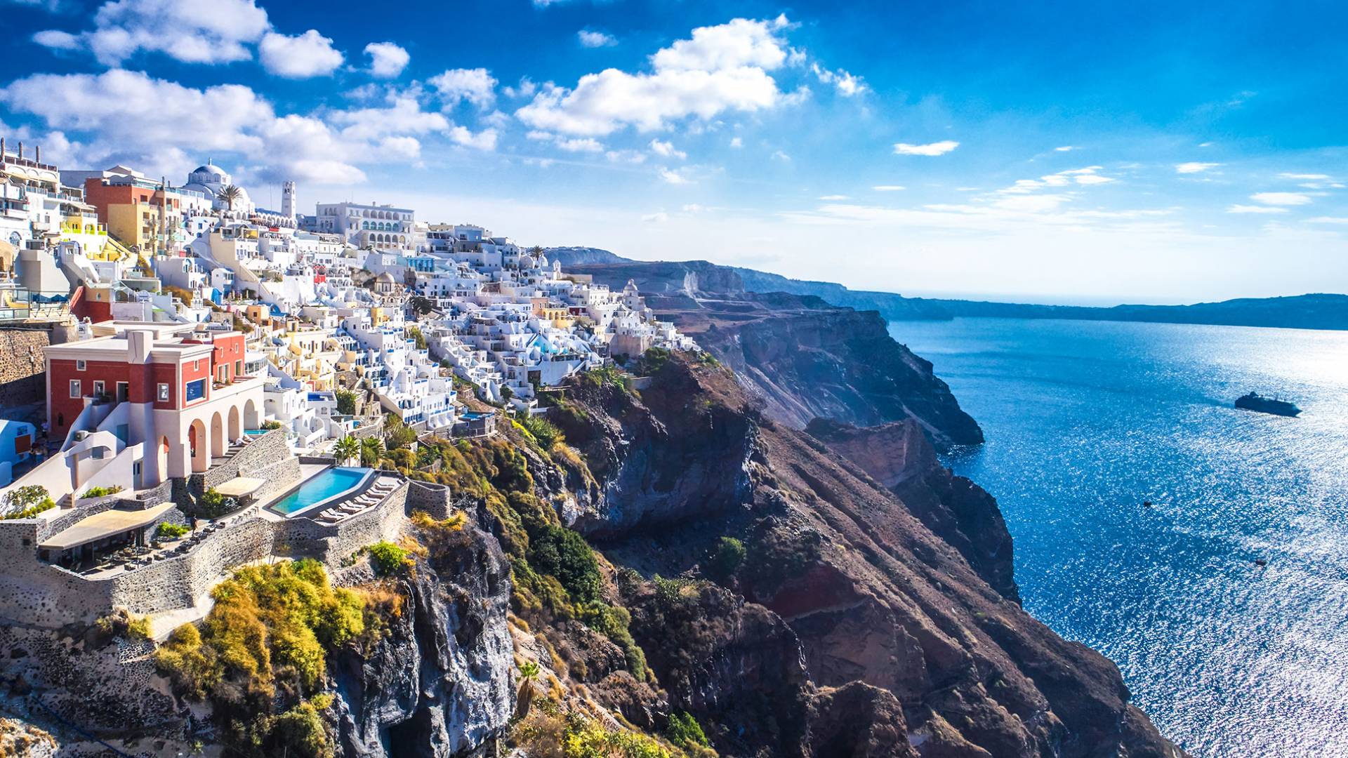 ver másFira Santorini es la capital de Santorini, Grecia, ubicada en el lado oeste de la isla, a 10 km del puerto principal de Athinios. Construido sobre un acantilado, a una altura de 260 metros, ofrece una impresionante vista panorámica del volcán. La ciudad de Fira se llena de gente durante la temporada alta. Es un pueblo típico de las Cícladas con encantadoras casas encaladas, con puertas y ventanas azules y pequeños callejones pavimentados en forma de laberinto. La mayoría de sus hermosos edificios son de arquitectura veneciana, incluidas algunas iglesias con cúpulas azules y coloridas terrazas que abren una vista increíble del volcán y la mundialmente famosa puesta de sol de Santorini. Fira es el centro comercial de la isla con todo tipo de tiendas, excelentes restaurantes, cafés, bares y clubes nocturnos. La caldera se considera el punto culminante de Santorini. Para aquellos interesados en la historia, una visita al Museo Arqueológico es imprescindible. La ciudad incluye numerosas iglesias y monasterios dignos de visitar, como Agios Minas, la catedral de Ipapanti, la catedral de Cristo, el monasterio de Panagia ton Dominikanidon y otros. Fira también tiene un puerto que solo se utiliza para cruceros. Desde allí, los barcos pueden llevar a los visitantes a un recorrido por el volcán de Nea y Palia Kameni.