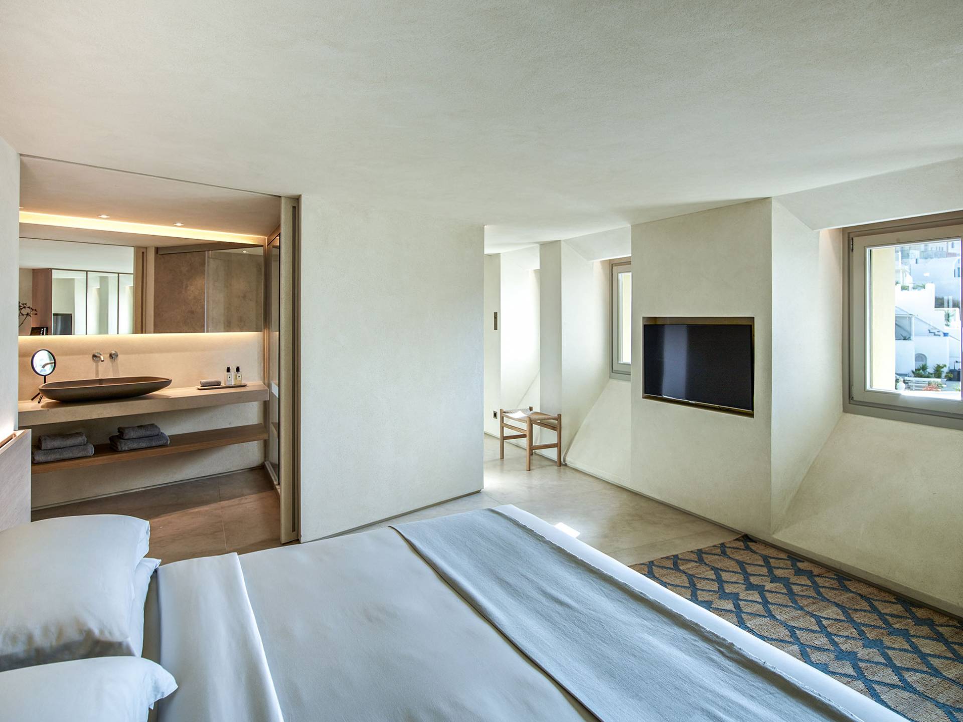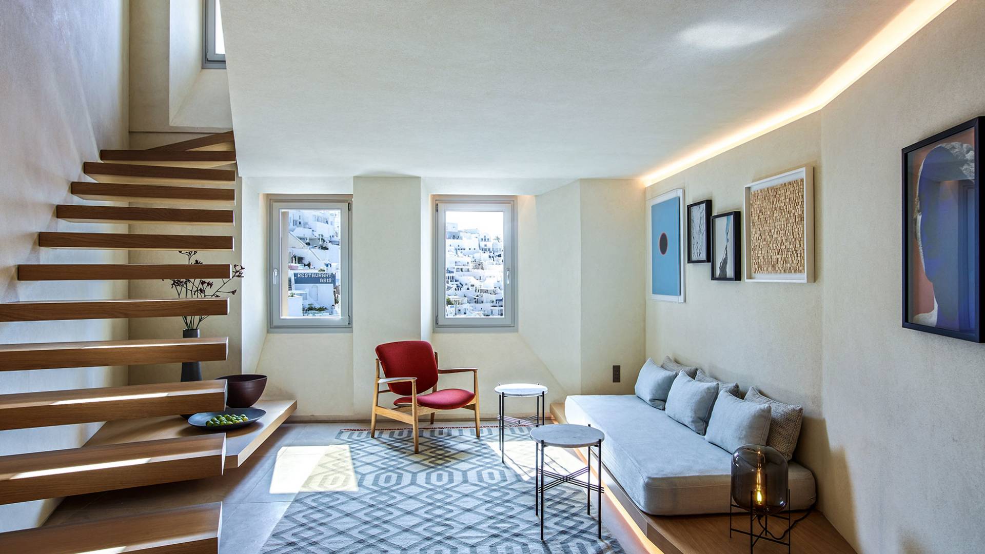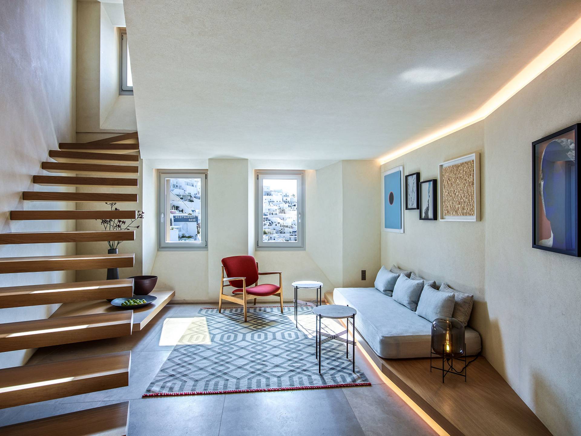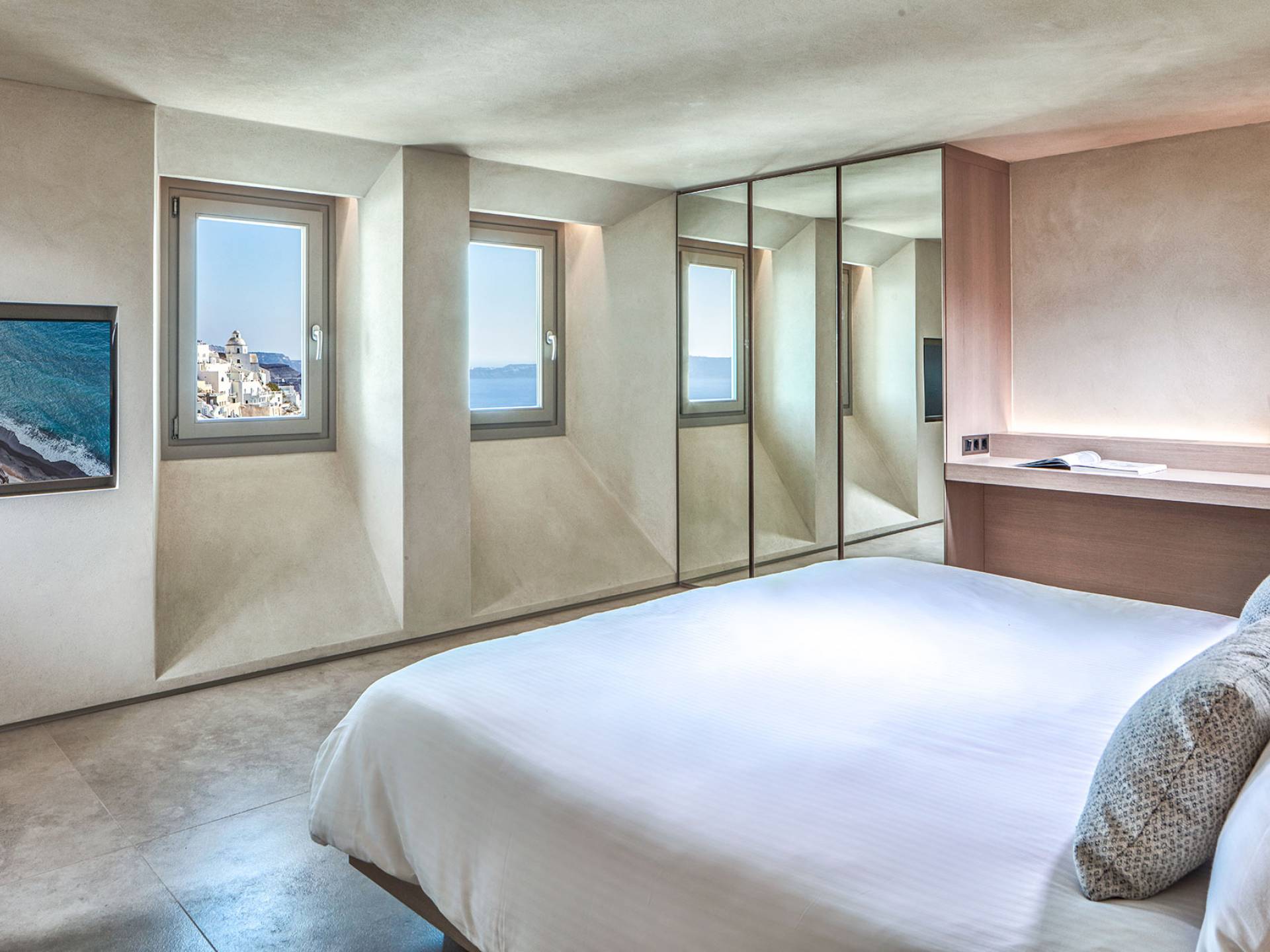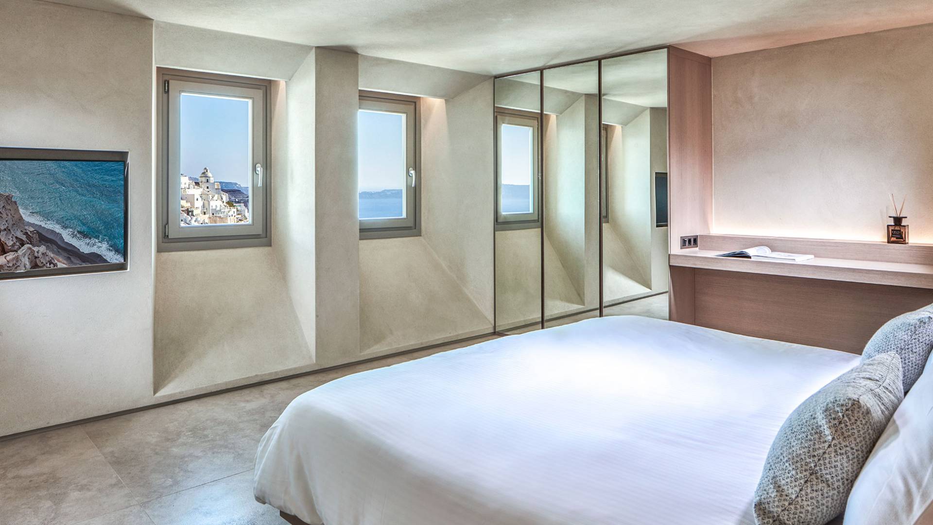 Aeolus Suite at Villa Bordeaux Santorini es una suite de lujo en alquiler con 1 dormitorio y magníficas vistas al mar. Dividido en dos niveles diferentes, con una superficie de 60 metros cuadrados, el Dúplex de villa Bordeaux se ha inspirado en el Gobernante de los Vientos griego y cuenta con un amplio dormitorio vestido de blanco. El dormitorio se completa con una cama king-size e increíbles vistas al mar y la reconocida Caldera en el piso superior junto con un baño con ducha y paredes de vidrio. El piso inferior cuenta con la sala de estar elegantemente decorada con un sofá cama que ofrece vistas despejadas al mar y la caldera y una sala de estar separada que permite a los huéspedes contemplar las amplias vistas.