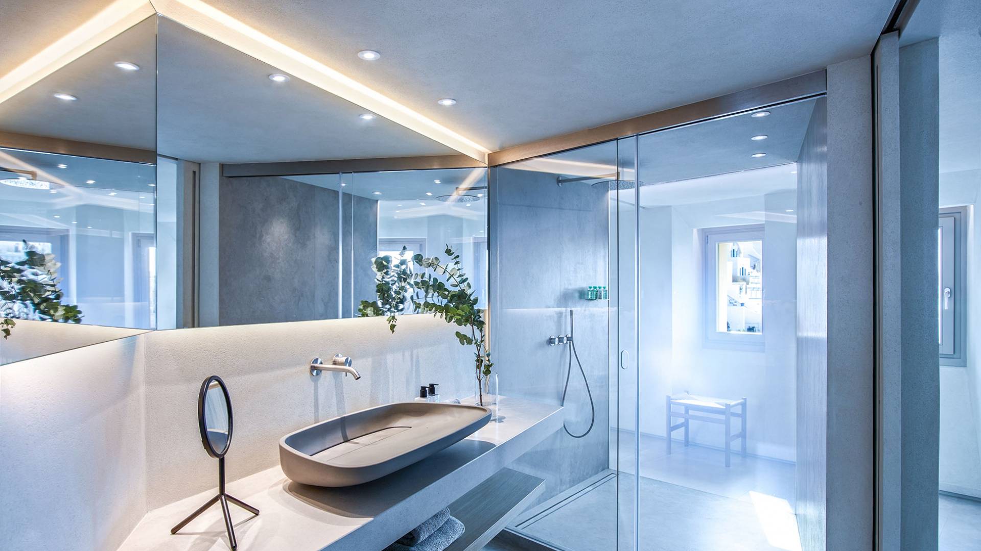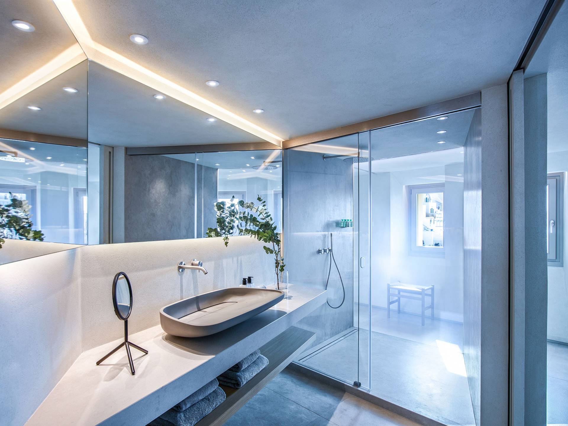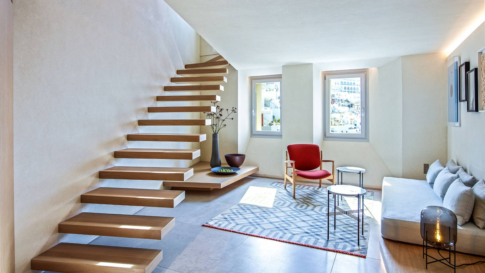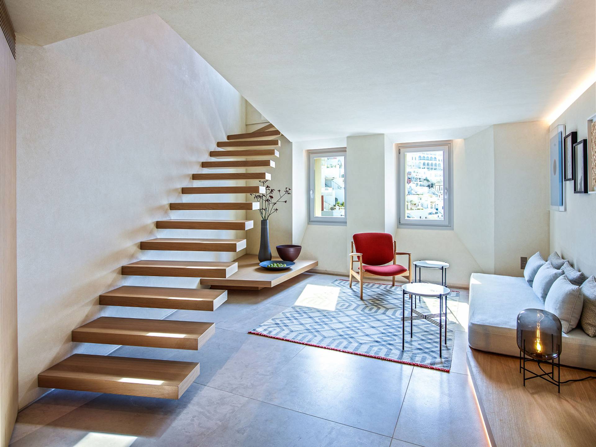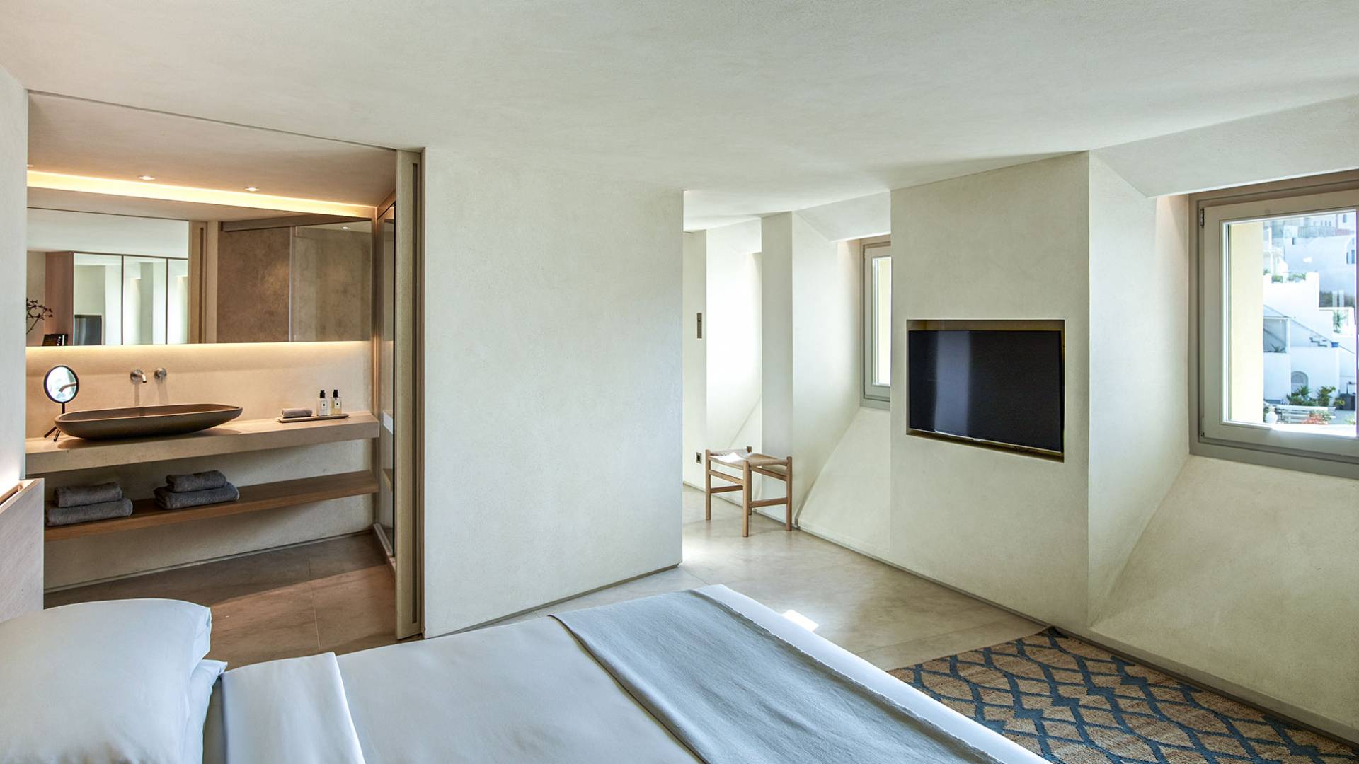 Aeolus Suite at Villa Bordeaux Santorini es una suite de lujo en alquiler con 1 dormitorio y magníficas vistas al mar. Dividido en dos niveles diferentes, con una superficie de 60 metros cuadrados, el Dúplex de villa Bordeaux se ha inspirado en el Gobernante de los Vientos griego y cuenta con un amplio dormitorio vestido de blanco. El dormitorio se completa con una cama king-size e increíbles vistas al mar y la reconocida Caldera en el piso superior junto con un baño con ducha y paredes de vidrio. El piso inferior cuenta con la sala de estar elegantemente decorada con un sofá cama que ofrece vistas despejadas al mar y la caldera y una sala de estar separada que permite a los huéspedes contemplar las amplias vistas.