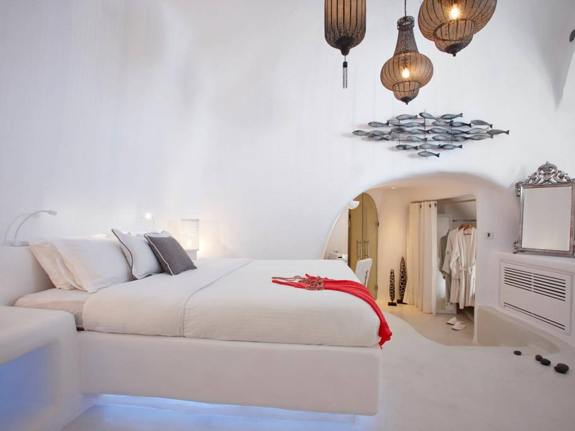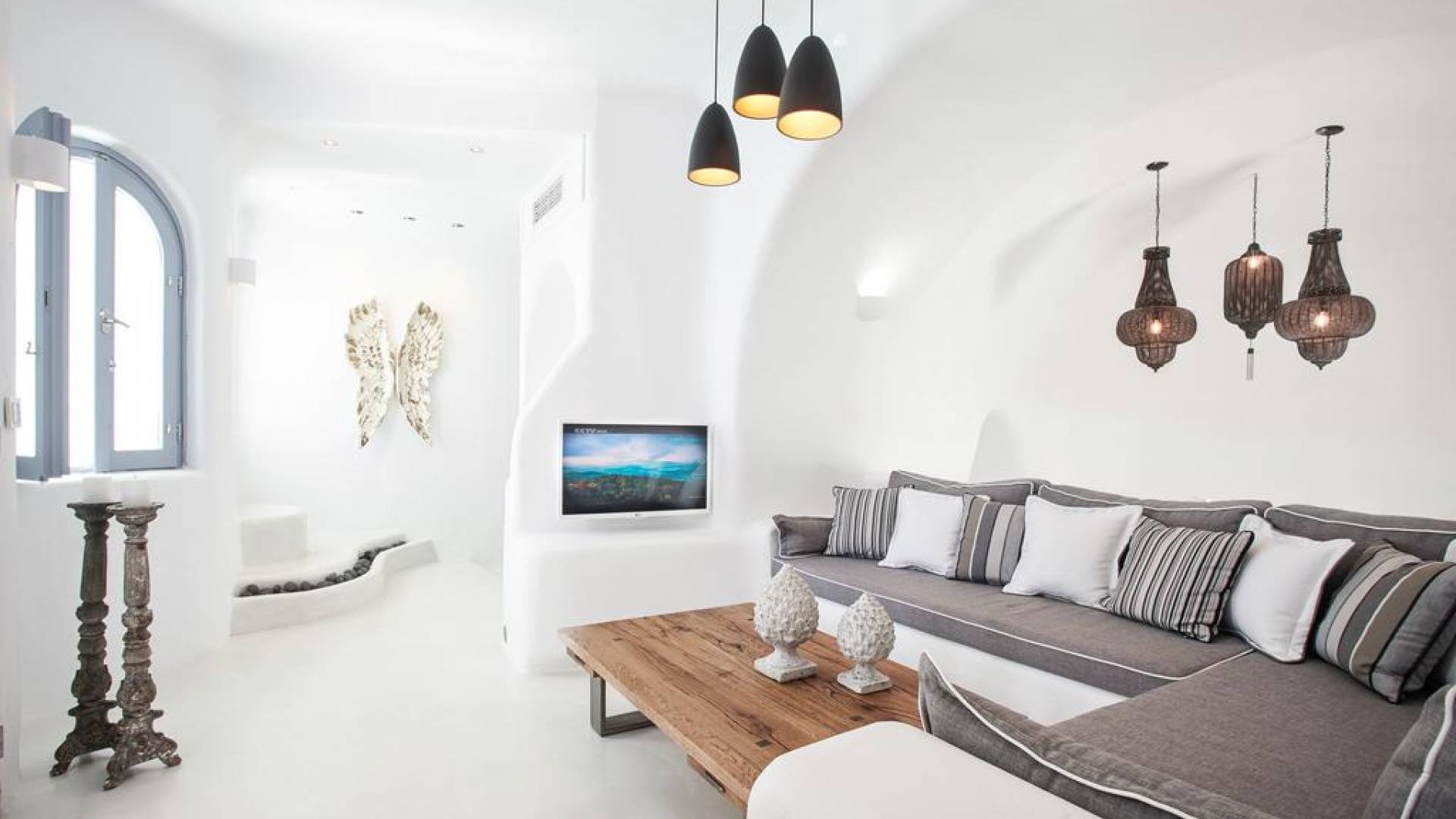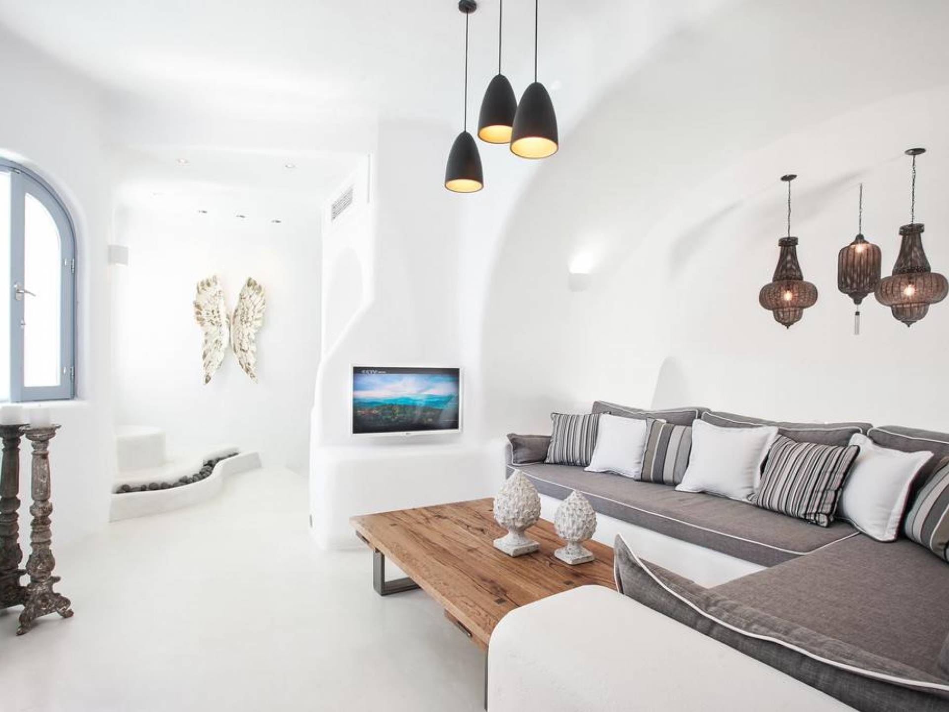 Dana Villas & Suites está ubicado completamente en el acantilado de Santorini, a solo cinco minutos a pie de la plaza principal de la capital. Sin embargo, la ubicación ofrece privacidad única y una magnífica vista panorámica de la bahía de la caldera de Santorini, el volcán y la impresionante puesta de sol lejos del ruido y las multitudes. Las elegantes suites están decoradas en el estilo tradicional de las Cícladas combinando lujo y comodidad. Un refugio de lujo espacioso ideal con una piscina privada que ofrece un ambiente acogedor y una vista espectacular, ideal para familias o amigos.