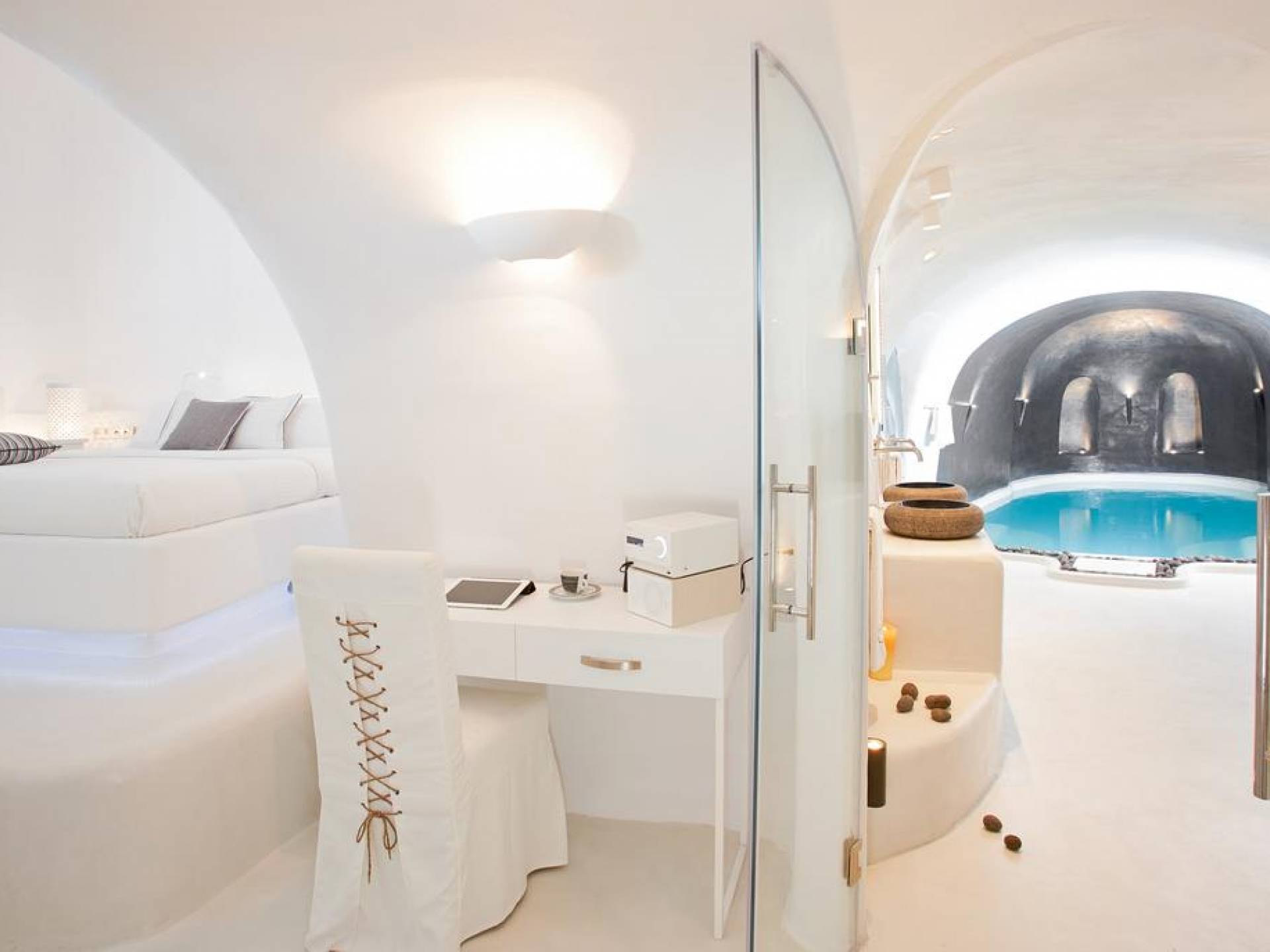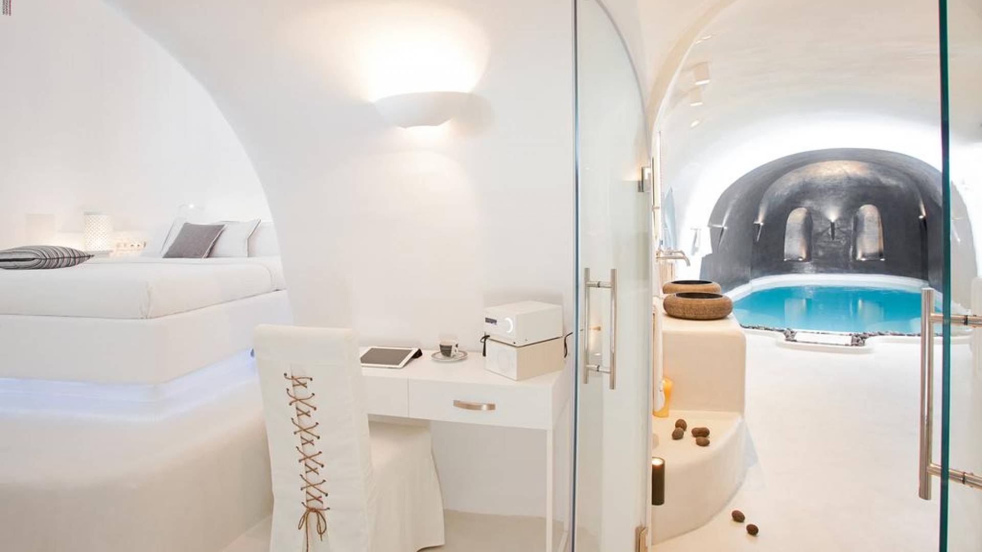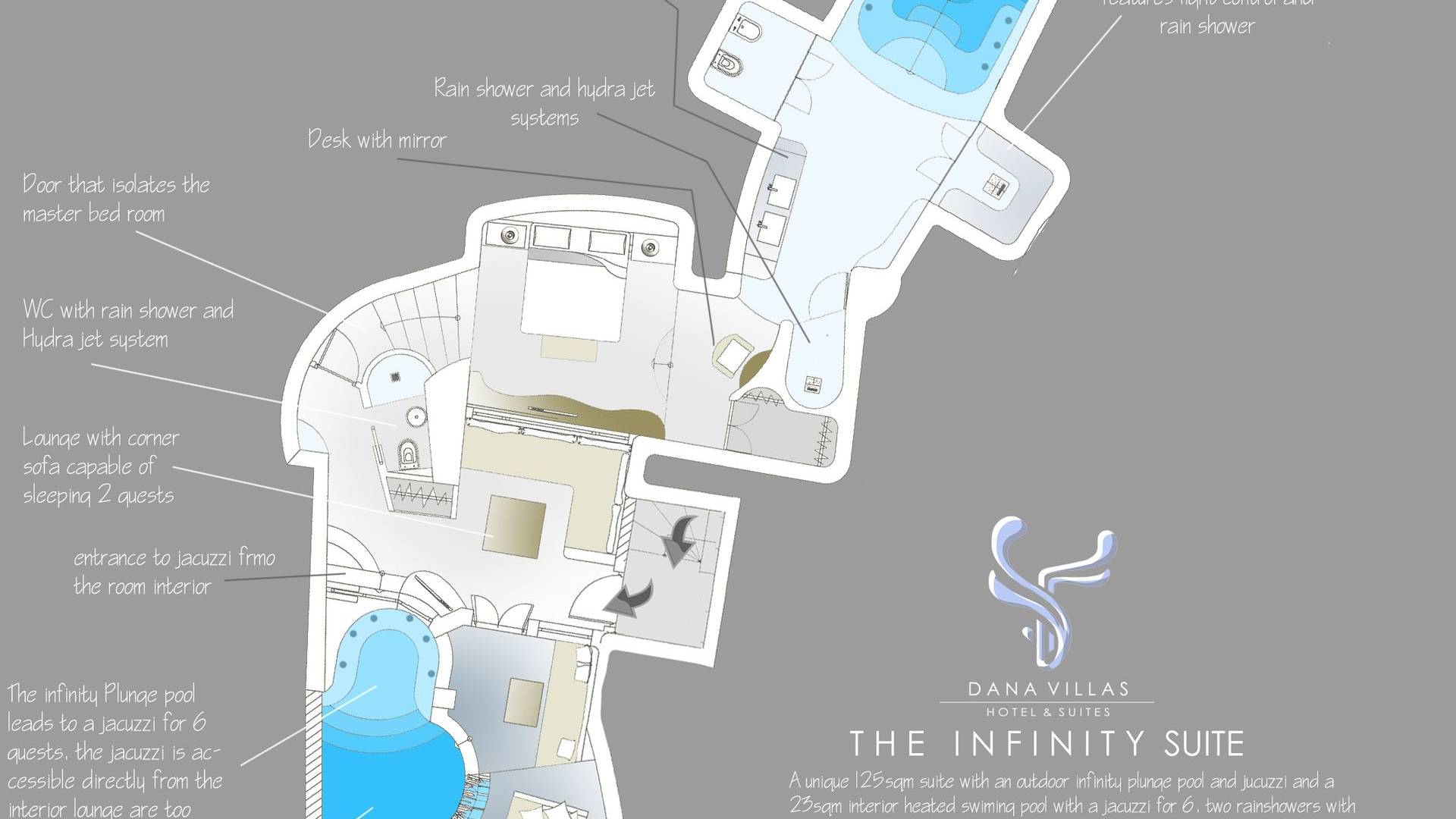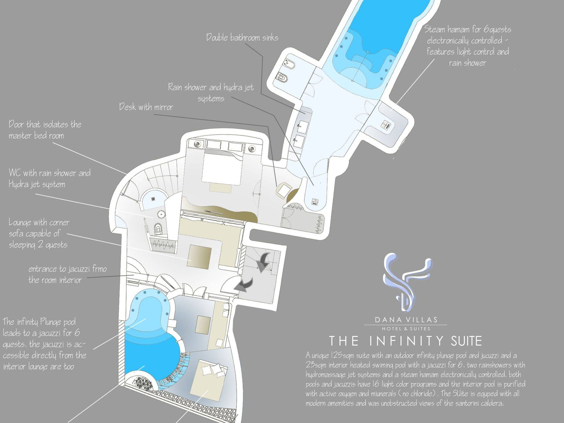 Infinity Suite en Dana Villas & Suites es una espaciosa suite única de 125 metros cuadrados ubicada entre dos piscinas privadas climatizadas. Una piscina de inmersión infinita al aire libre con jacuzzi (también accesible desde el interior de la habitación) y una piscina interior climatizada de 23m2 con jacuzzi para 6 y cascada y controles de iluminación. Cuarto de ducha con 2 duchas de lluvia LED y chorros de agua en la pared, un hammam de vapor controlado electrónicamente, la suite Infinity de Dana cuenta con todas las comodidades modernas, Wi-Fi gratuito, televisor LED inteligente de 42 pulgadas, controles de iluminación inteligentes y vistas impresionantes de la caldera del acantilado de Santorini y impresionante puesta de sol.