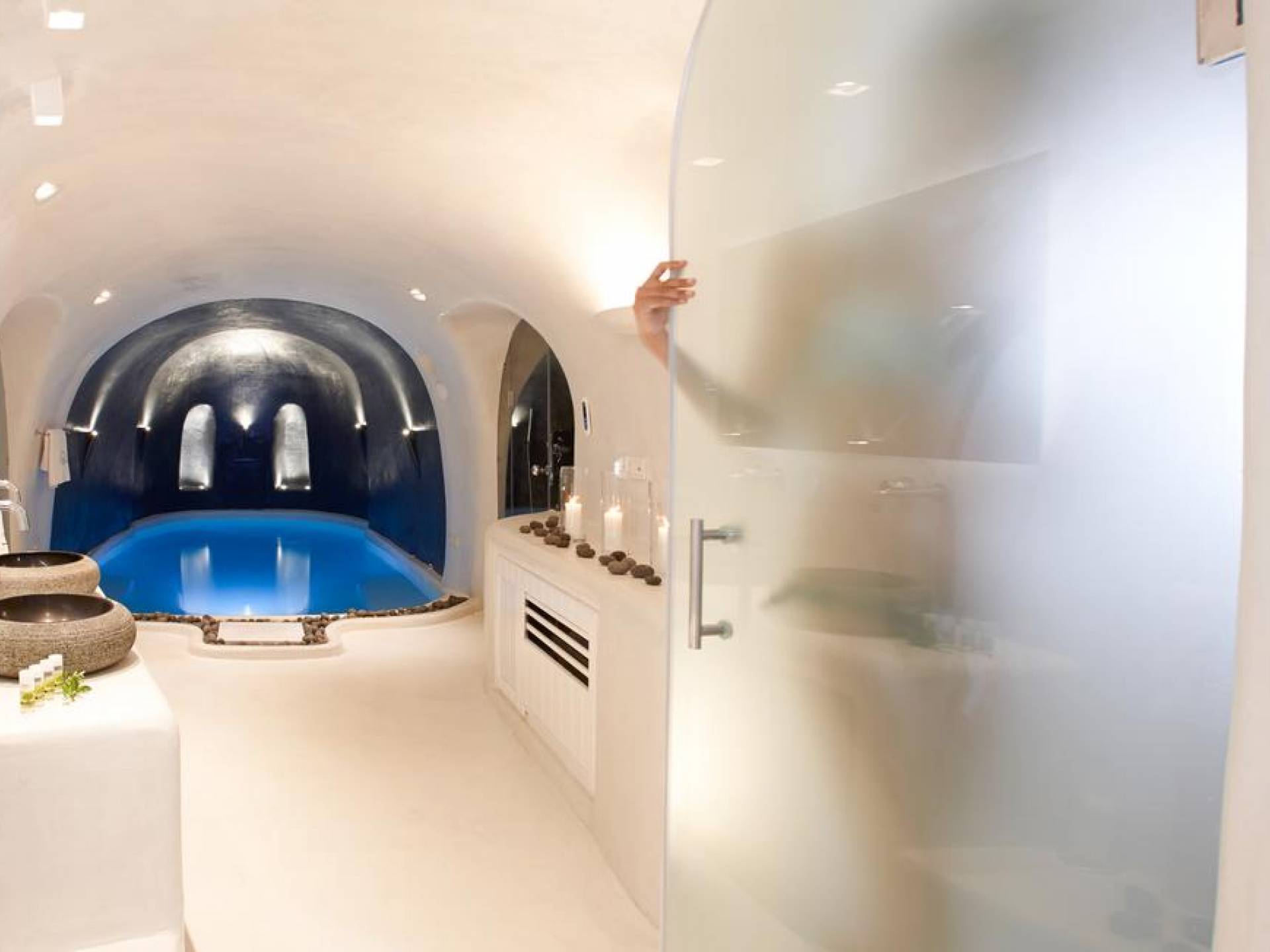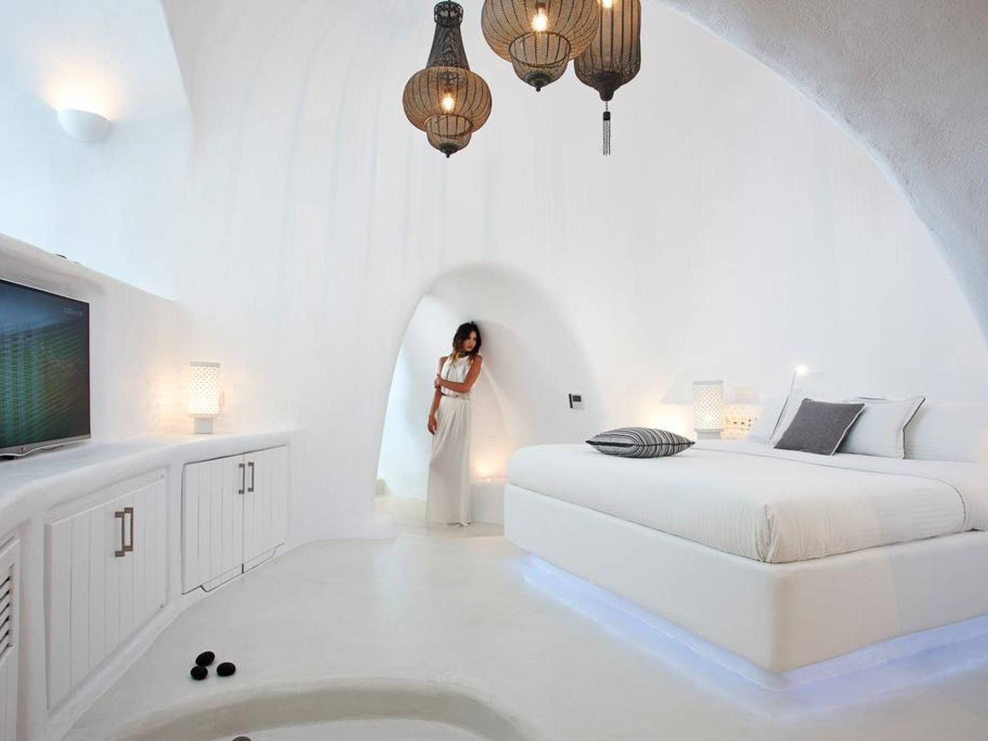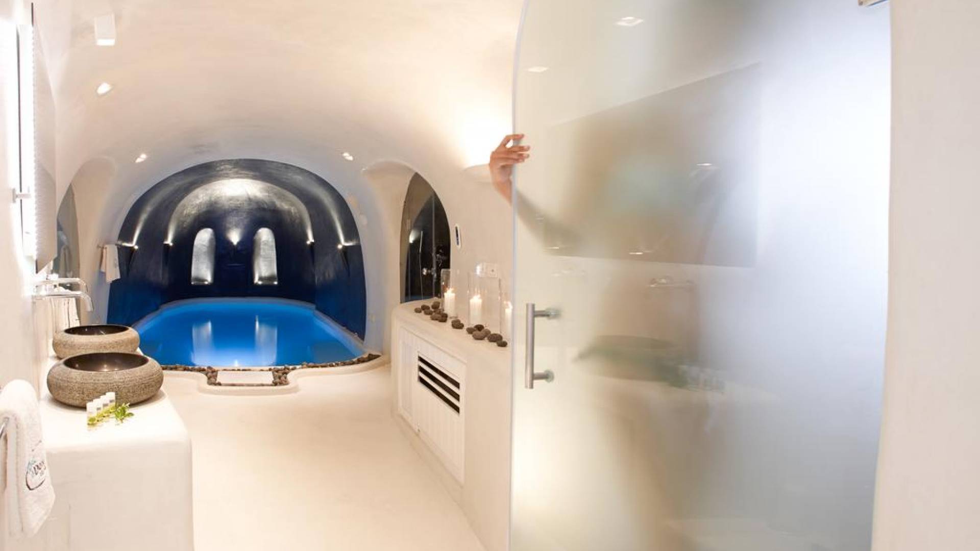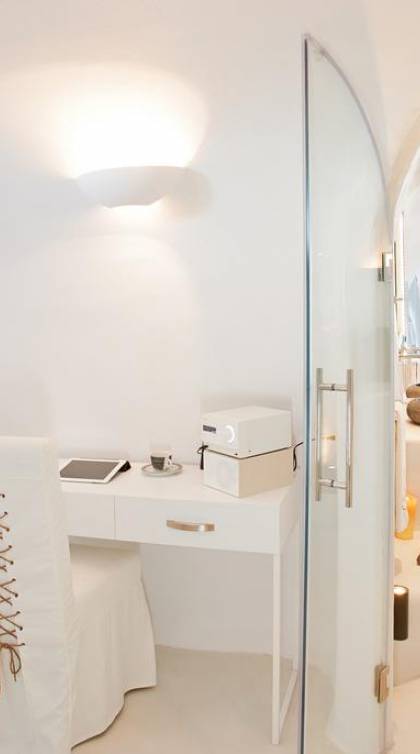 Infinity Suite en Dana Villas & Suites es una espaciosa suite única de 125 metros cuadrados ubicada entre dos piscinas privadas climatizadas. Una piscina de inmersión infinita al aire libre con jacuzzi (también accesible desde el interior de la habitación) y una piscina interior climatizada de 23m2 con jacuzzi para 6 y cascada y controles de iluminación. Cuarto de ducha con 2 duchas de lluvia LED y chorros de agua en la pared, un hammam de vapor controlado electrónicamente, la suite Infinity de Dana cuenta con todas las comodidades modernas, Wi-Fi gratuito, televisor LED inteligente de 42 pulgadas, controles de iluminación inteligentes y vistas impresionantes de la caldera del acantilado de Santorini y impresionante puesta de sol.