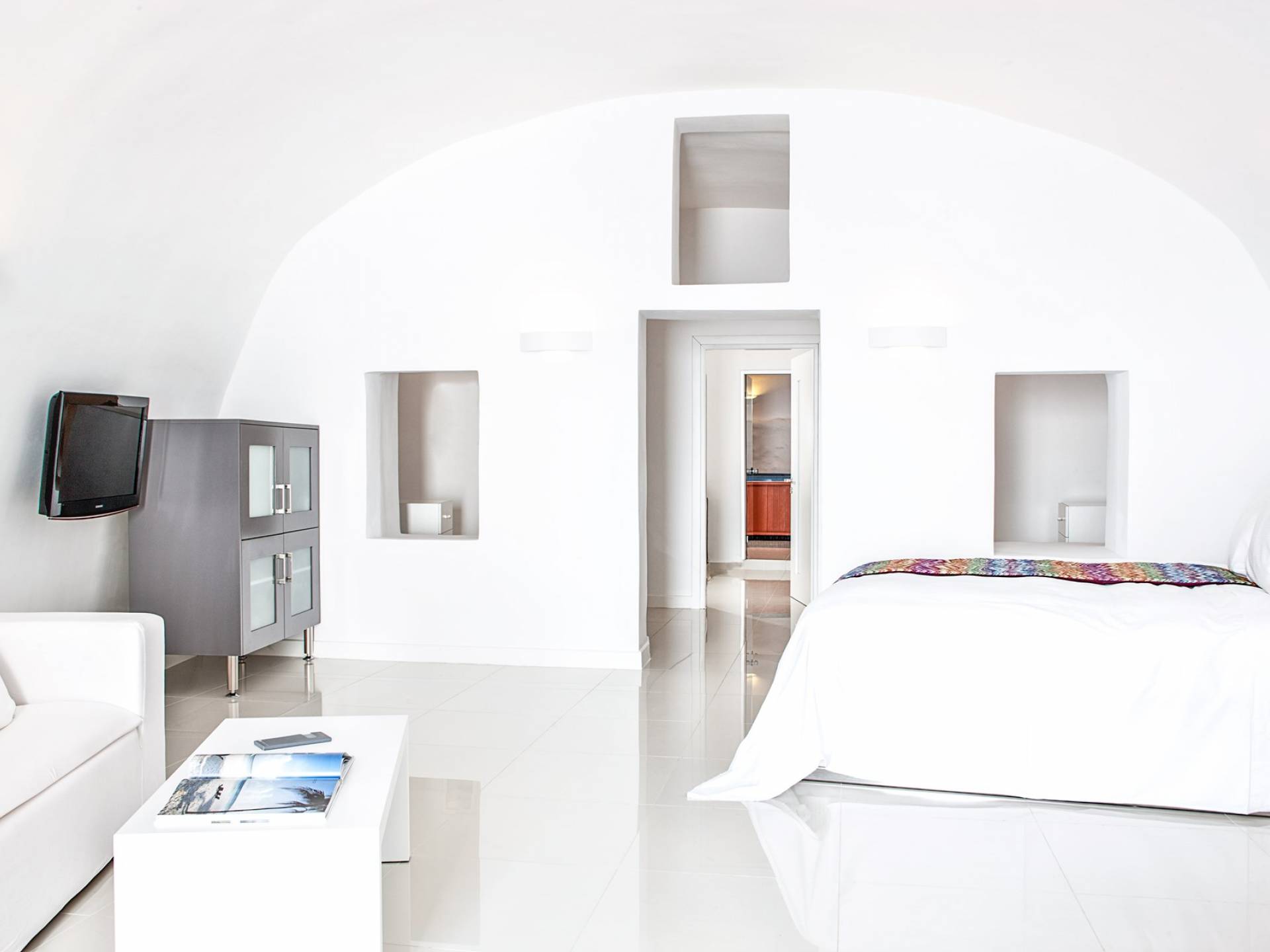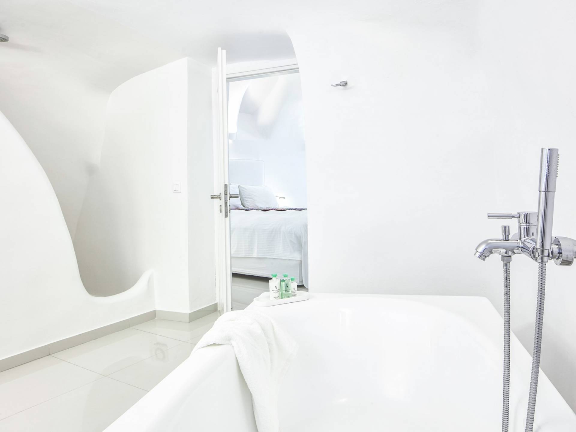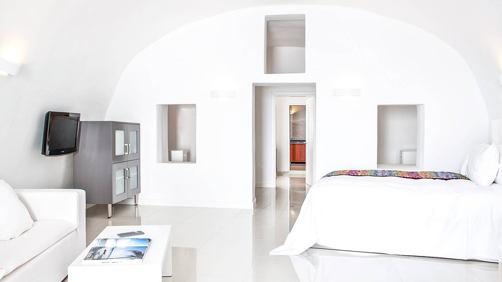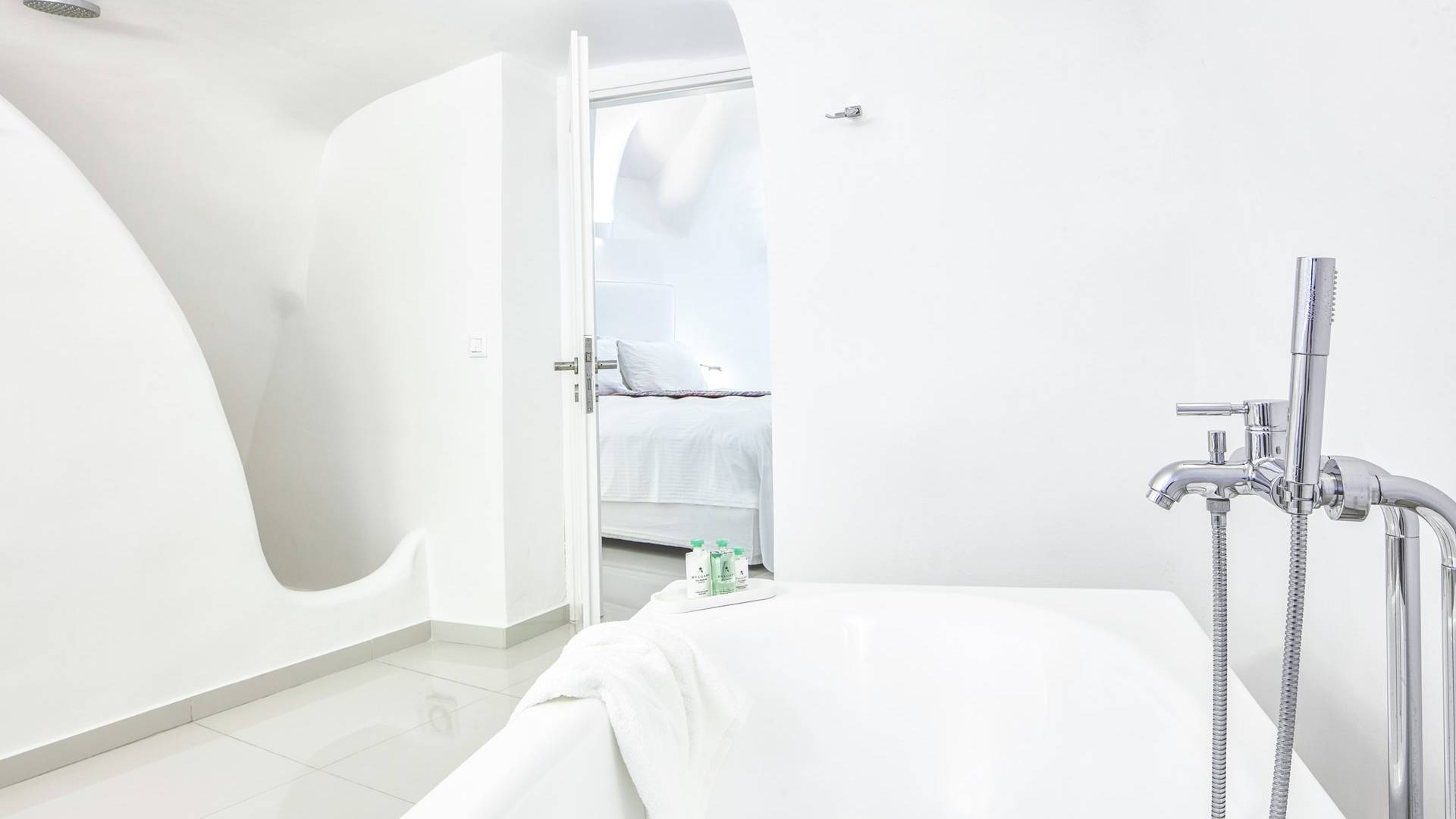 Las habitaciones y suites con vista al mar en Imerovigli, que caen orgánicamente en cascada por el acantilado, denotan lujo y romanticismo en cada detalle, donde la claridad de la luz del mar Egeo juega con paletas monocromáticas contemporáneas. Las 26 habitaciones, suites y villas con vista al mar, todas puras, sobrias y blancas en esencia, sin excepción, se completan con la fascinante vista a la Caldera de Santorini.