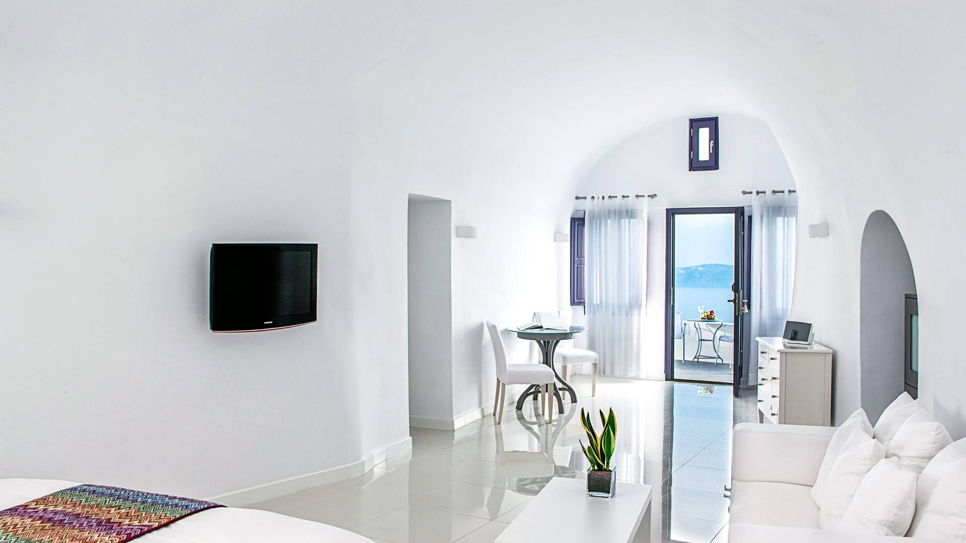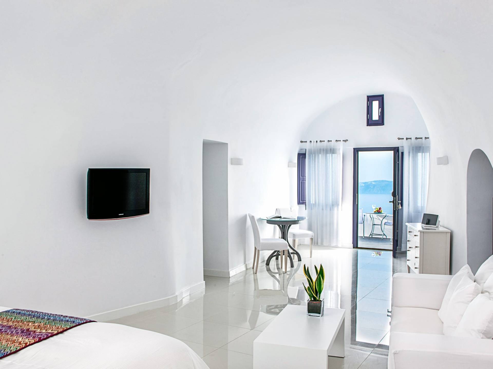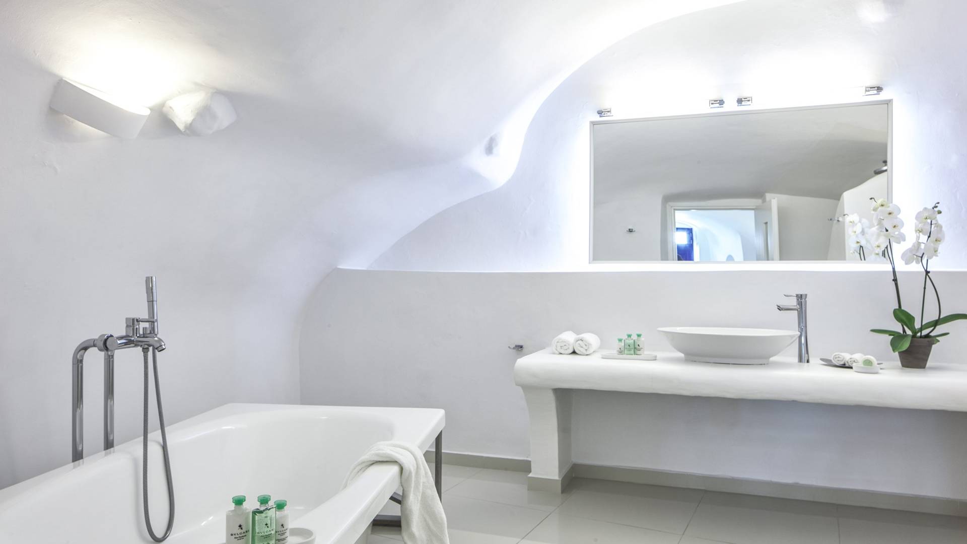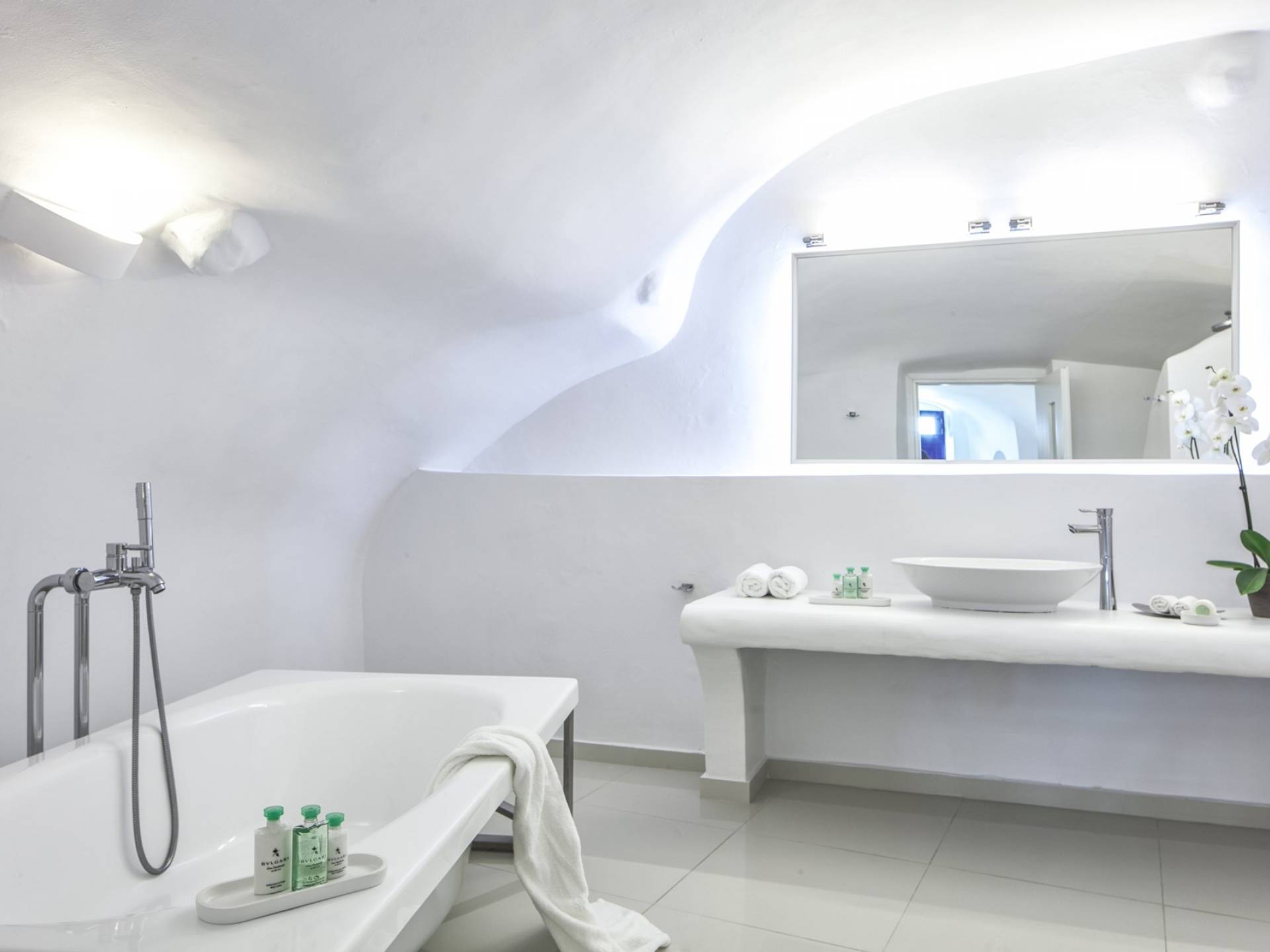 Las habitaciones y suites con vista al mar en Imerovigli, que caen orgánicamente en cascada por el acantilado, denotan lujo y romanticismo en cada detalle, donde la claridad de la luz del mar Egeo juega con paletas monocromáticas contemporáneas. Las 26 habitaciones, suites y villas con vista al mar, todas puras, sobrias y blancas en esencia, sin excepción, se completan con la fascinante vista a la Caldera de Santorini.
