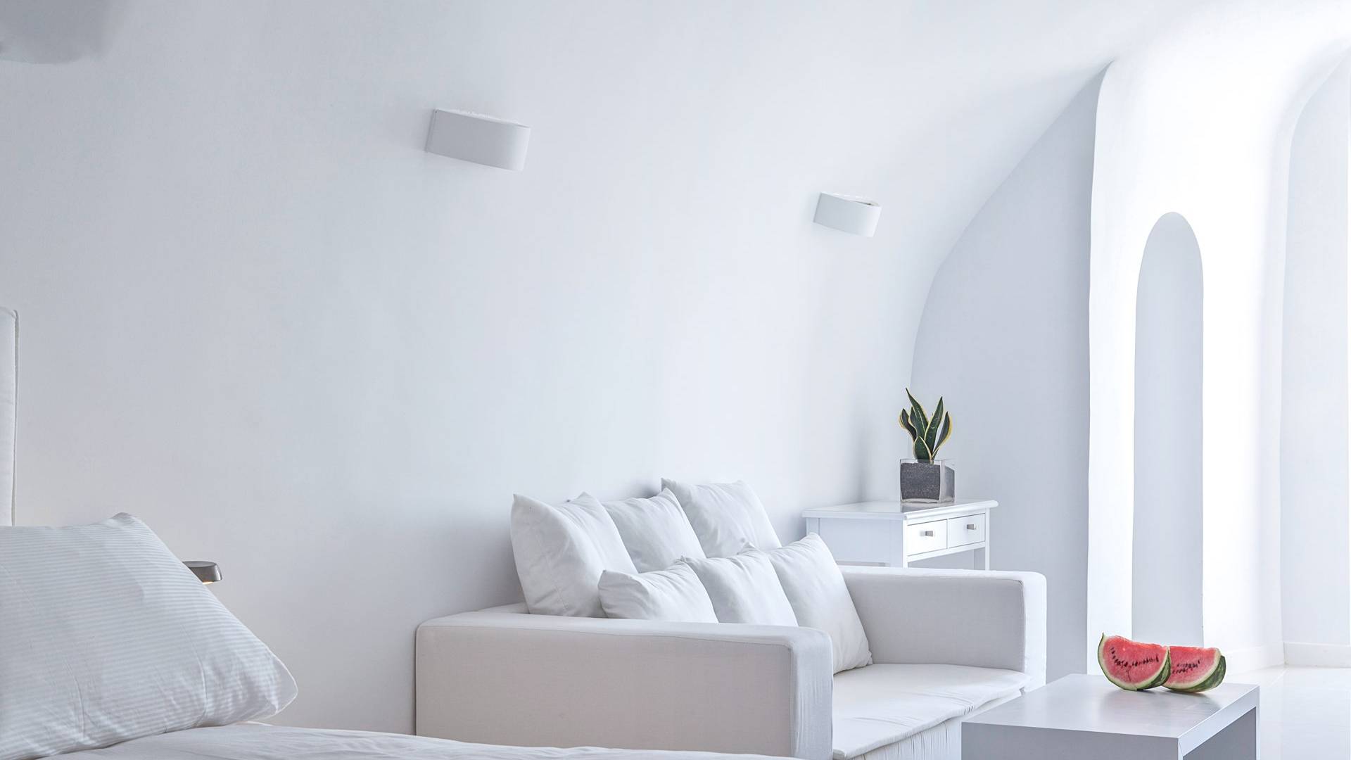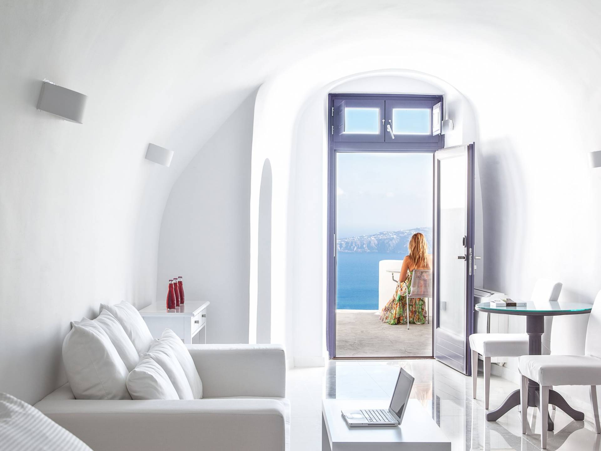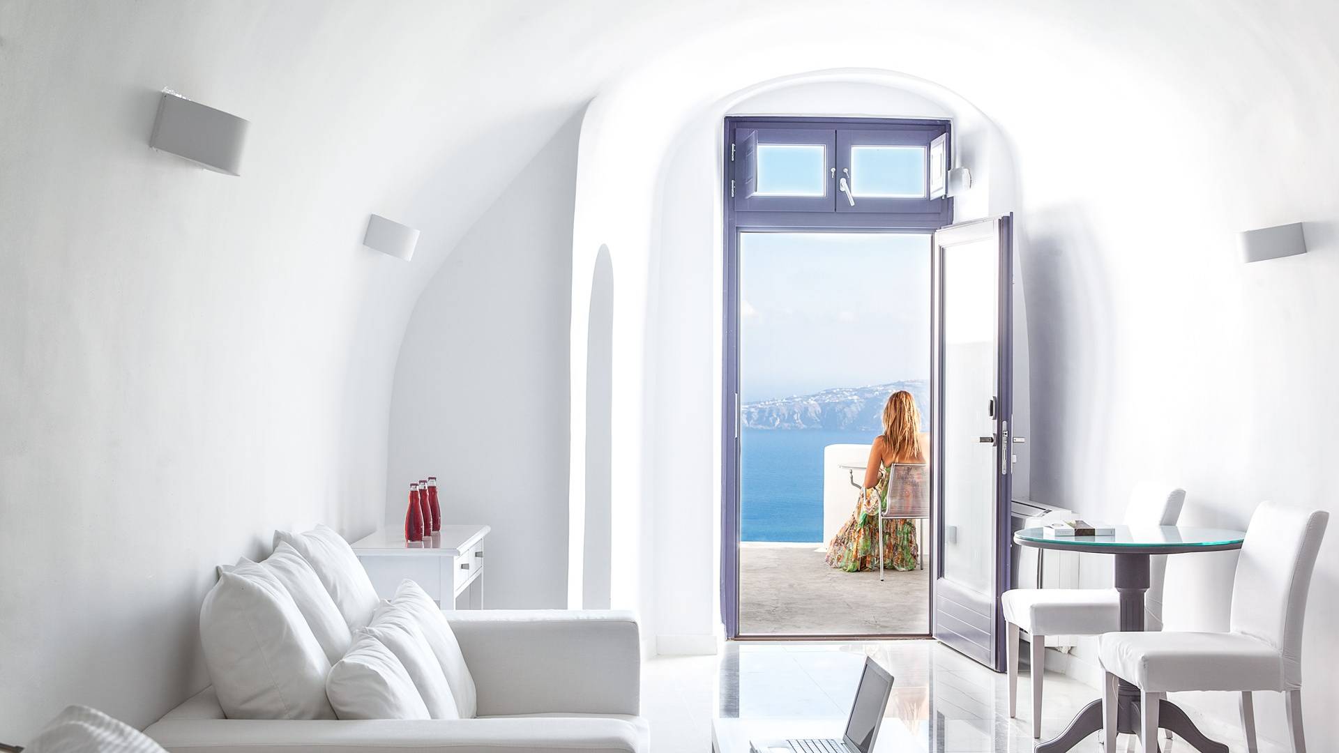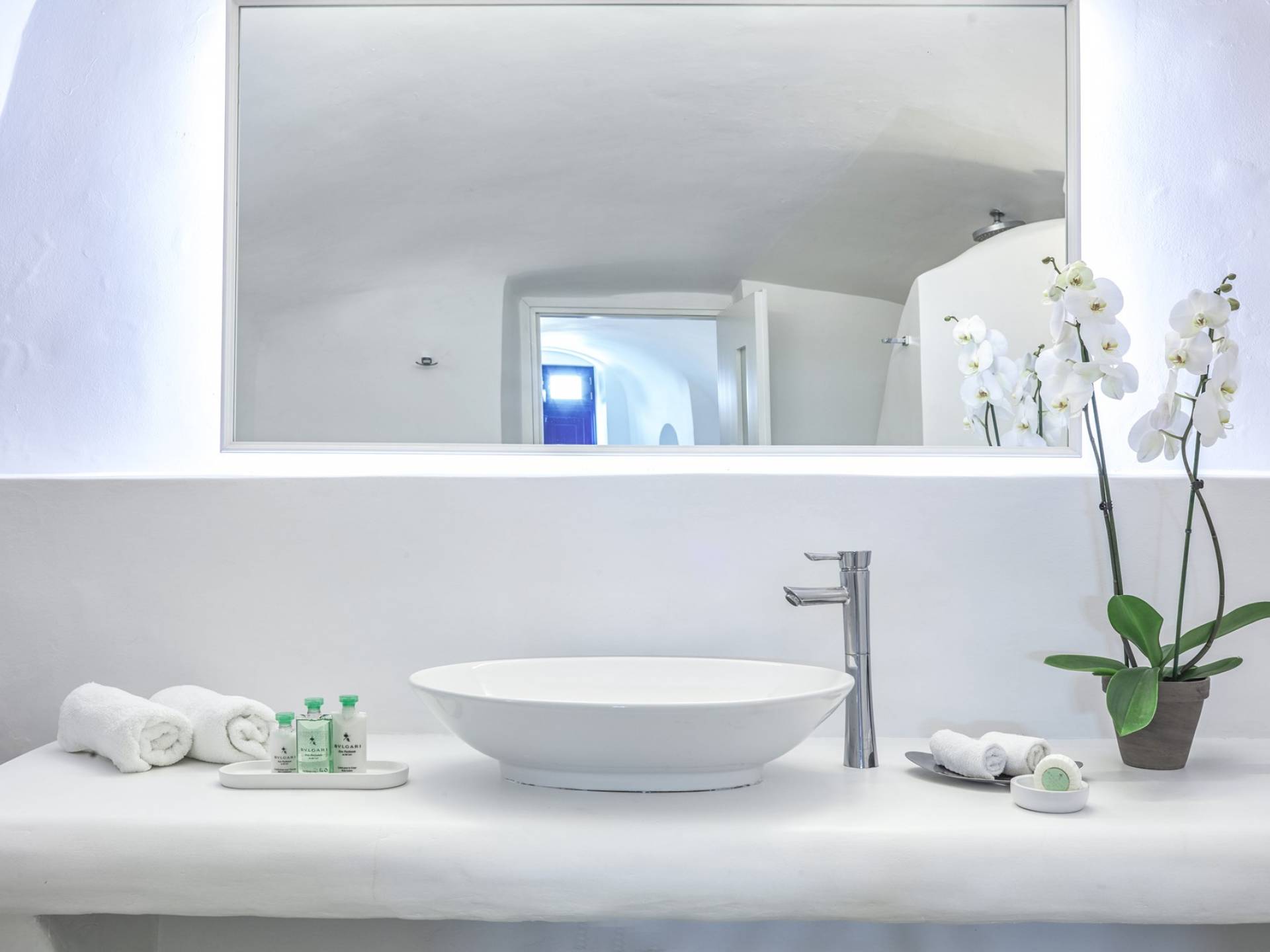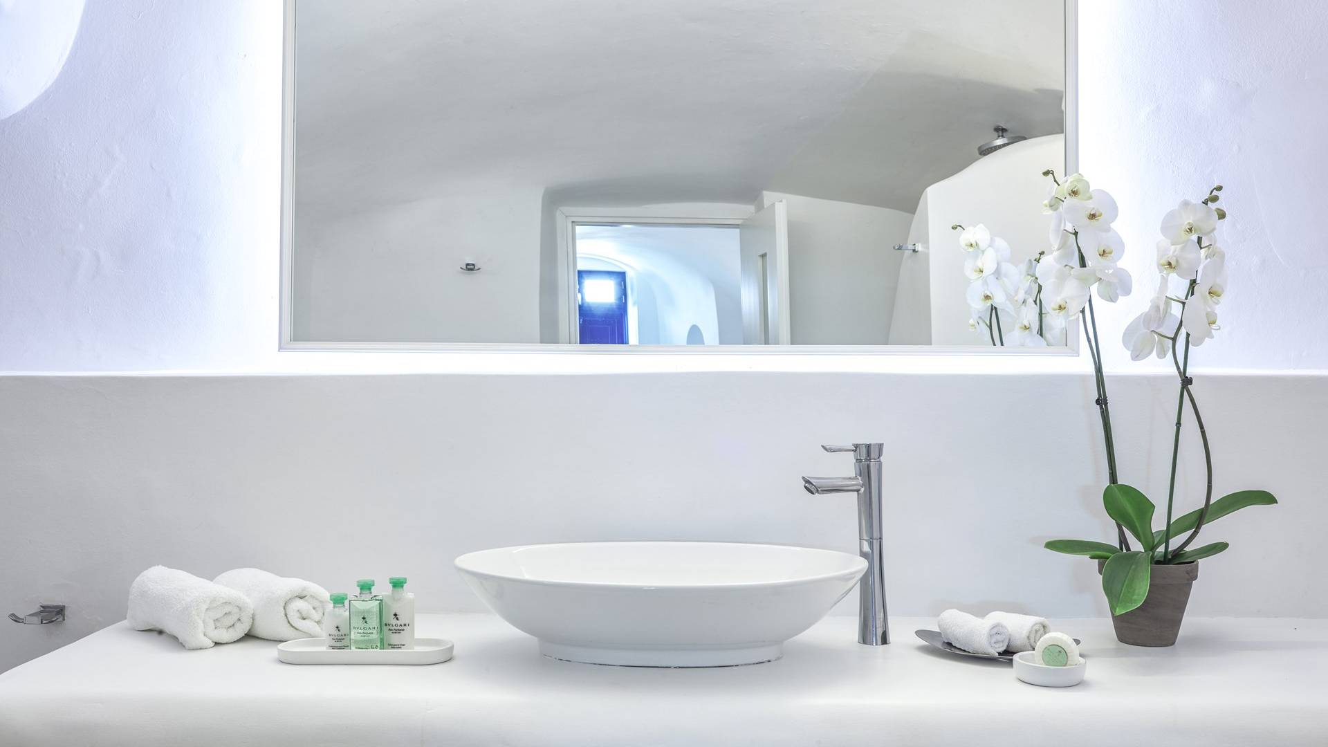 Las habitaciones y suites con vista al mar en Imerovigli, que caen orgánicamente en cascada por el acantilado, denotan lujo y romanticismo en cada detalle, donde la claridad de la luz del mar Egeo juega con paletas monocromáticas contemporáneas. Las 26 habitaciones, suites y villas con vista al mar, todas puras, sobrias y blancas en esencia, sin excepción, se completan con la fascinante vista a la Caldera de Santorini.