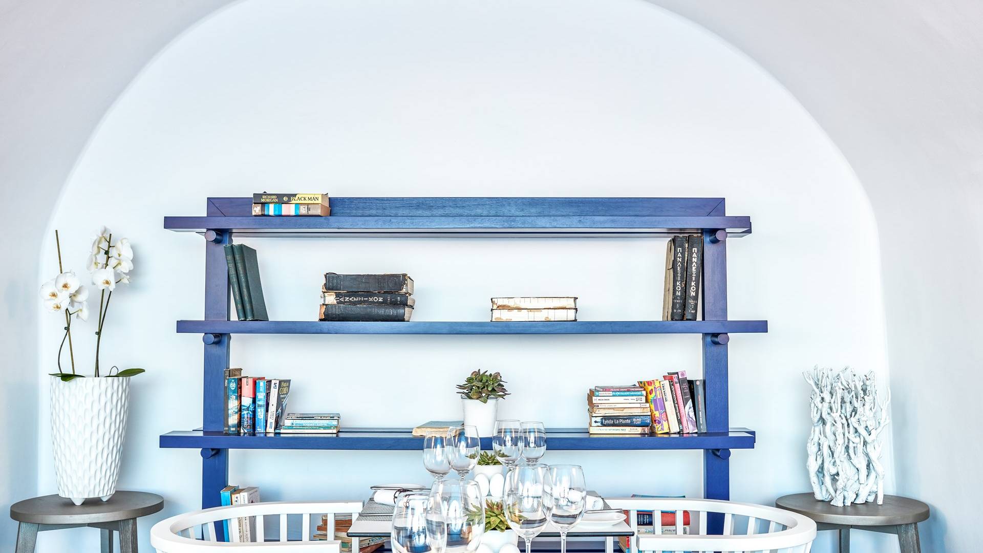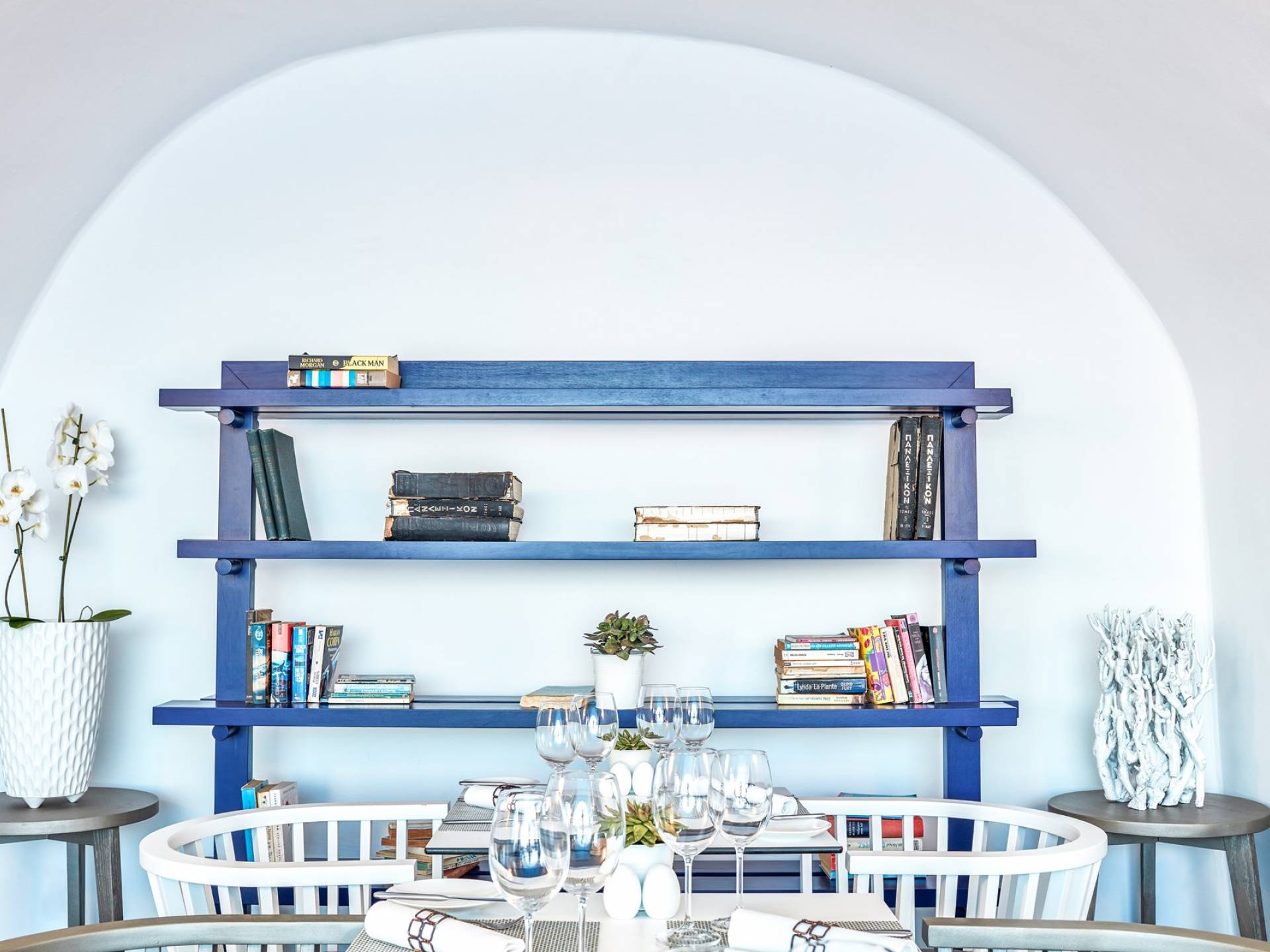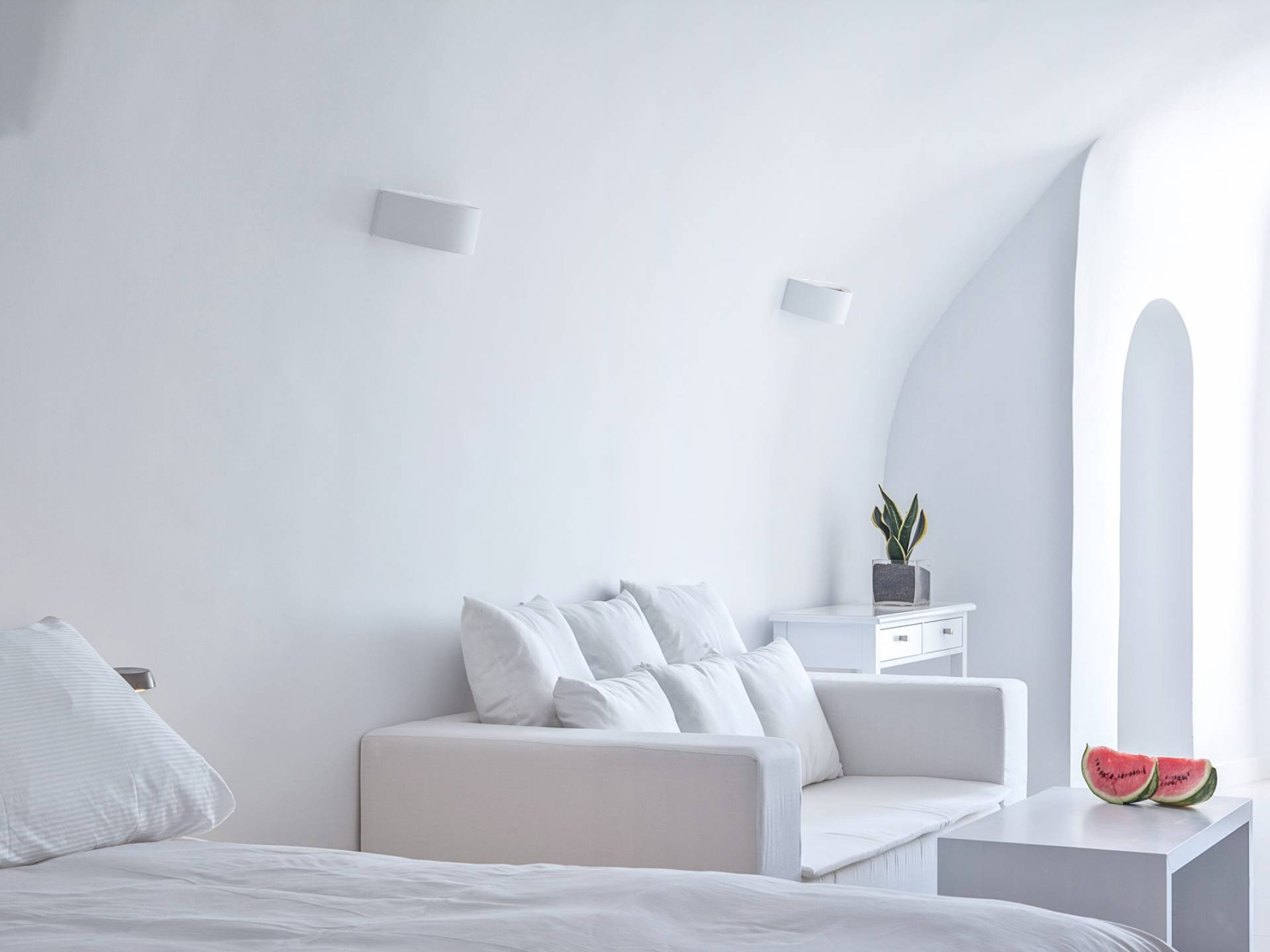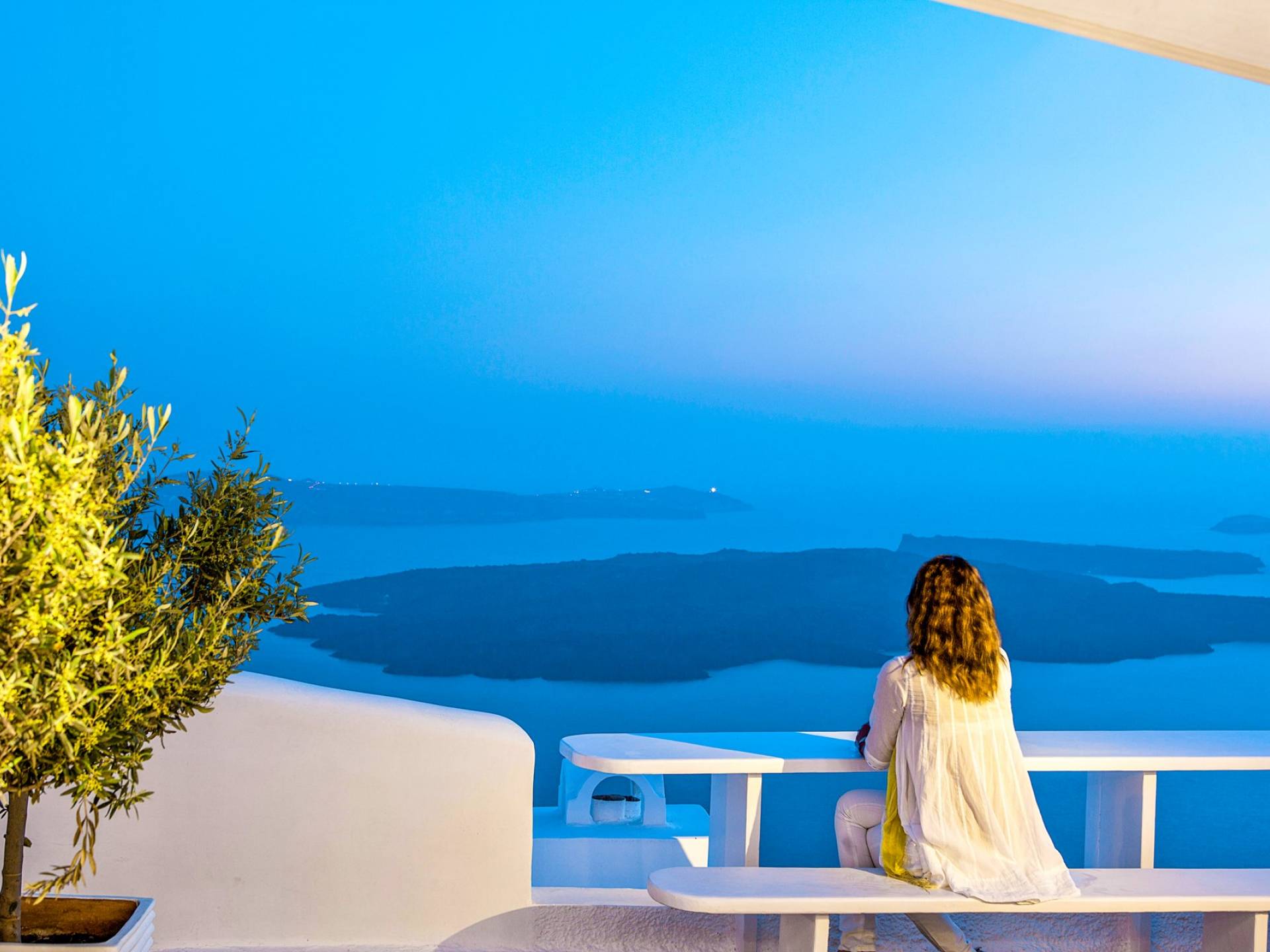 Las habitaciones y suites con vista al mar en Imerovigli, que caen orgánicamente en cascada por el acantilado, denotan lujo y romanticismo en cada detalle, donde la claridad de la luz del mar Egeo juega con paletas monocromáticas contemporáneas. Las 26 habitaciones, suites y villas con vista al mar, todas puras, sobrias y blancas en esencia, sin excepción, se completan con la fascinante vista a la Caldera de Santorini.