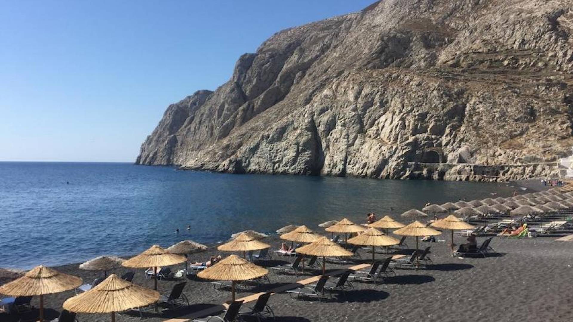 Kamari Santorini es un famoso balneario ubicado a 10 km al sureste de Fira, la capital de la isla. La playa está cubierta por una impresionante arena negra que contrasta bellamente con el azul del mar, mientras que en el lado izquierdo de la playa hay una enorme roca llamada Mesa Vouno que emerge del agua. Kamari es más impresionante por la noche cuando la roca brilla bajo la luz lunar. La playa de Kamari está completamente organizada y ofrece…Kamari Santorini es un famoso balneario ubicado a 10 km al sureste de Fira, la capital de la isla. La playa está cubierta por una impresionante arena negra que contrasta bellamente con el azul del mar, mientras que en el lado izquierdo de la playa hay una enorme roca llamada Mesa Vouno que emerge del agua. Kamari es más impresionante por la noche cuando la roca brilla bajo la luz lunar. La playa de Kamari está completamente organizada y ofrece…