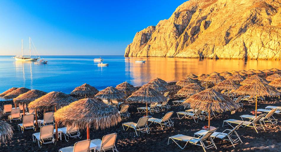 Kamari Santorini es un famoso balneario ubicado a 10 km al sureste de Fira, la capital de la isla. La playa está cubierta por una impresionante arena negra que contrasta bellamente con el azul del mar, mientras que en el lado izquierdo de la playa hay una enorme roca llamada Mesa Vouno que emerge del agua. Kamari es más impresionante por la noche cuando la roca brilla bajo la luz lunar. La playa de Kamari está completamente organizada y ofrece una amplia gama de instalaciones y deportes acuáticos. Pasee por el paseo marítimo y disfrute de la arquitectura de las pintorescas casas alineadas. Kamari, debido a las comodidades modernas que incluyen hoteles, restaurantes, bares, cafés y clubes nocturnos, atrae a muchos turistas durante el verano. Desde Kamari, una carretera te lleva a la montaña hasta la antigua Thira, donde puedes ver las reliquias de esta civilización, y un barco puede llevarte a la isla de Anafi, que es genial para explorar.