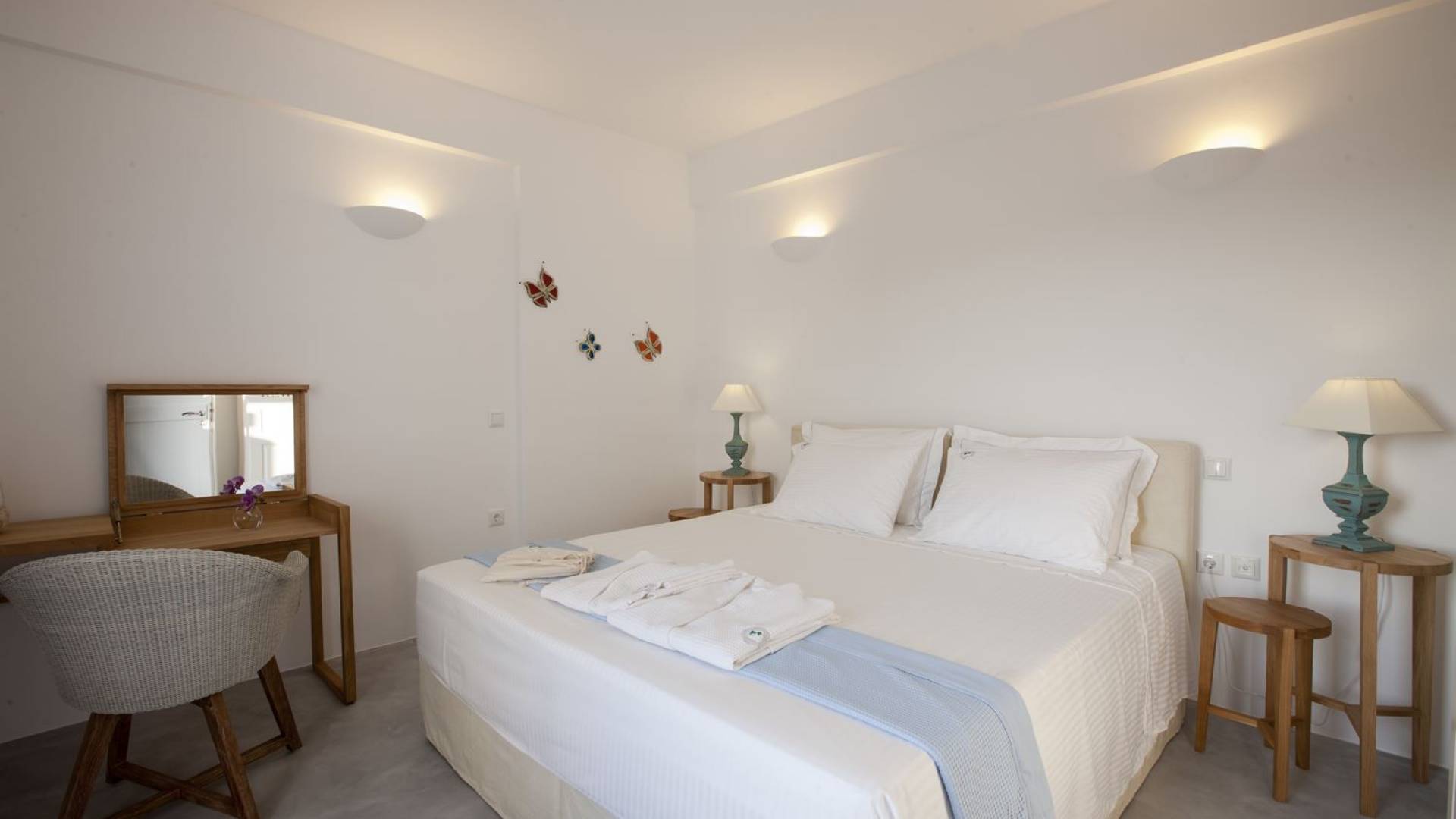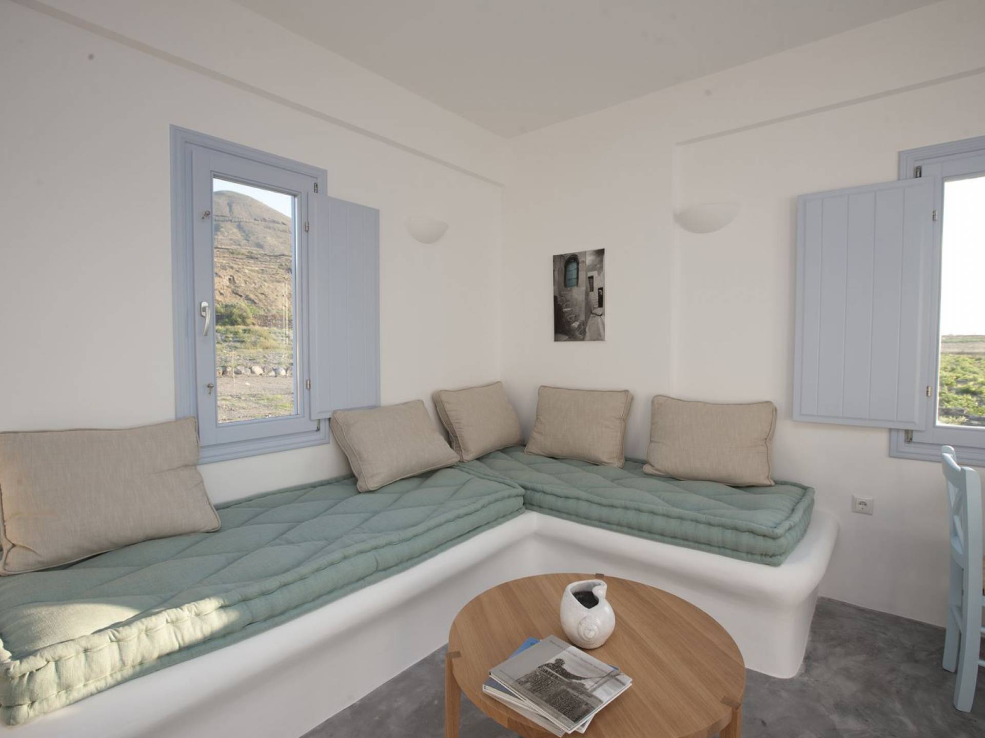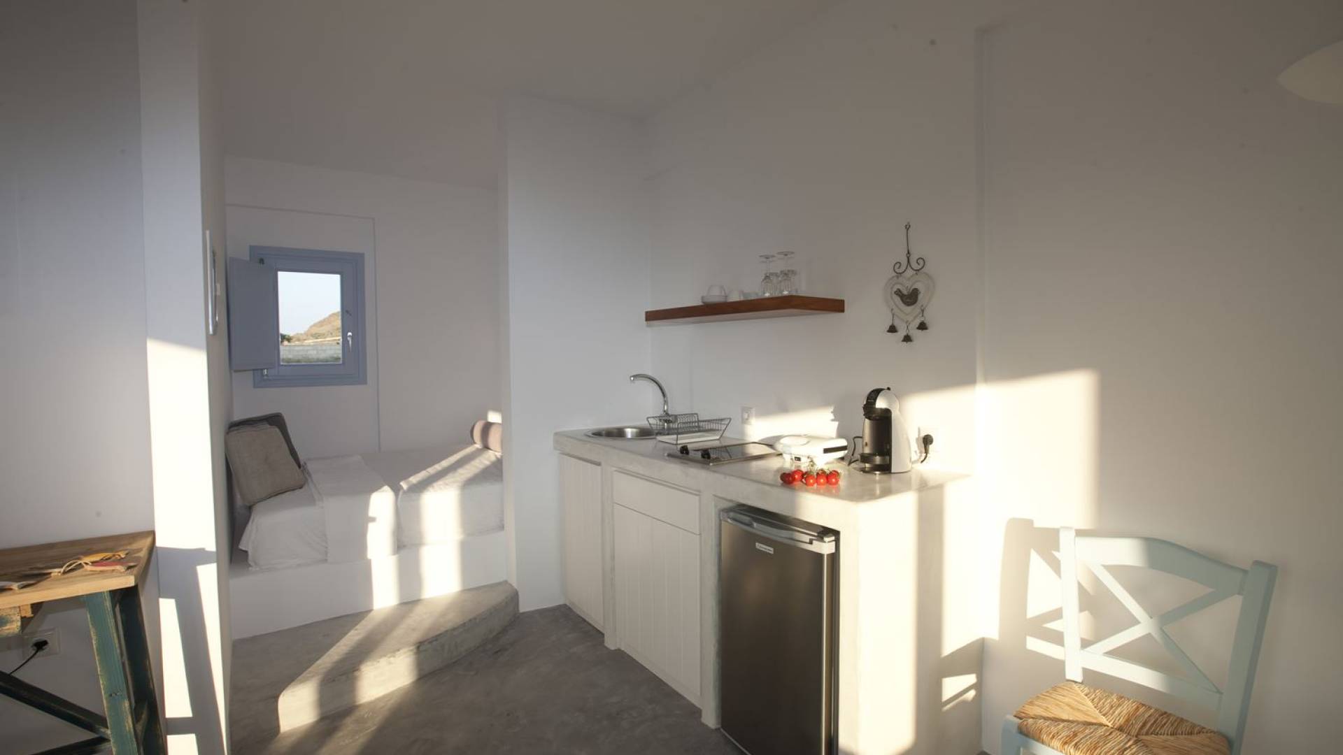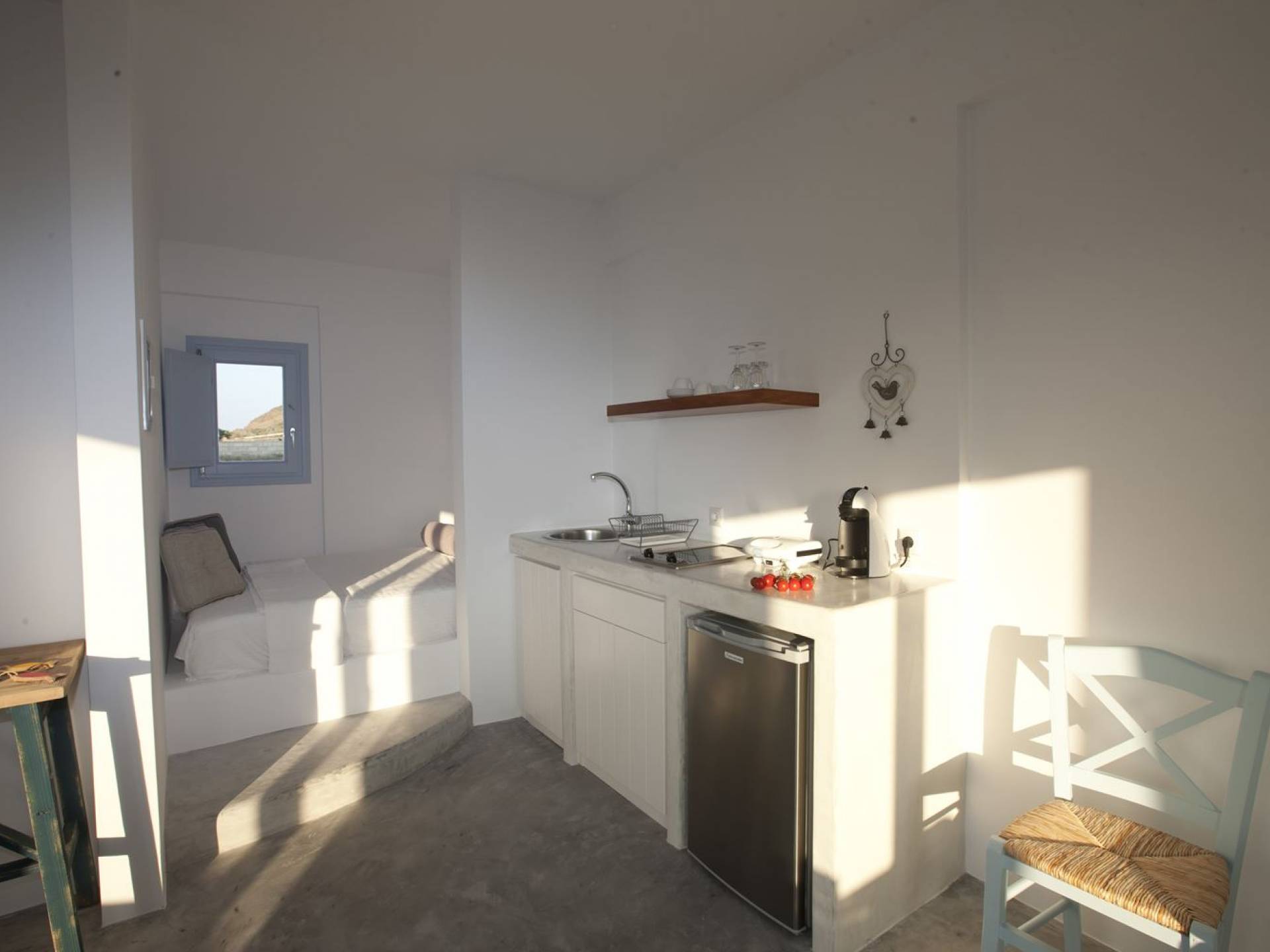Haciendo hincapié tanto en el estilo elegante como en la hospitalidad, estamos convencidos de que su alojamiento será inolvidable y su equipaje estará lleno de colores, aromas, imágenes y sensaciones que no solo no se olvidarán sino que serán suficientes para traerle pronto regresaremos a la magnífica y majestuosa isla de Santorini. Helios Suite en Sun Anemos Santorini es una suite de lujo en alquiler con 2 dormitorios. Una suite extremadamente cómoda de 60sq. metro. con entrada independiente y una gran terraza privada de 20 m2. con pérgola. Oferta Helios Suite: un dormitorio con una cama king-size, una habitación especialmente diseñada con una cama doble empotrada y en la sala de estar, hay dos sofás empotrados tradicionales que pueden acomodar a dos personas. También tiene una cocina completamente equipada, un baño con ducha a ras de suelo y tiene capacidad para 6 personas como máximo.