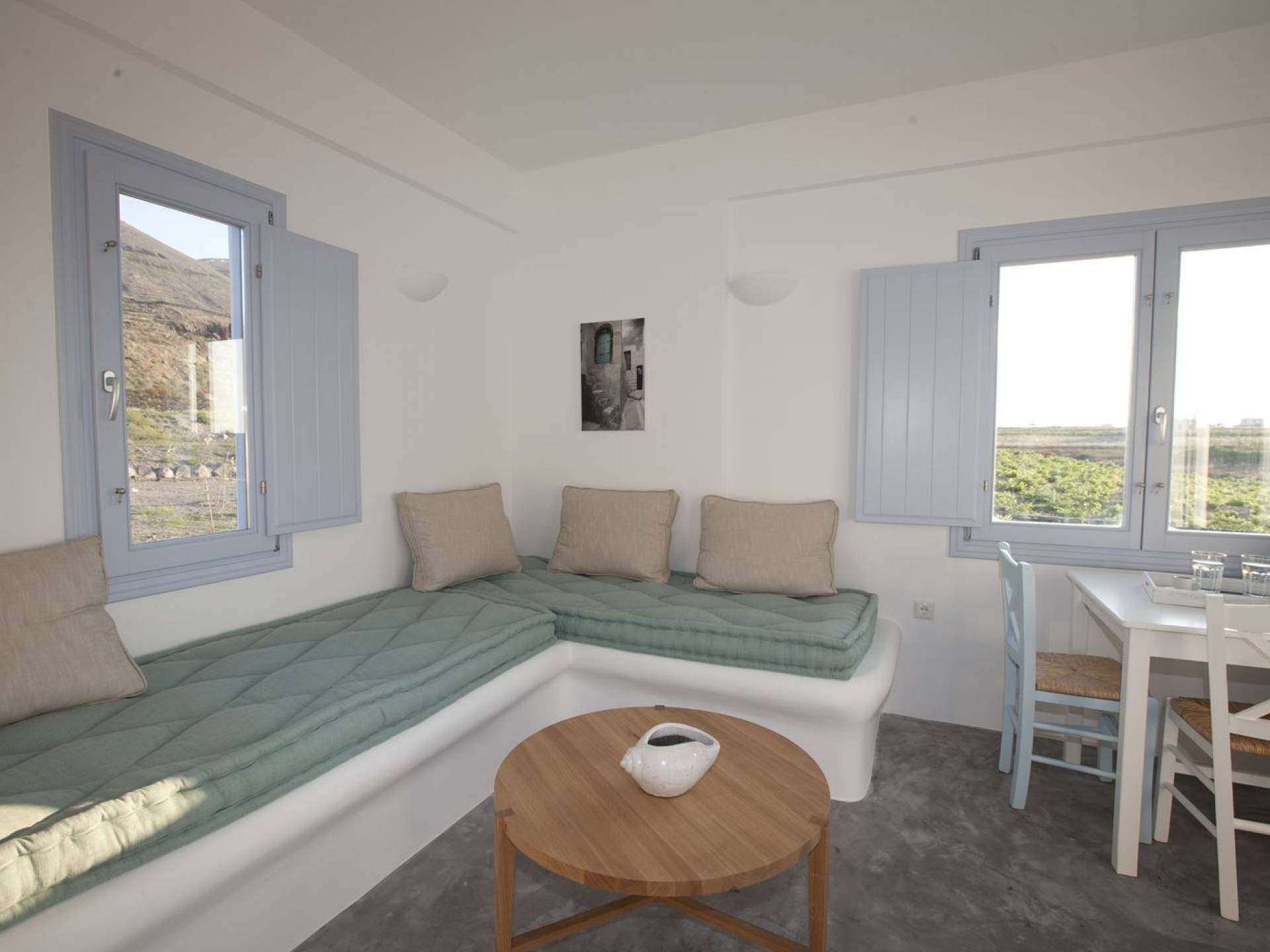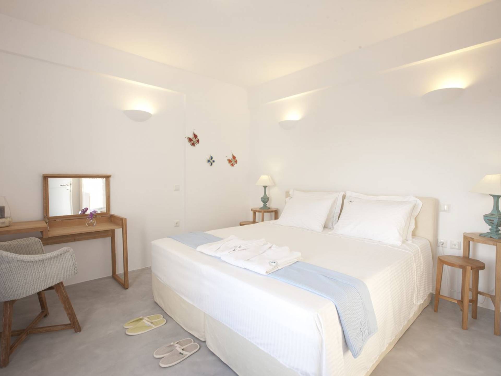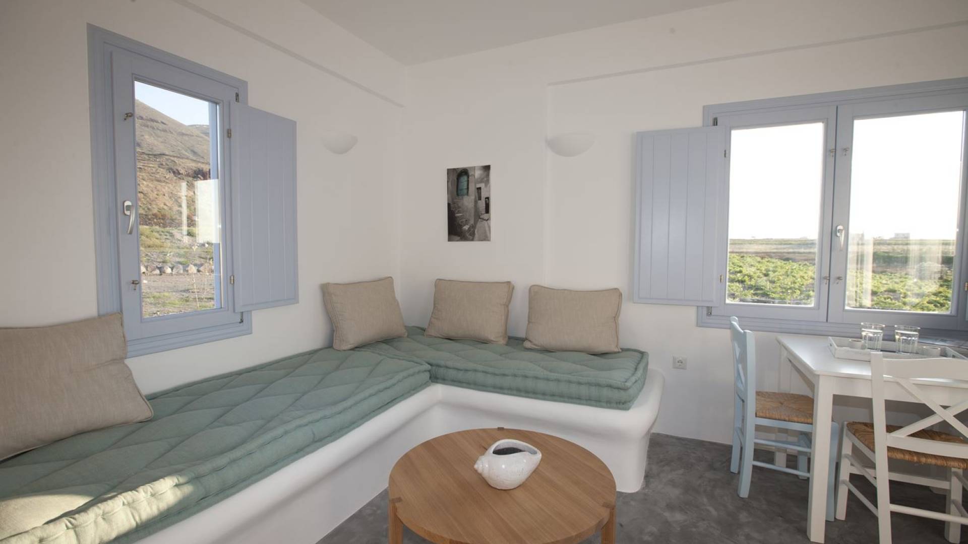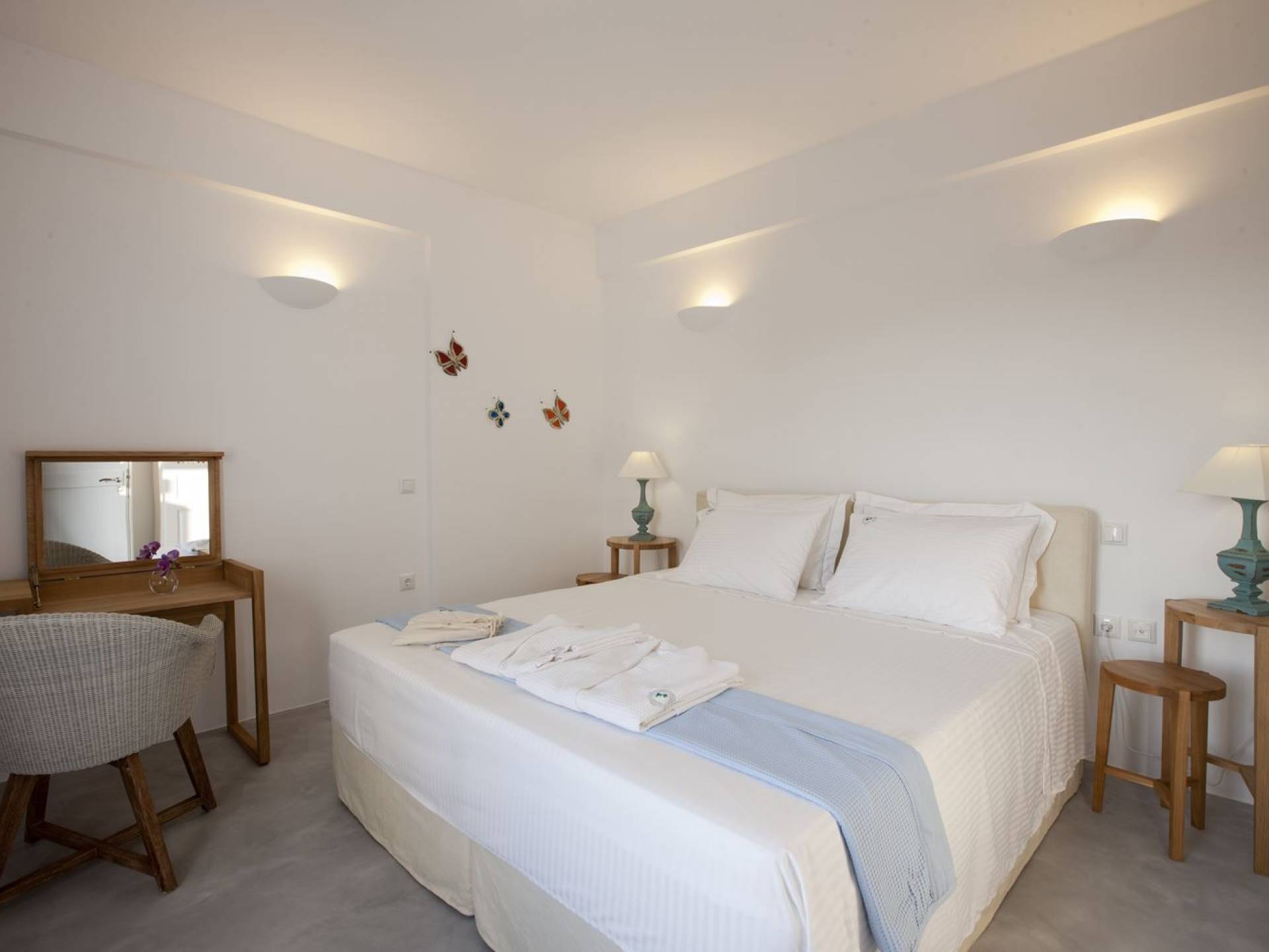 Haciendo hincapié tanto en el estilo elegante como en la hospitalidad, estamos convencidos de que su alojamiento será inolvidable y su equipaje estará lleno de colores, aromas, imágenes y sensaciones que no solo no se olvidarán sino que serán suficientes para traerle pronto regresaremos a la magnífica y majestuosa isla de Santorini. Helios Suite en Sun Anemos Santorini es una suite de lujo en alquiler con 2 dormitorios. Una suite extremadamente cómoda de 60sq. metro. con entrada independiente y una gran terraza privada de 20 m2. con pérgola. Oferta Helios Suite: un dormitorio con una cama king-size, una habitación especialmente diseñada con una cama doble empotrada y en la sala de estar, hay dos sofás empotrados tradicionales que pueden acomodar a dos personas. También tiene una cocina completamente equipada, un baño con ducha a ras de suelo y tiene capacidad para 6 personas como máximo.