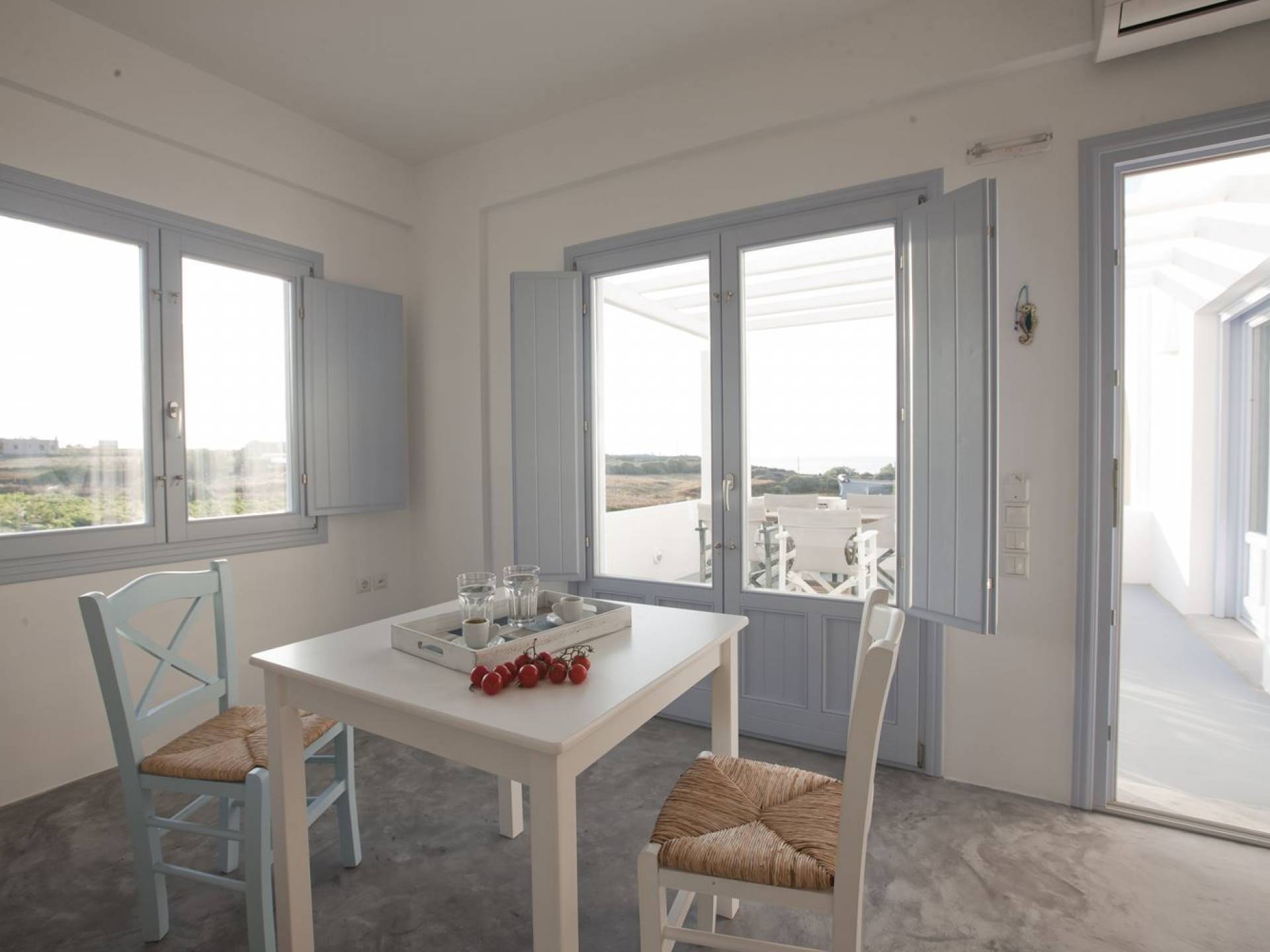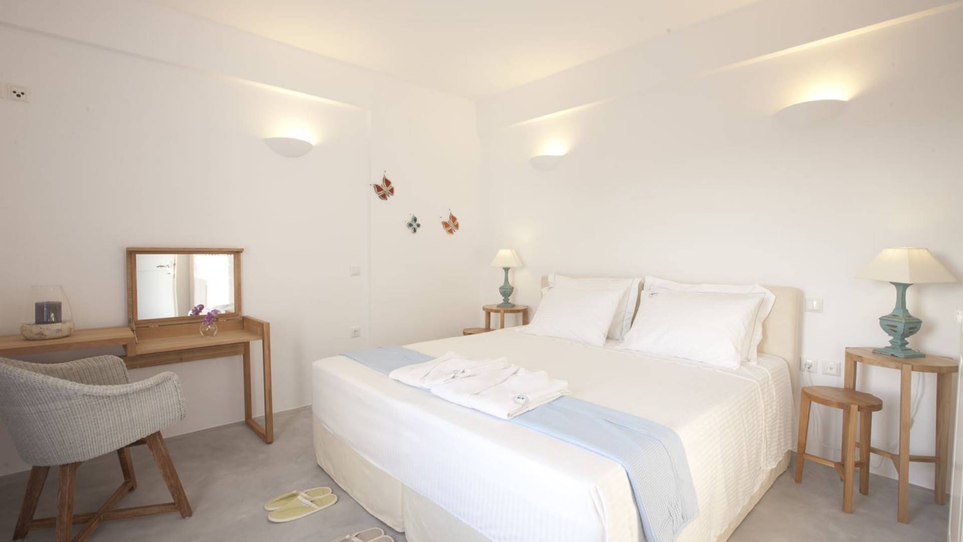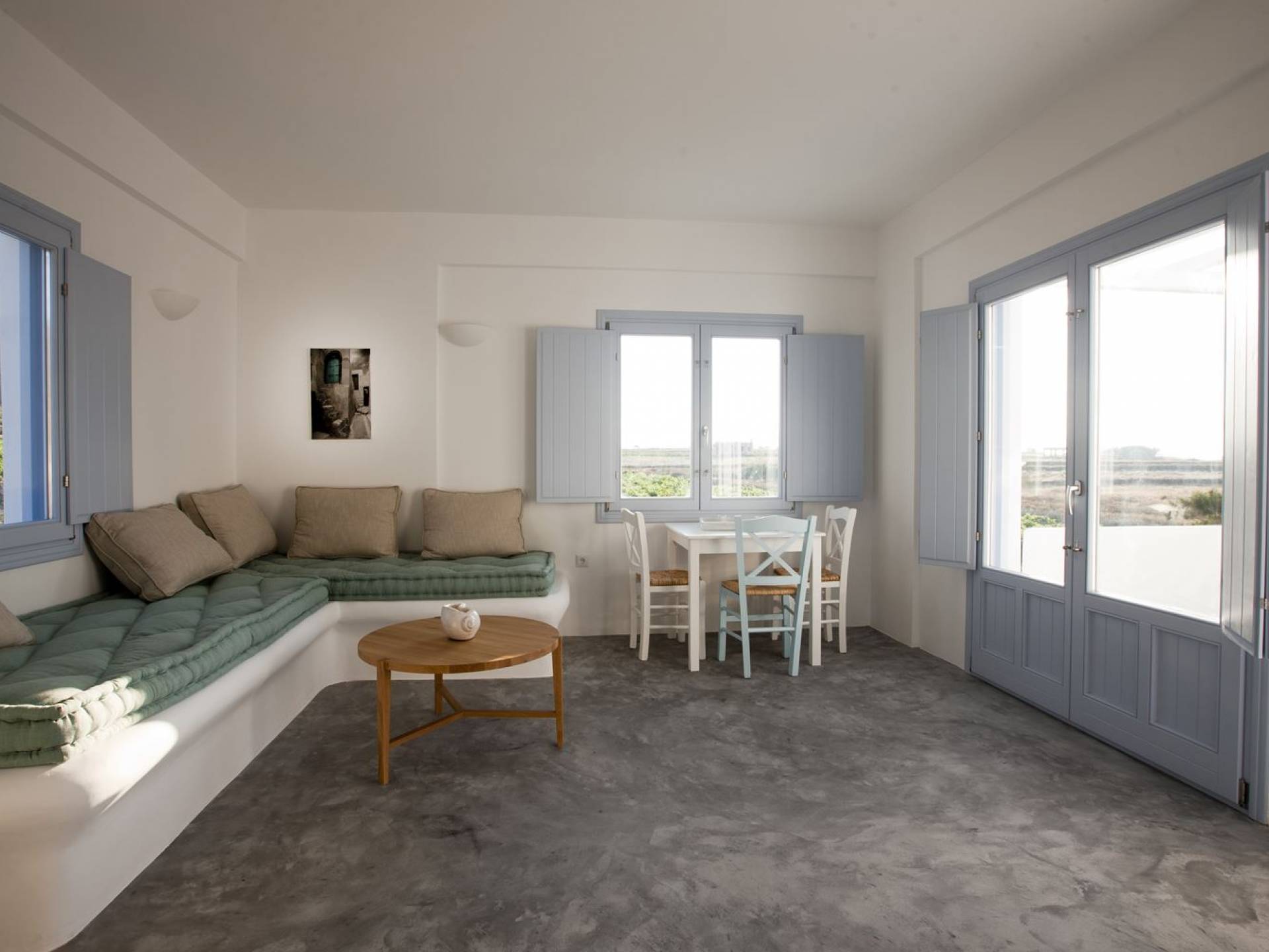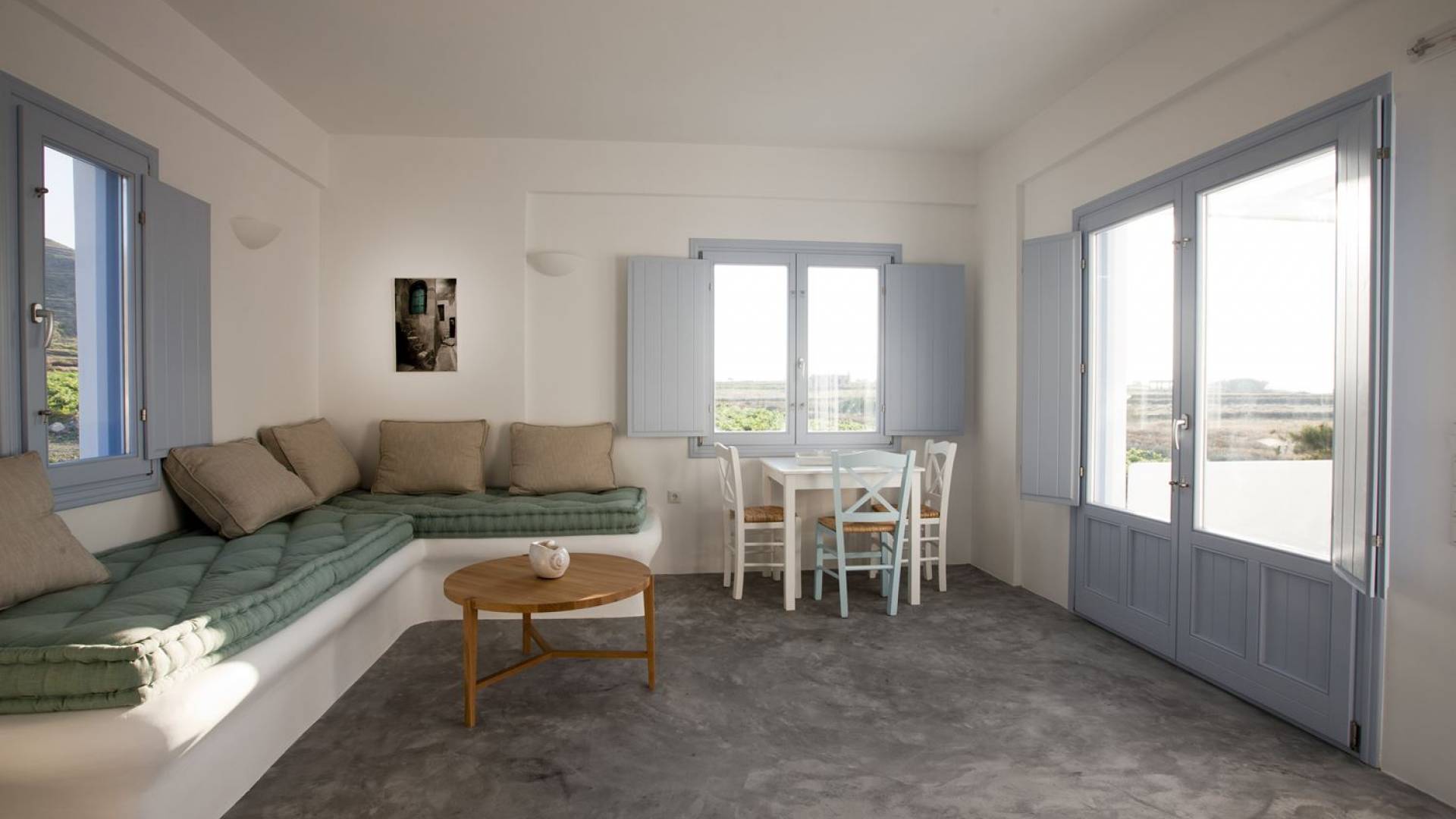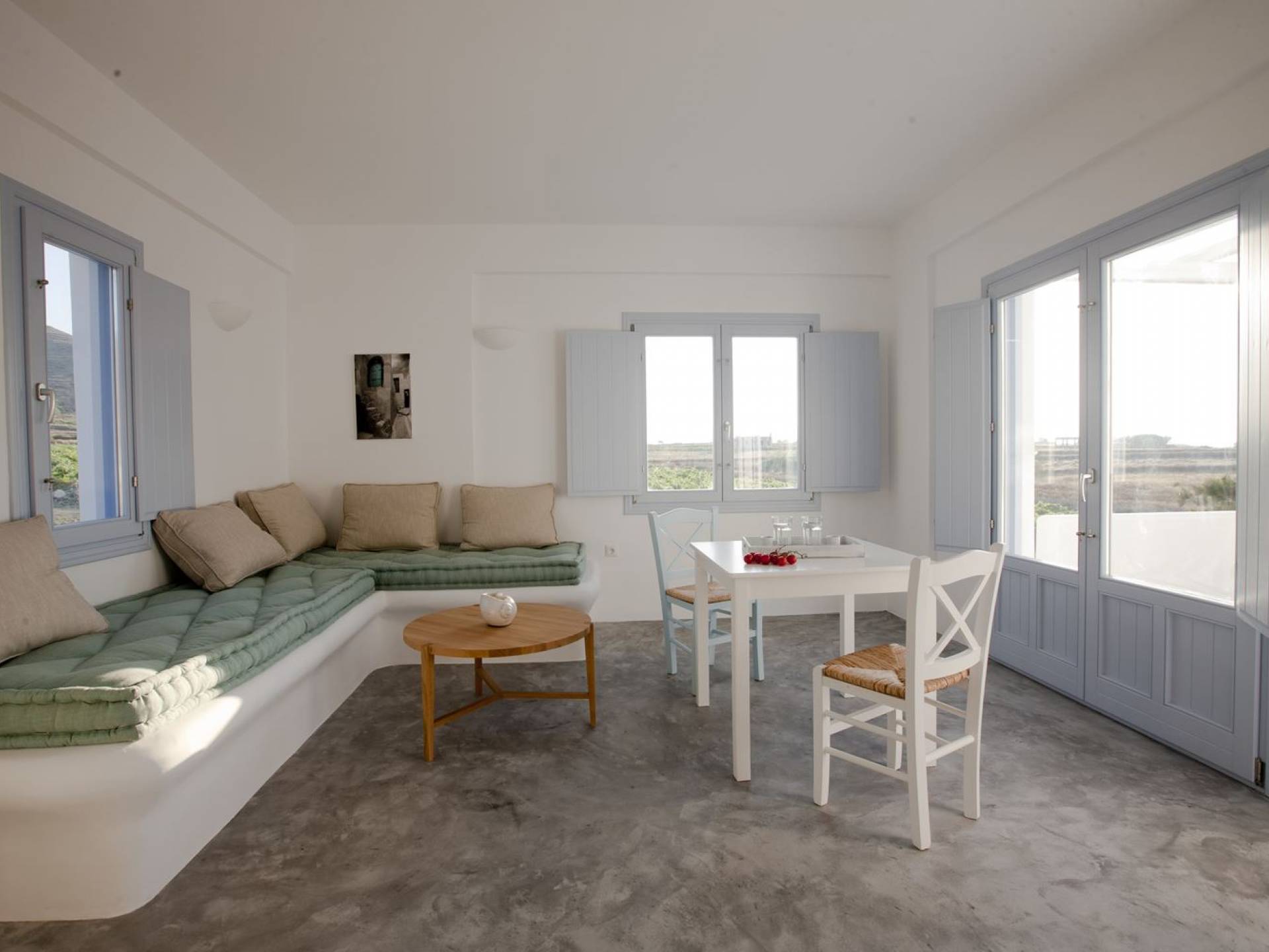 Haciendo hincapié tanto en el estilo elegante como en la hospitalidad, estamos convencidos de que su alojamiento será inolvidable y su equipaje estará lleno de colores, aromas, imágenes y sensaciones que no solo no se olvidarán sino que serán suficientes para traerle pronto regresaremos a la magnífica y majestuosa isla de Santorini. Helios Suite en Sun Anemos Santorini es una suite de lujo en alquiler con 2 dormitorios. Una suite extremadamente cómoda de 60sq. metro. con entrada independiente y una gran terraza privada de 20 m2. con pérgola. Oferta Helios Suite: un dormitorio con una cama king-size, una habitación especialmente diseñada con una cama doble empotrada y en la sala de estar, hay dos sofás empotrados tradicionales que pueden acomodar a dos personas. También tiene una cocina completamente equipada, un baño con ducha a ras de suelo y tiene capacidad para 6 personas como máximo.