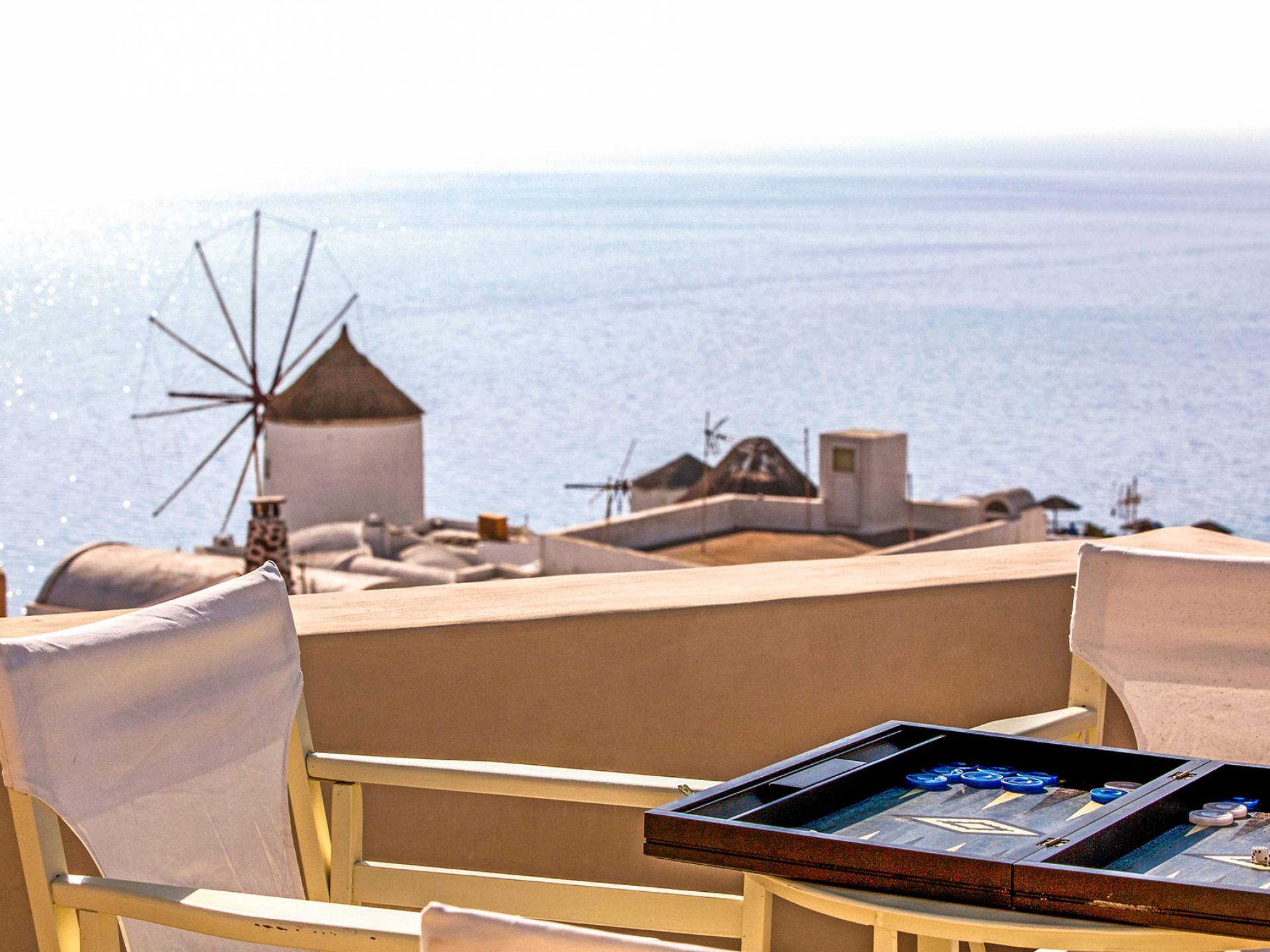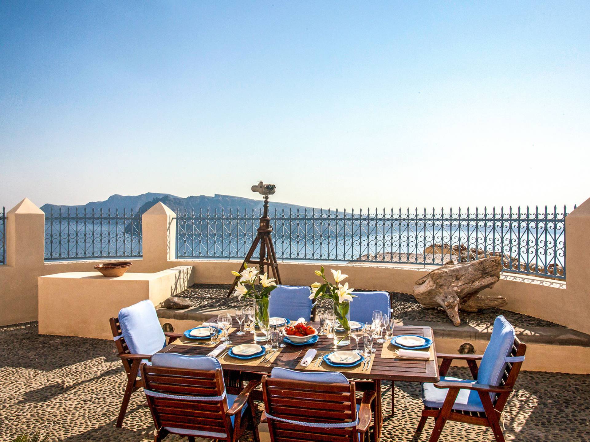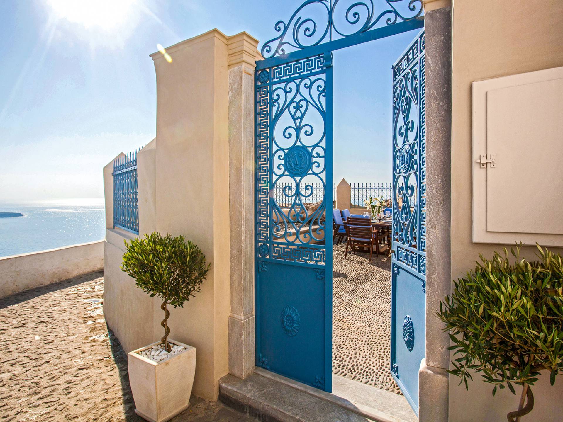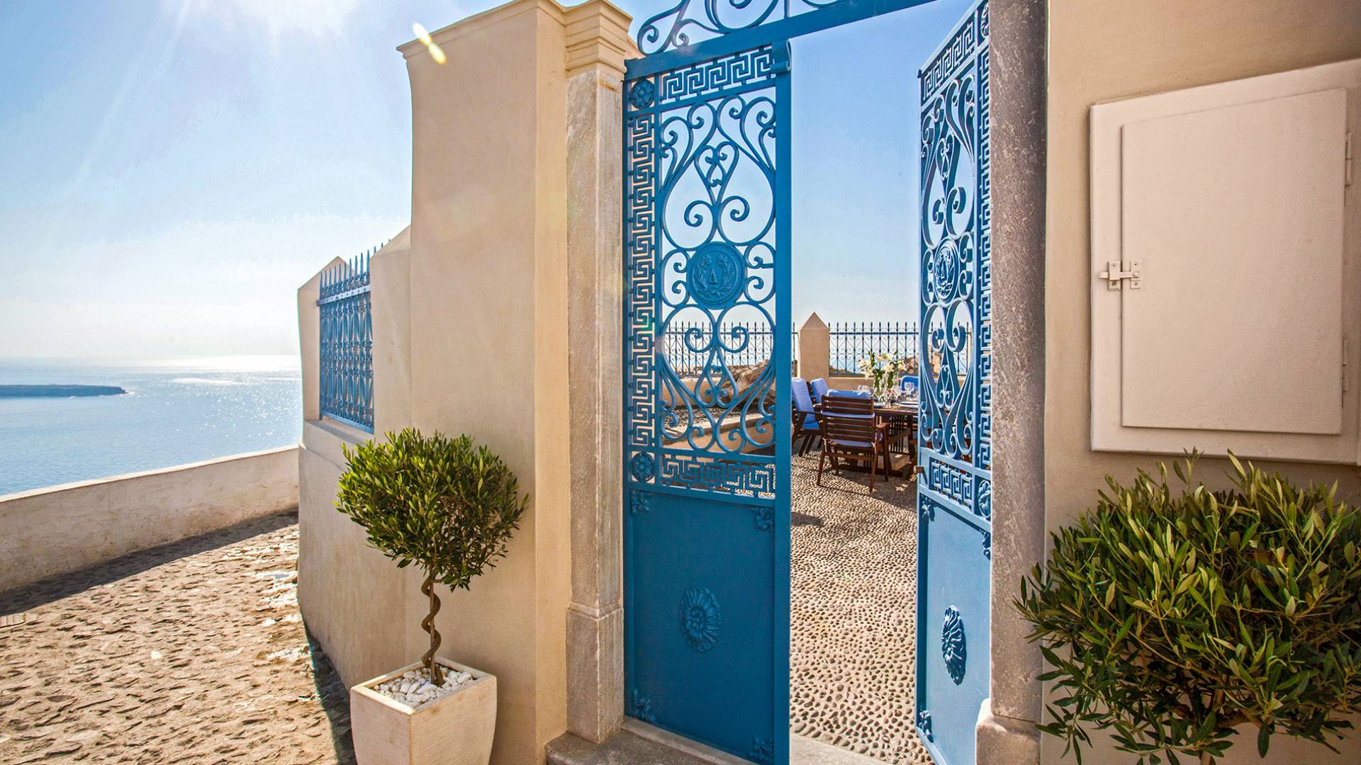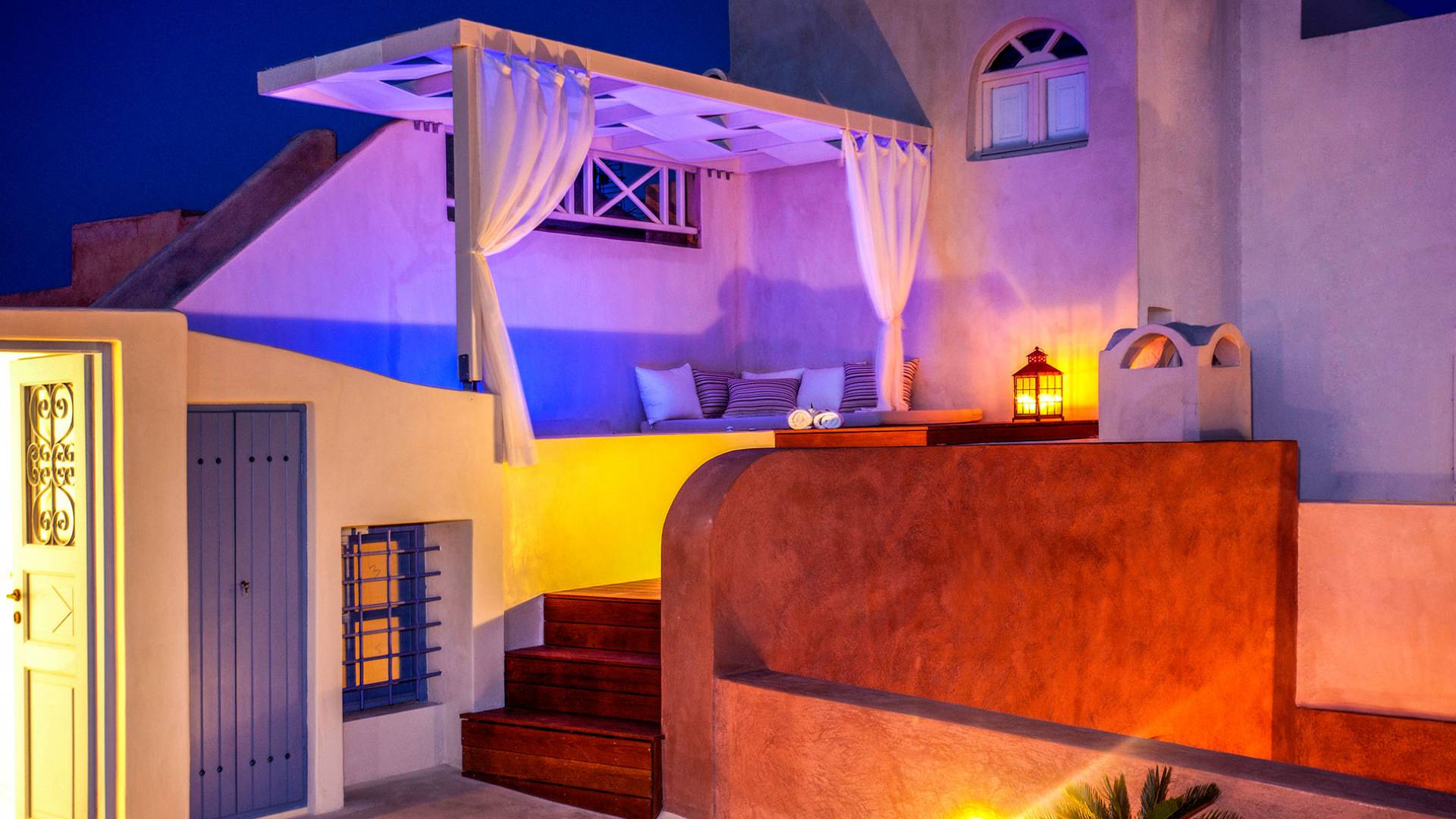 Frente a la mansión, el "patio" es realmente la terraza de los tiempos tradicionales de la isla. Tiene vistas igualmente panorámicas, que se complementa con la fachada neoclásica. Decorado en el modo tradicional de la isla, el patio interior, es el elemento sorpresa arquitectónico de buen gusto de Oia Mansion. Balcón privado con espectacular vista al idílico atardecer. Su reflejo en el agua crea un conducto dorado hacia el sol.