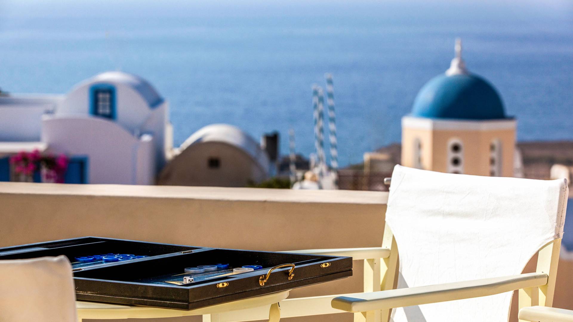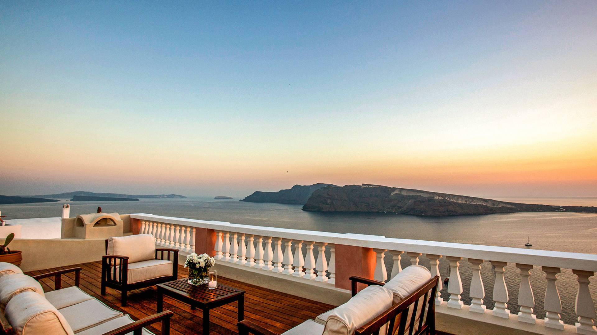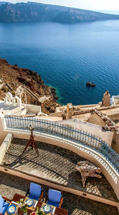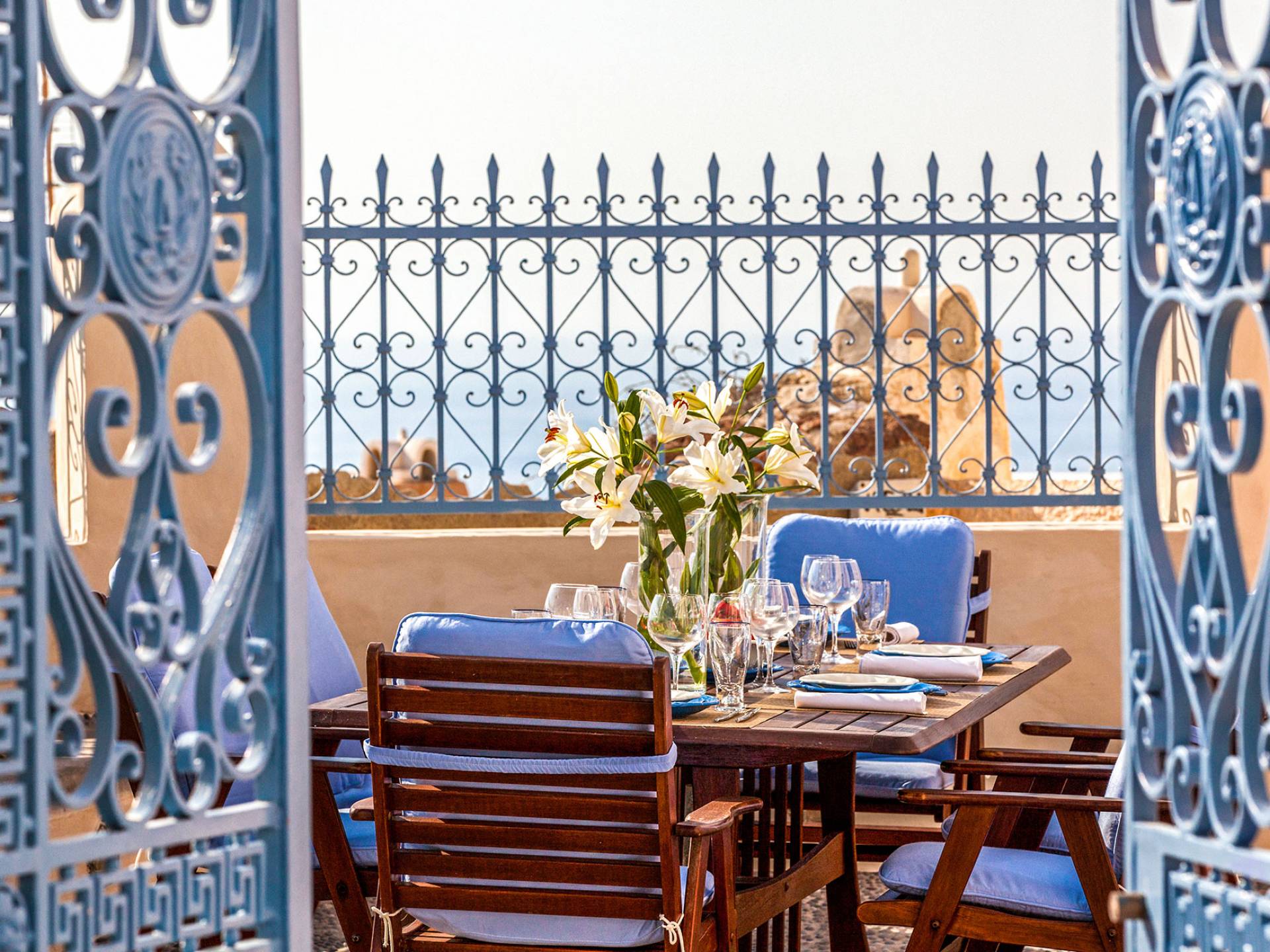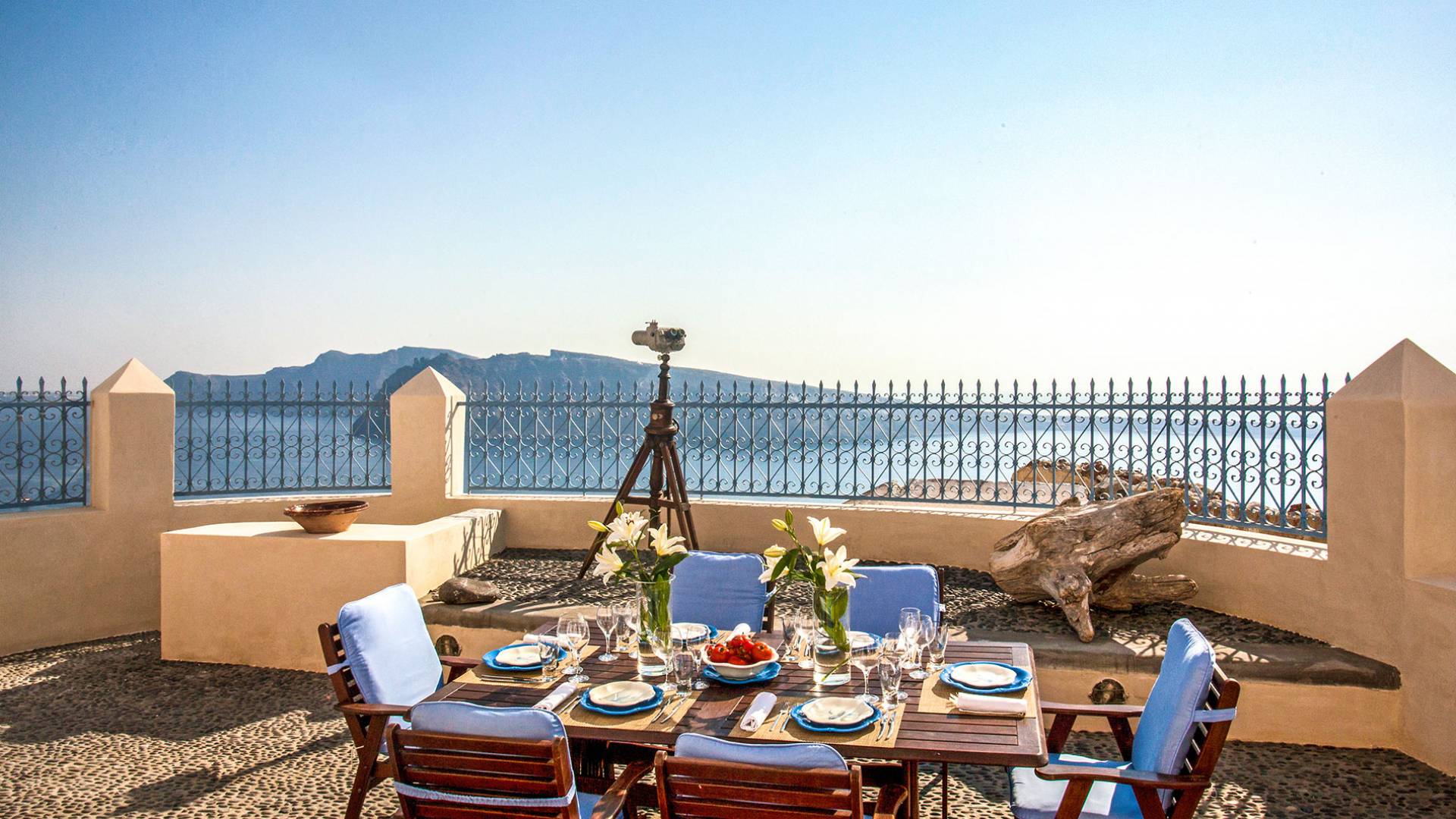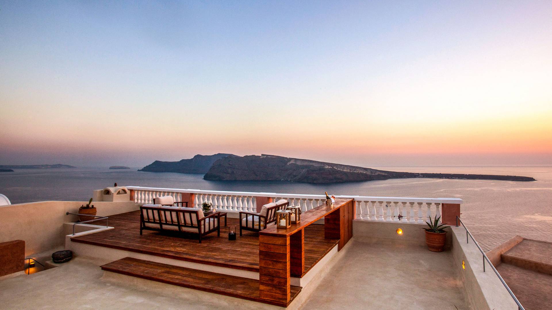 Frente a la mansión, el "patio" es realmente la terraza de los tiempos tradicionales de la isla. Tiene vistas igualmente panorámicas, que se complementa con la fachada neoclásica. Decorado en el modo tradicional de la isla, el patio interior, es el elemento sorpresa arquitectónico de buen gusto de Oia Mansion. Balcón privado con espectacular vista al idílico atardecer. Su reflejo en el agua crea un conducto dorado hacia el sol.