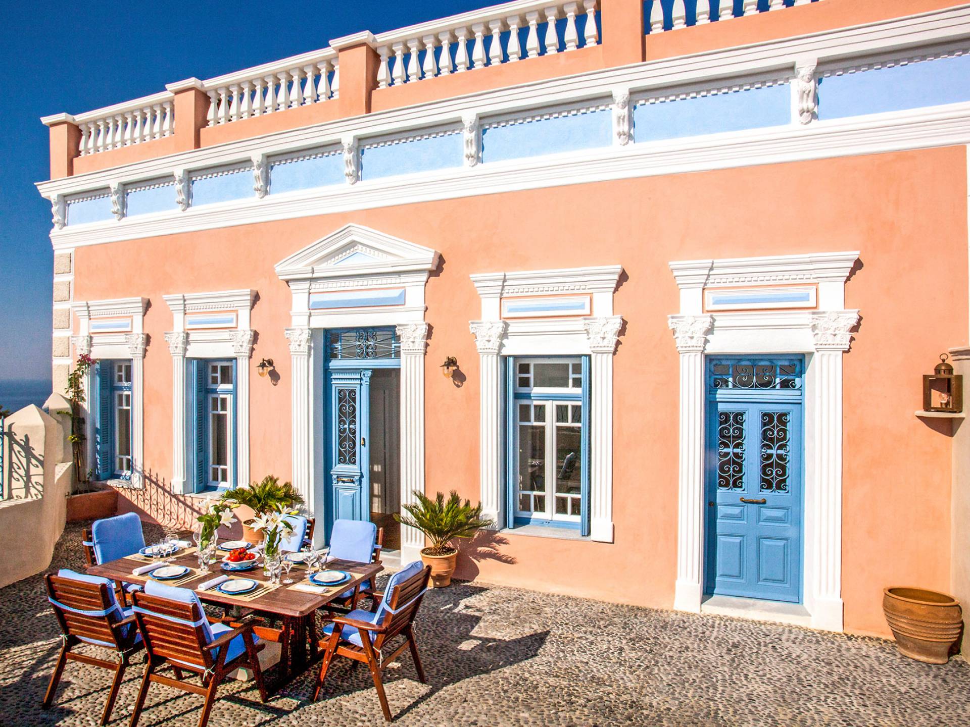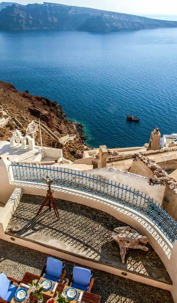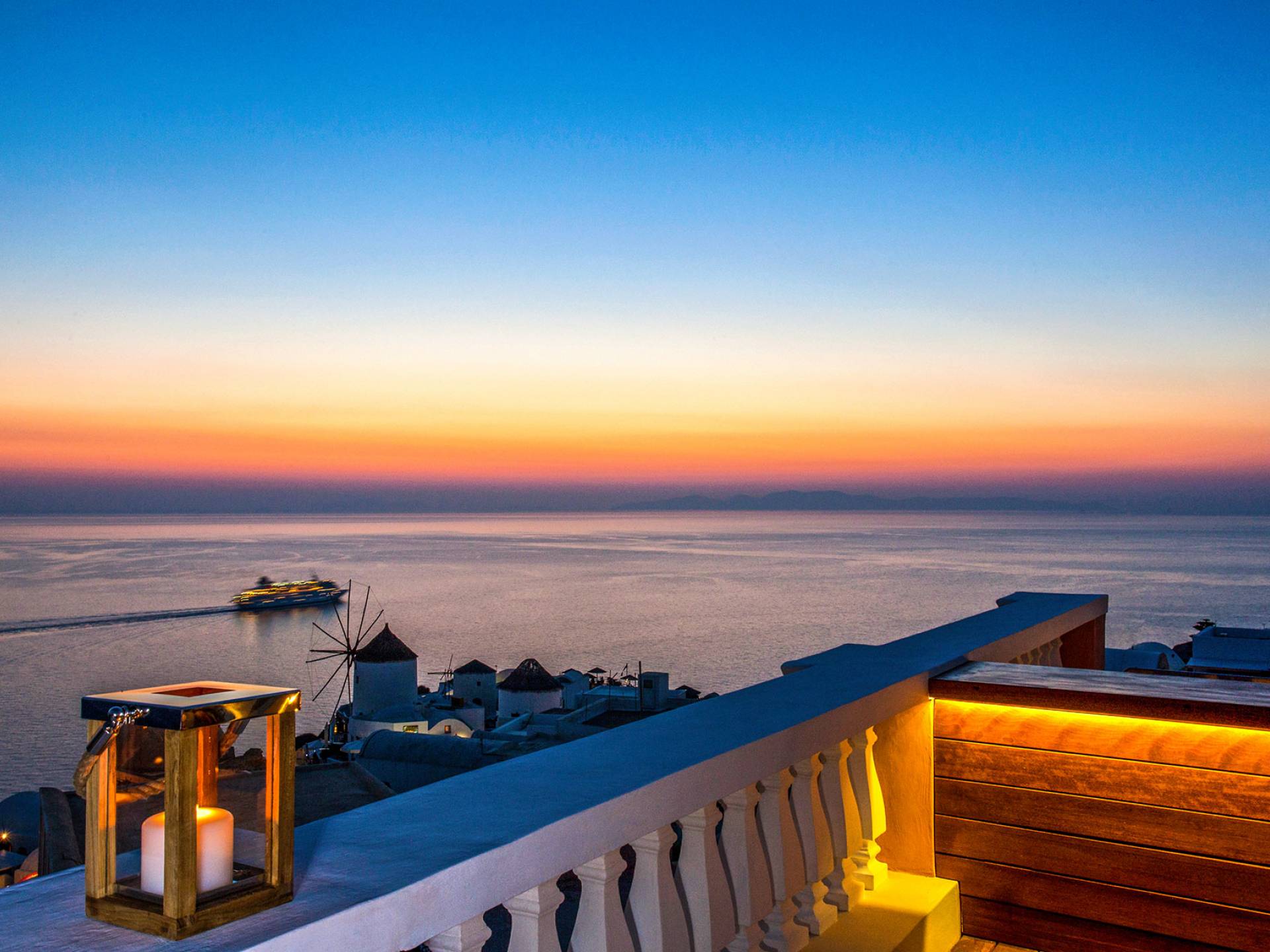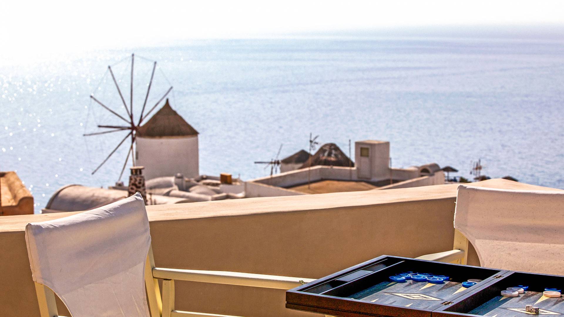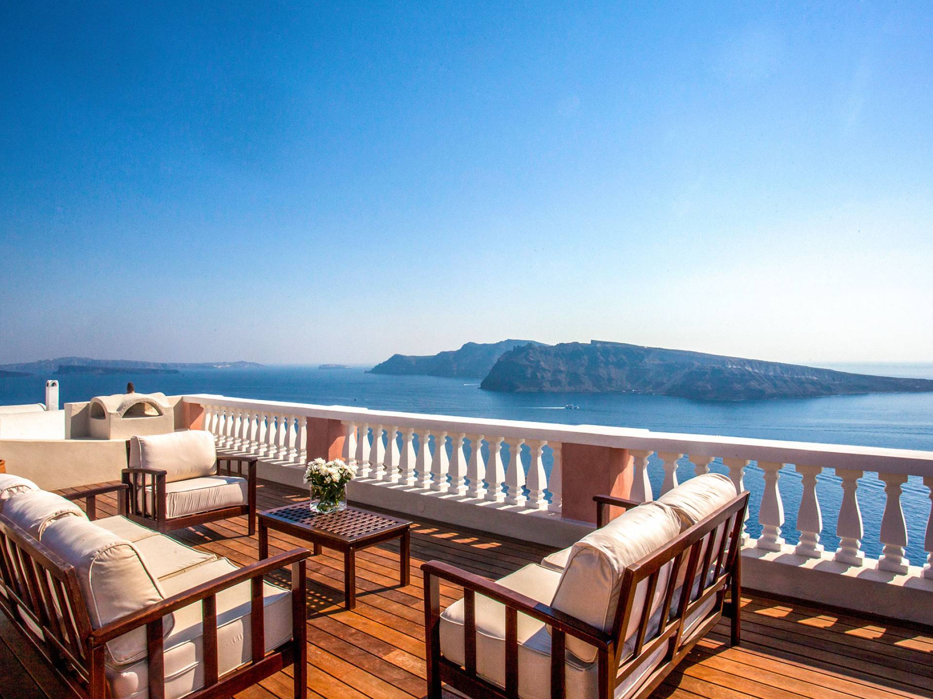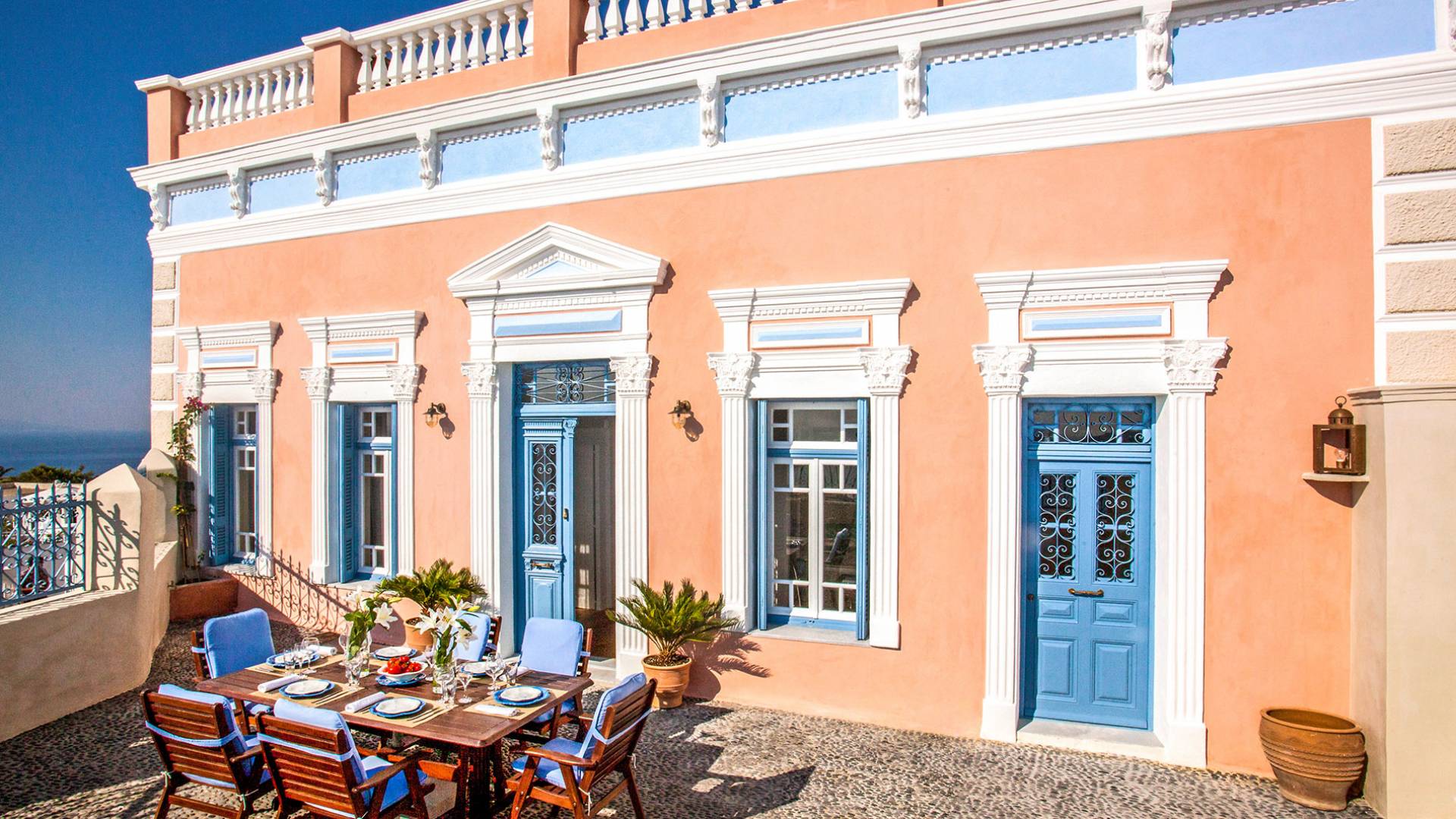 Frente a la mansión, el "patio" es realmente la terraza de los tiempos tradicionales de la isla. Tiene vistas igualmente panorámicas, que se complementa con la fachada neoclásica. Decorado en el modo tradicional de la isla, el patio interior, es el elemento sorpresa arquitectónico de buen gusto de Oia Mansion. Balcón privado con espectacular vista al idílico atardecer. Su reflejo en el agua crea un conducto dorado hacia el sol.