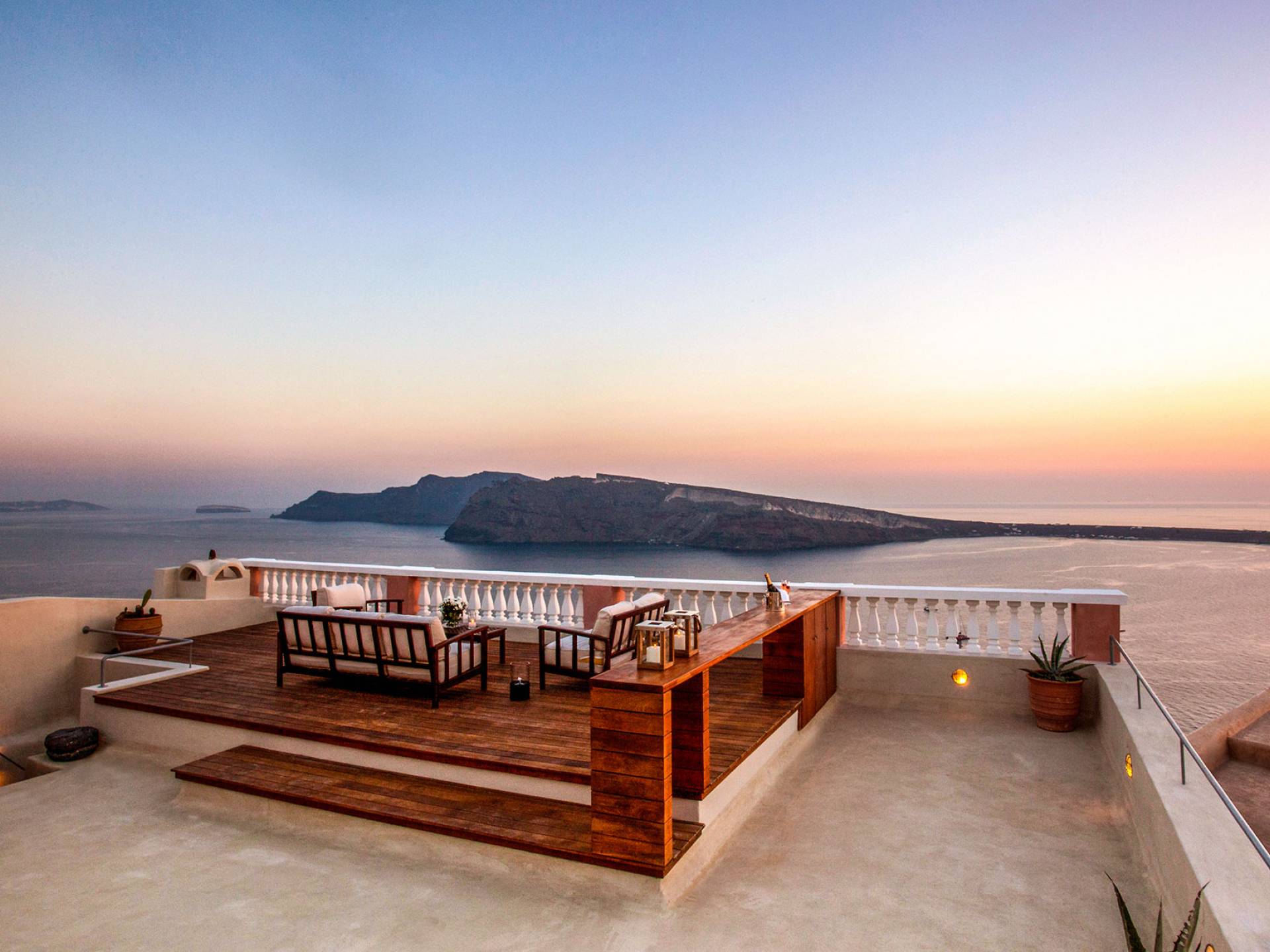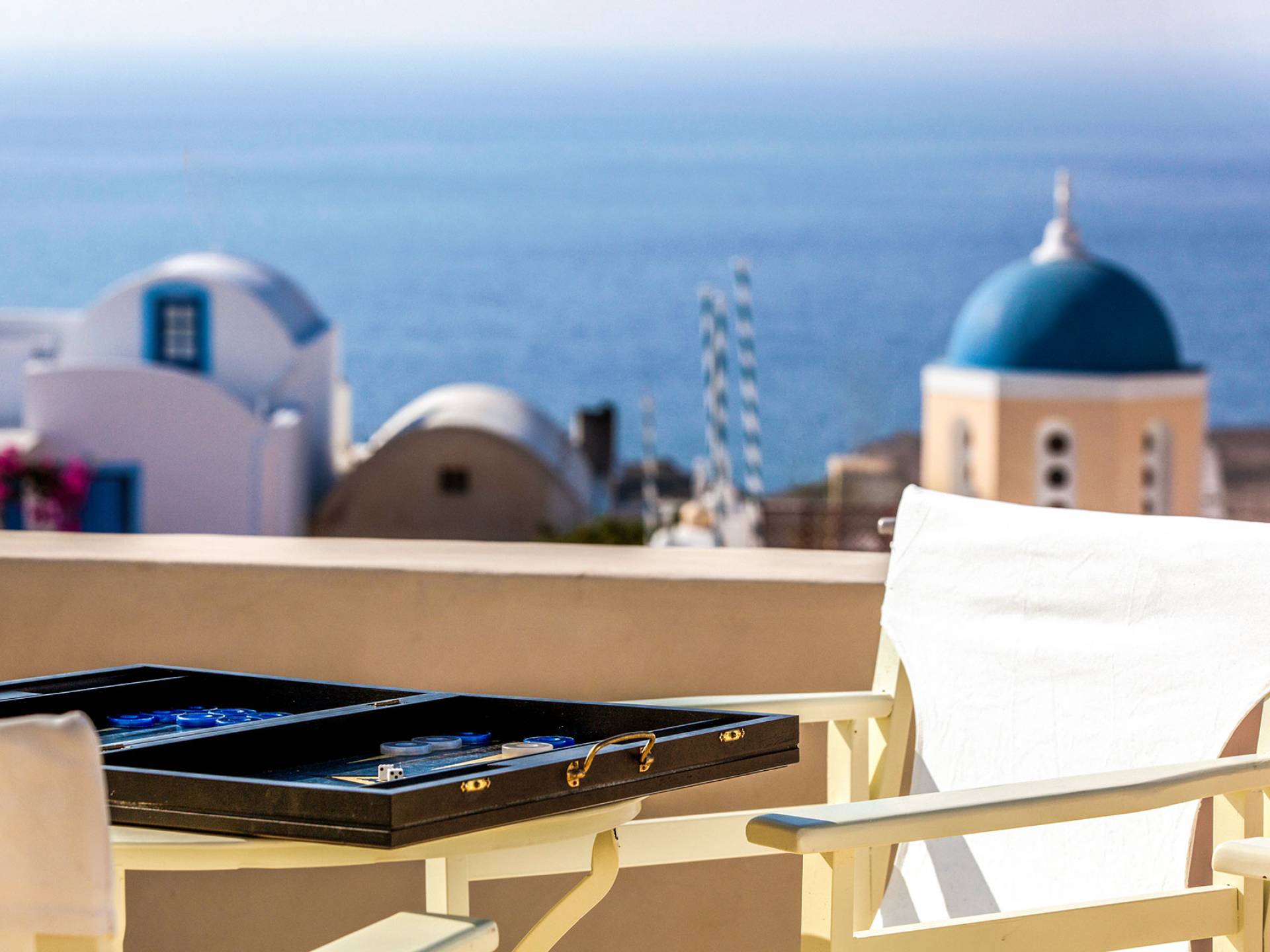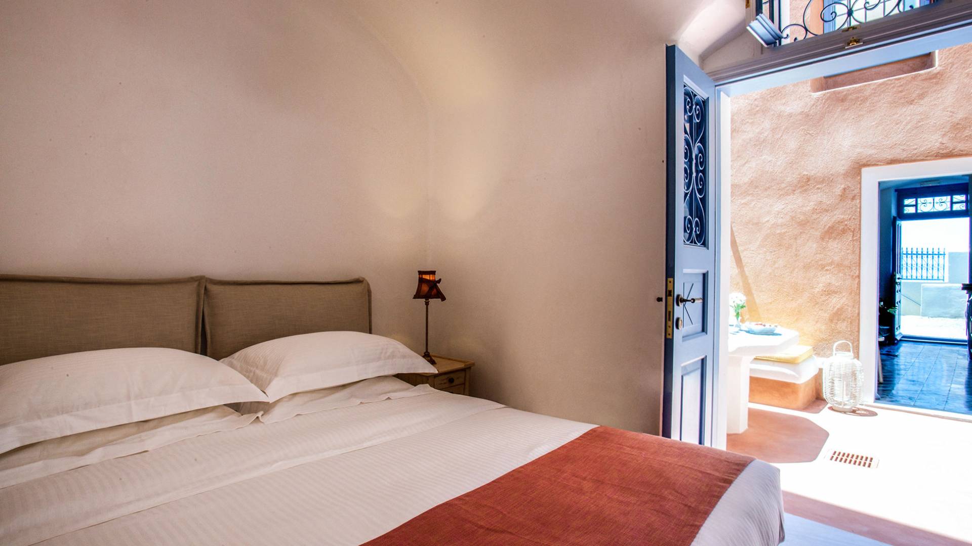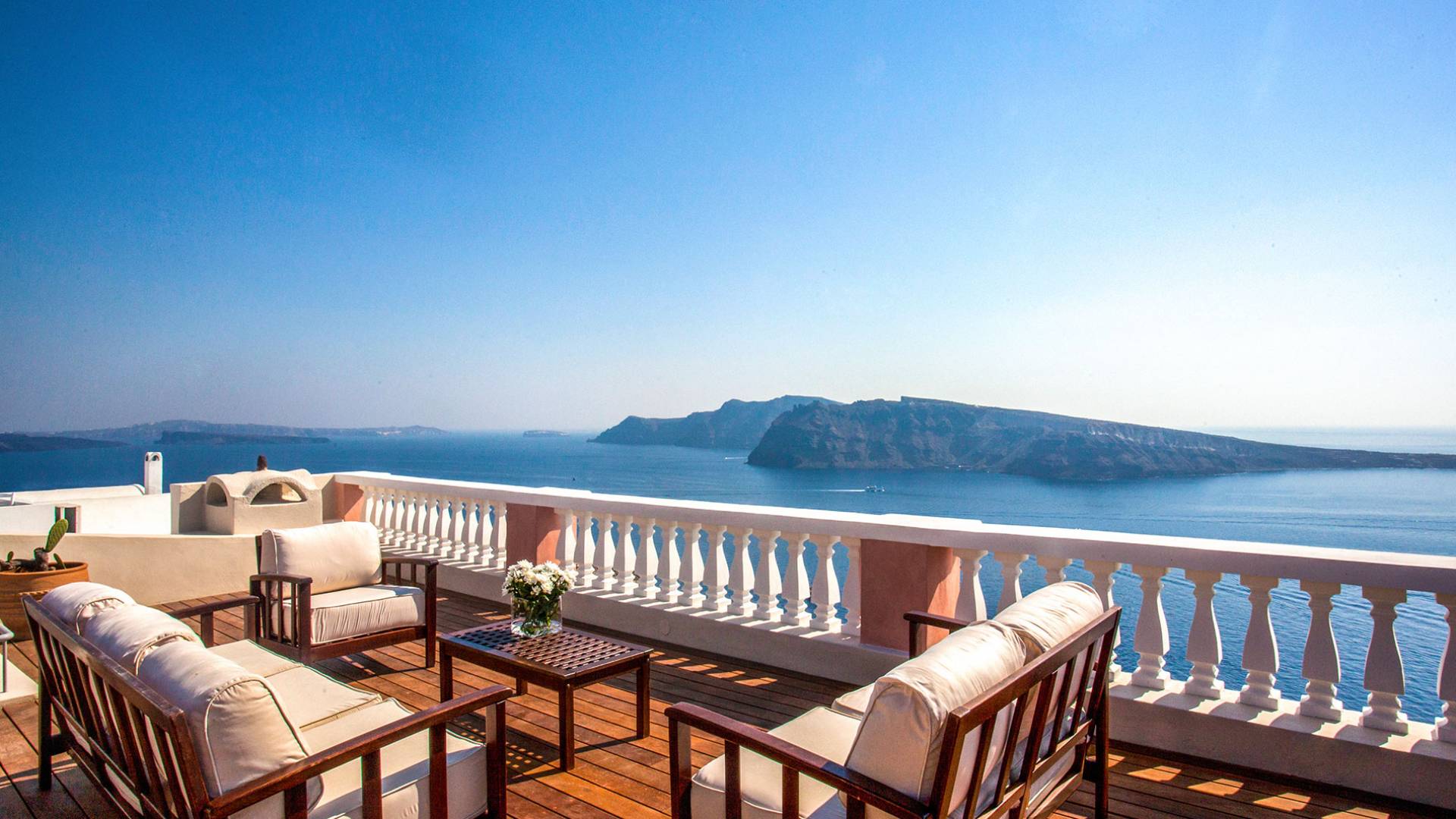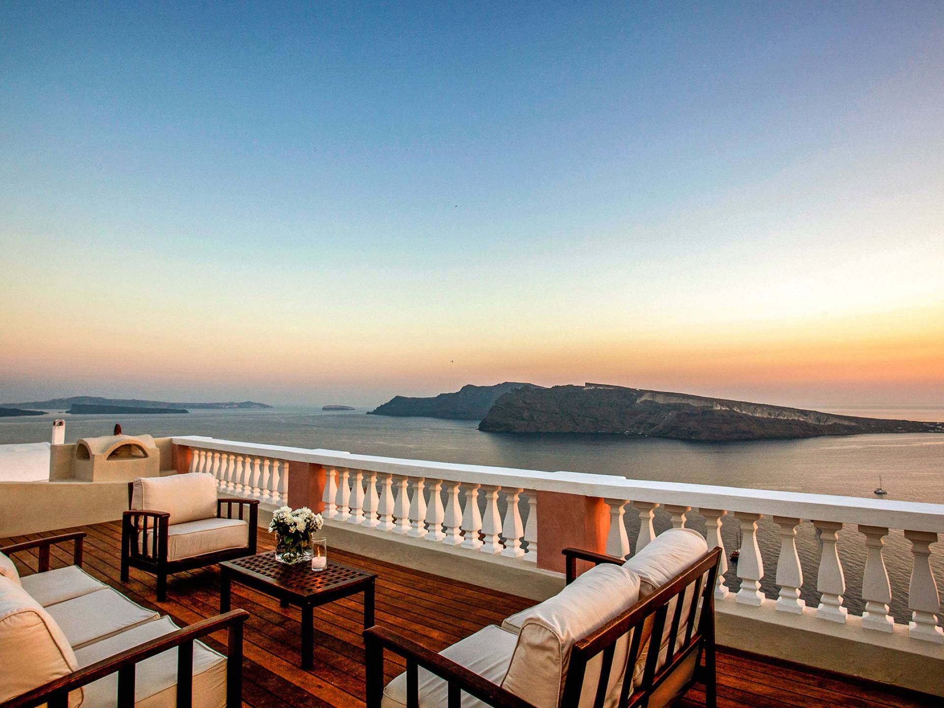 Frente a la mansión, el "patio" es realmente la terraza de los tiempos tradicionales de la isla. Tiene vistas igualmente panorámicas, que se complementa con la fachada neoclásica. Decorado en el modo tradicional de la isla, el patio interior, es el elemento sorpresa arquitectónico de buen gusto de Oia Mansion. Balcón privado con espectacular vista al idílico atardecer. Su reflejo en el agua crea un conducto dorado hacia el sol.