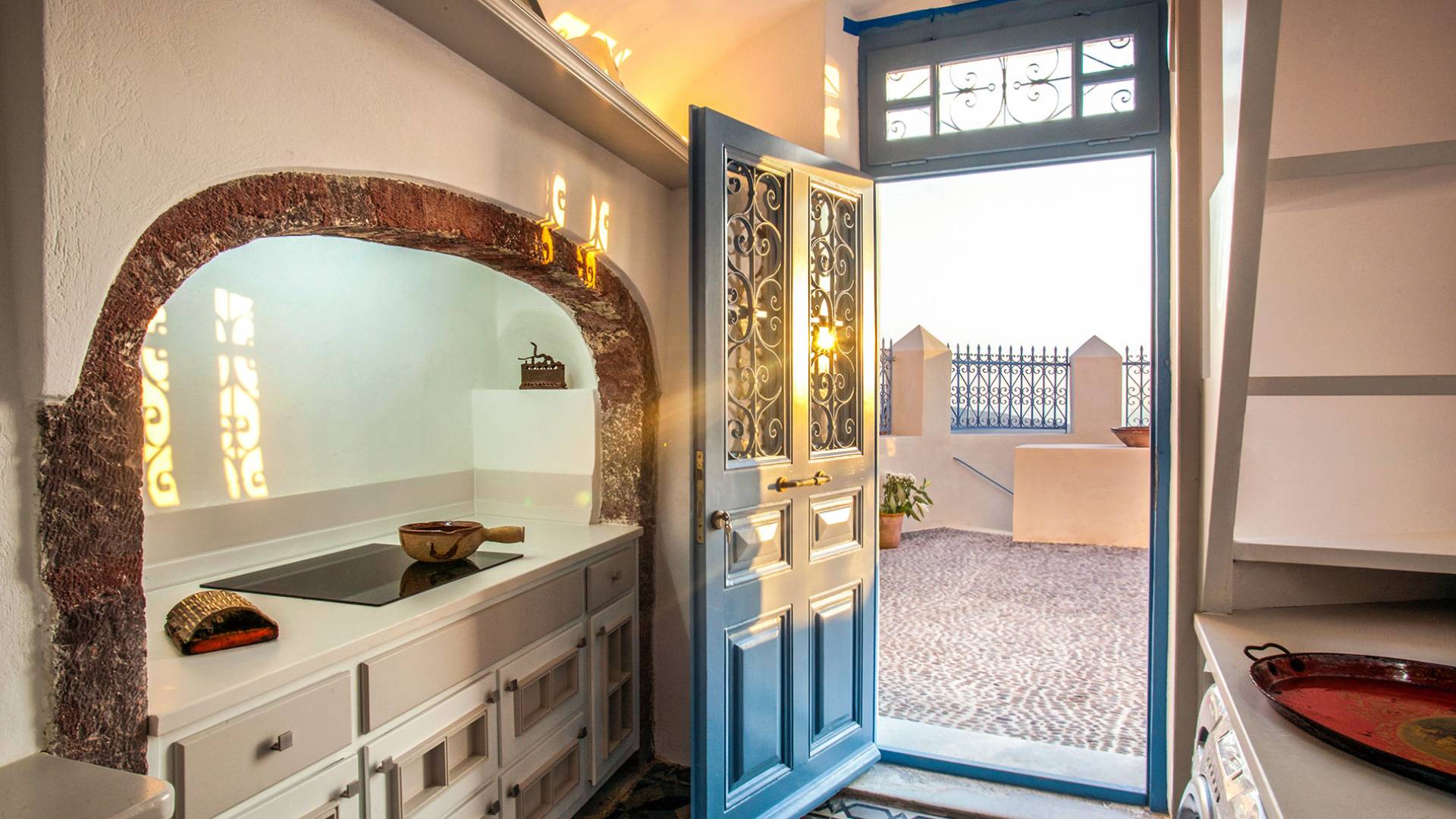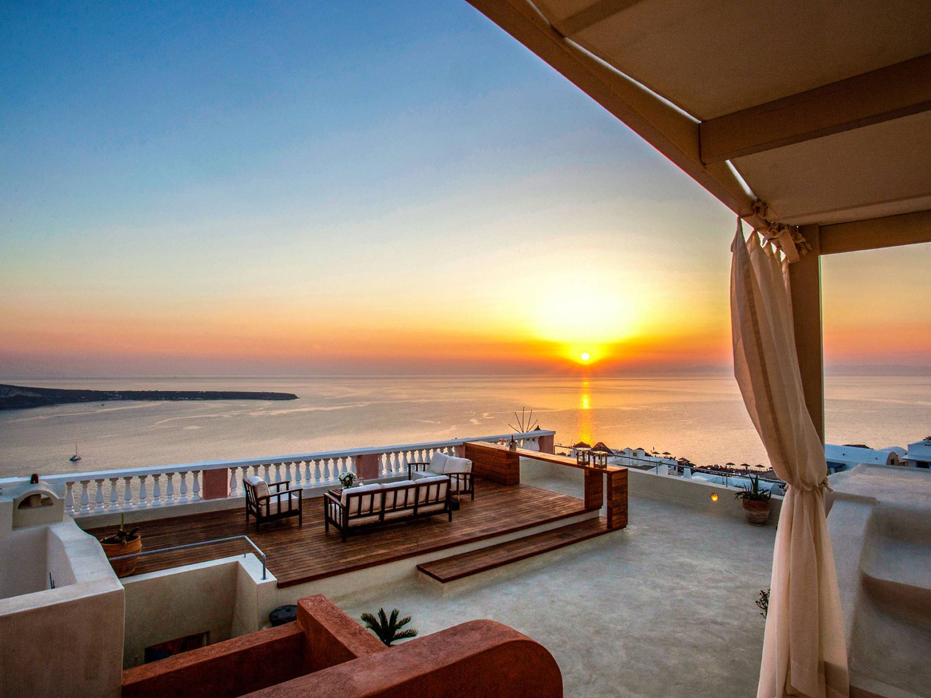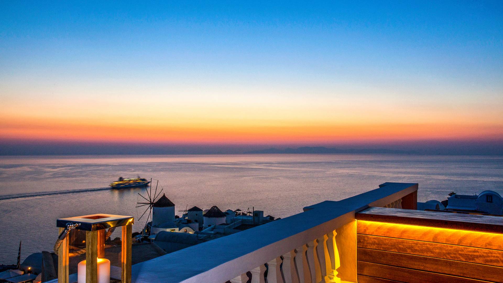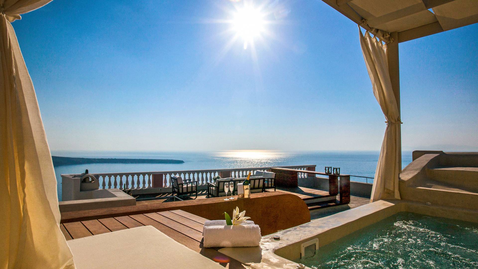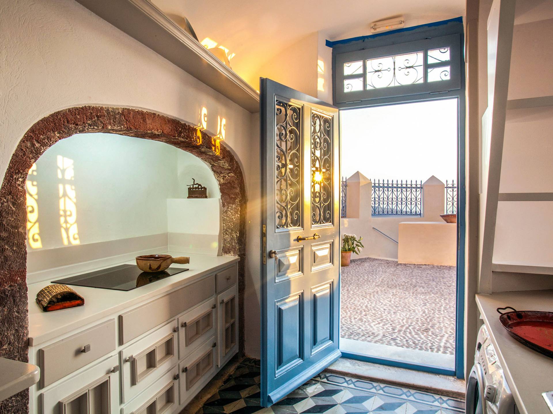 Frente a la mansión, el "patio" es realmente la terraza de los tiempos tradicionales de la isla. Tiene vistas igualmente panorámicas, que se complementa con la fachada neoclásica. Decorado en el modo tradicional de la isla, el patio interior, es el elemento sorpresa arquitectónico de buen gusto de Oia Mansion. Balcón privado con espectacular vista al idílico atardecer. Su reflejo en el agua crea un conducto dorado hacia el sol.