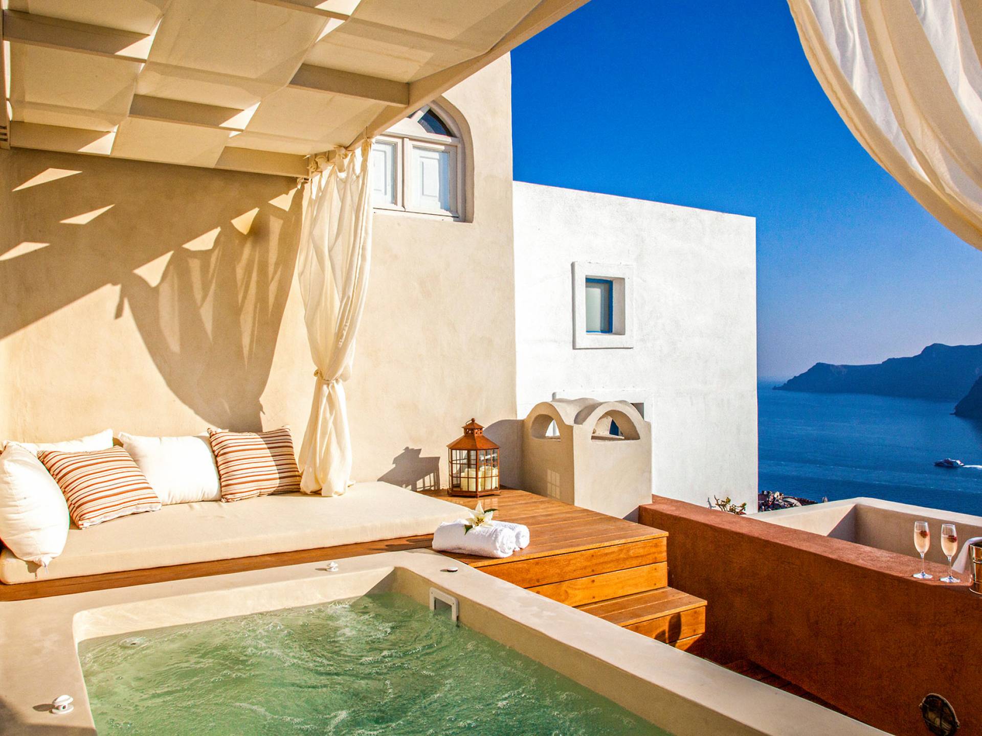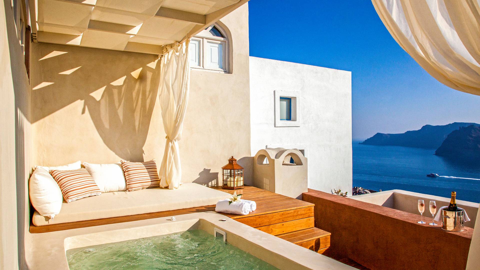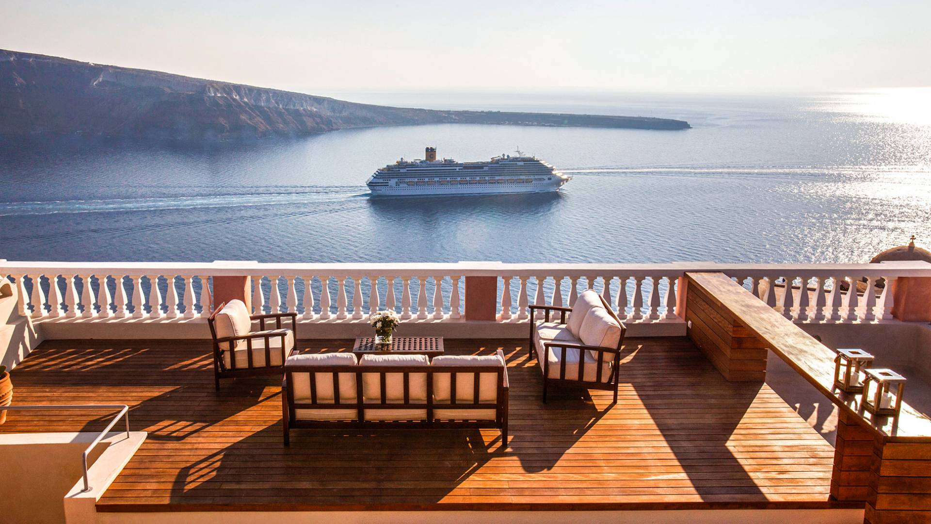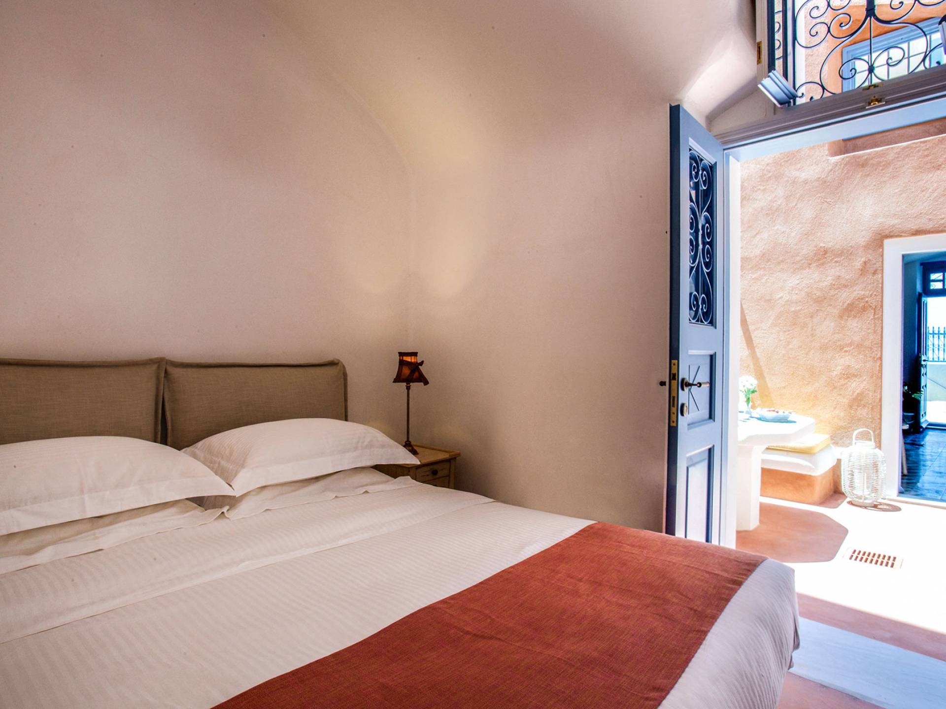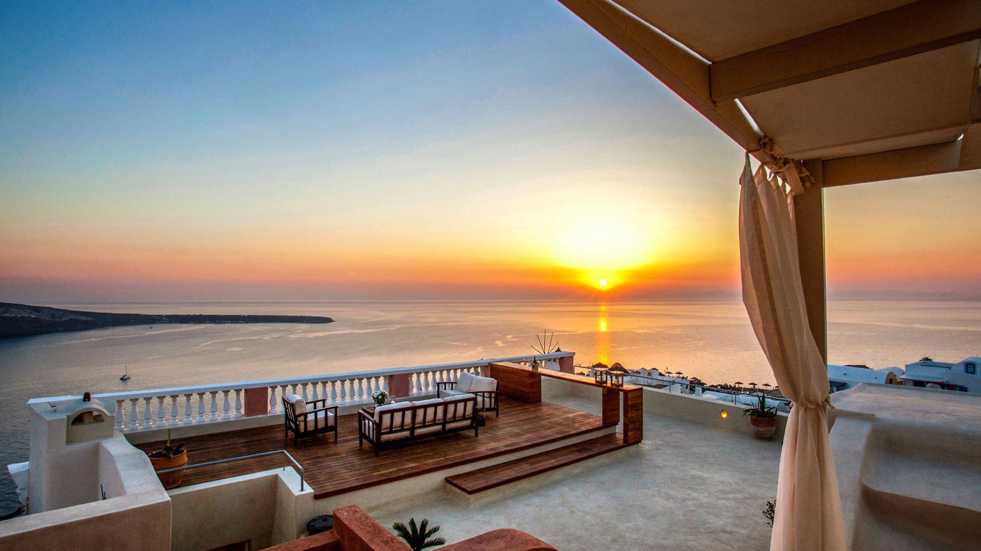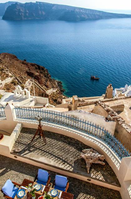 Frente a la mansión, el "patio" es realmente la terraza de los tiempos tradicionales de la isla. Tiene vistas igualmente panorámicas, que se complementa con la fachada neoclásica. Decorado en el modo tradicional de la isla, el patio interior, es el elemento sorpresa arquitectónico de buen gusto de Oia Mansion. Balcón privado con espectacular vista al idílico atardecer. Su reflejo en el agua crea un conducto dorado hacia el sol.