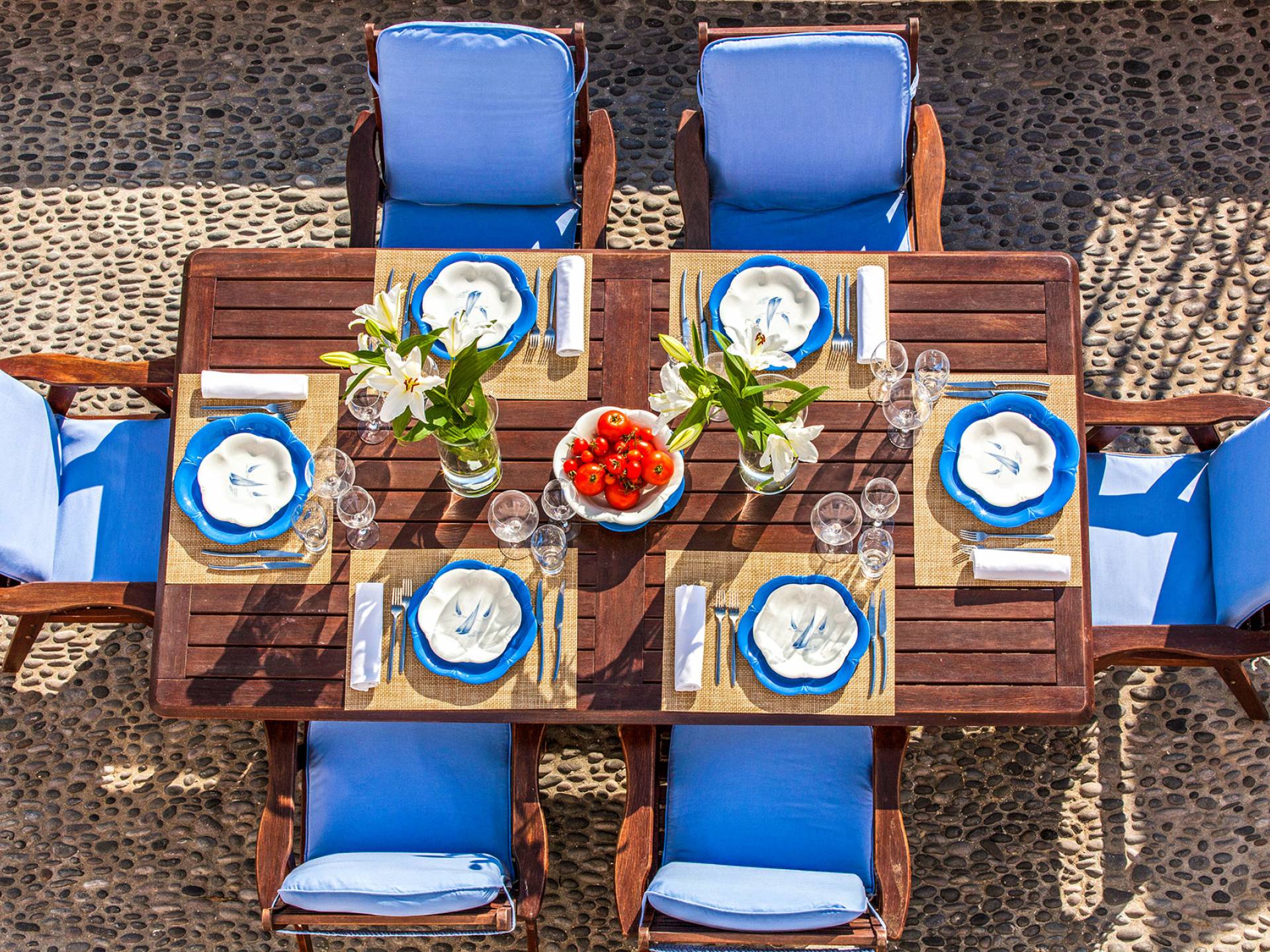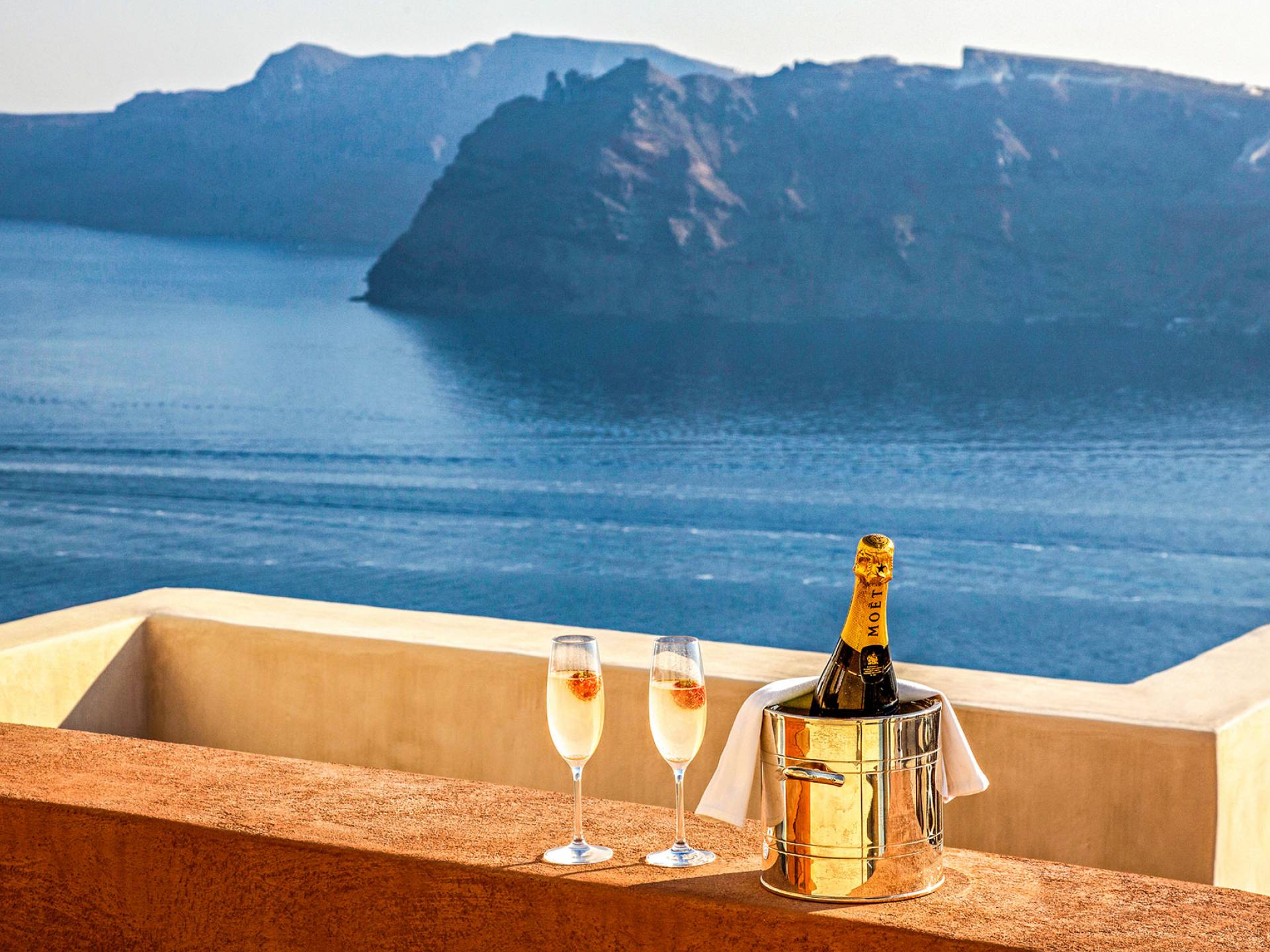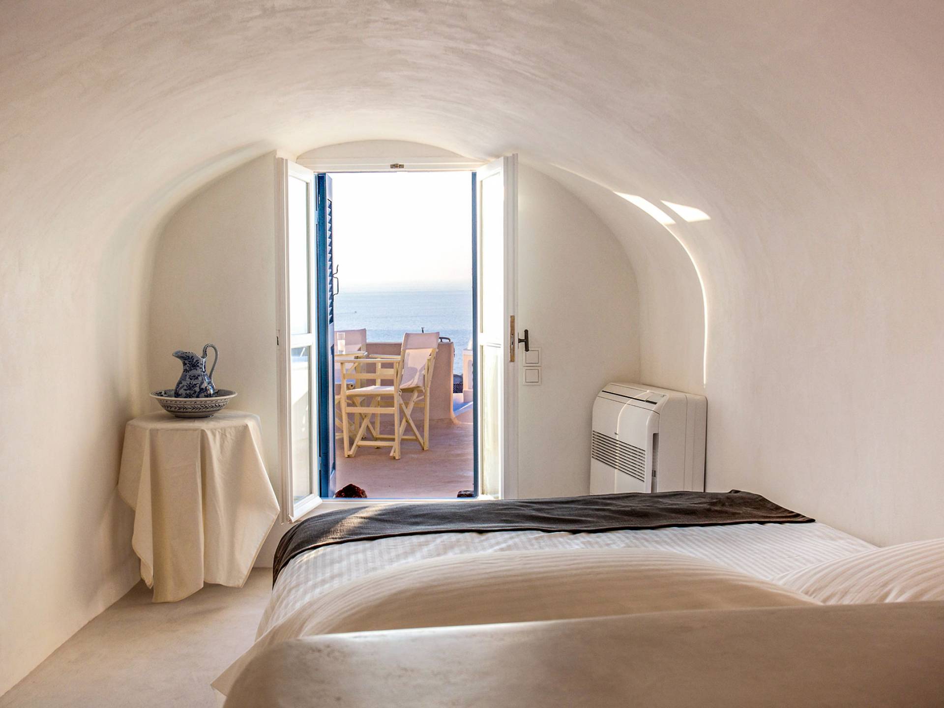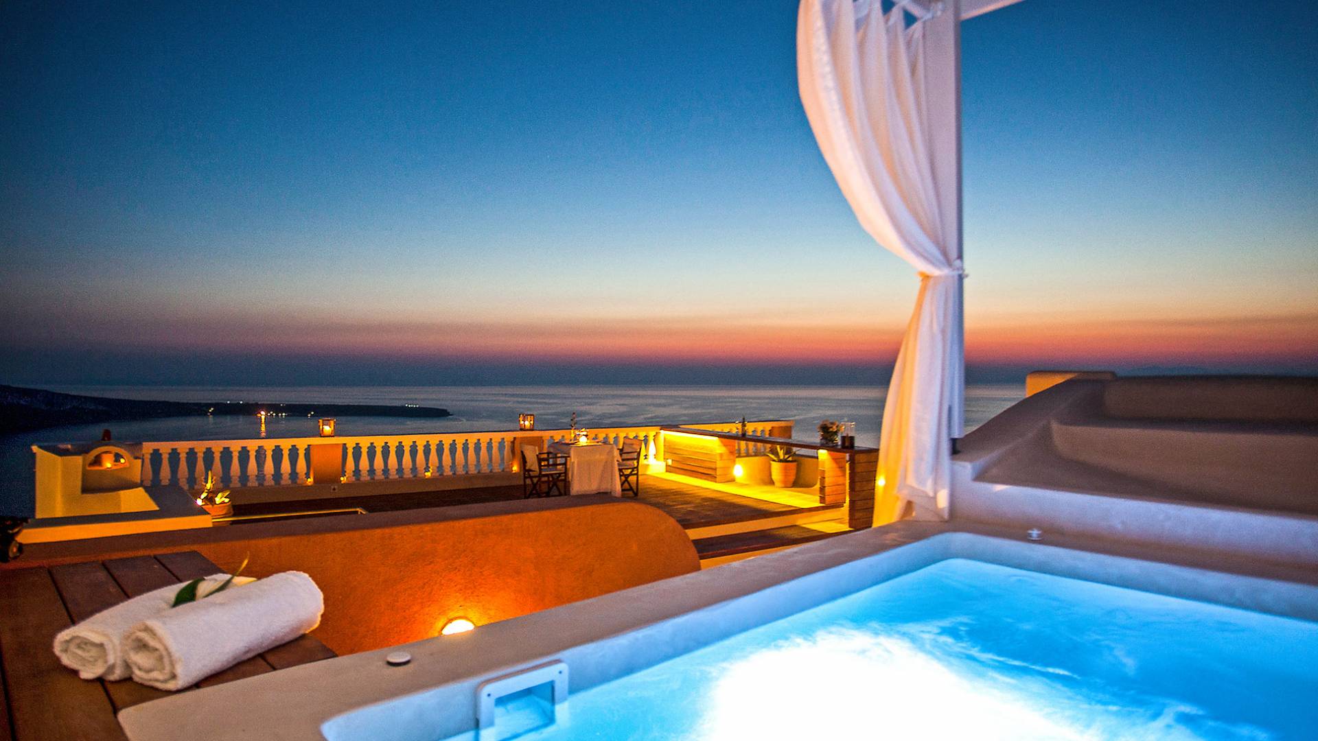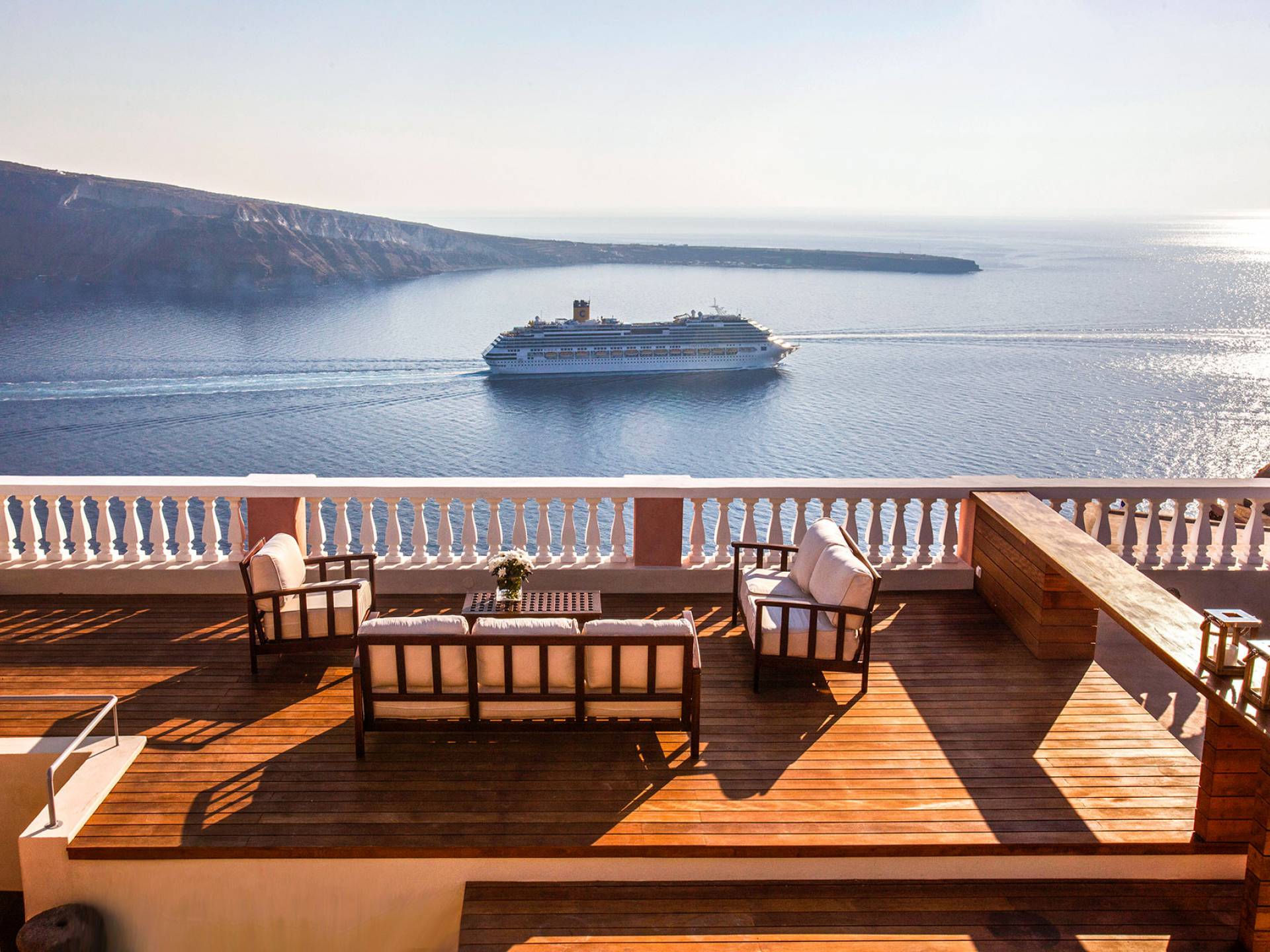 Frente a la mansión, el "patio" es realmente la terraza de los tiempos tradicionales de la isla. Tiene vistas igualmente panorámicas, que se complementa con la fachada neoclásica. Decorado en el modo tradicional de la isla, el patio interior, es el elemento sorpresa arquitectónico de buen gusto de Oia Mansion. Balcón privado con espectacular vista al idílico atardecer. Su reflejo en el agua crea un conducto dorado hacia el sol.