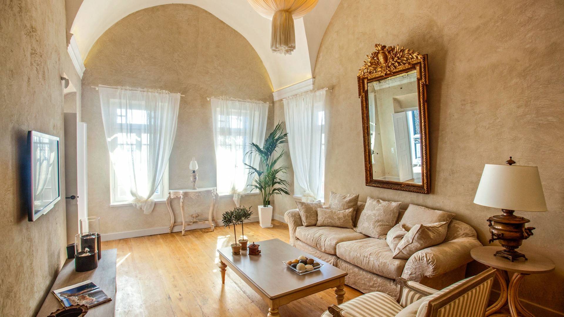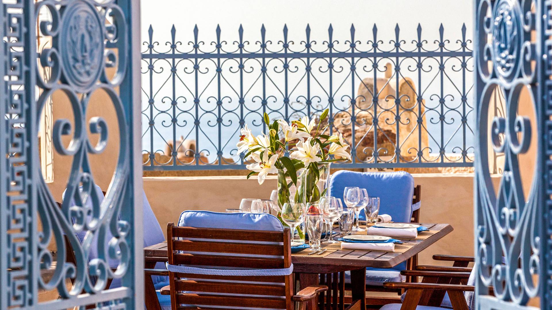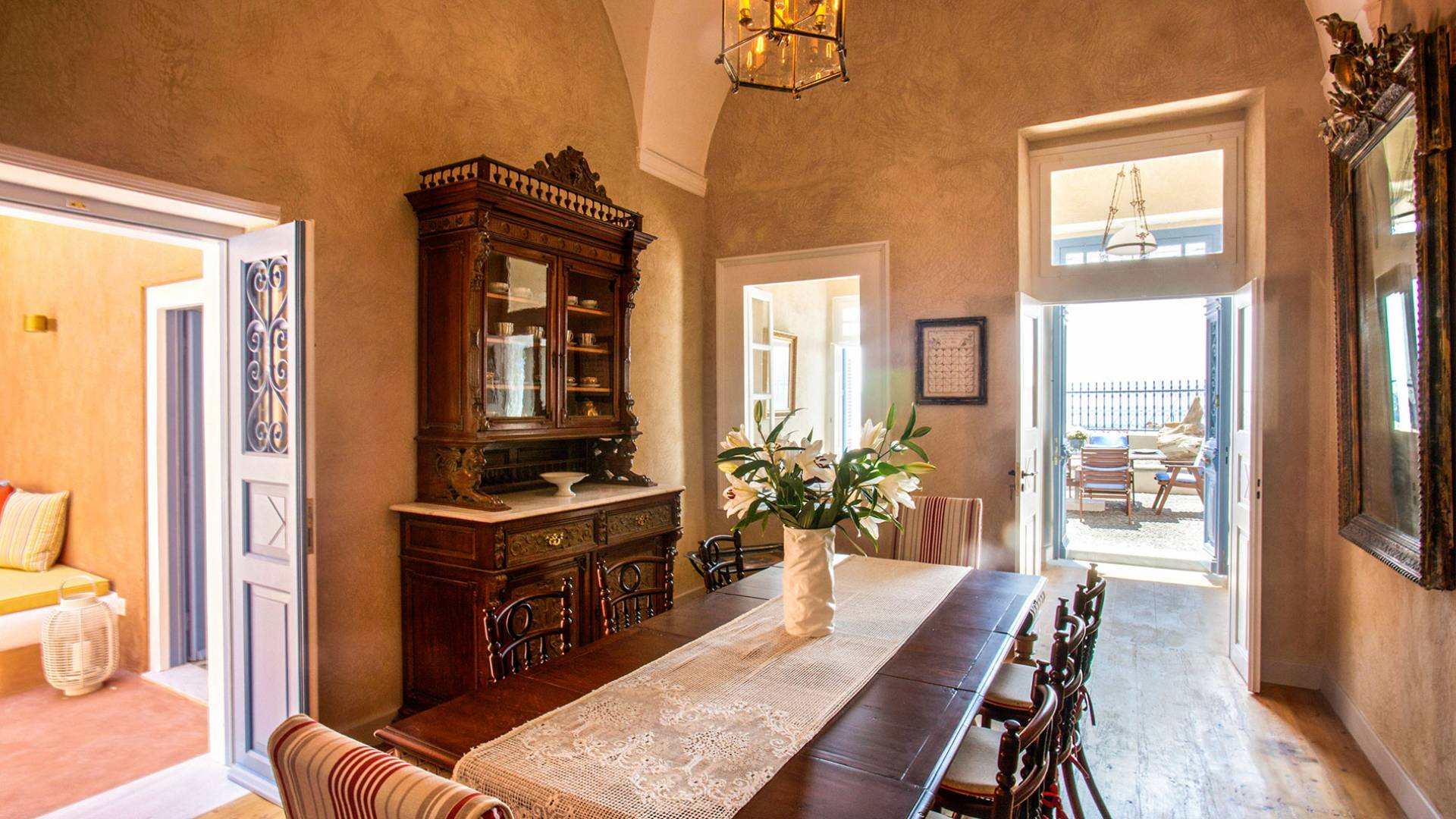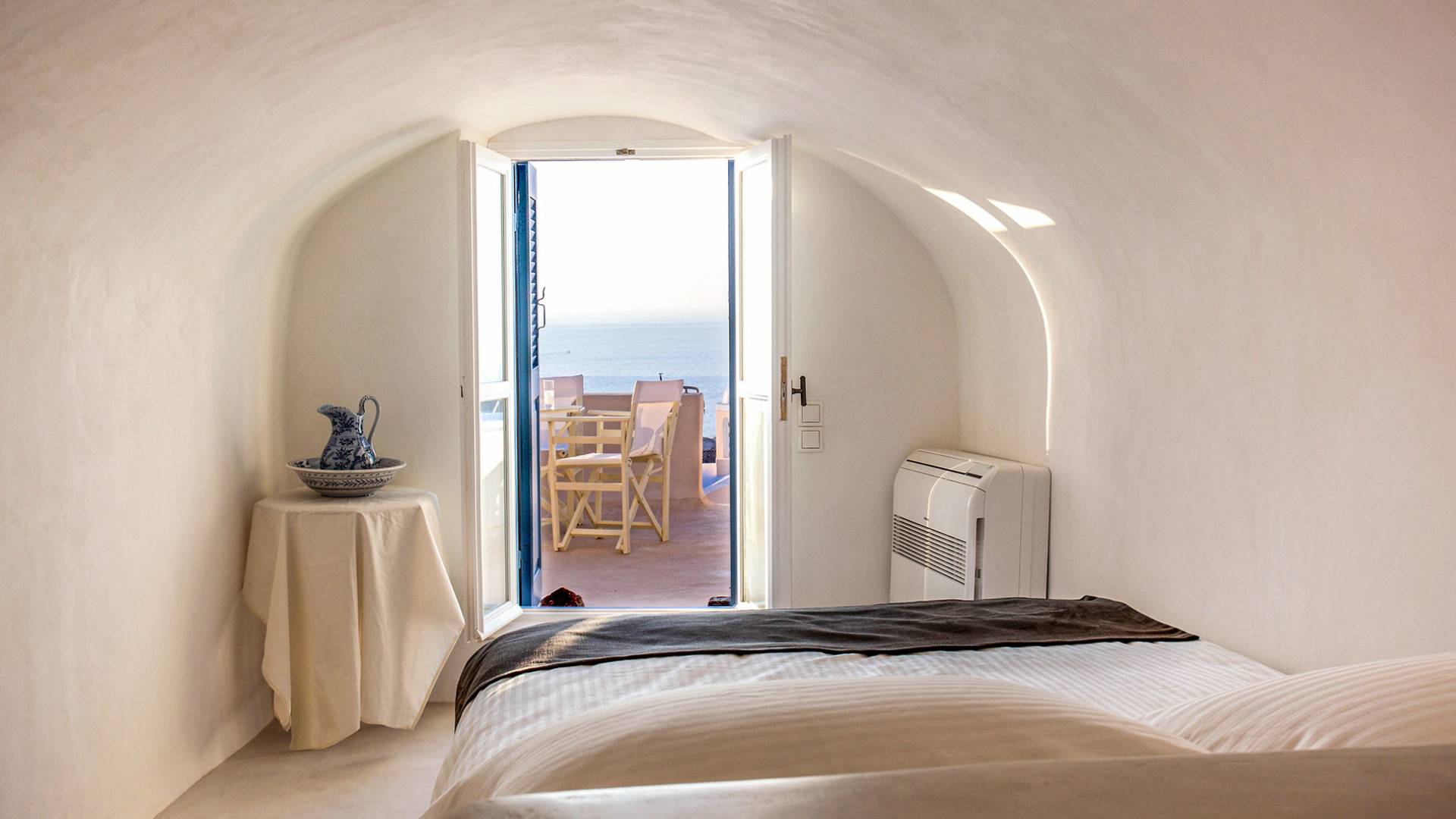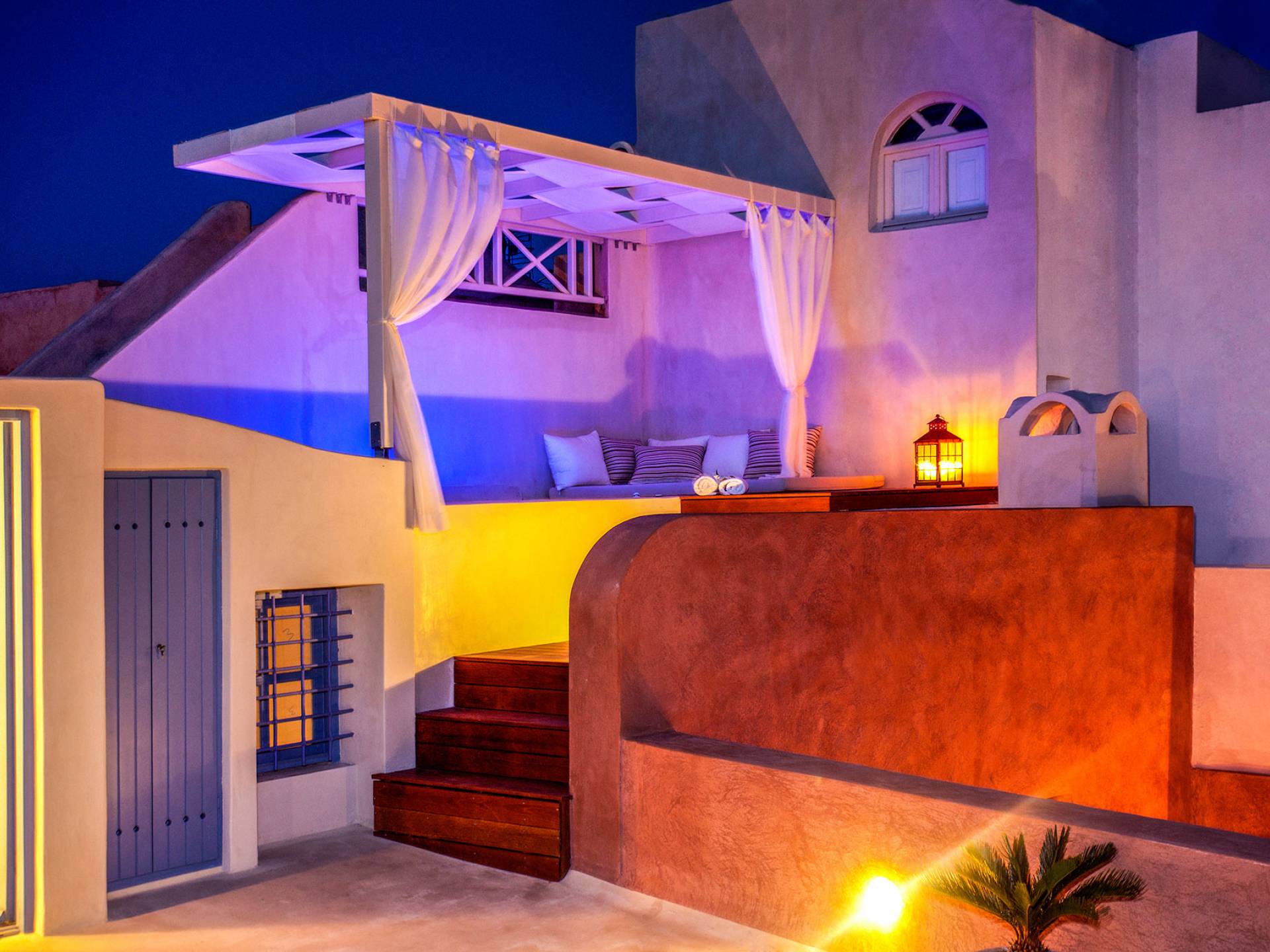 Frente a la mansión, el "patio" es realmente la terraza de los tiempos tradicionales de la isla. Tiene vistas igualmente panorámicas, que se complementa con la fachada neoclásica. Decorado en el modo tradicional de la isla, el patio interior, es el elemento sorpresa arquitectónico de buen gusto de Oia Mansion. Balcón privado con espectacular vista al idílico atardecer. Su reflejo en el agua crea un conducto dorado hacia el sol.