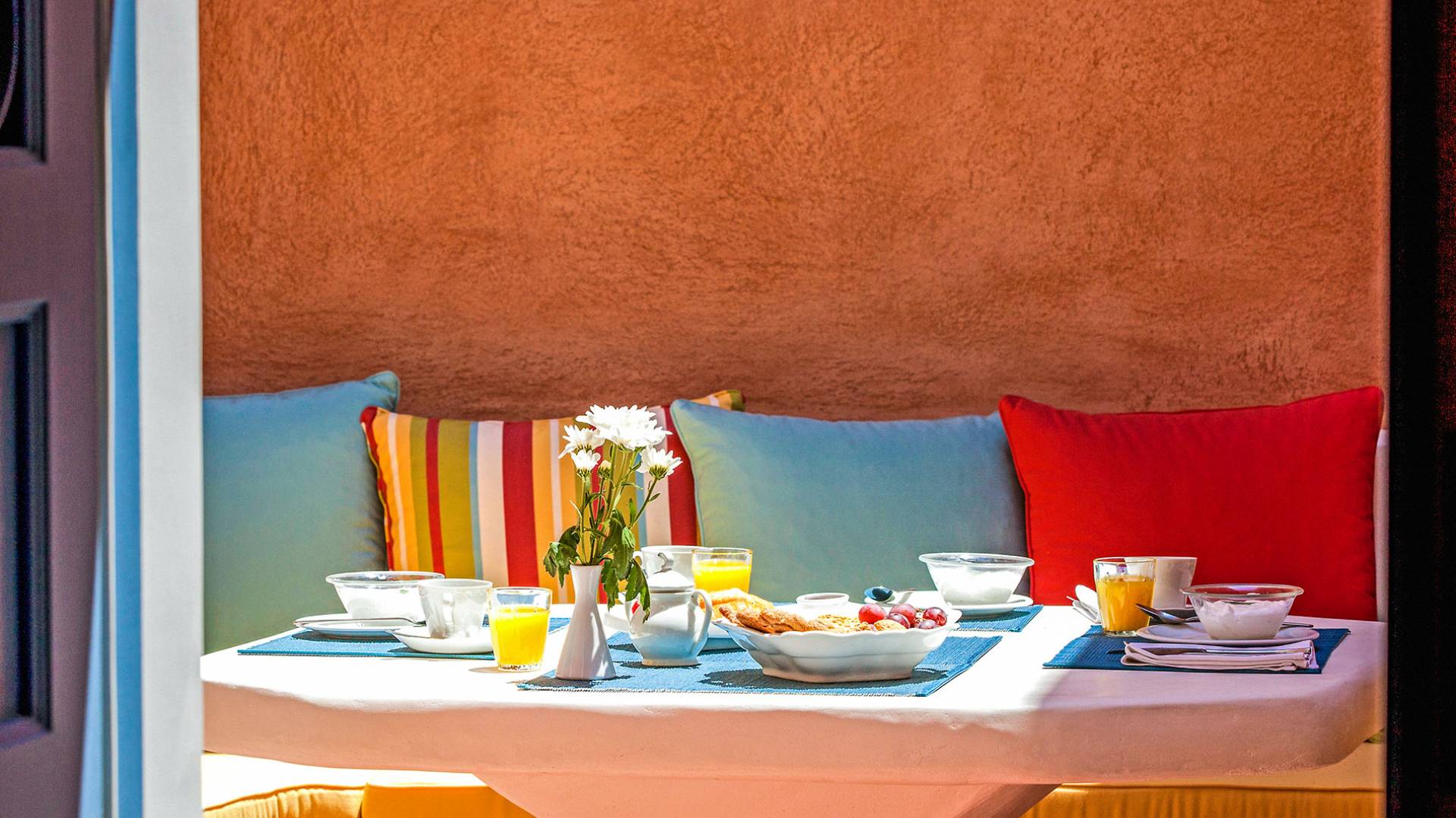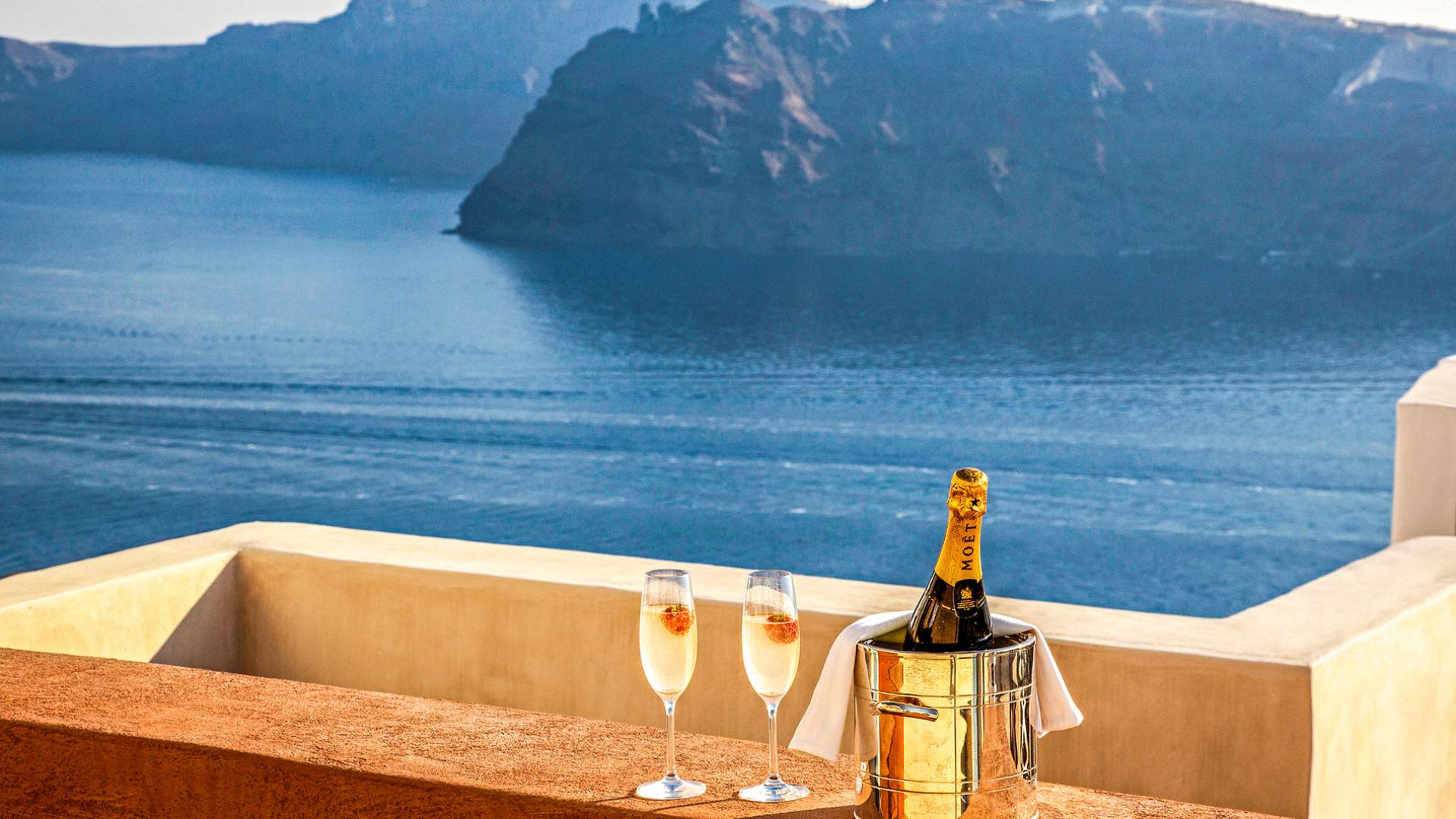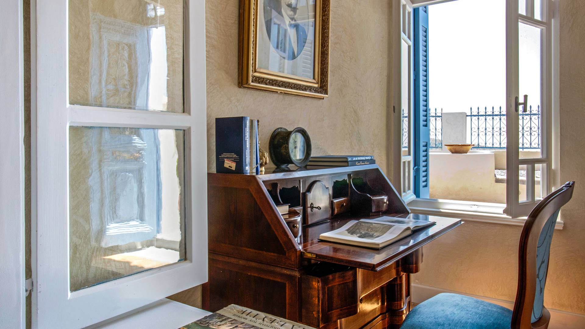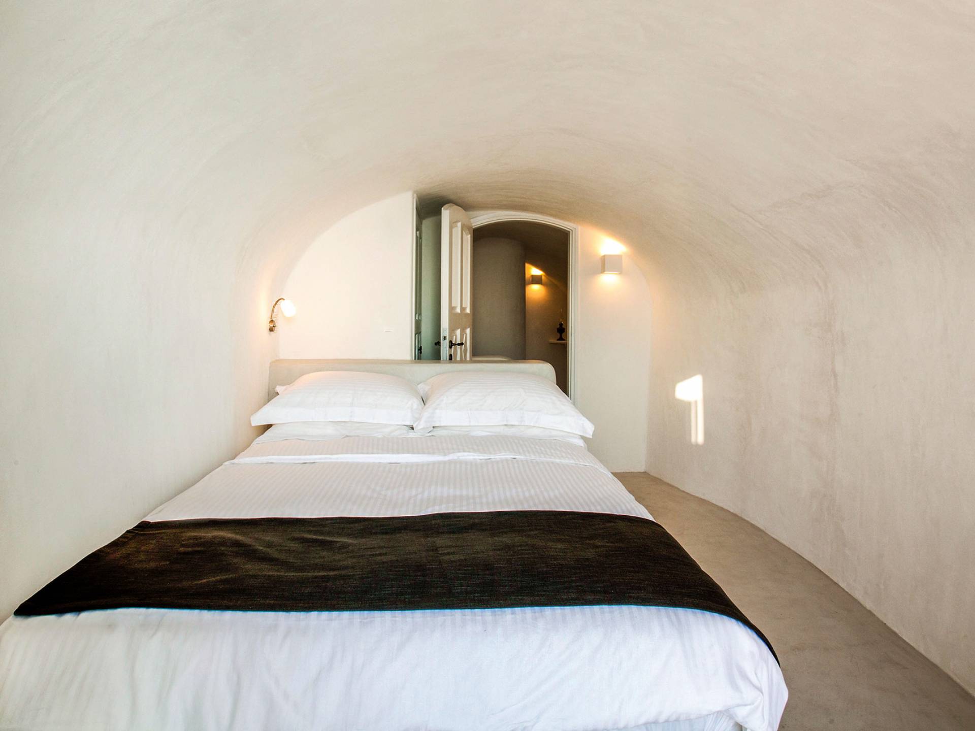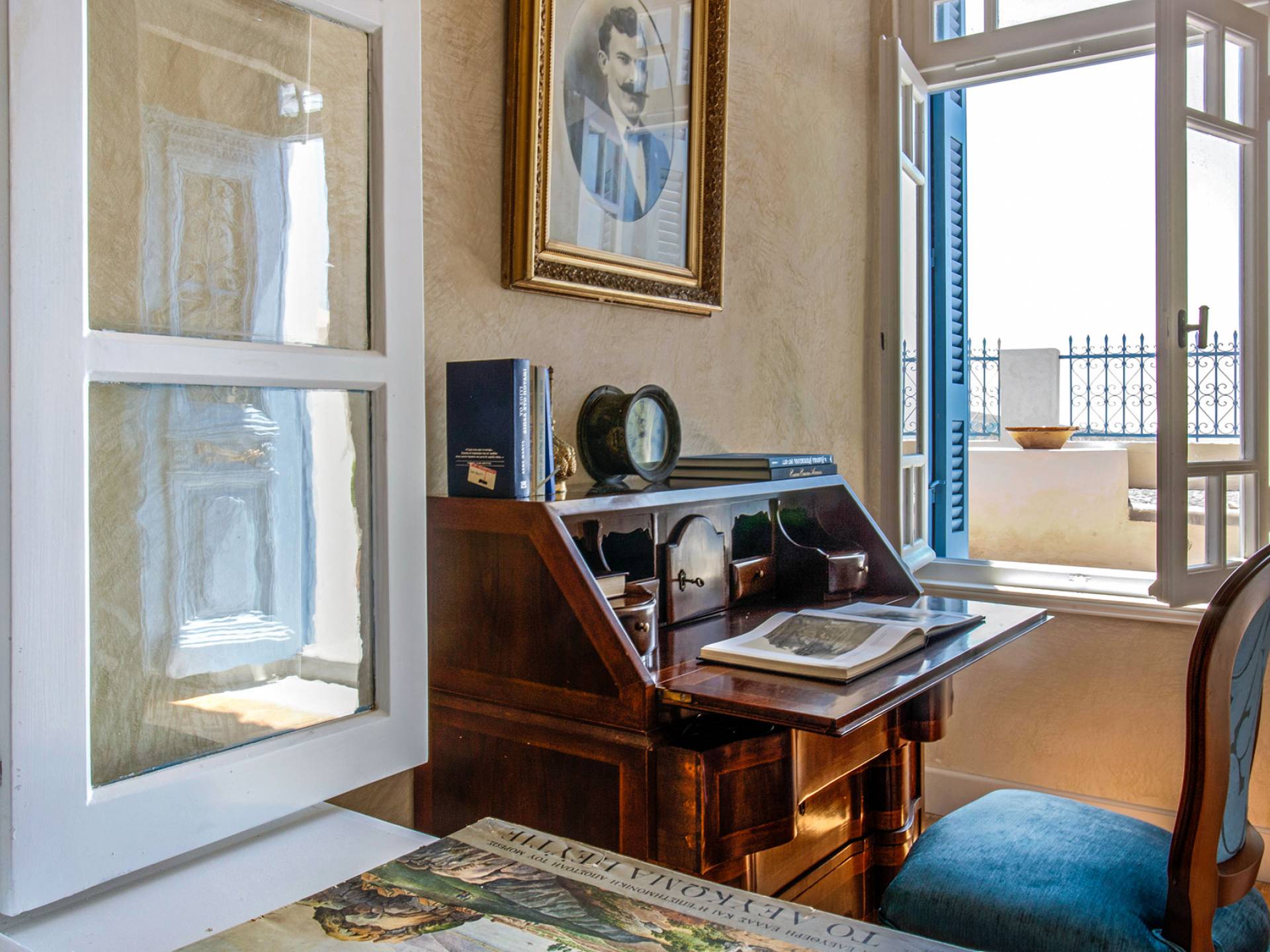 Frente a la mansión, el "patio" es realmente la terraza de los tiempos tradicionales de la isla. Tiene vistas igualmente panorámicas, que se complementa con la fachada neoclásica. Decorado en el modo tradicional de la isla, el patio interior, es el elemento sorpresa arquitectónico de buen gusto de Oia Mansion. Balcón privado con espectacular vista al idílico atardecer. Su reflejo en el agua crea un conducto dorado hacia el sol.