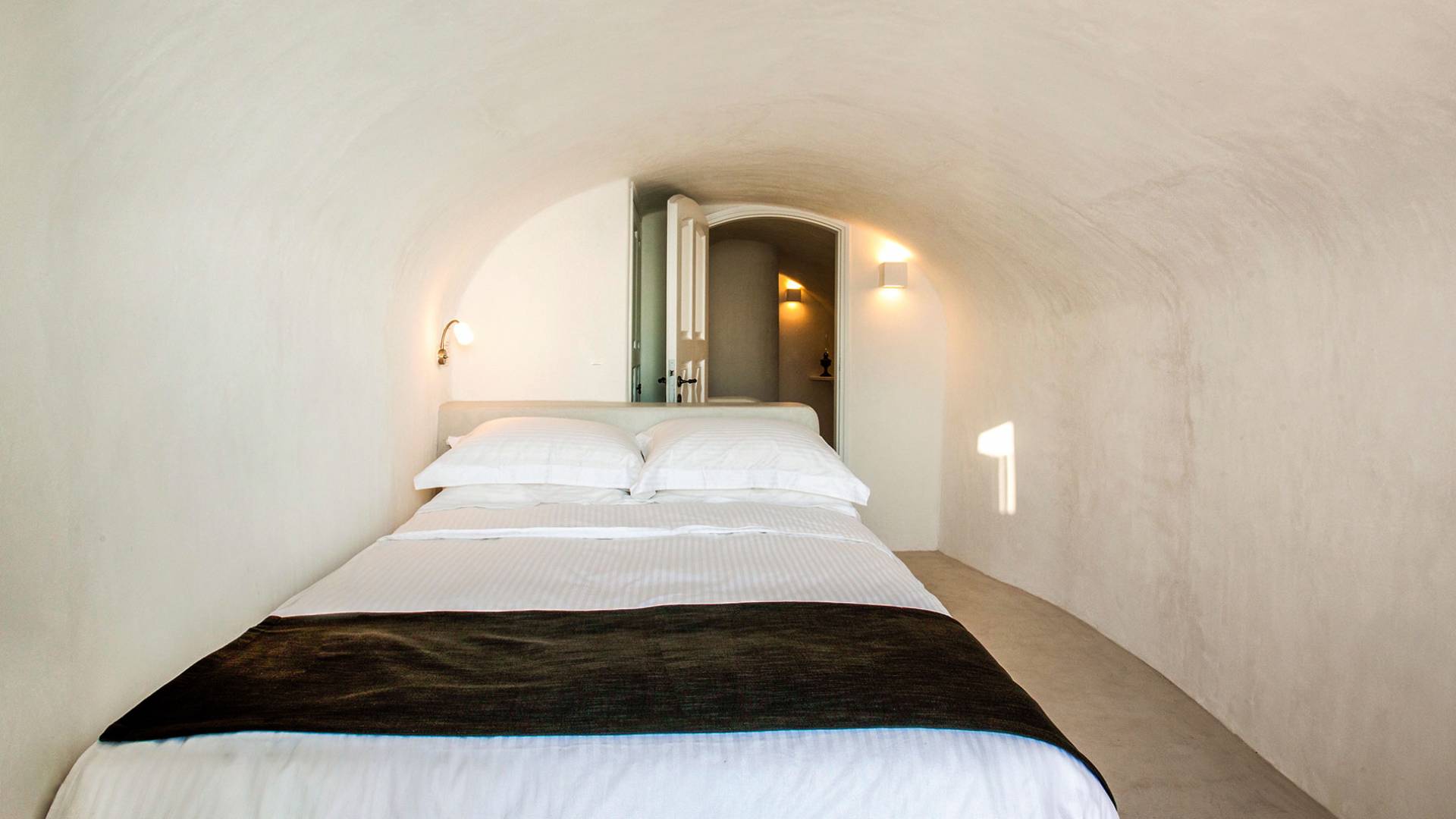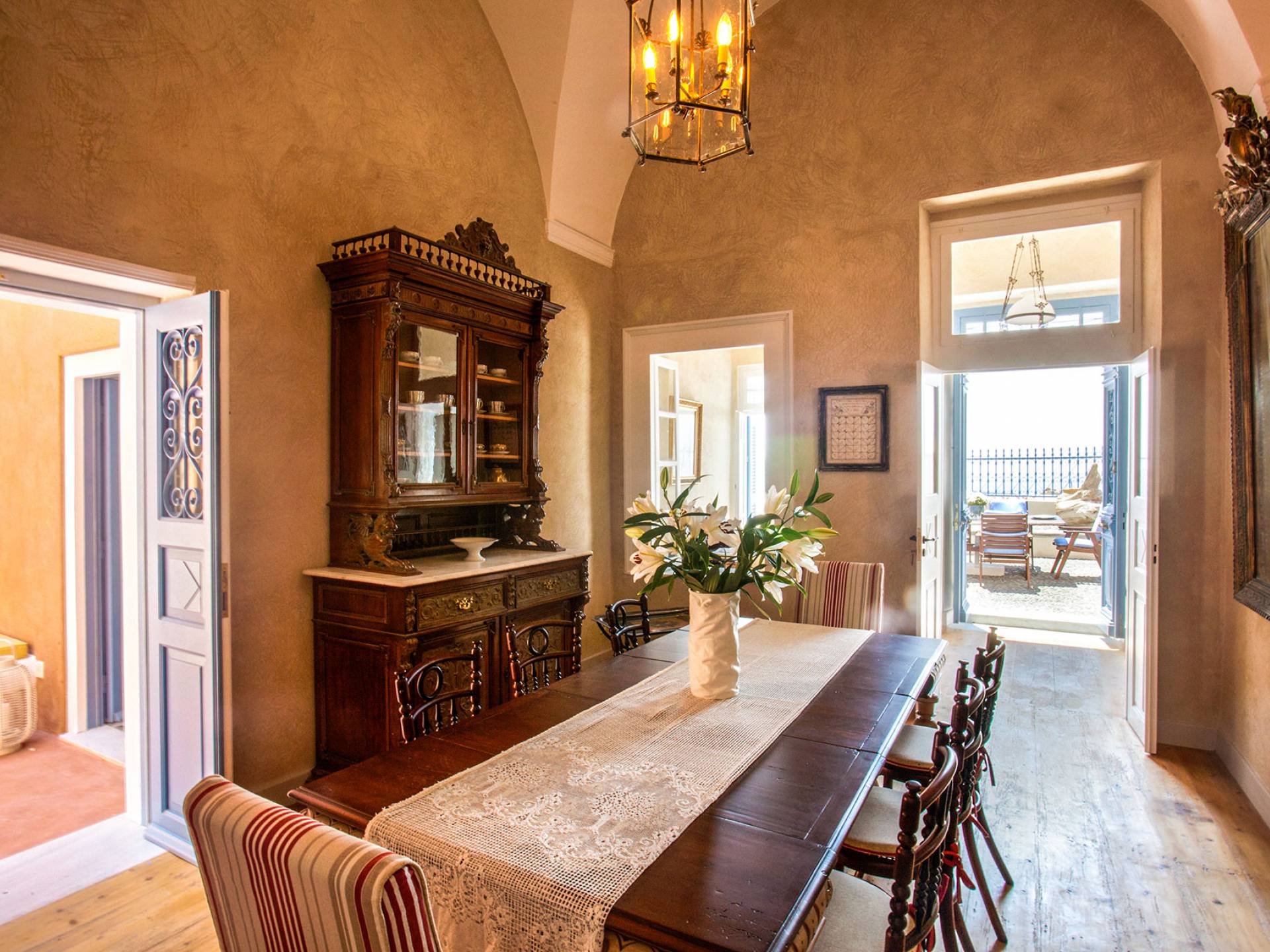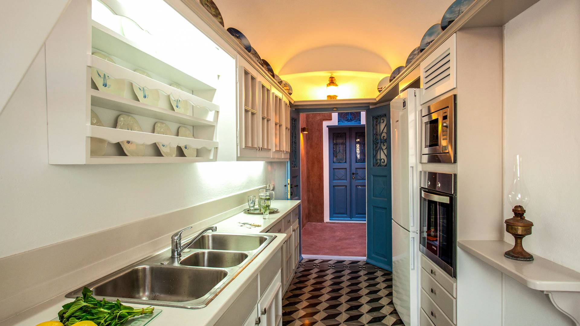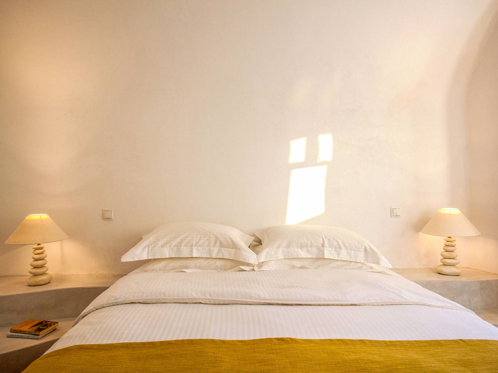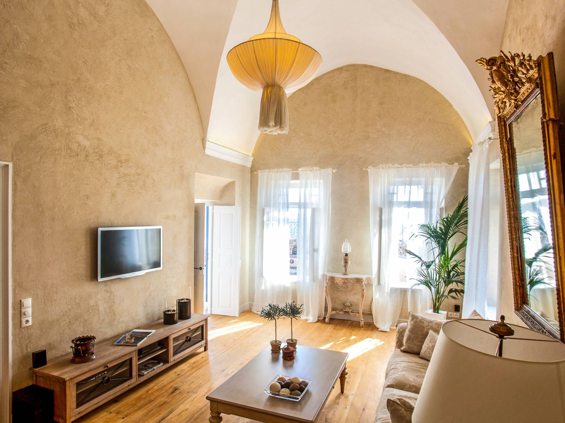 Frente a la mansión, el "patio" es realmente la terraza de los tiempos tradicionales de la isla. Tiene vistas igualmente panorámicas, que se complementa con la fachada neoclásica. Decorado en el modo tradicional de la isla, el patio interior, es el elemento sorpresa arquitectónico de buen gusto de Oia Mansion. Balcón privado con espectacular vista al idílico atardecer. Su reflejo en el agua crea un conducto dorado hacia el sol.