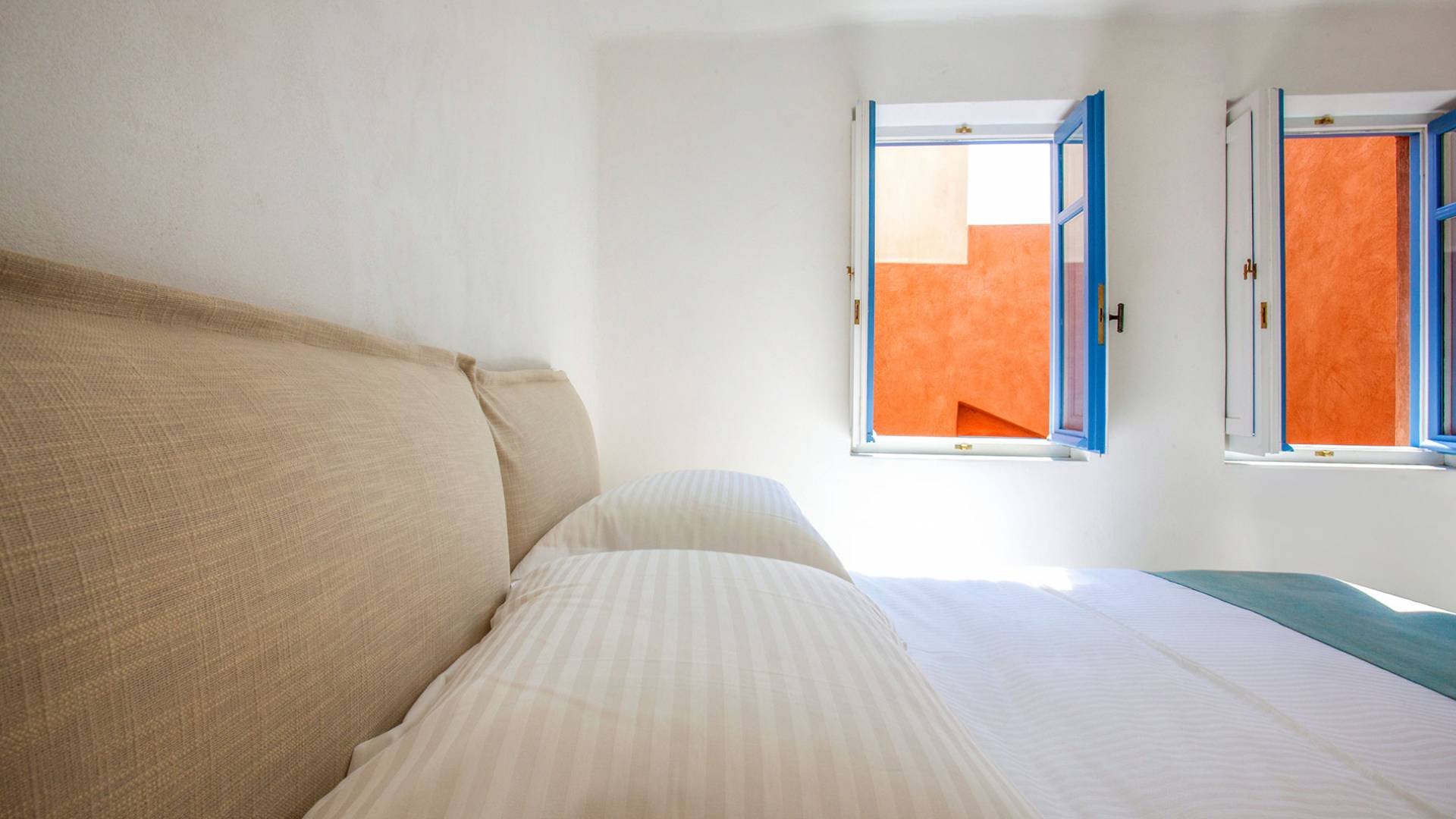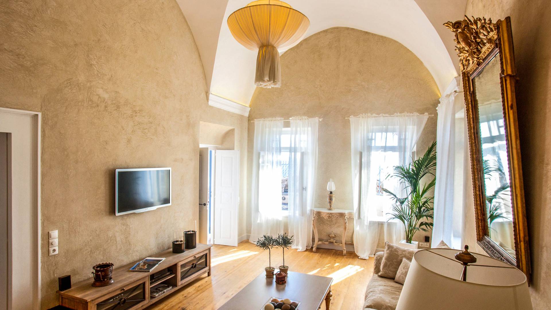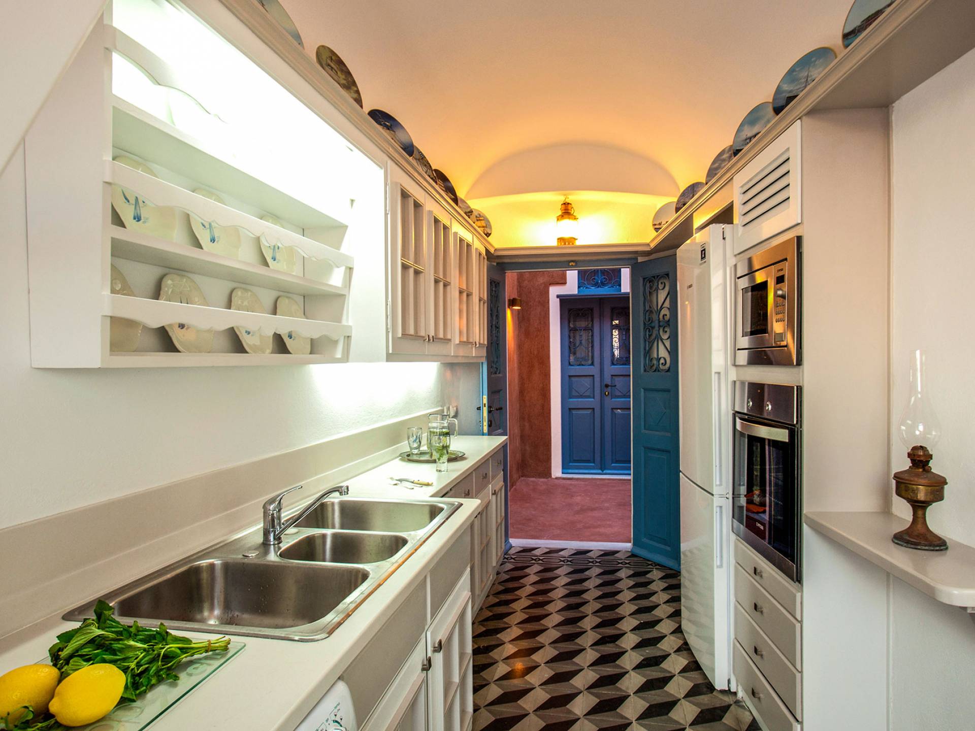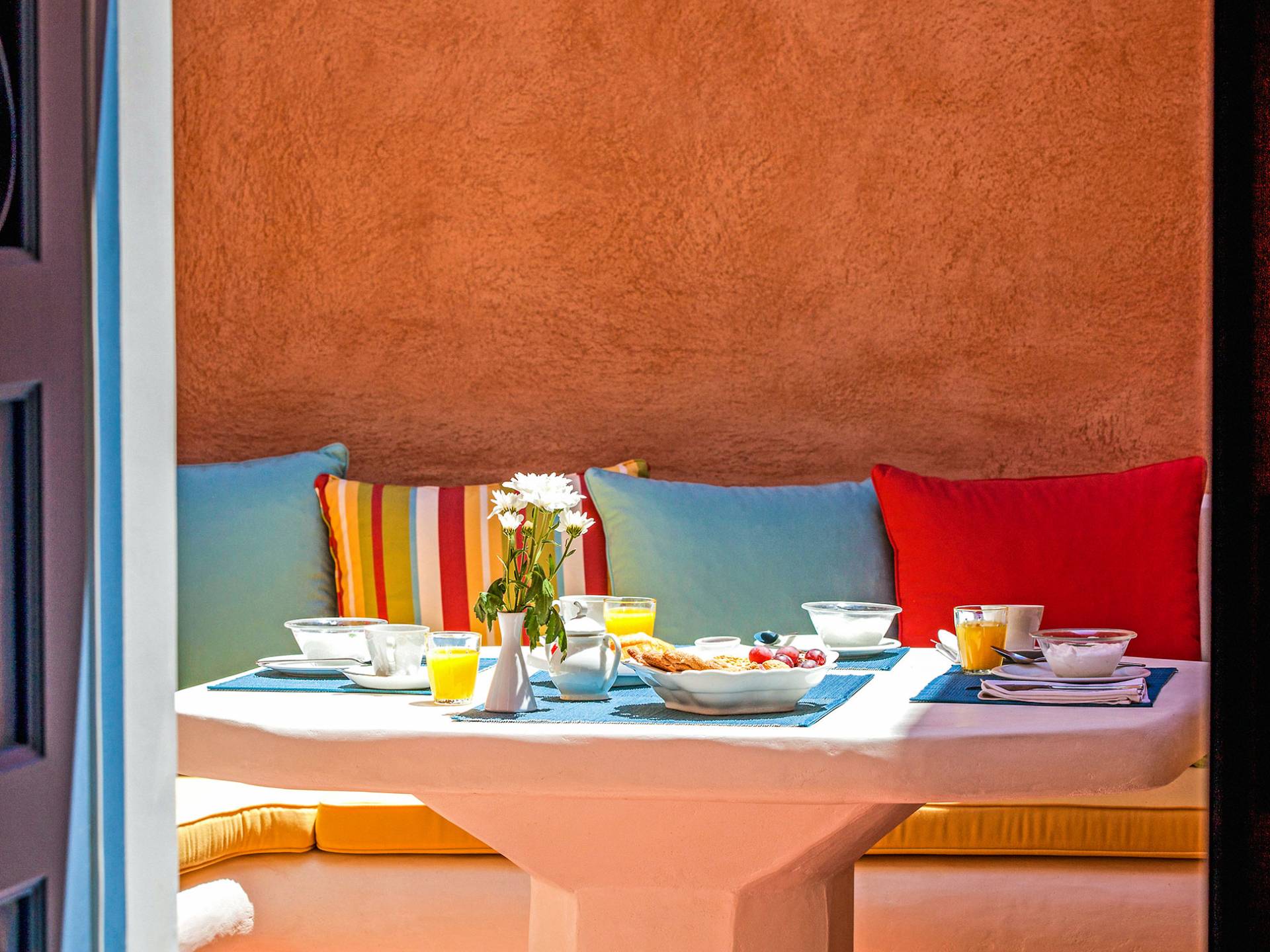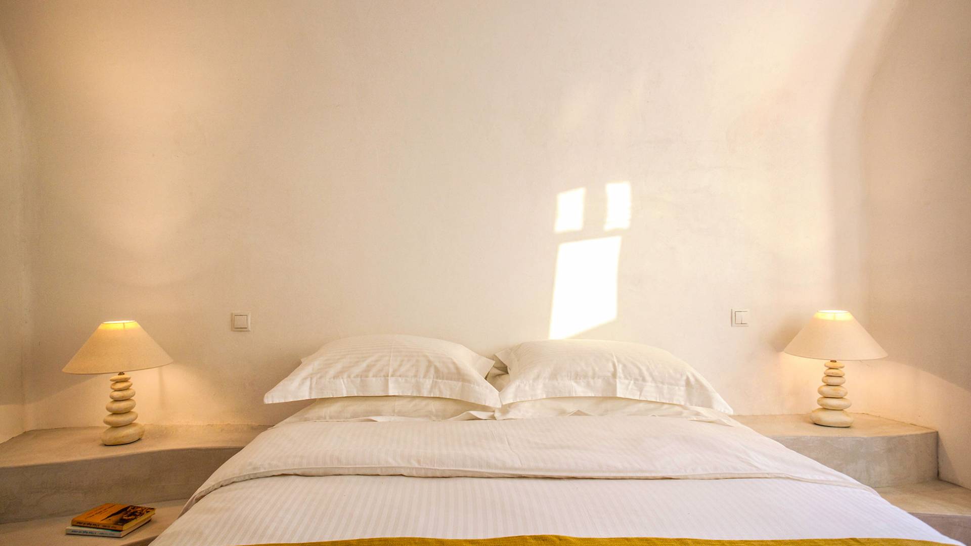 Frente a la mansión, el "patio" es realmente la terraza de los tiempos tradicionales de la isla. Tiene vistas igualmente panorámicas, que se complementa con la fachada neoclásica. Decorado en el modo tradicional de la isla, el patio interior, es el elemento sorpresa arquitectónico de buen gusto de Oia Mansion. Balcón privado con espectacular vista al idílico atardecer. Su reflejo en el agua crea un conducto dorado hacia el sol.